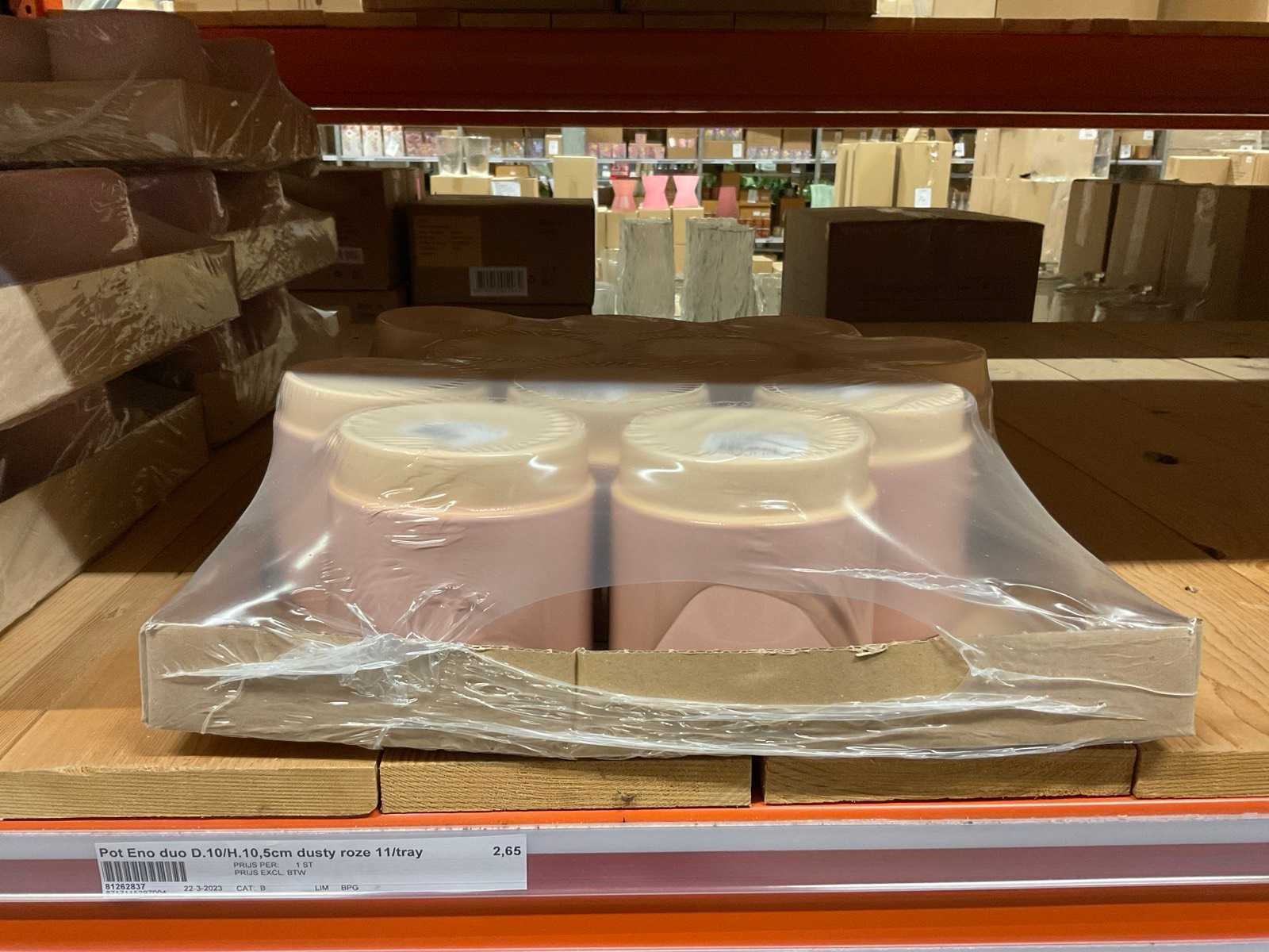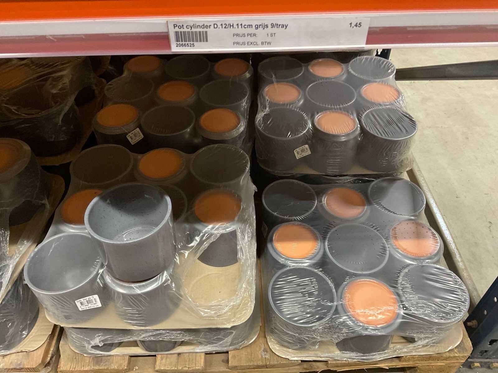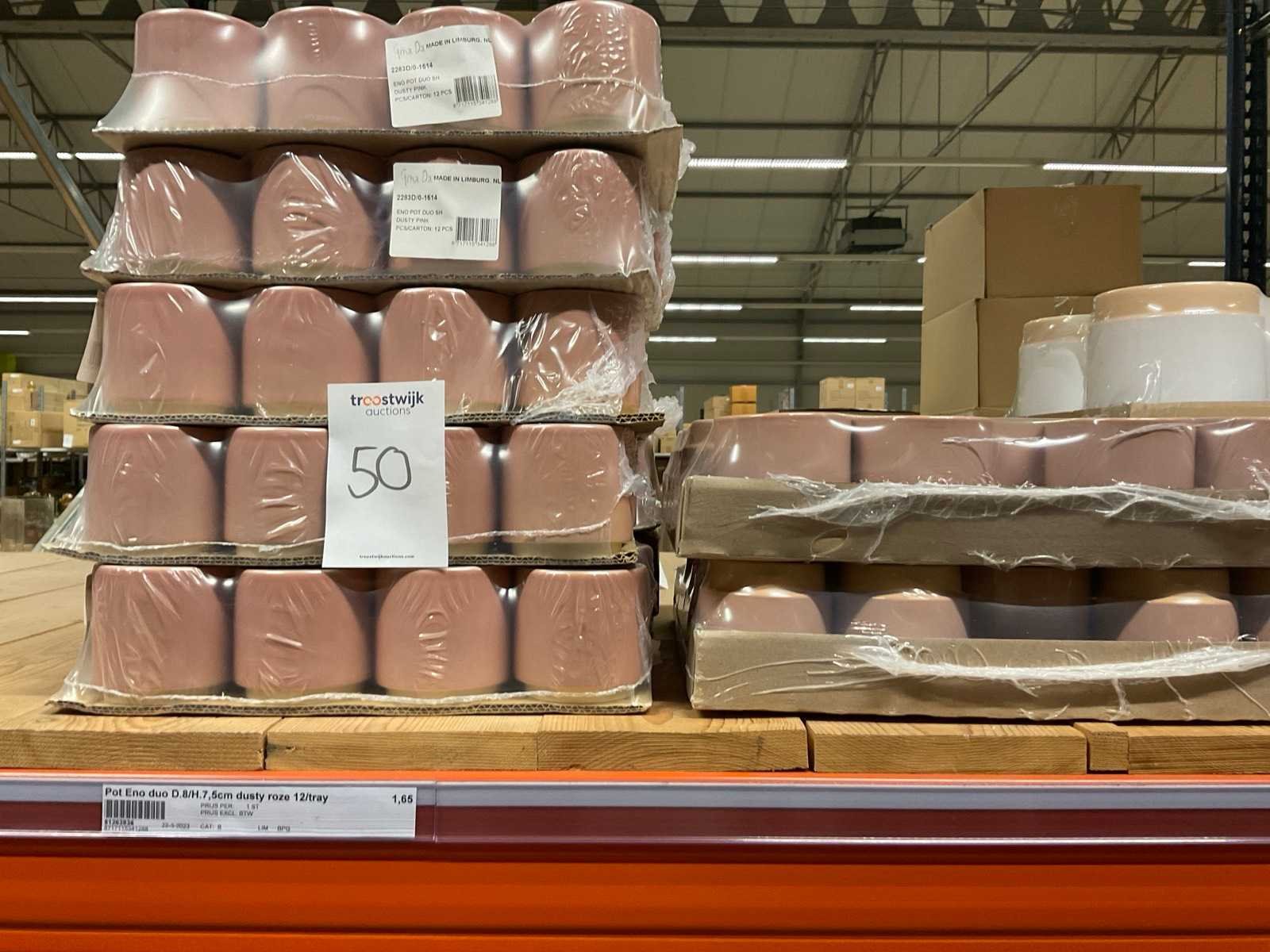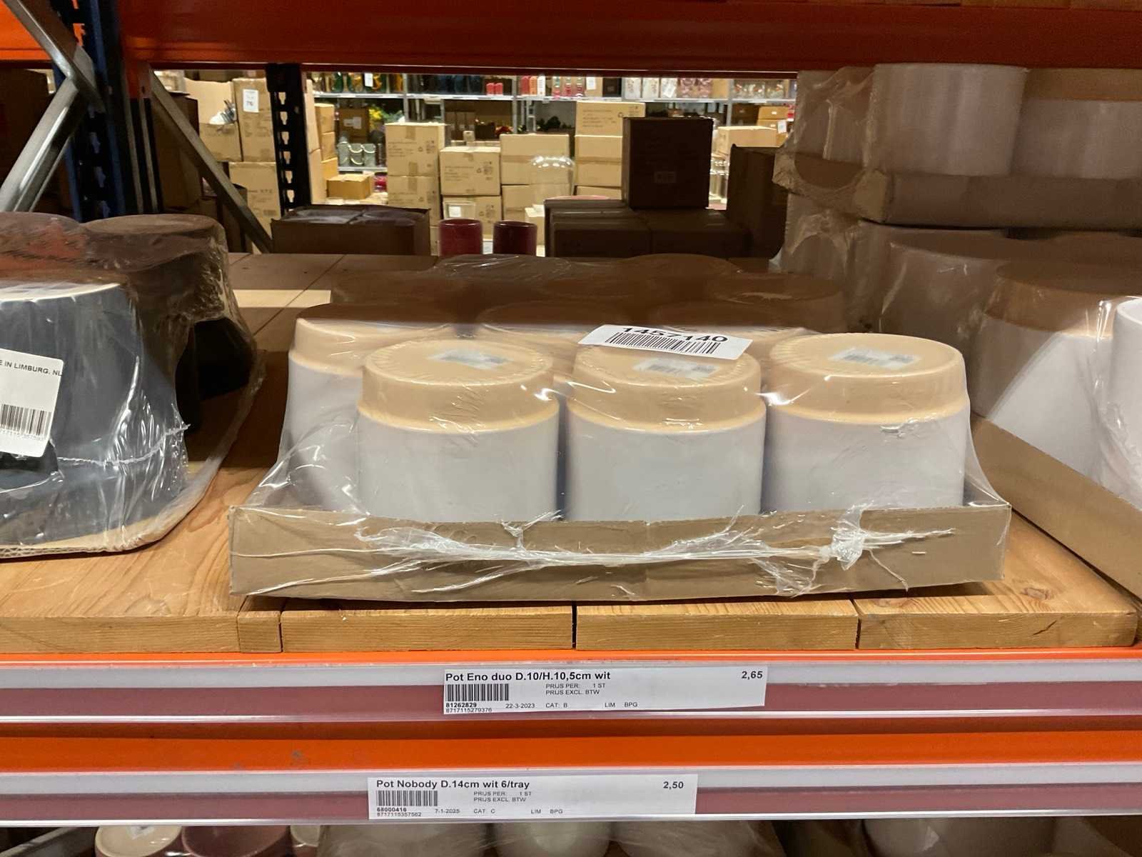 Bestaande uit bloempotten in diverse formaten, kleuren en stijlen in 3 secties en op 1 pallet, inclusief pallets, stelling niet inbegrepen.