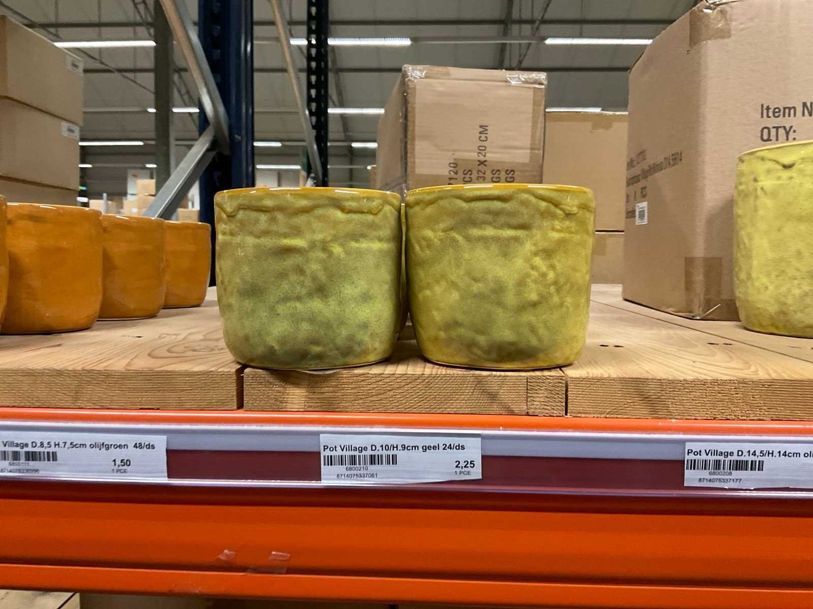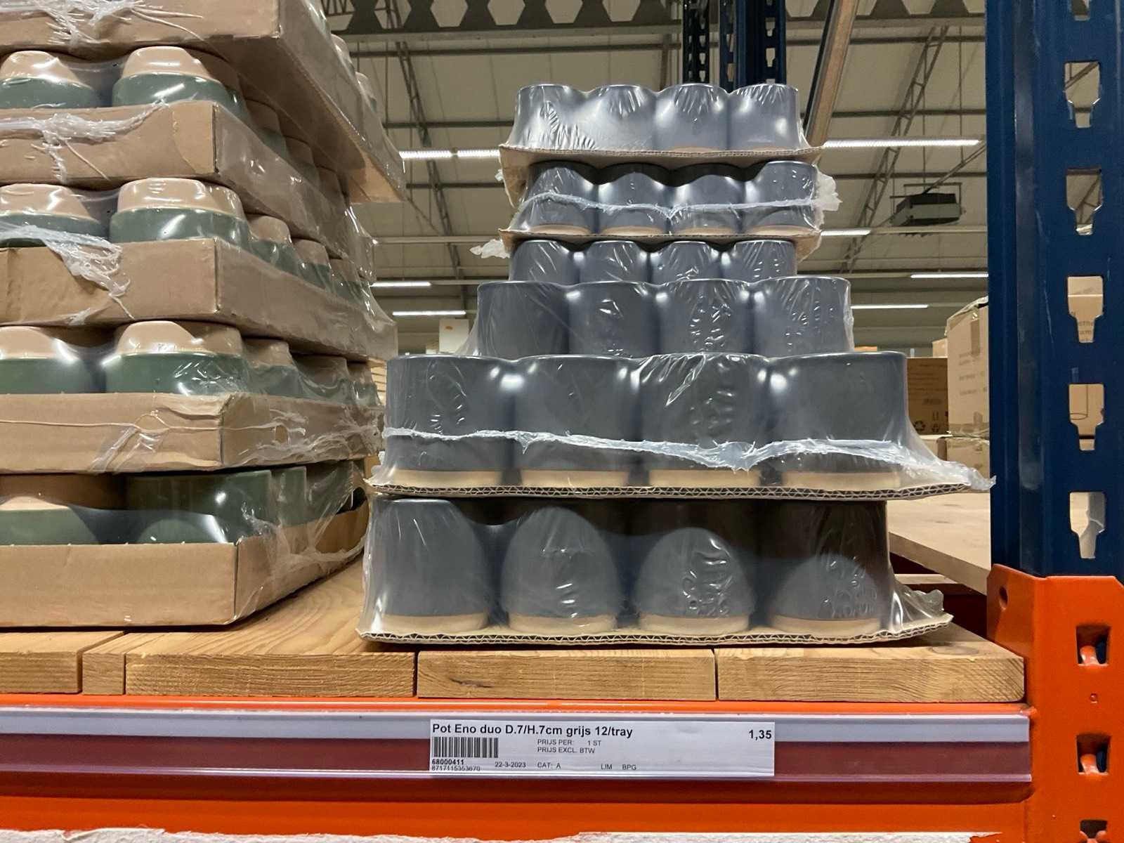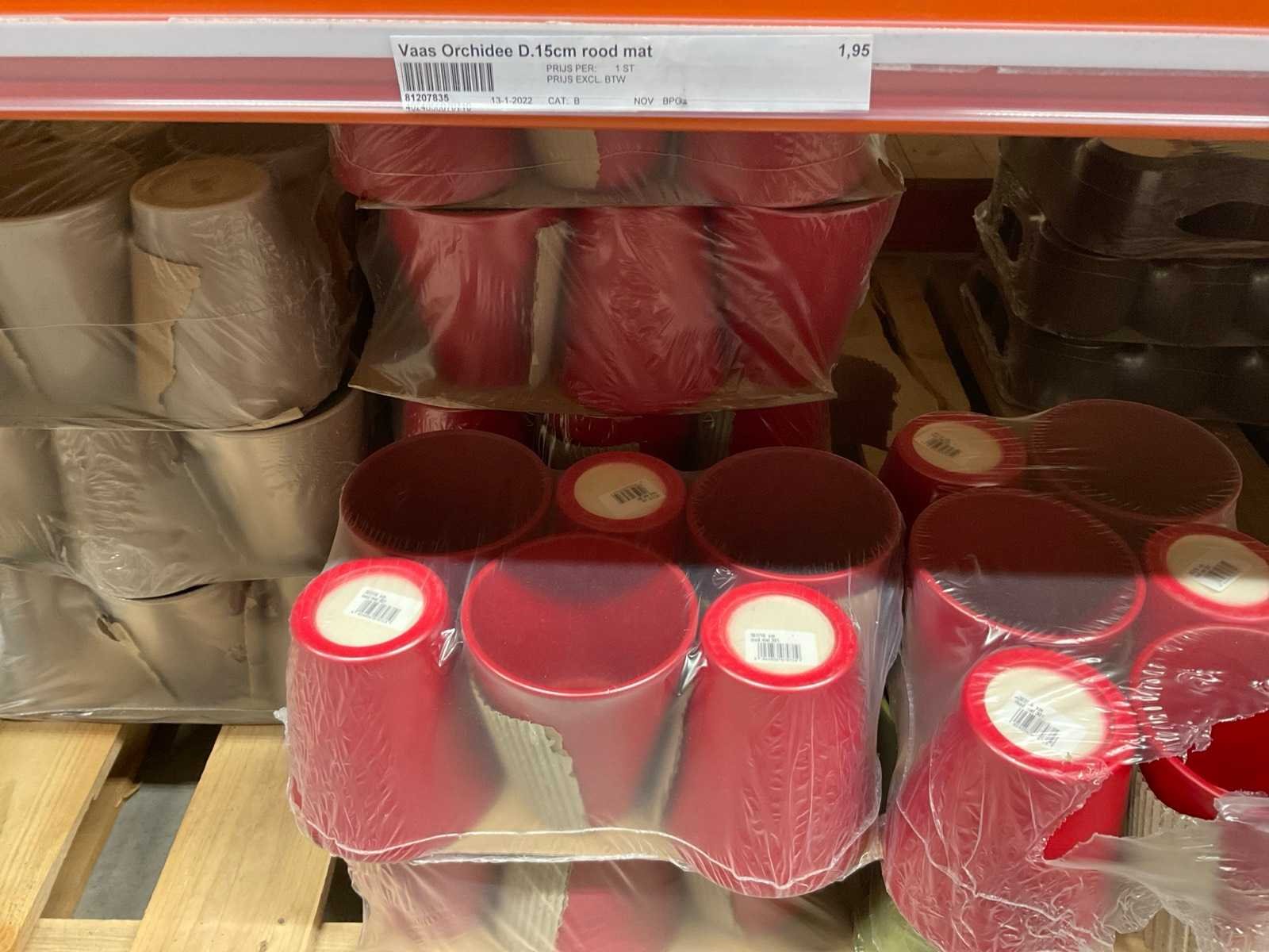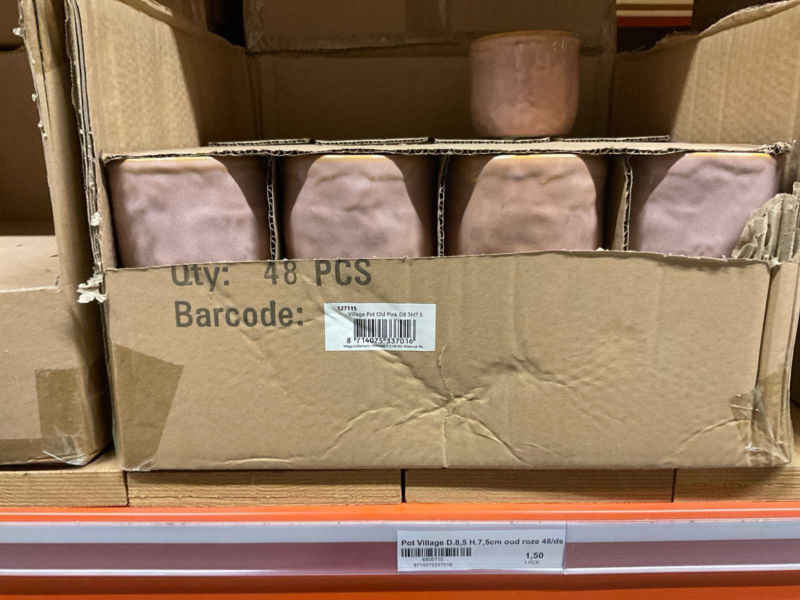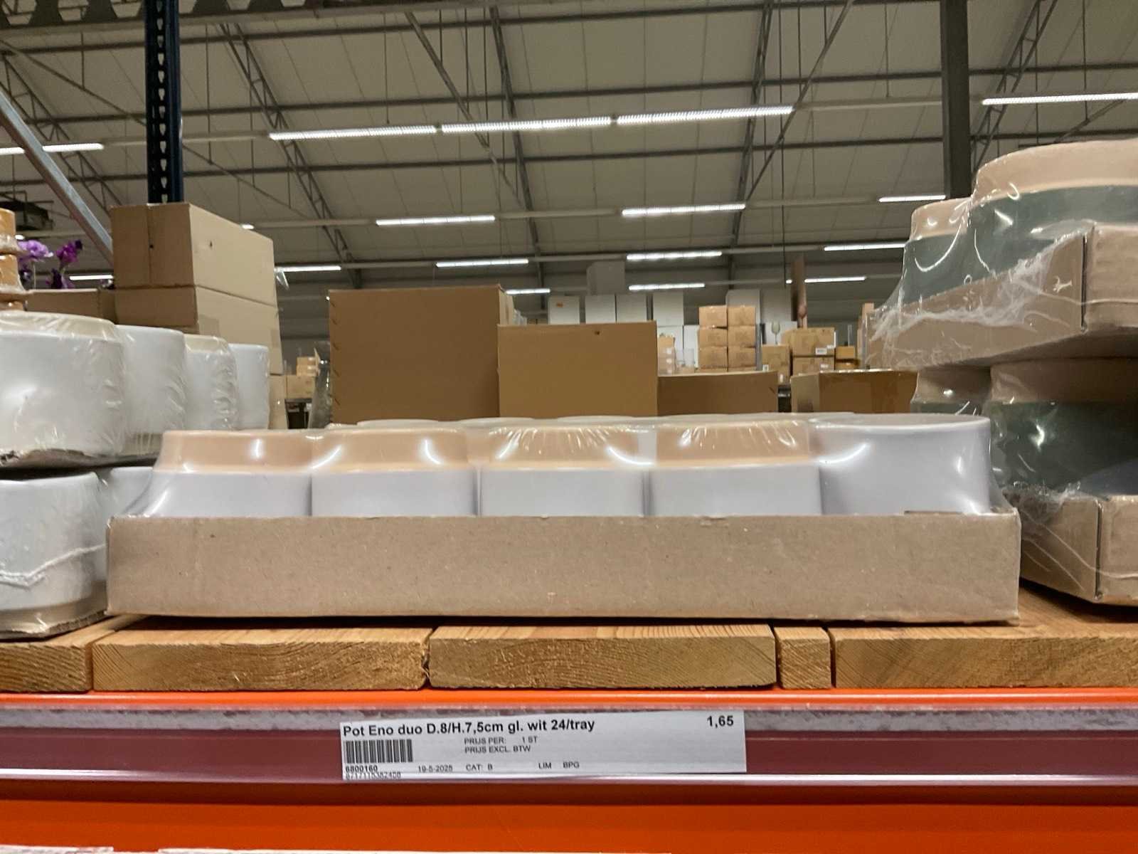 Bestaande uit bloempotten in diverse formaten, kleuren en stijlen in 3 secties en op 1 pallet, inclusief pallets, stelling niet inbegrepen.