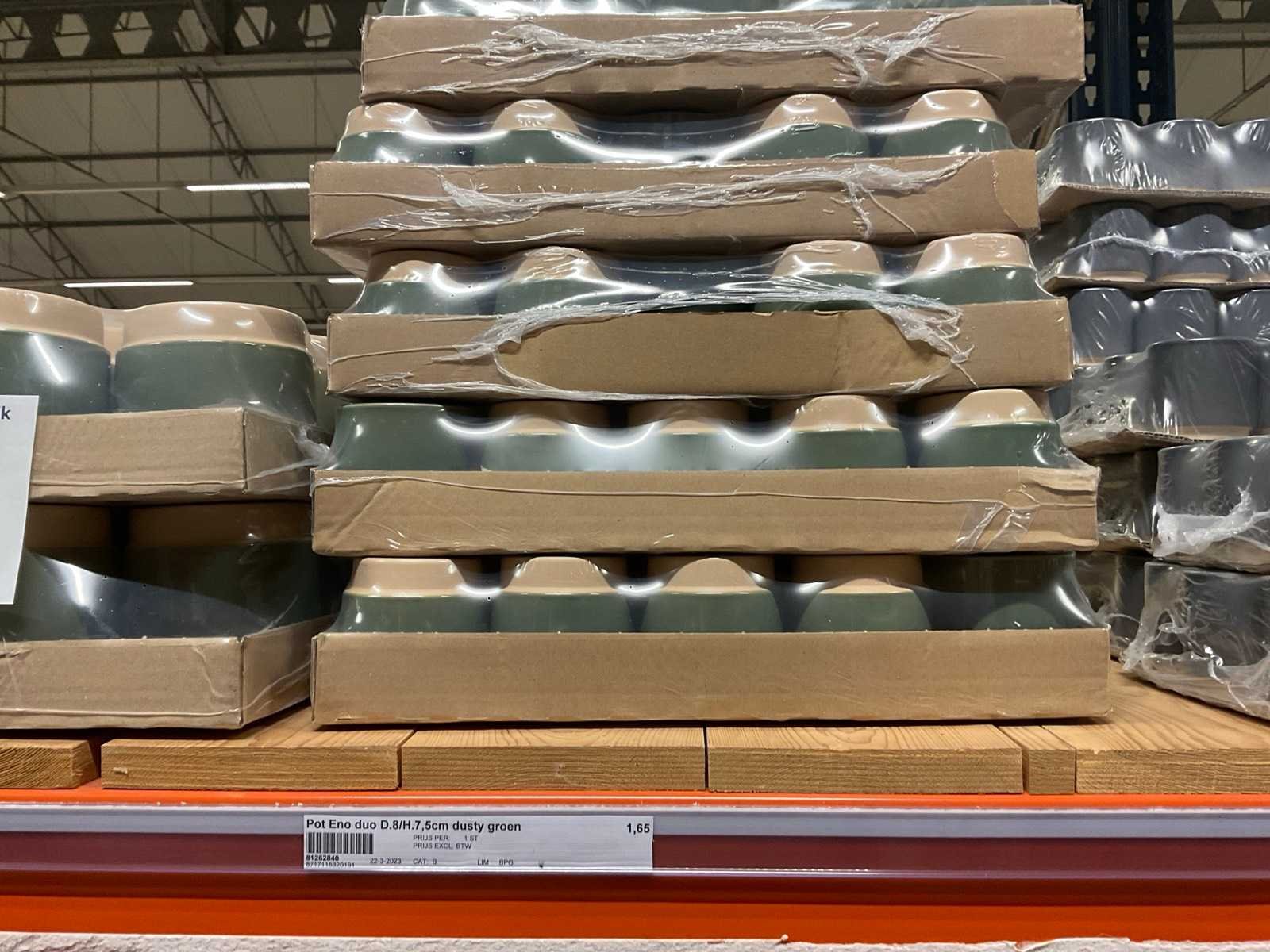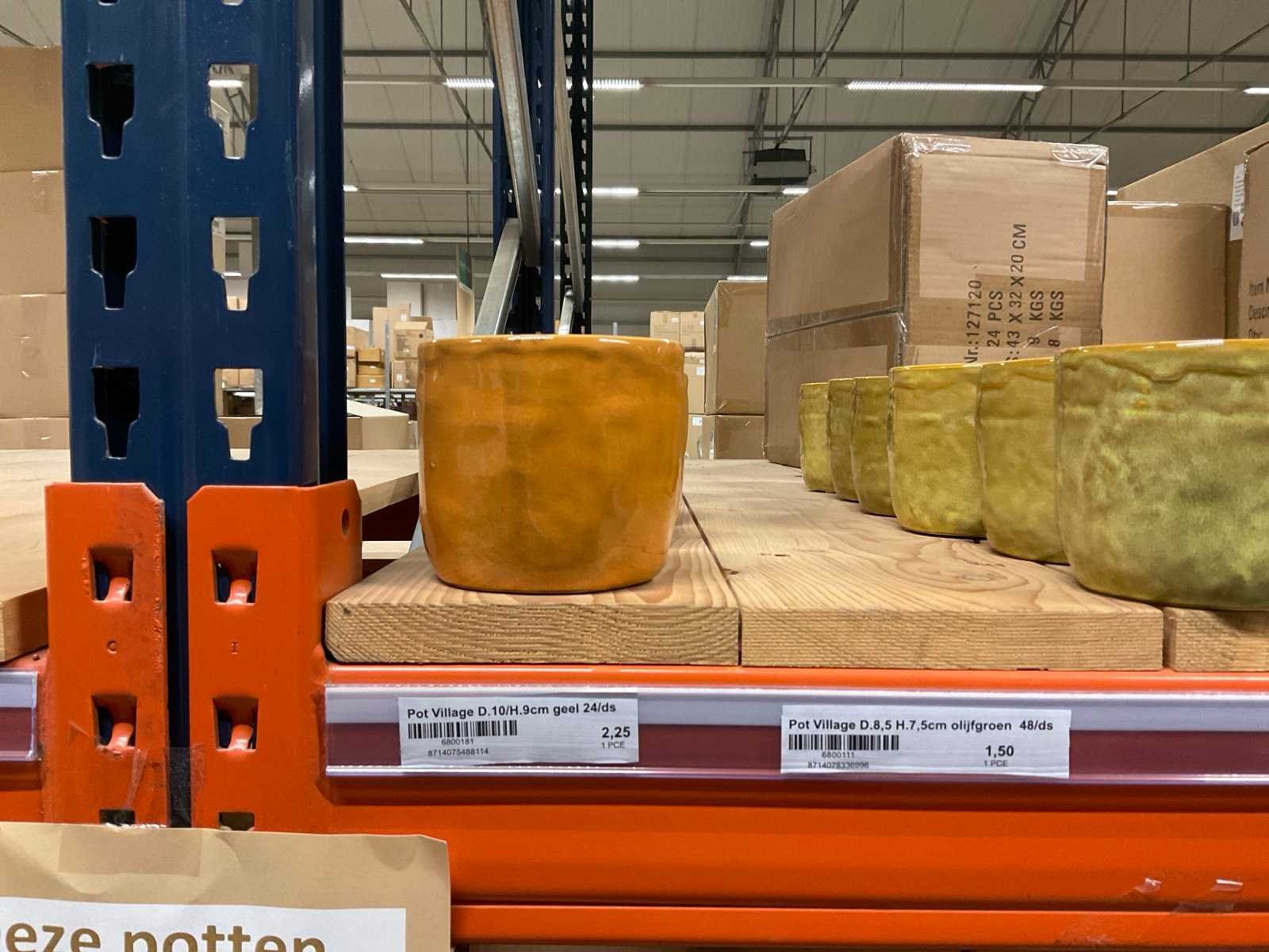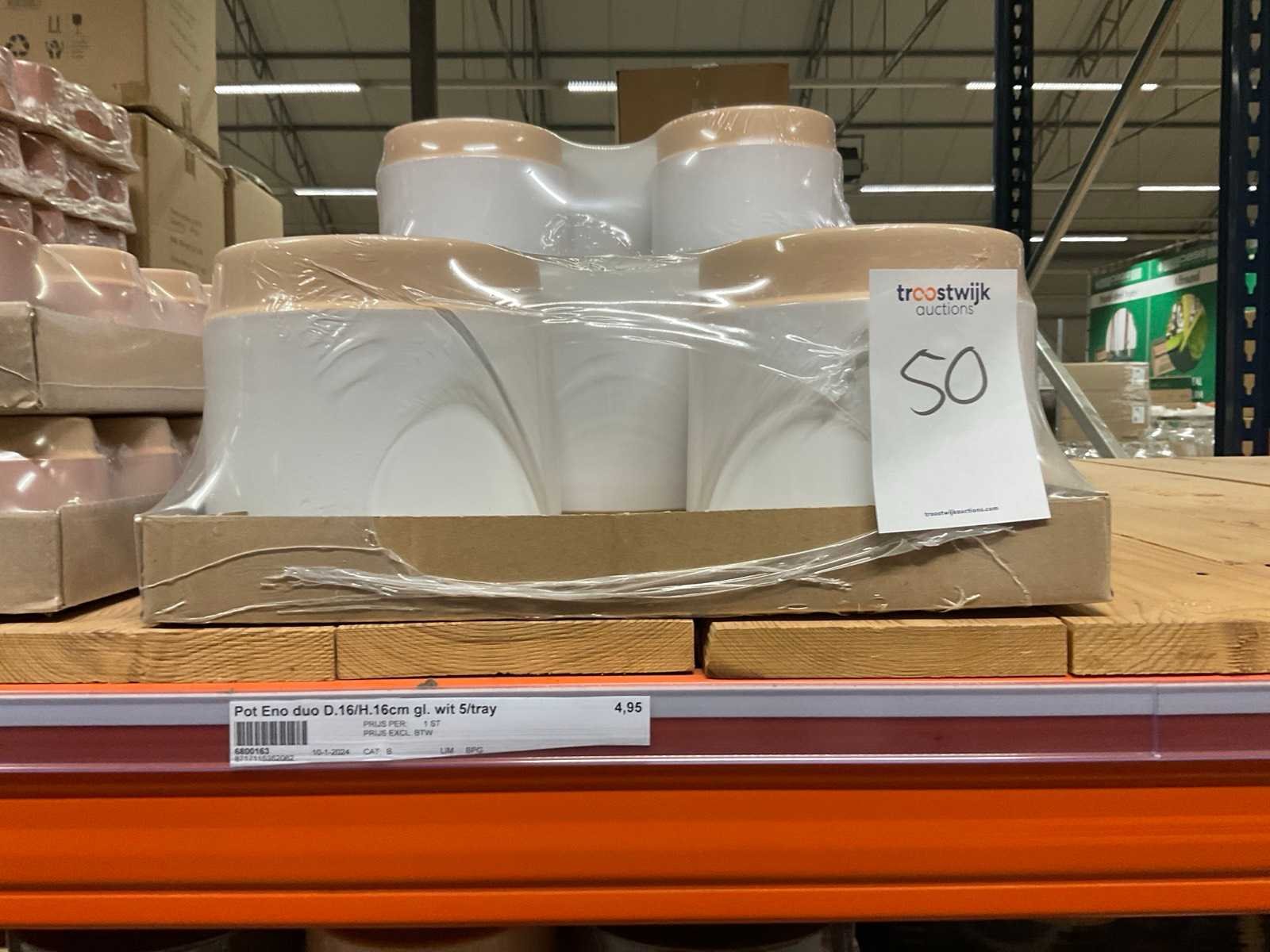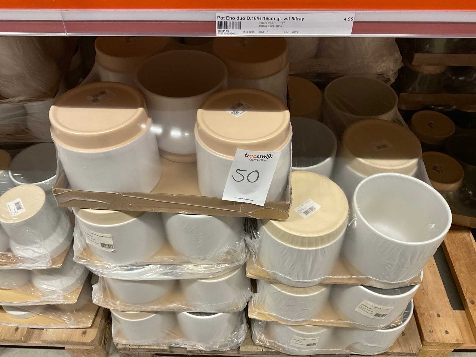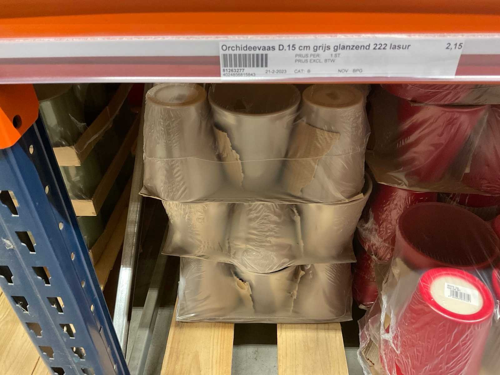Bestaande uit bloempotten in diverse formaten, kleuren en stijlen in 3 secties en op 1 pallet, inclusief pallets, stelling niet inbegrepen.