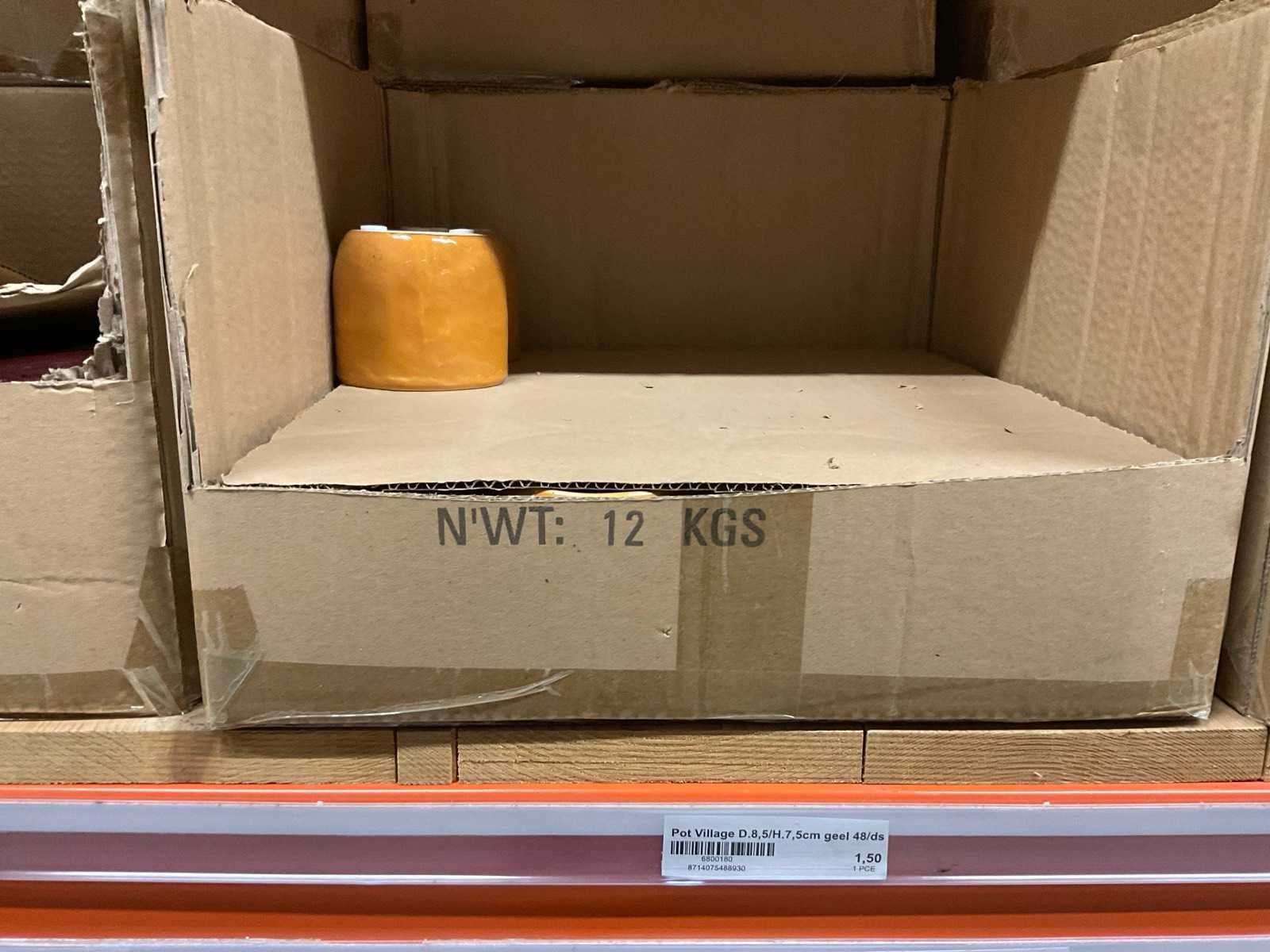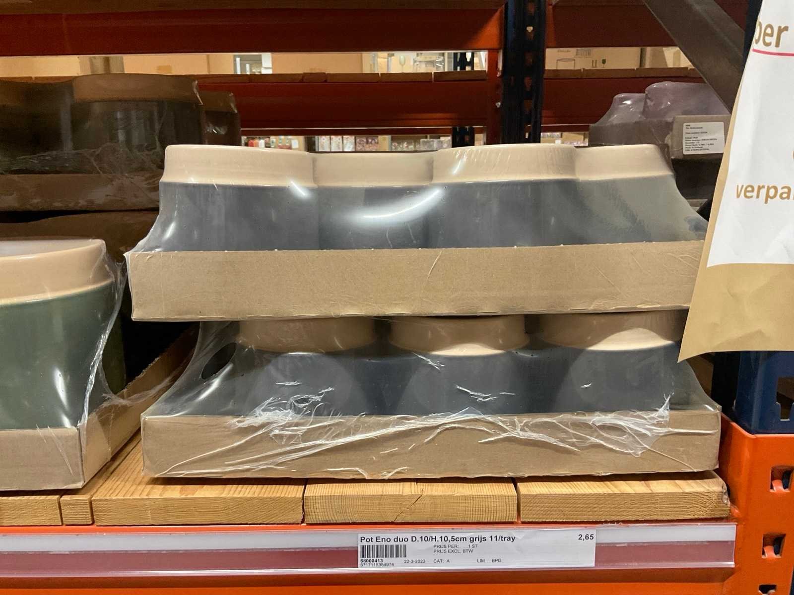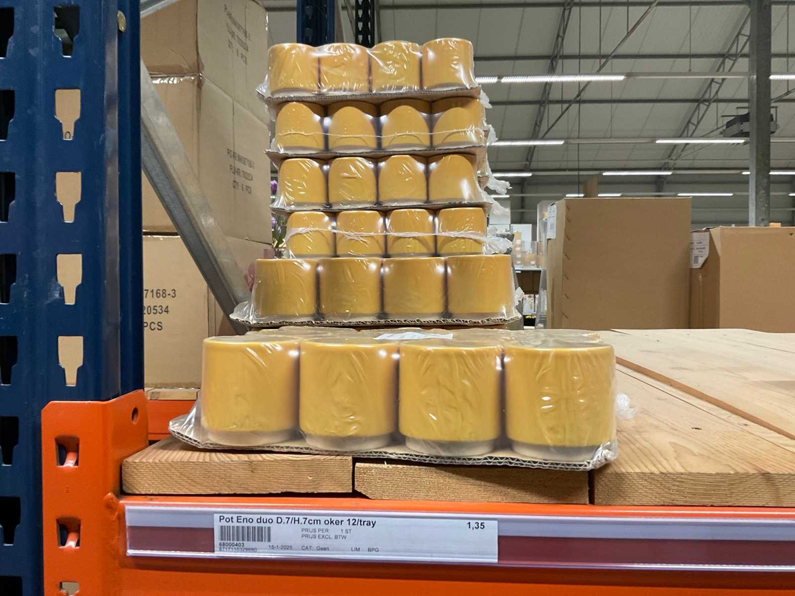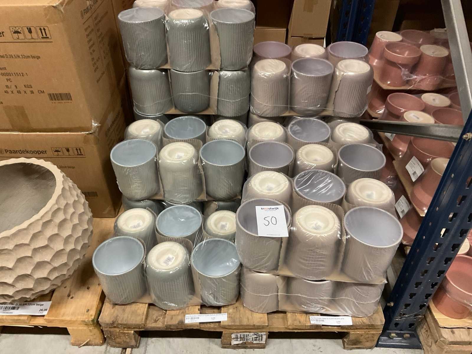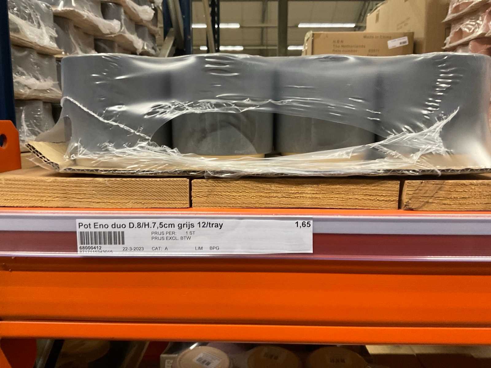 Bestaande uit bloempotten in diverse formaten, kleuren en stijlen in 3 secties en op 1 pallet, inclusief pallets, stelling niet inbegrepen.