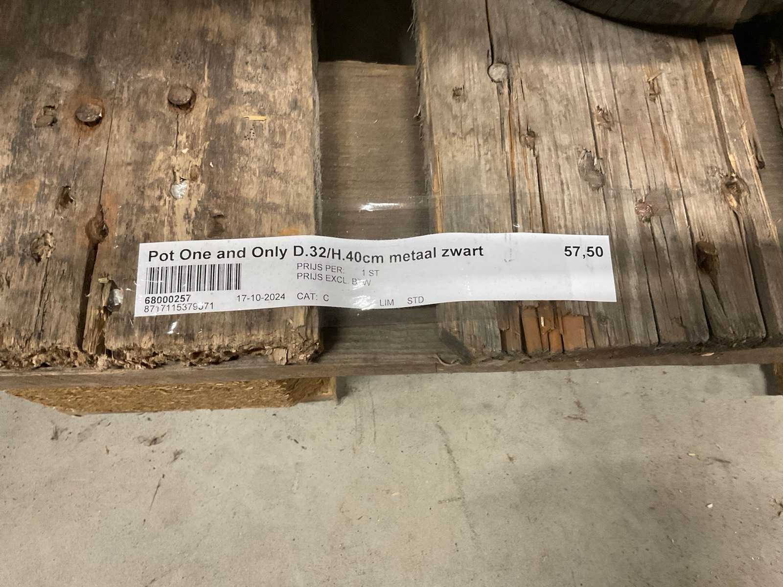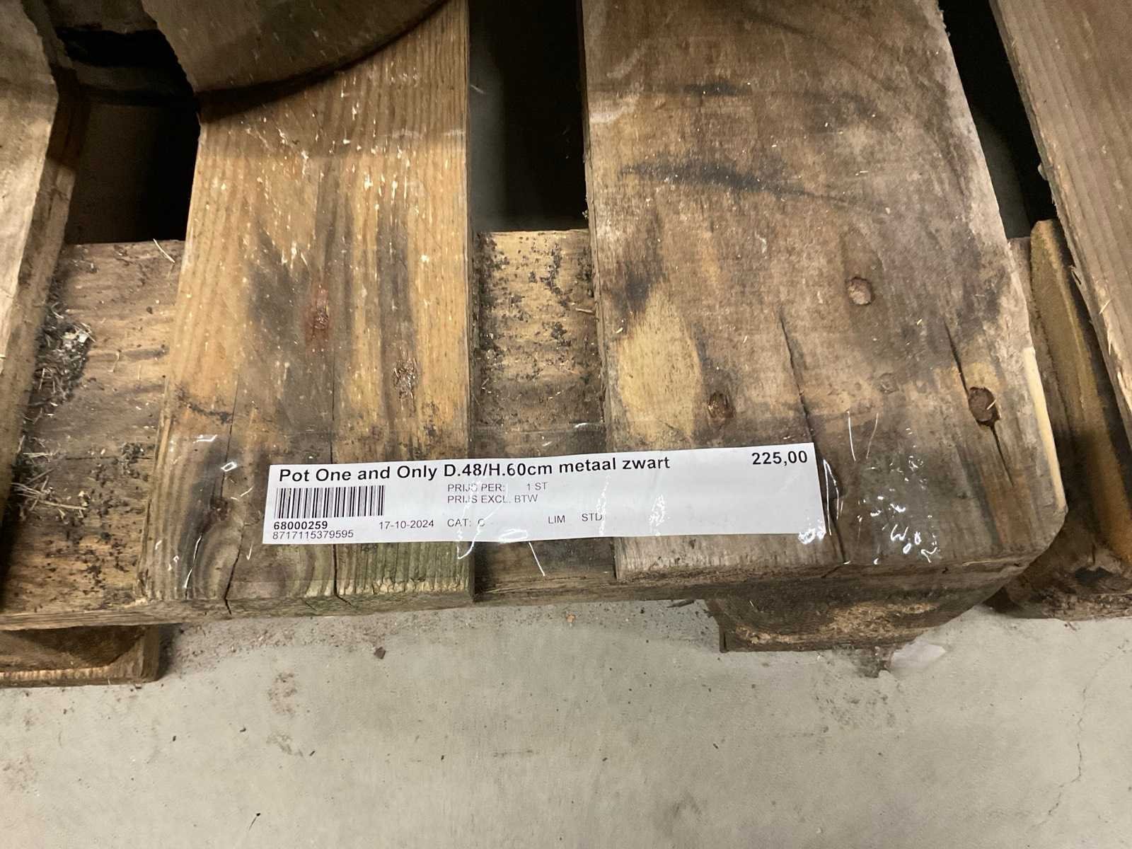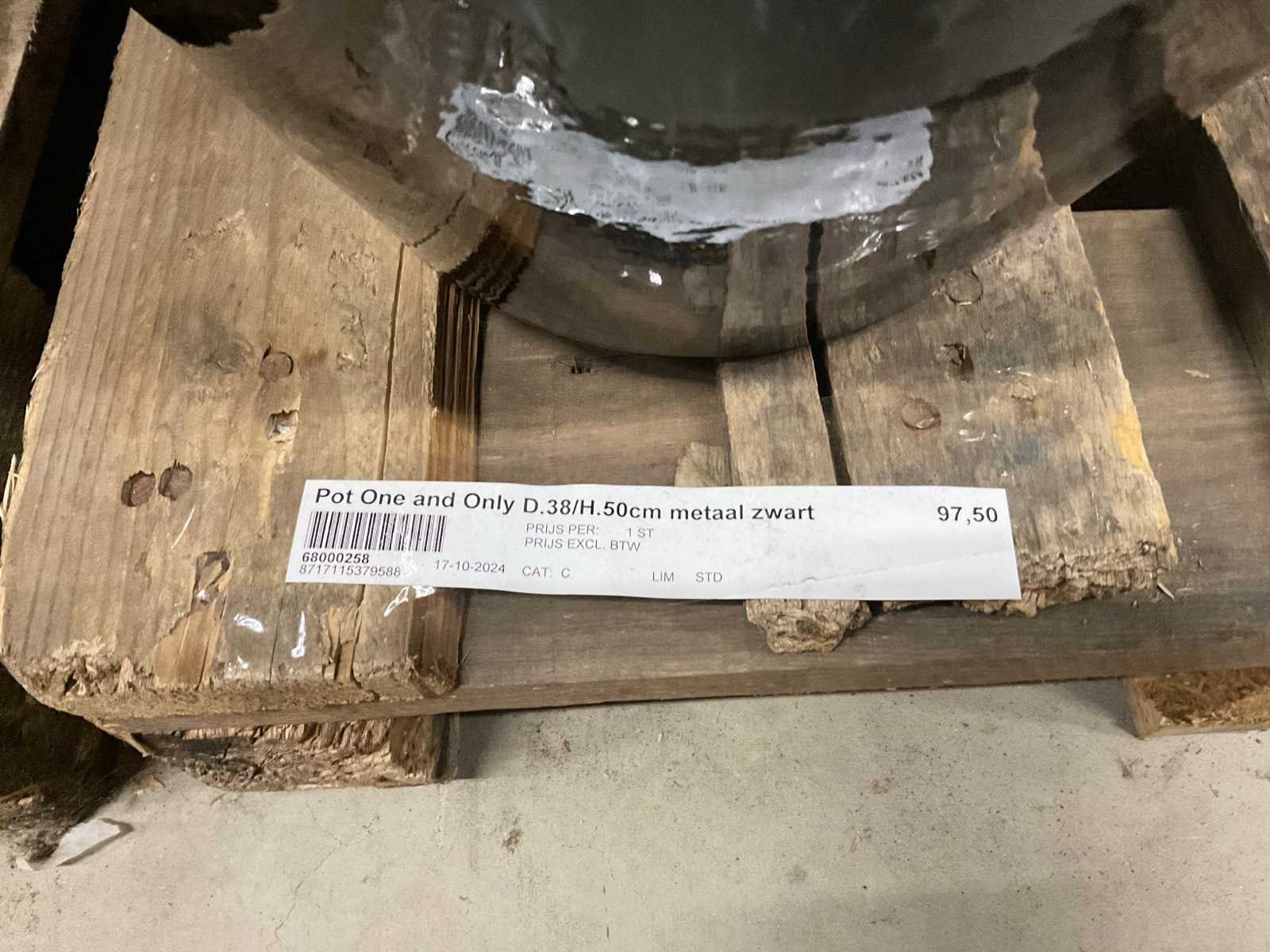 Bestaande uit ca. 9 bloempotten, model: One and Only, hoogtes 40, 50 en 60 cm in metaal zwart op 2 pallets, inclusief pallets. Model: One and only