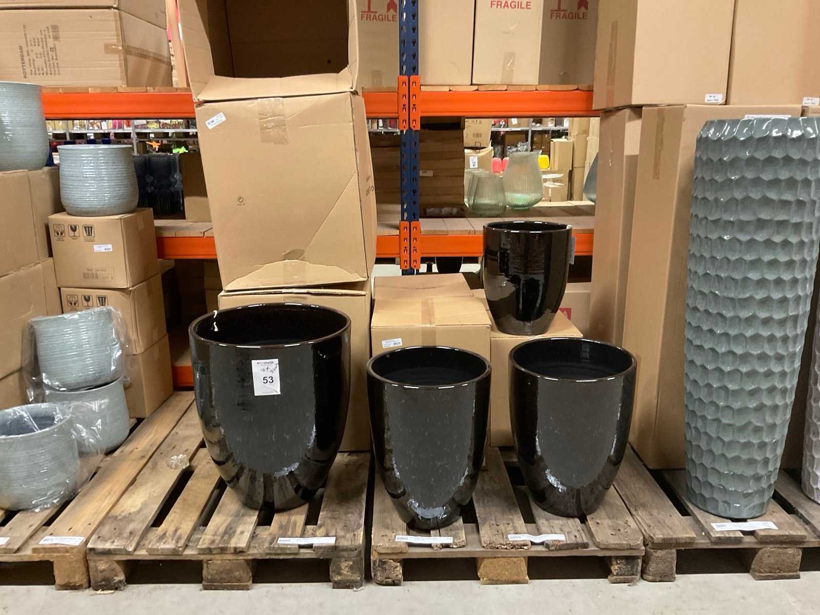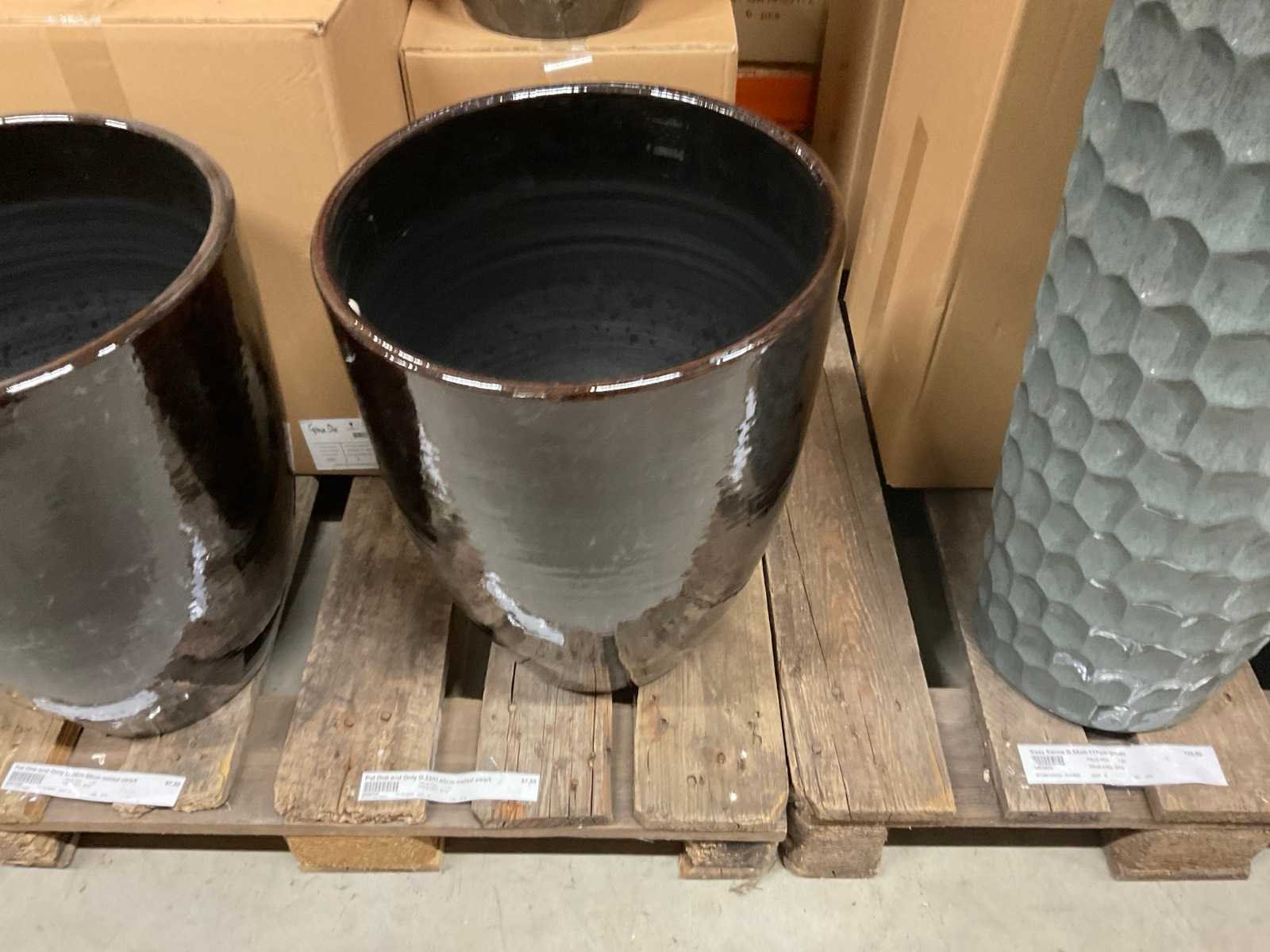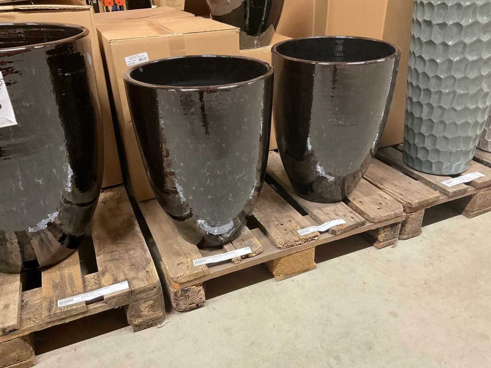 Bestaande uit ca. 9 bloempotten, model: One and Only, hoogtes 40, 50 en 60 cm in metaal zwart op 2 pallets, inclusief pallets. Model: One and only