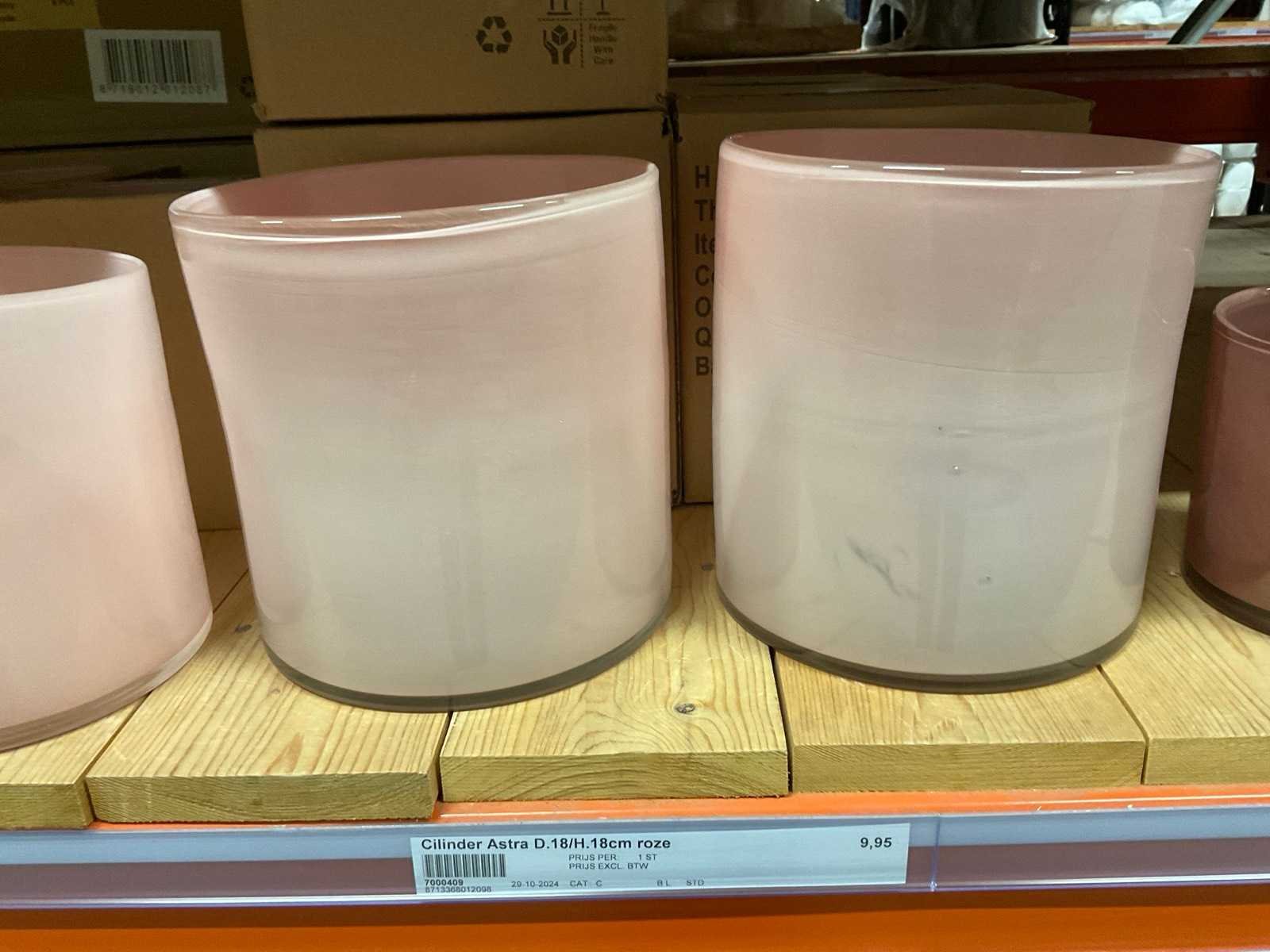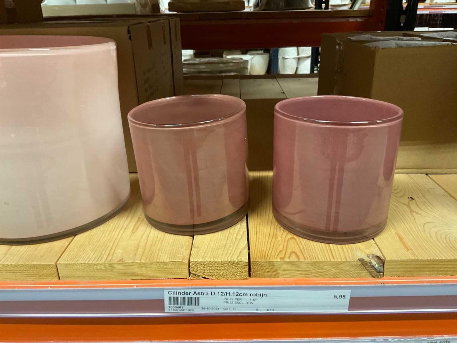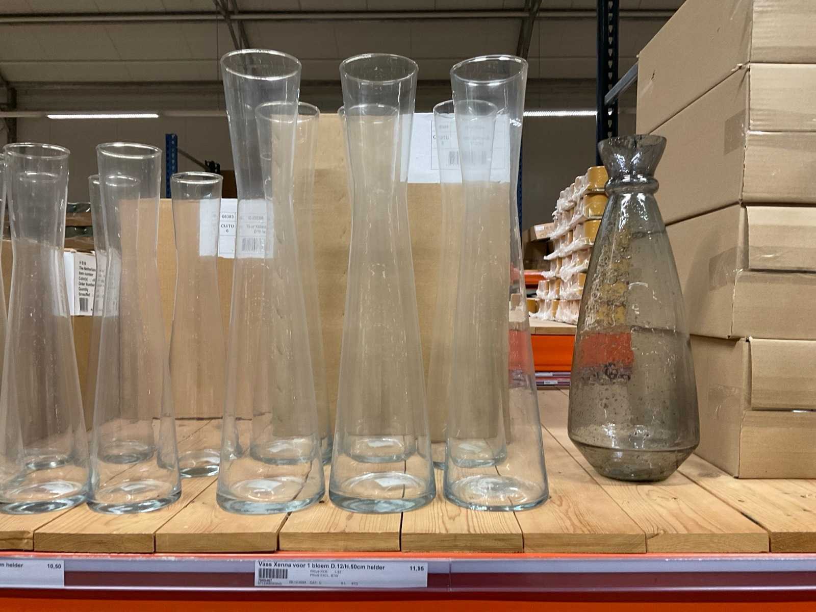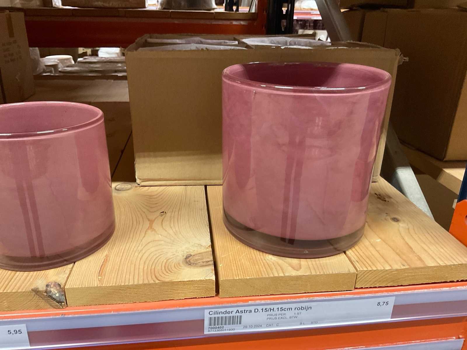 Vazen, bloempotten en cilinders in diverse modellen, kleuren en formaten, alles in sectie van stelling, stelling niet inbegrepen.