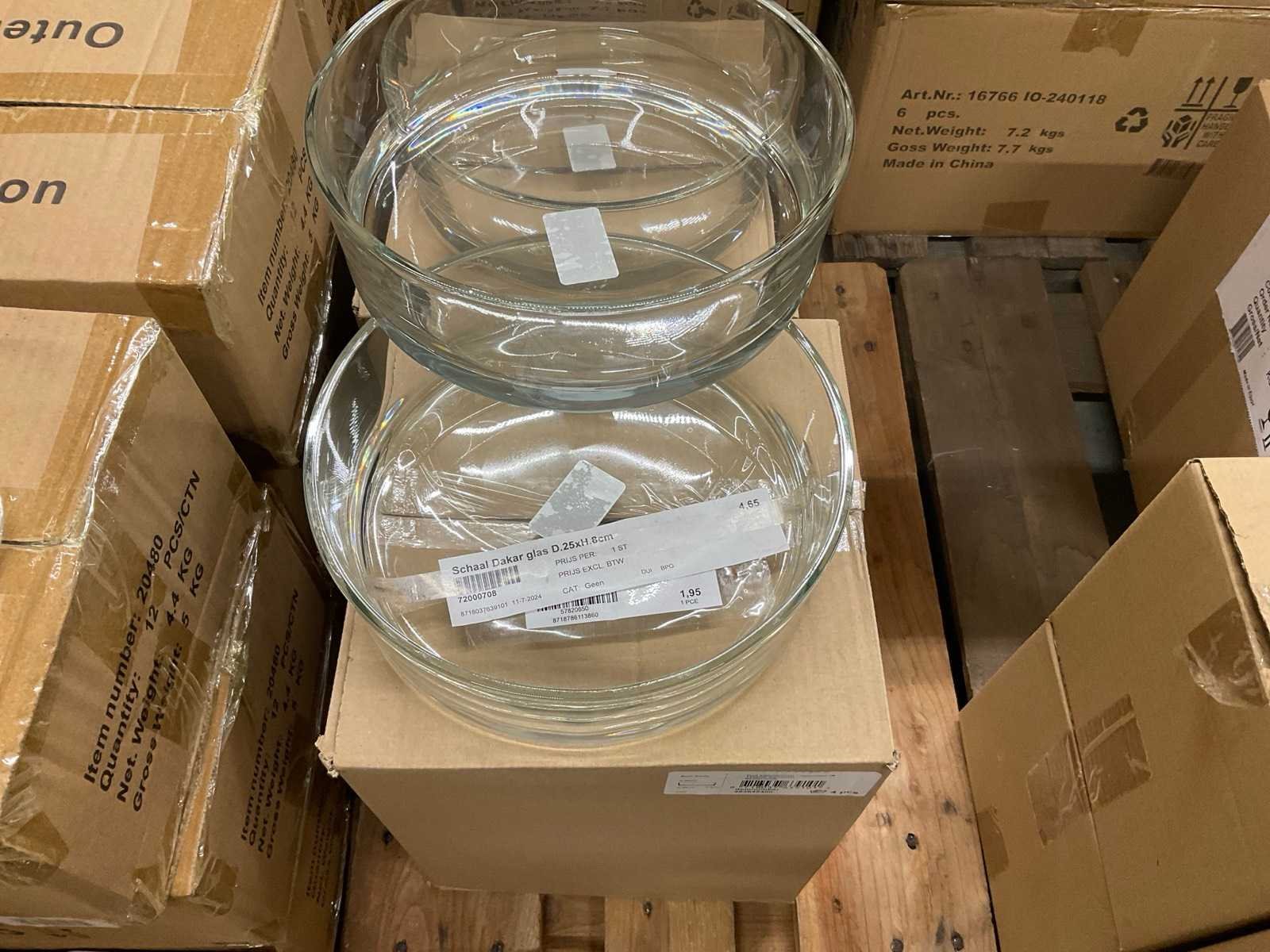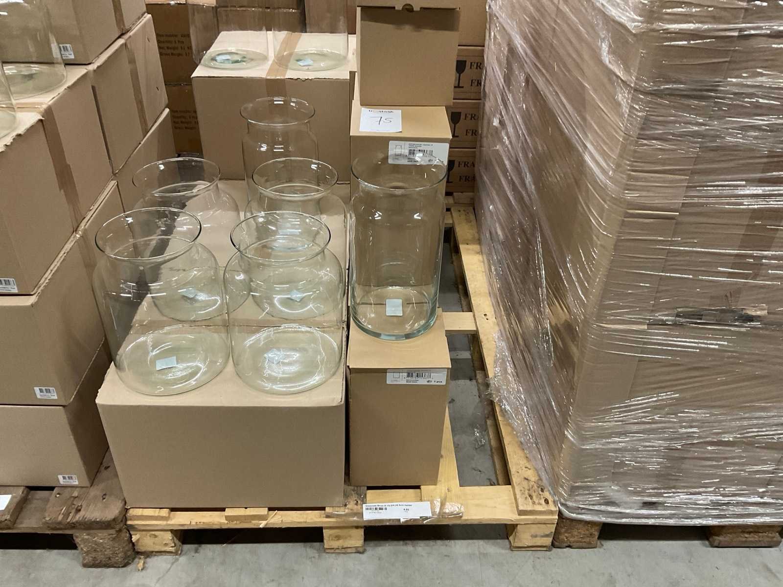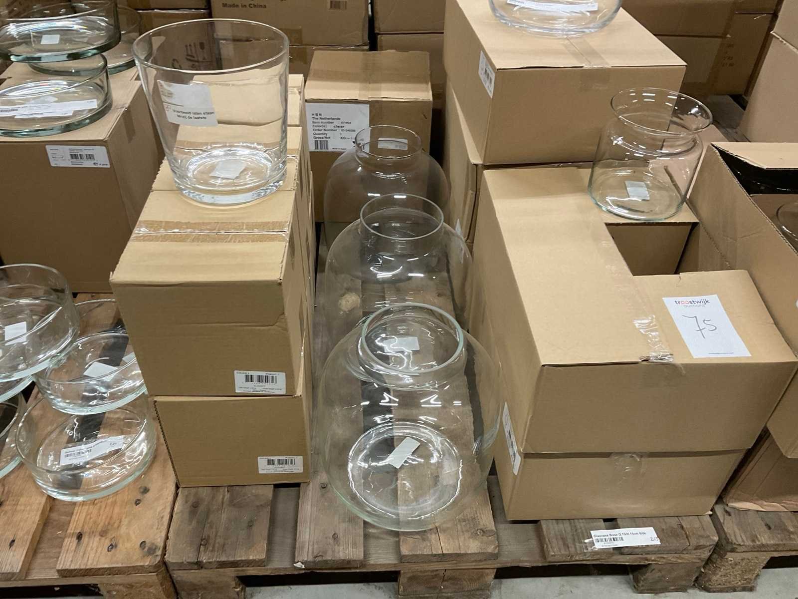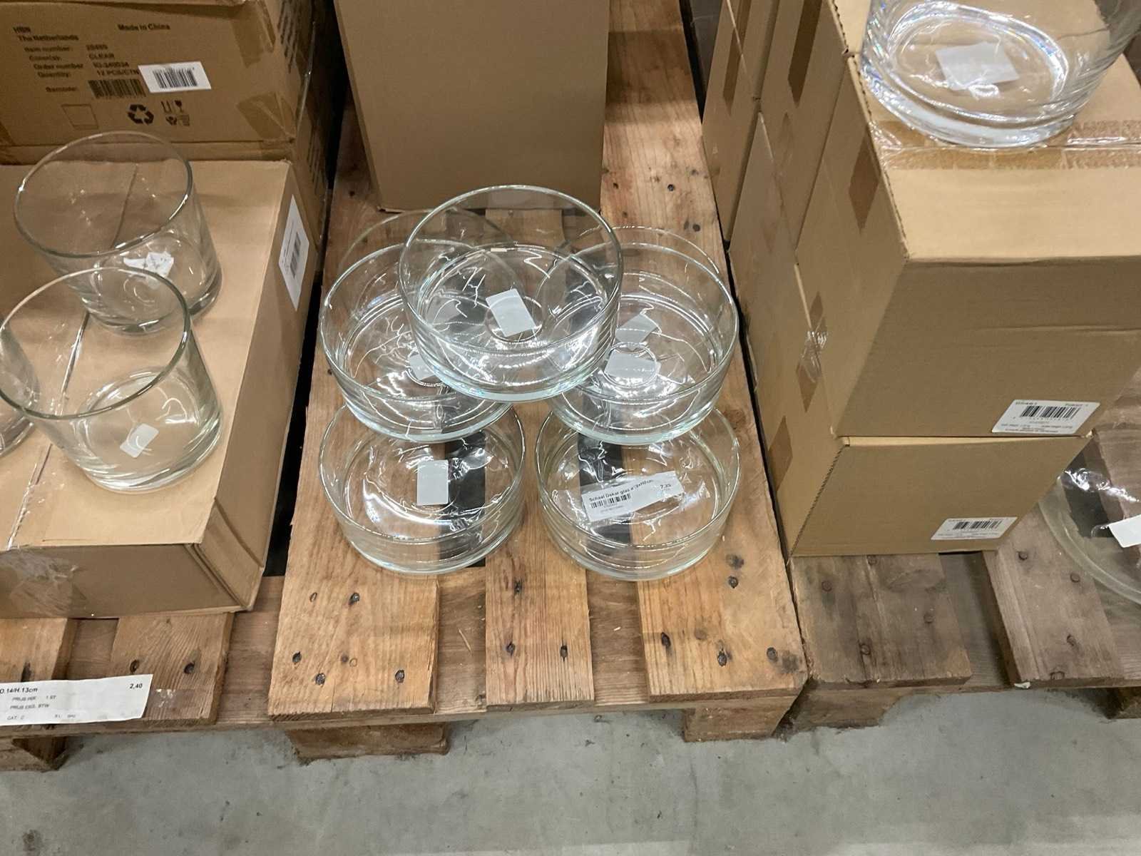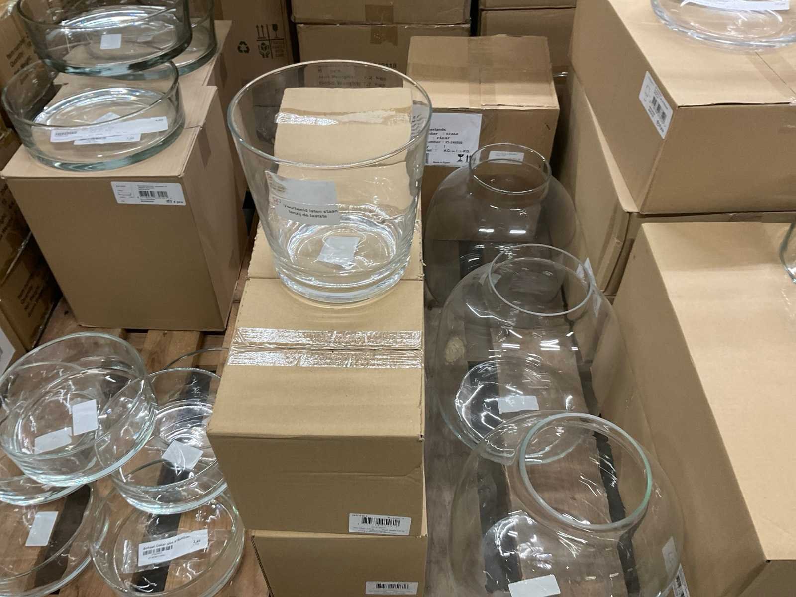 Glazen vazen en schalen op 5 pallets, in diverse vormen en formaten, inclusief pallets. Merk: Glazen