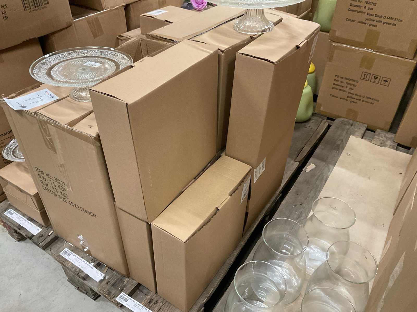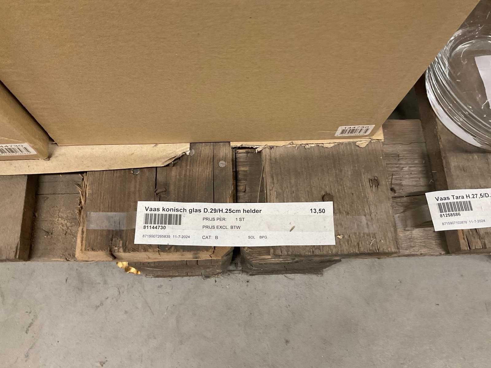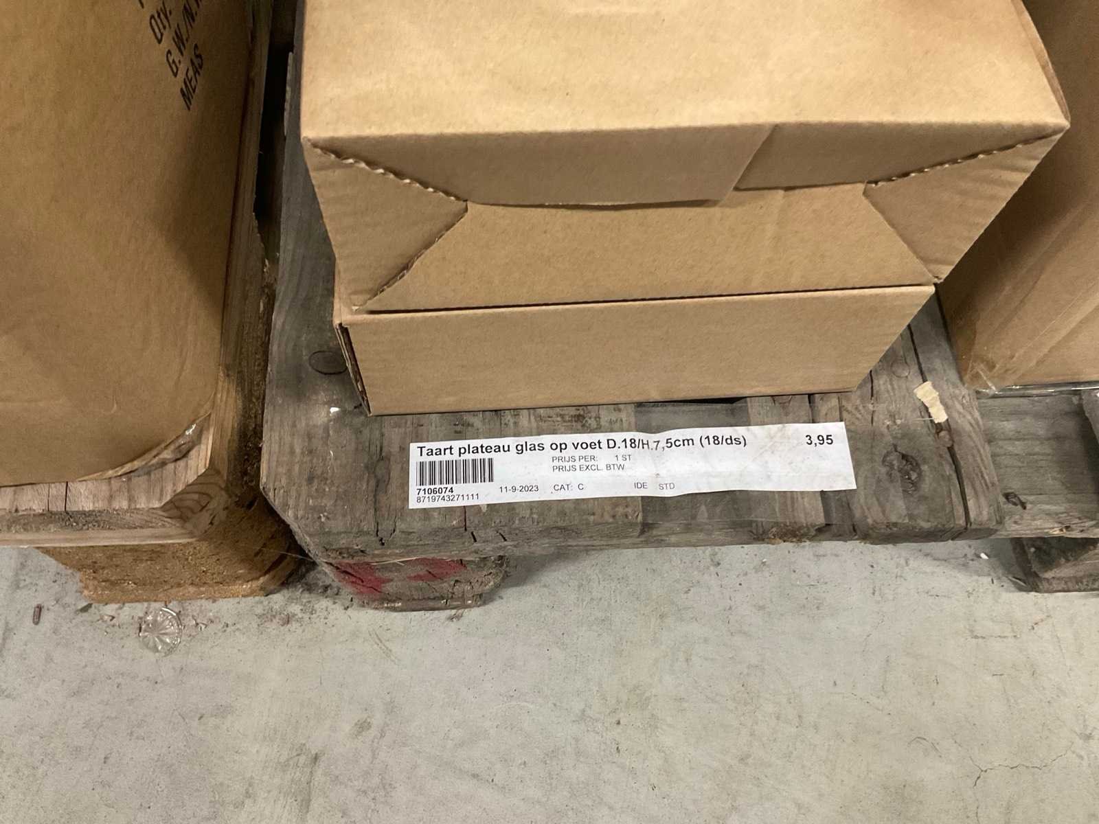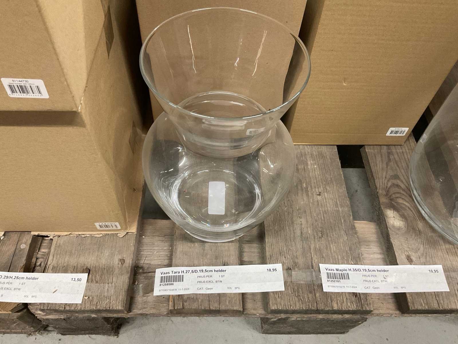 Glazen vazen en taartplateau’s op 3 pallets, in diverse vormen en formaten, inclusief pallets. Merk: Glazen
