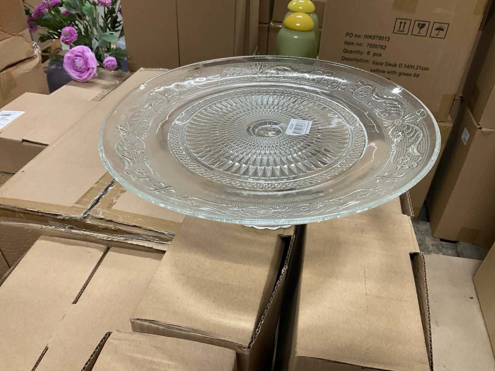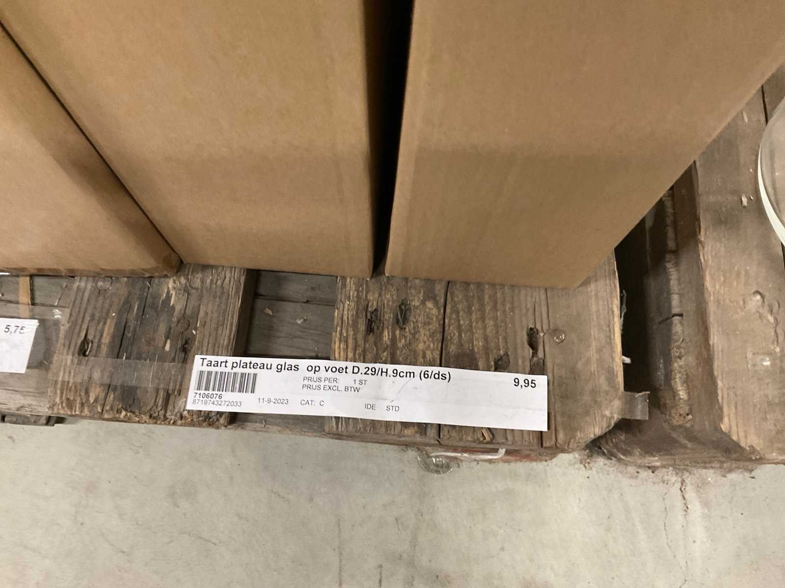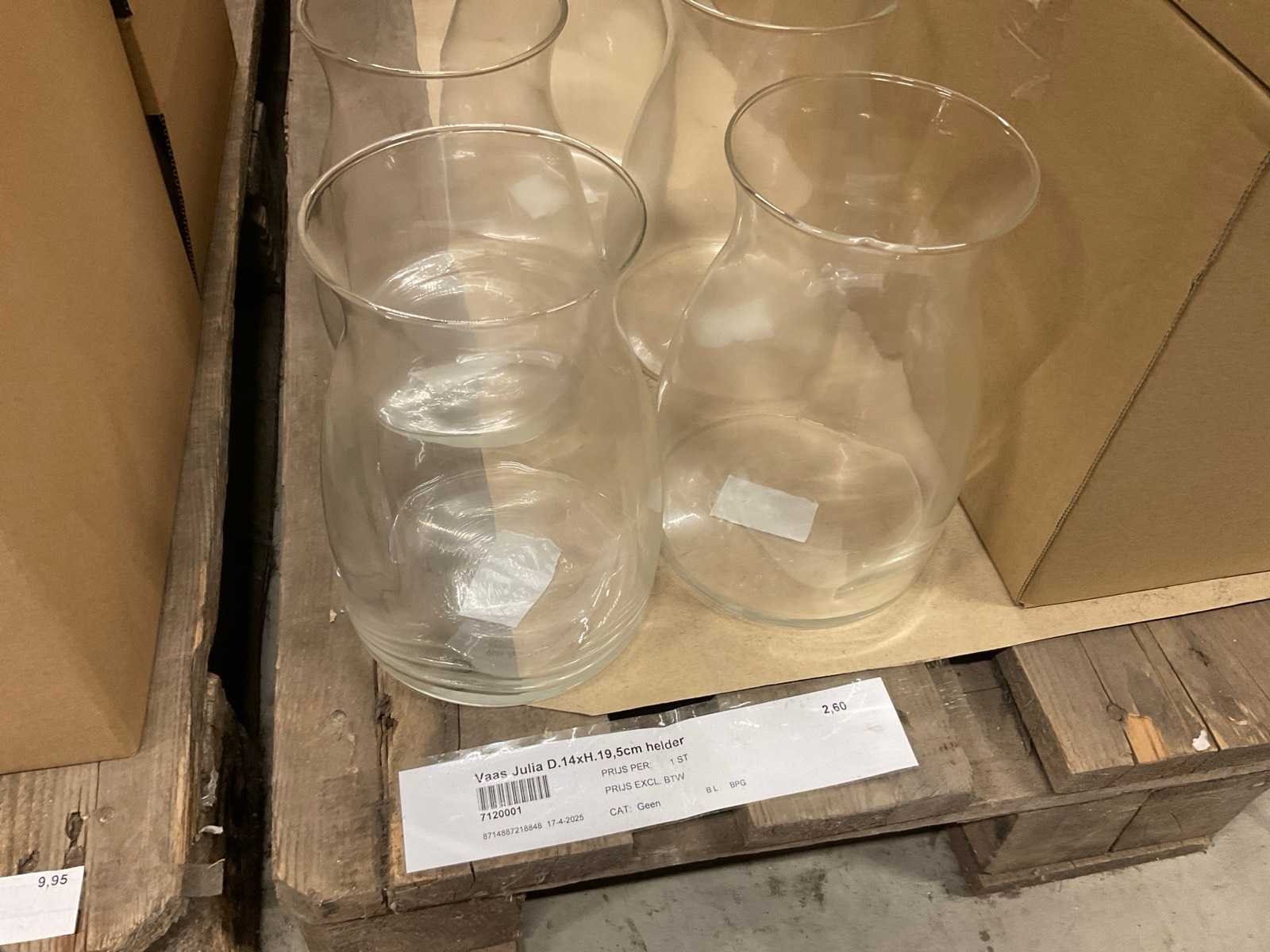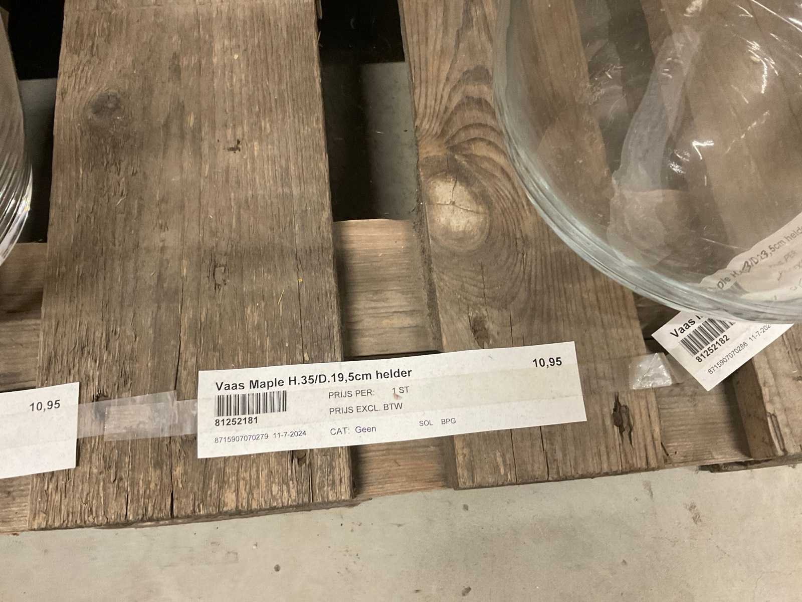 Glazen vazen en taartplateau’s op 3 pallets, in diverse vormen en formaten, inclusief pallets. Merk: Glazen