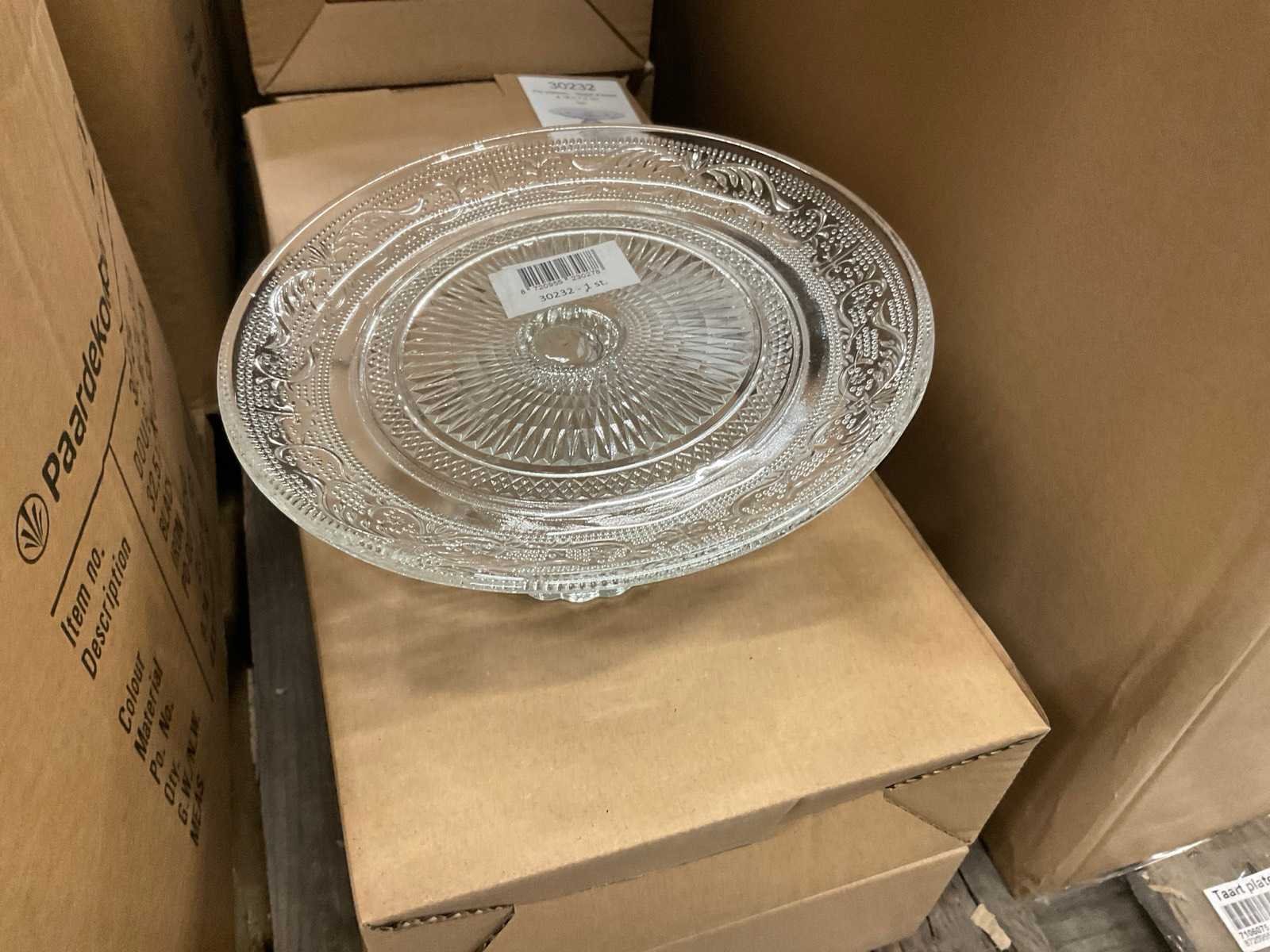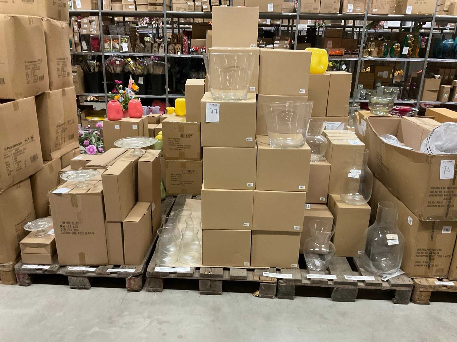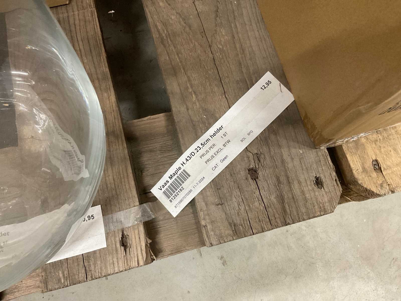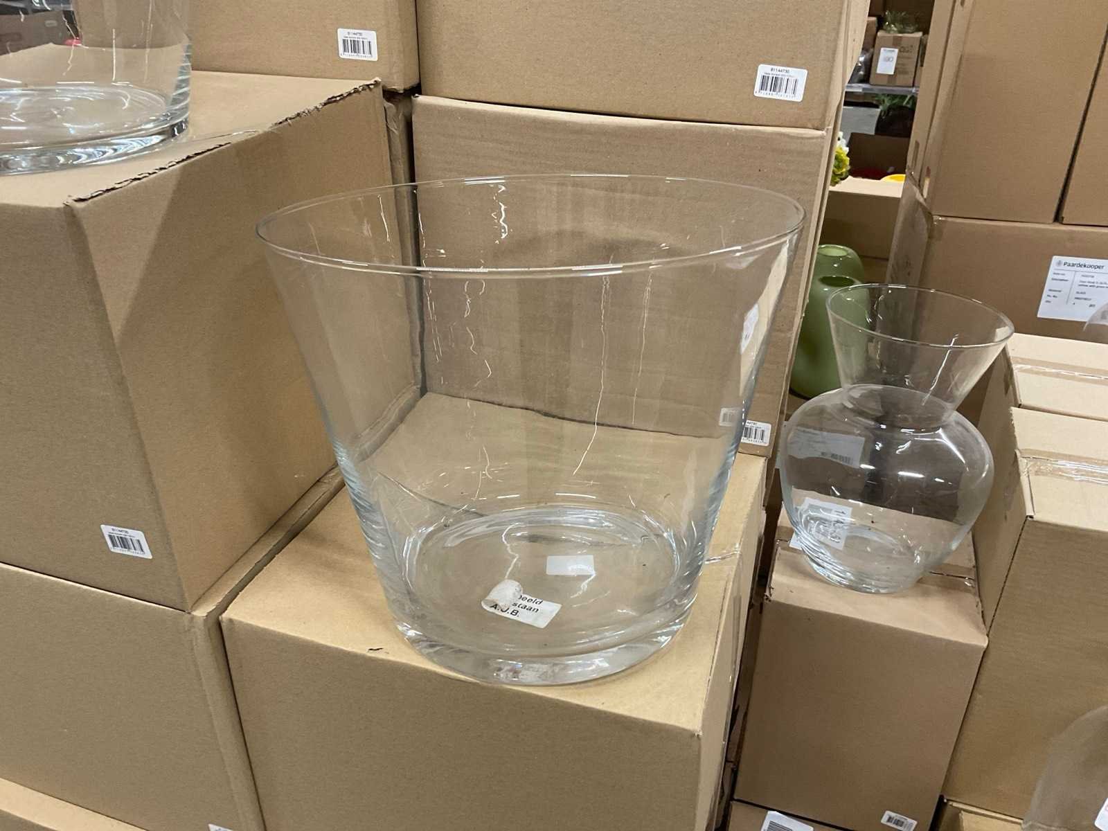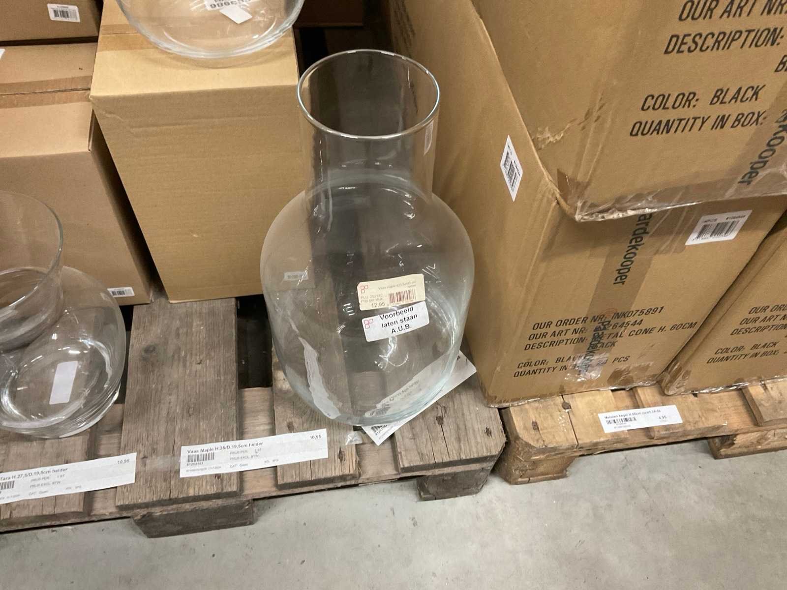 Glazen vazen en taartplateau’s op 3 pallets, in diverse vormen en formaten, inclusief pallets. Merk: Glazen