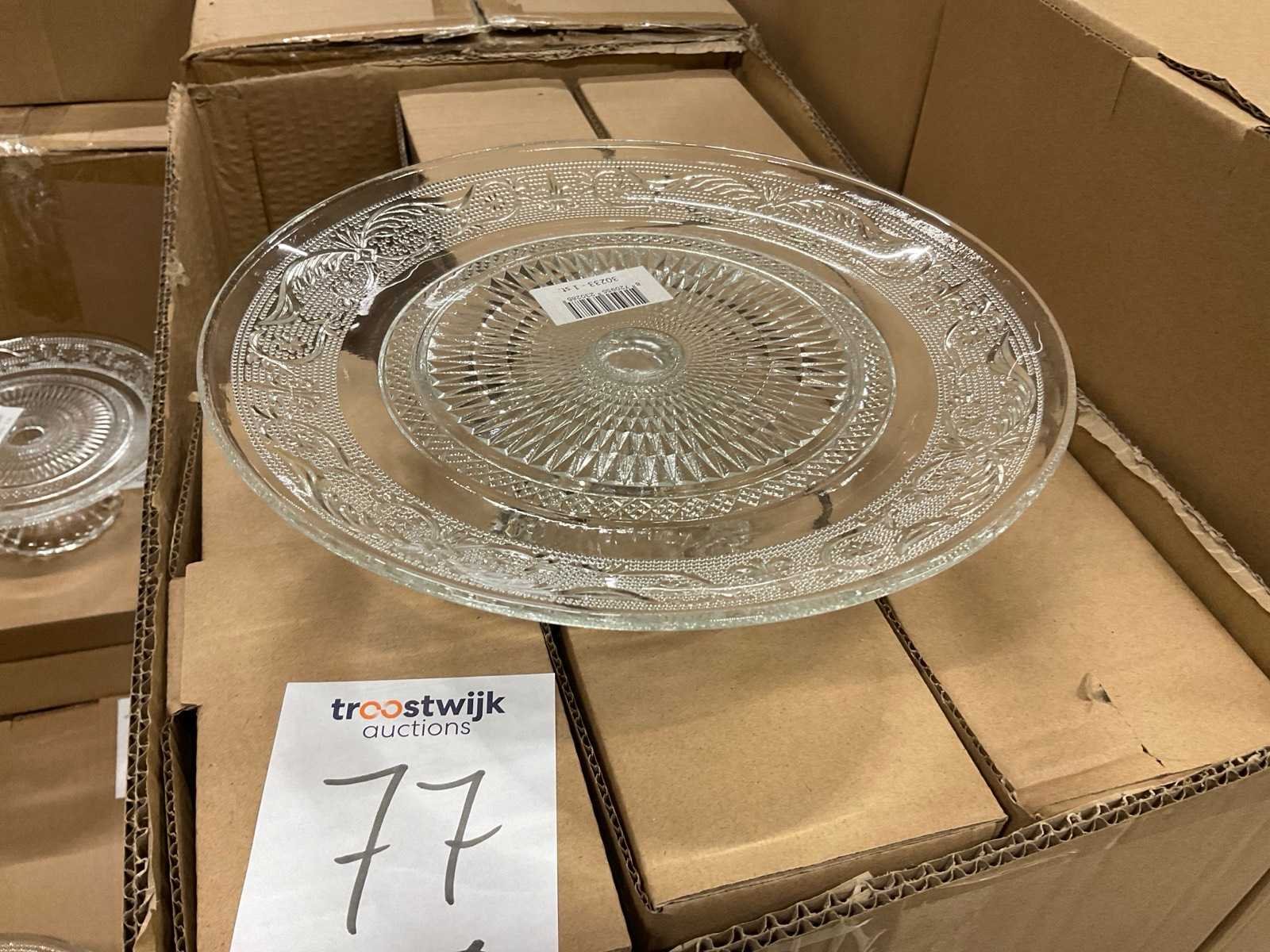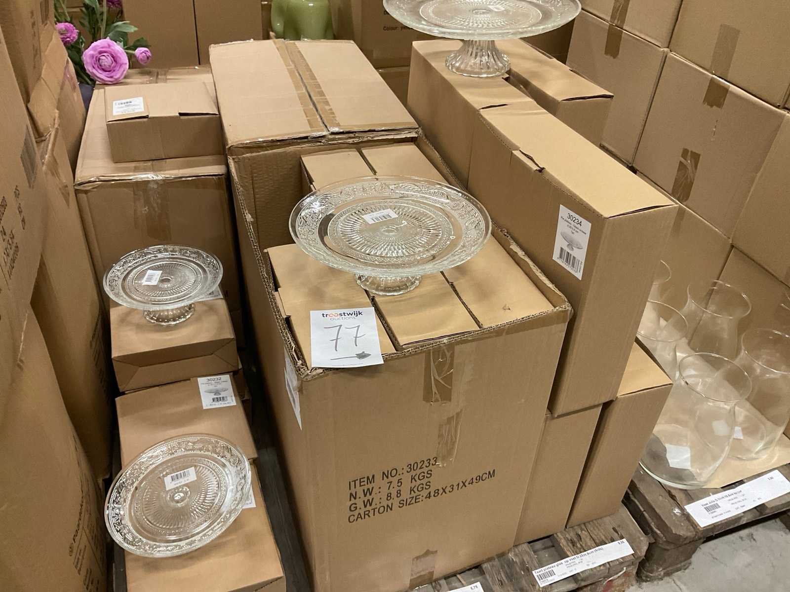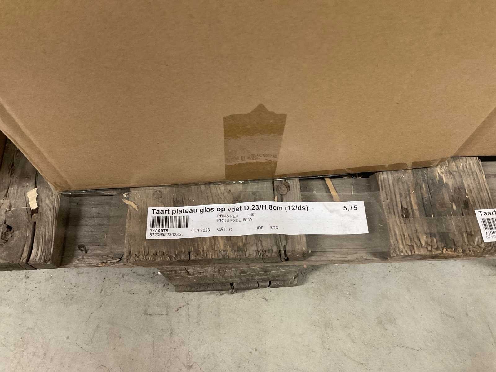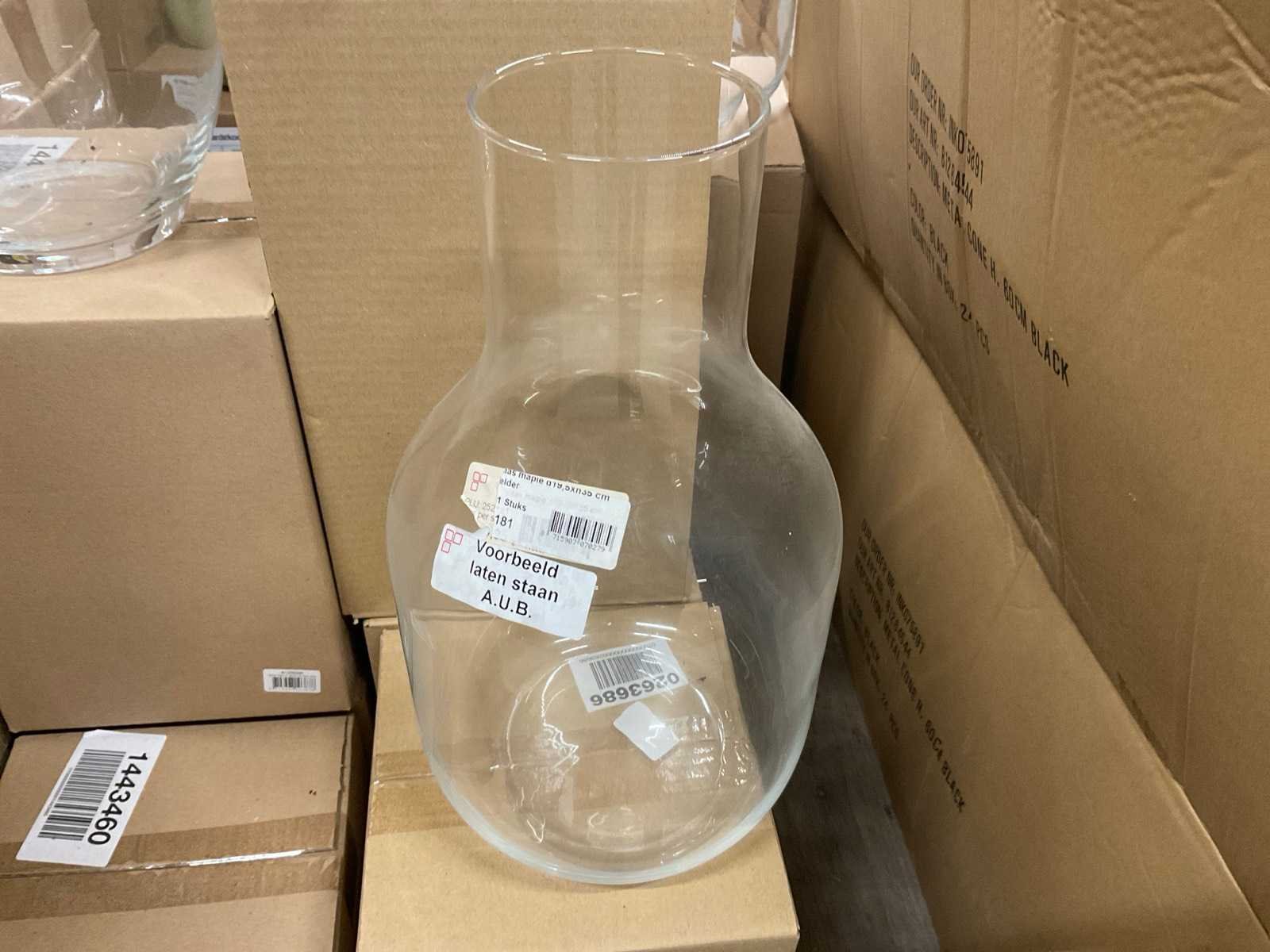 Glazen vazen en taartplateau’s op 3 pallets, in diverse vormen en formaten, inclusief pallets. Merk: Glazen