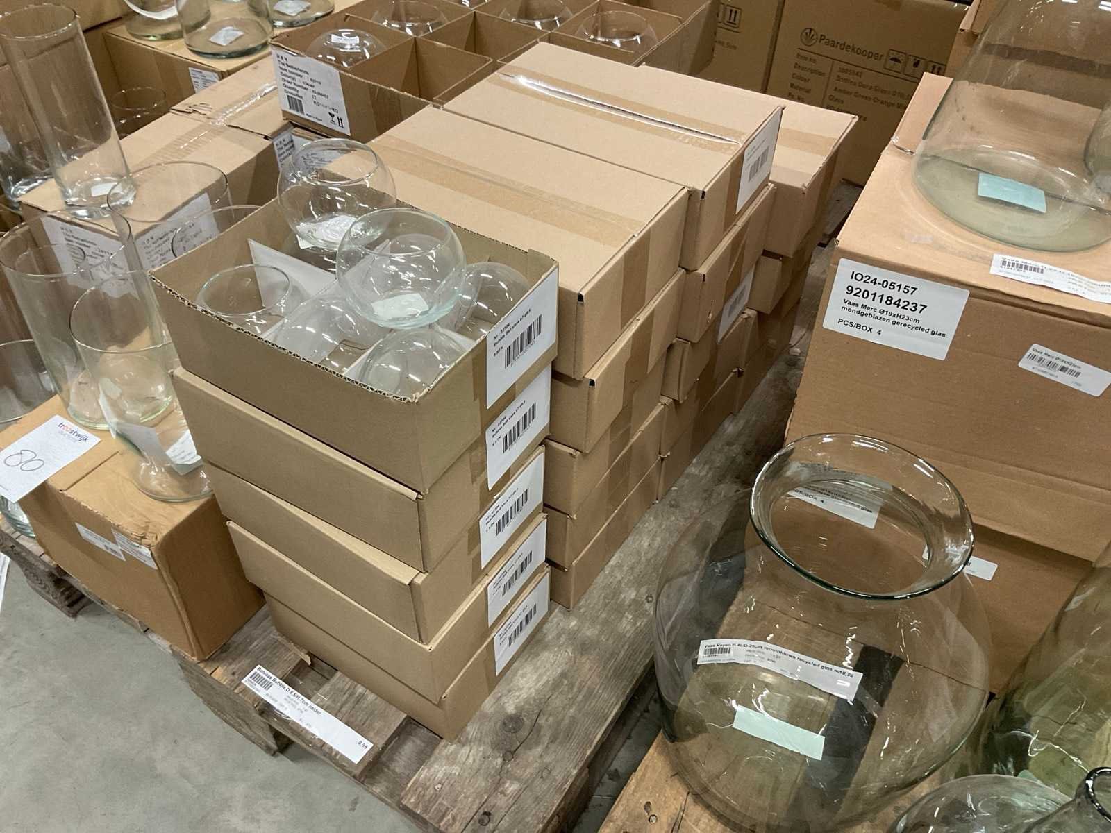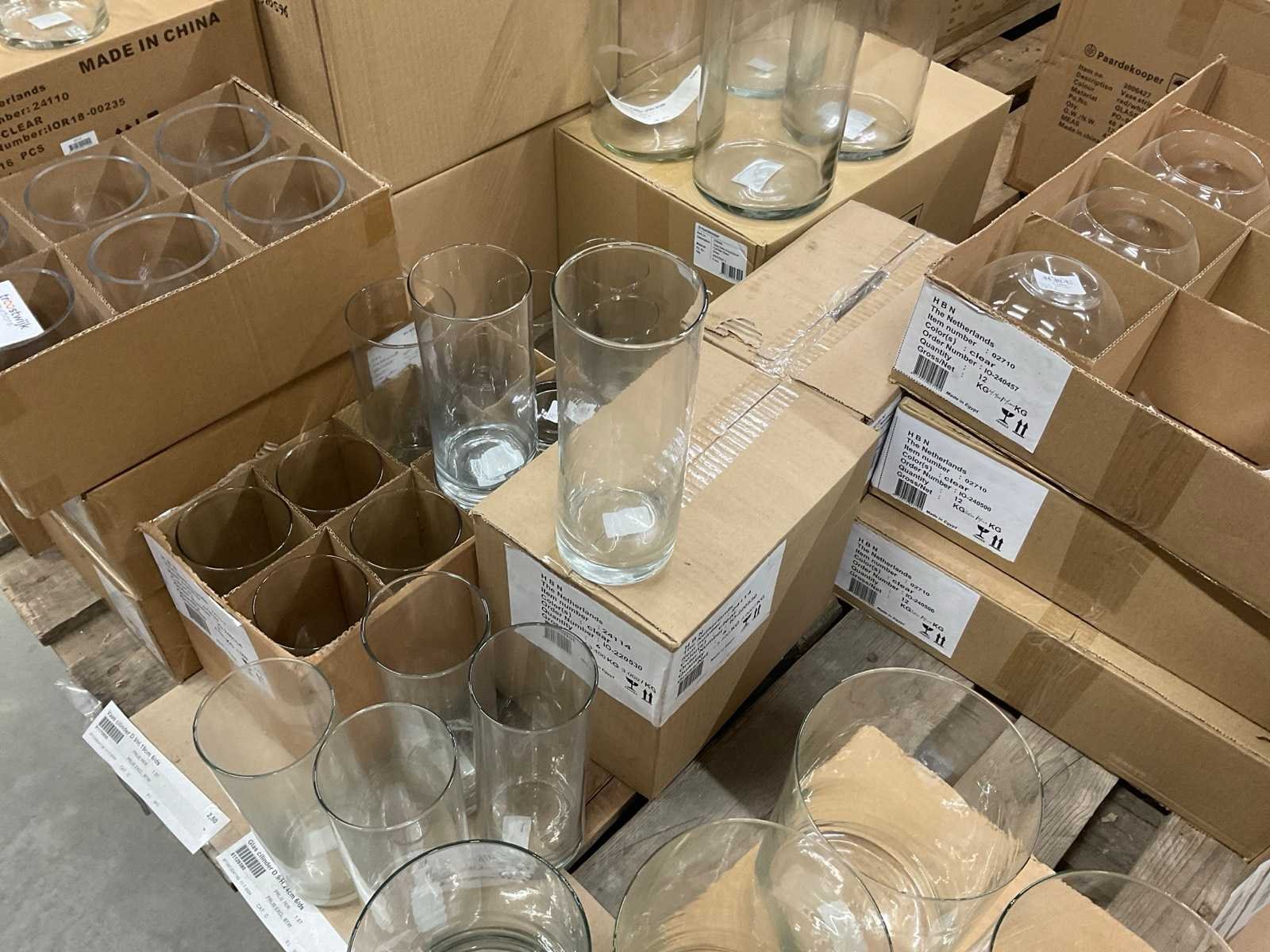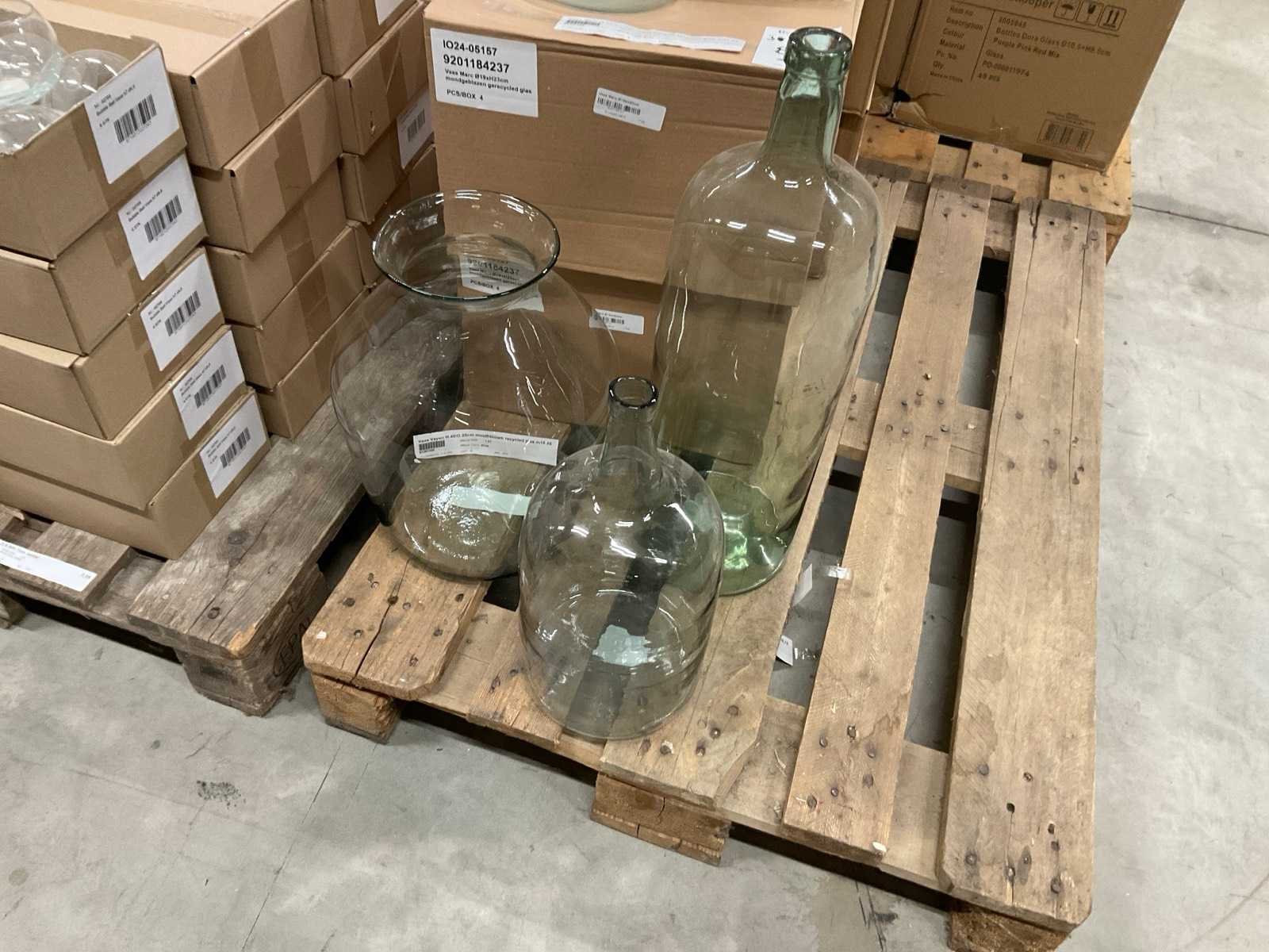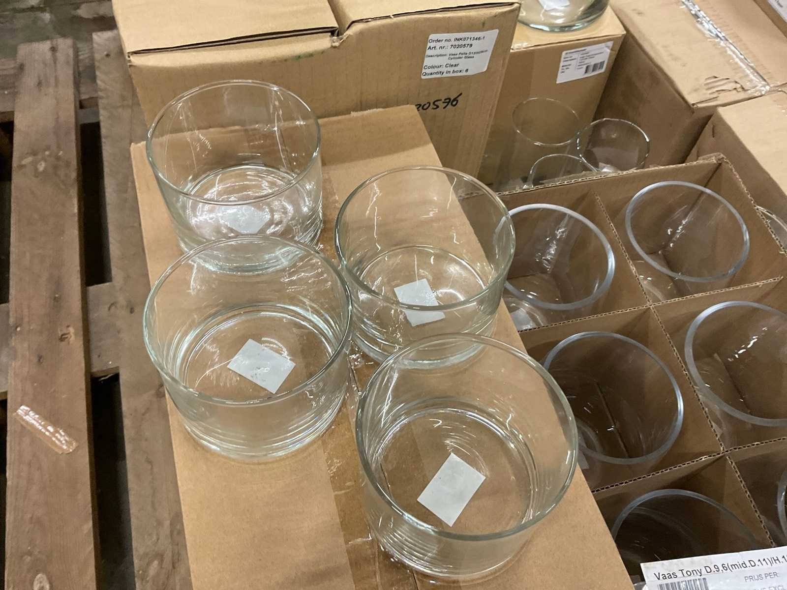 Glazen vazen en schalen op 5 pallets, in diverse vormen en formaten, inclusief pallets. Merk: Glazen