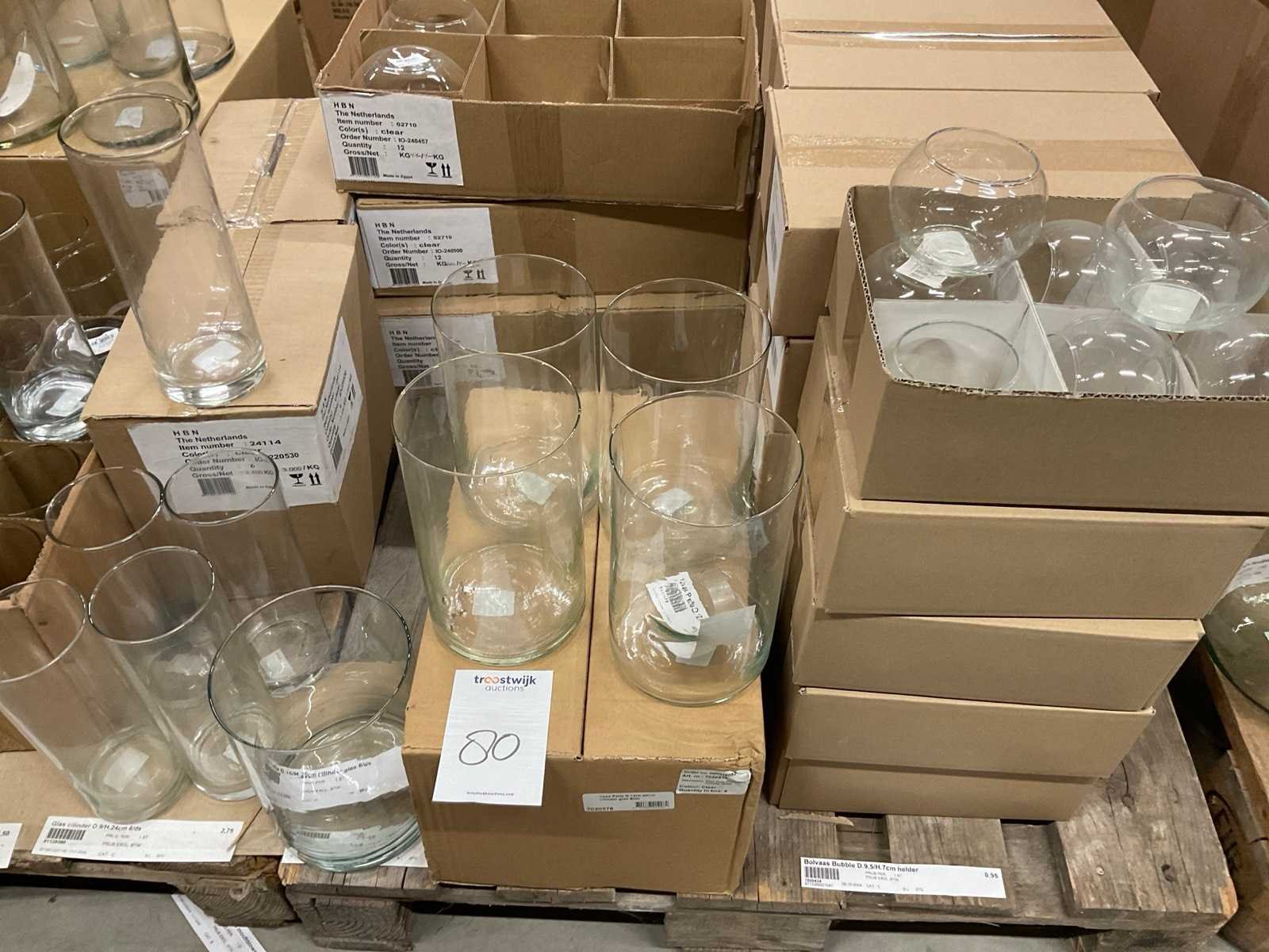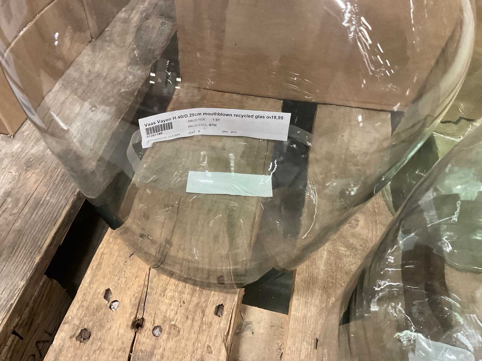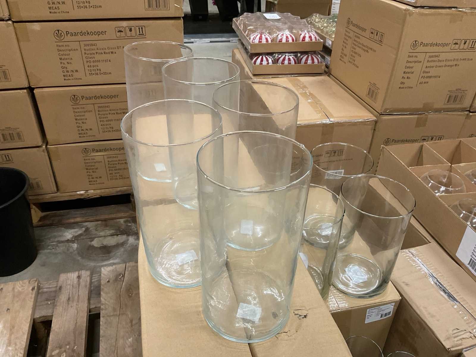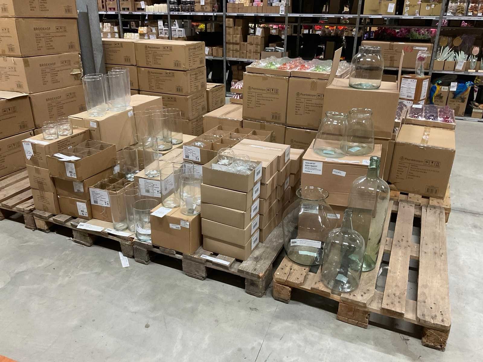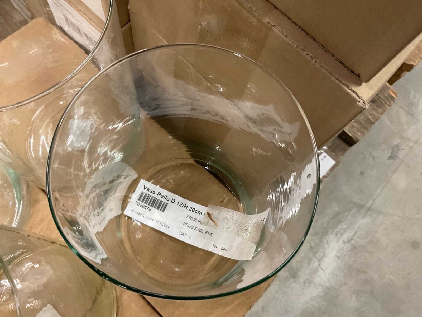 Glazen vazen en schalen op 5 pallets, in diverse vormen en formaten, inclusief pallets. Merk: Glazen