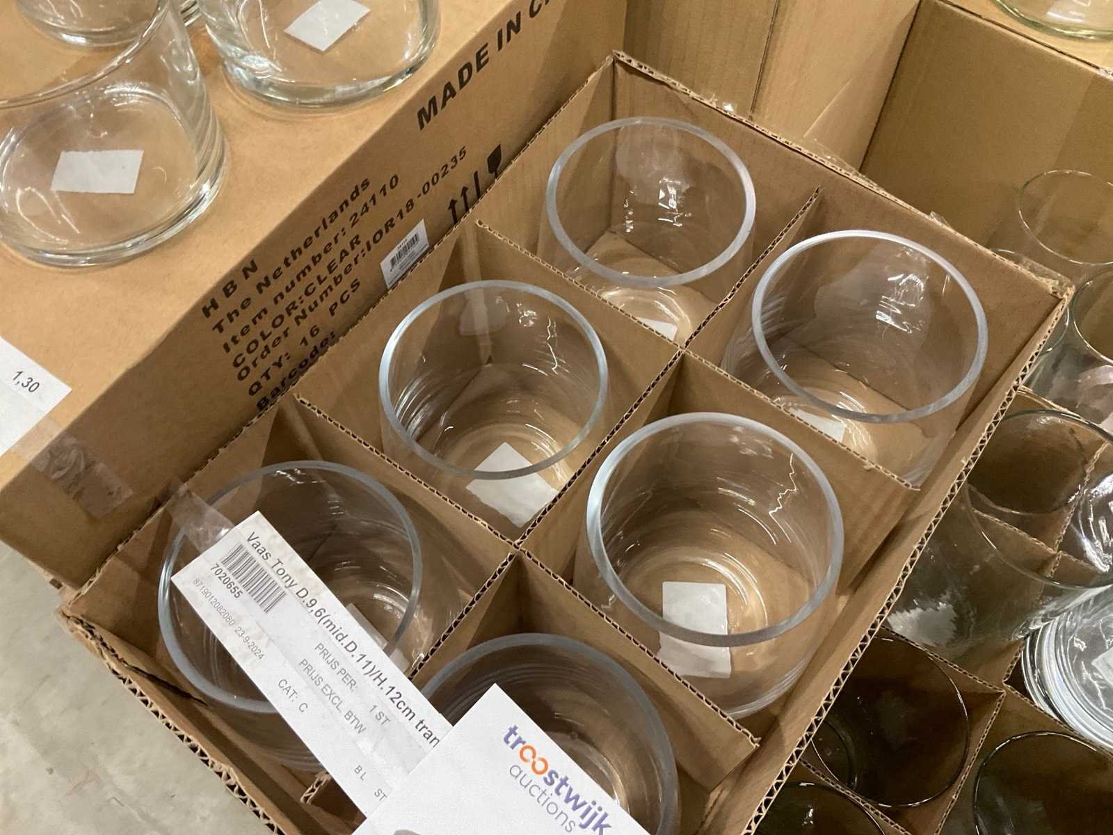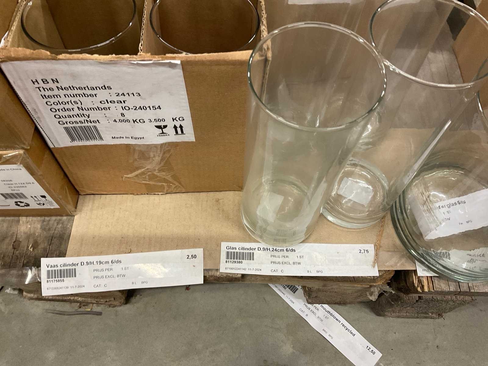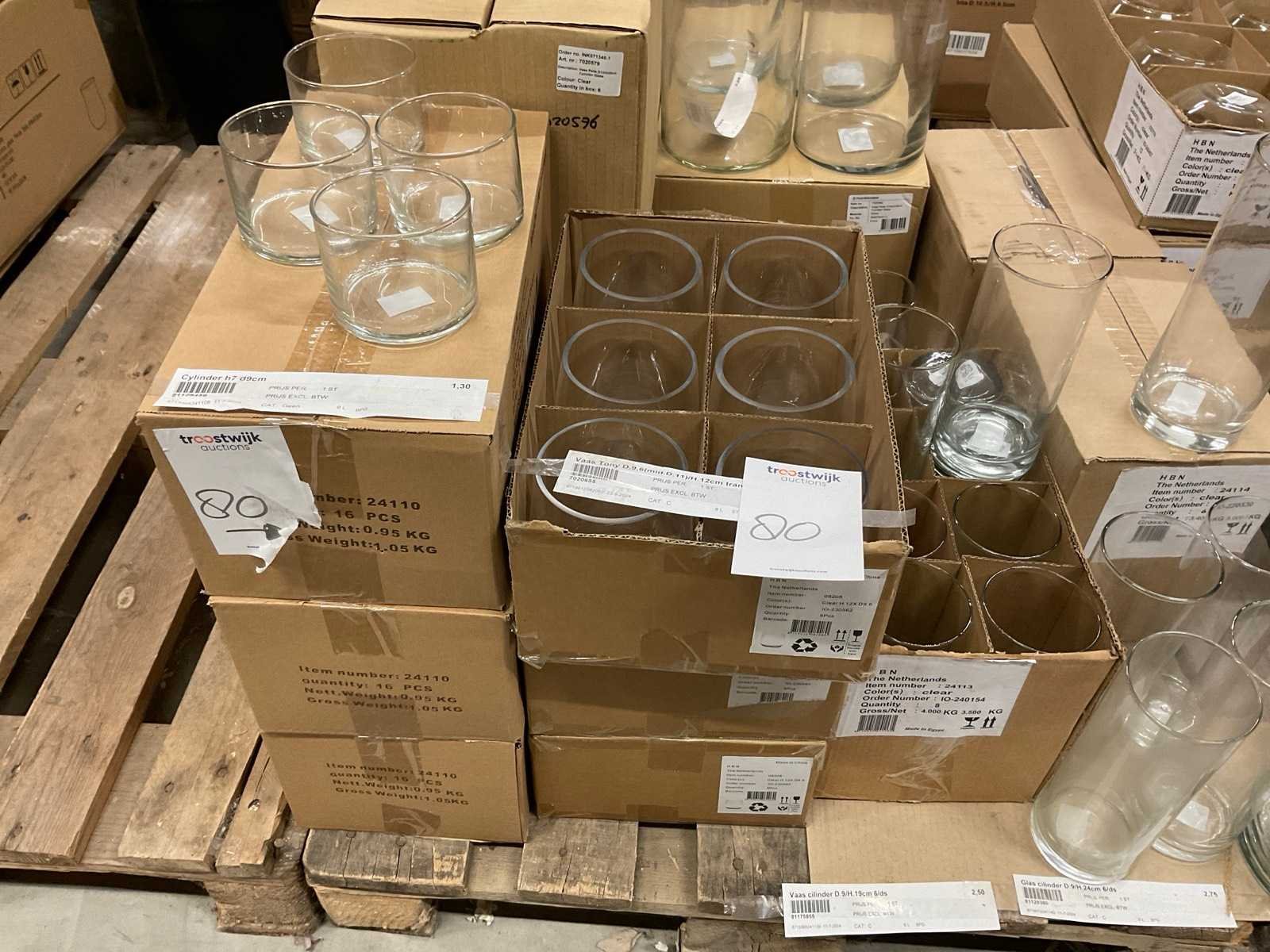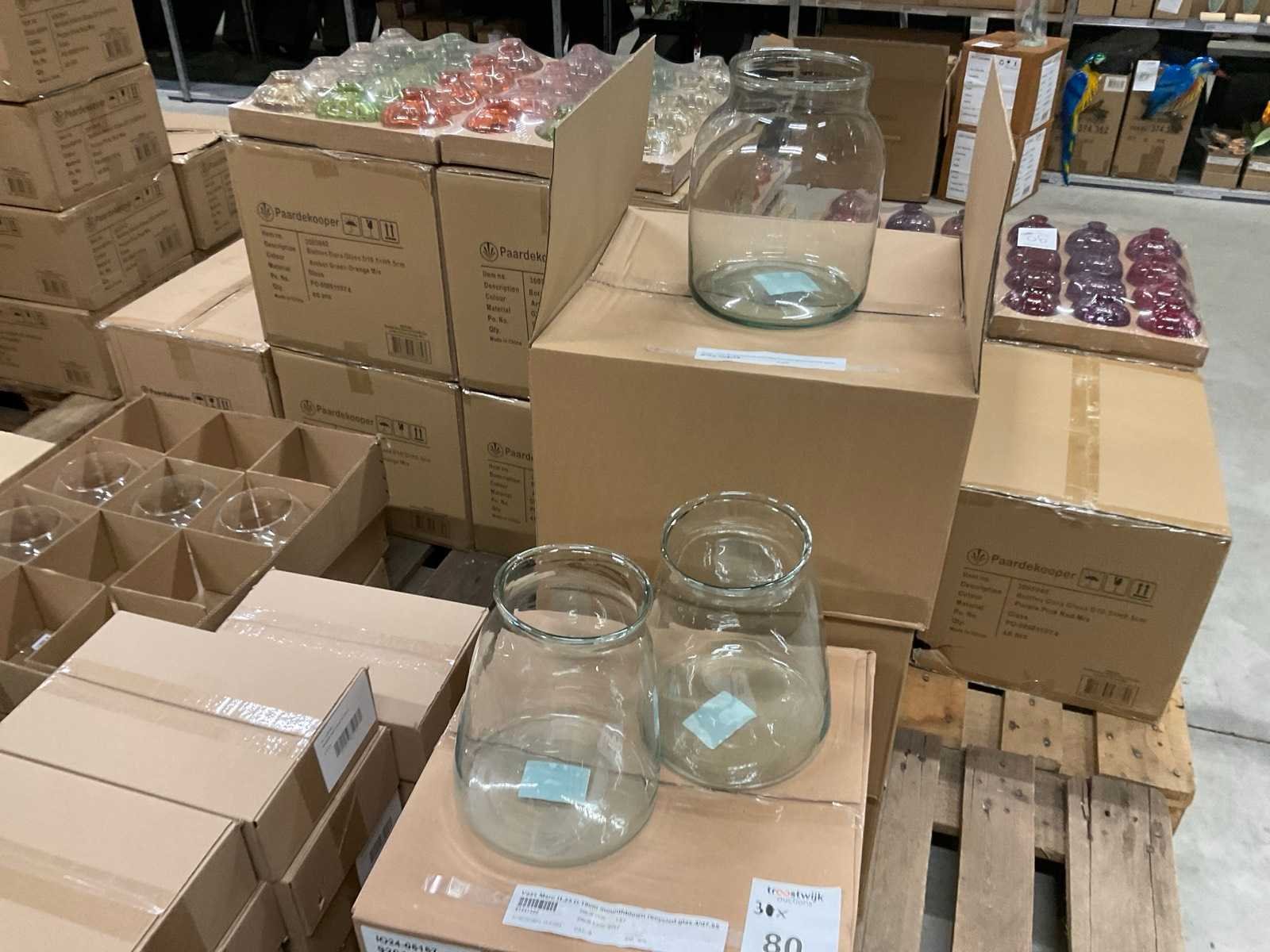 Glazen vazen en schalen op 5 pallets, in diverse vormen en formaten, inclusief pallets. Merk: Glazen