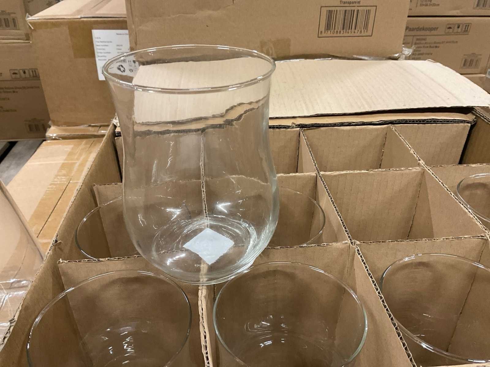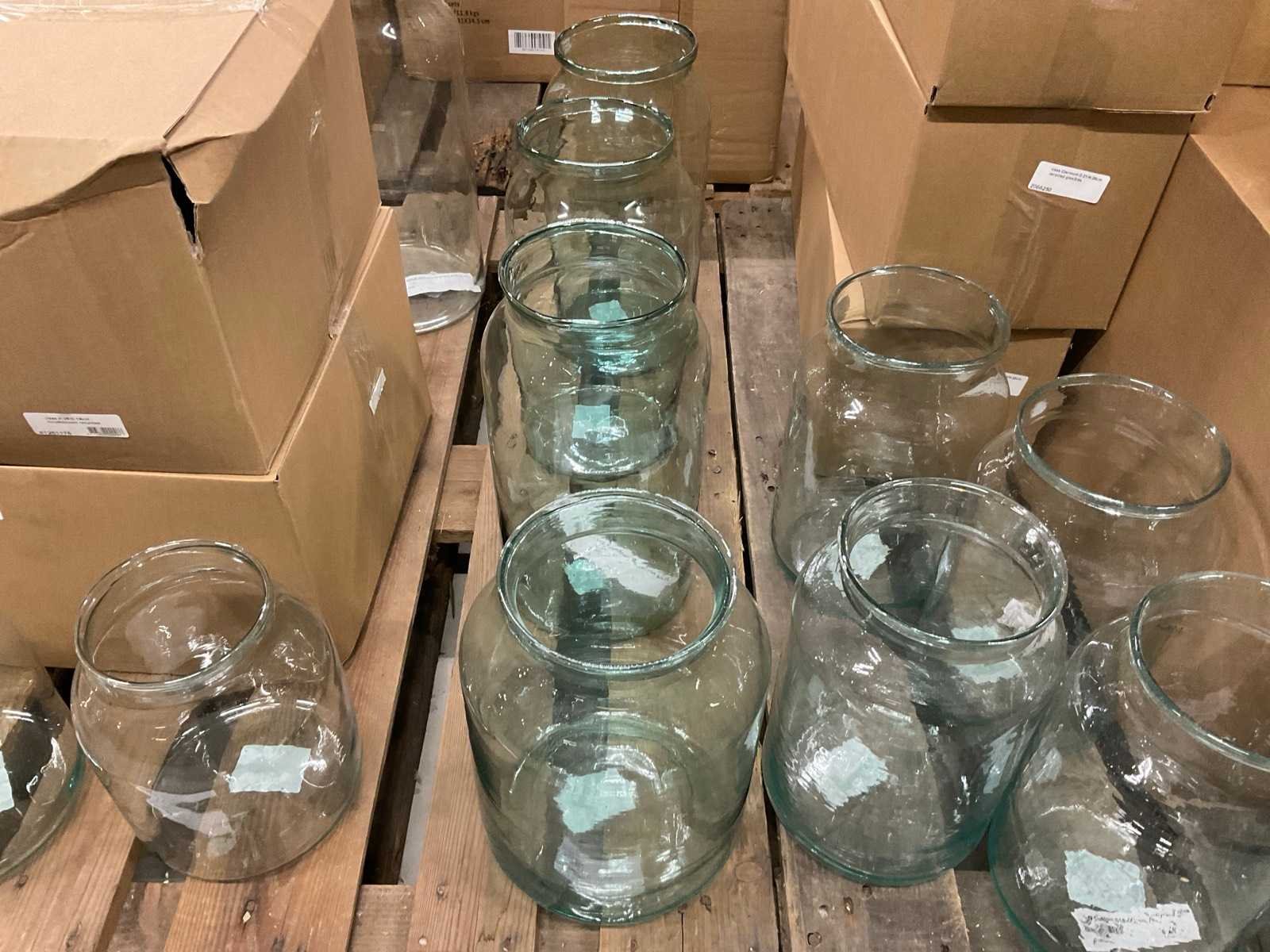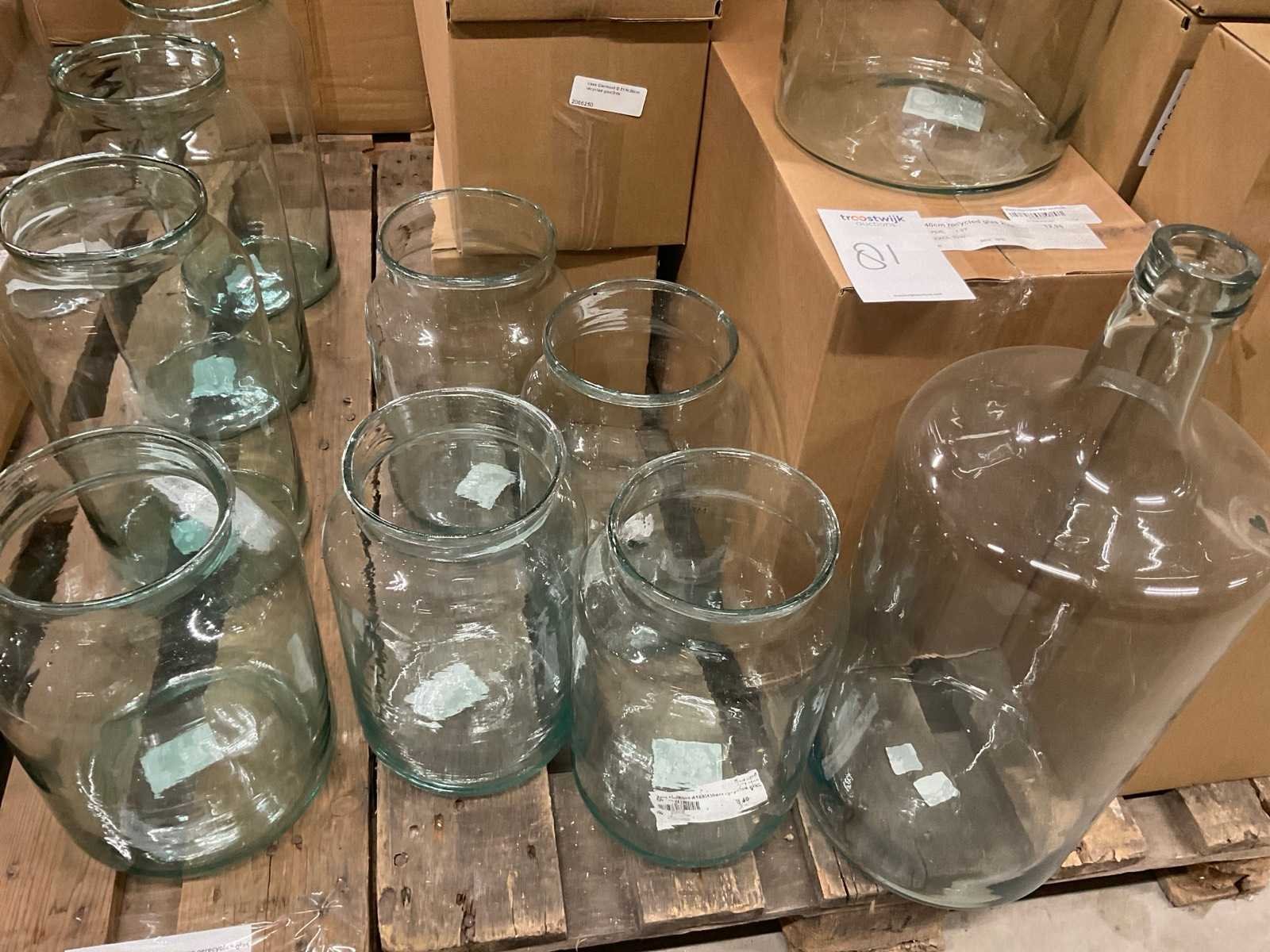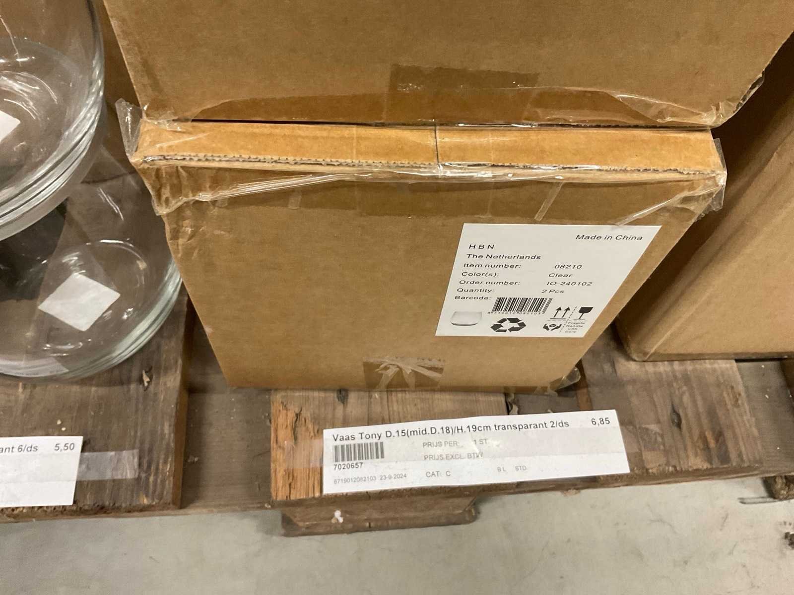 Glazen vazen en windlichten op 4 pallets, in diverse vormen en formaten, inclusief pallets. Merk: Glazen