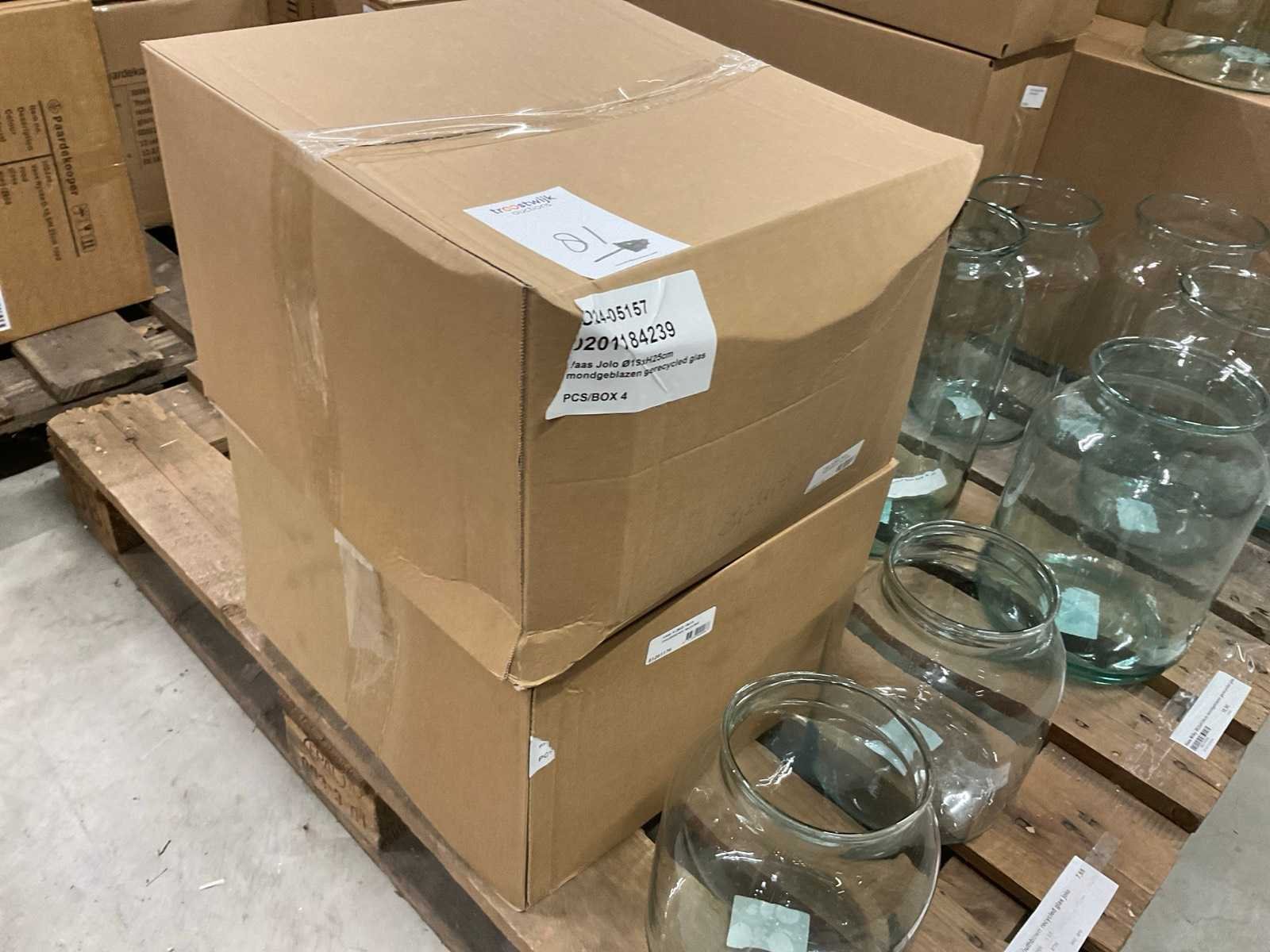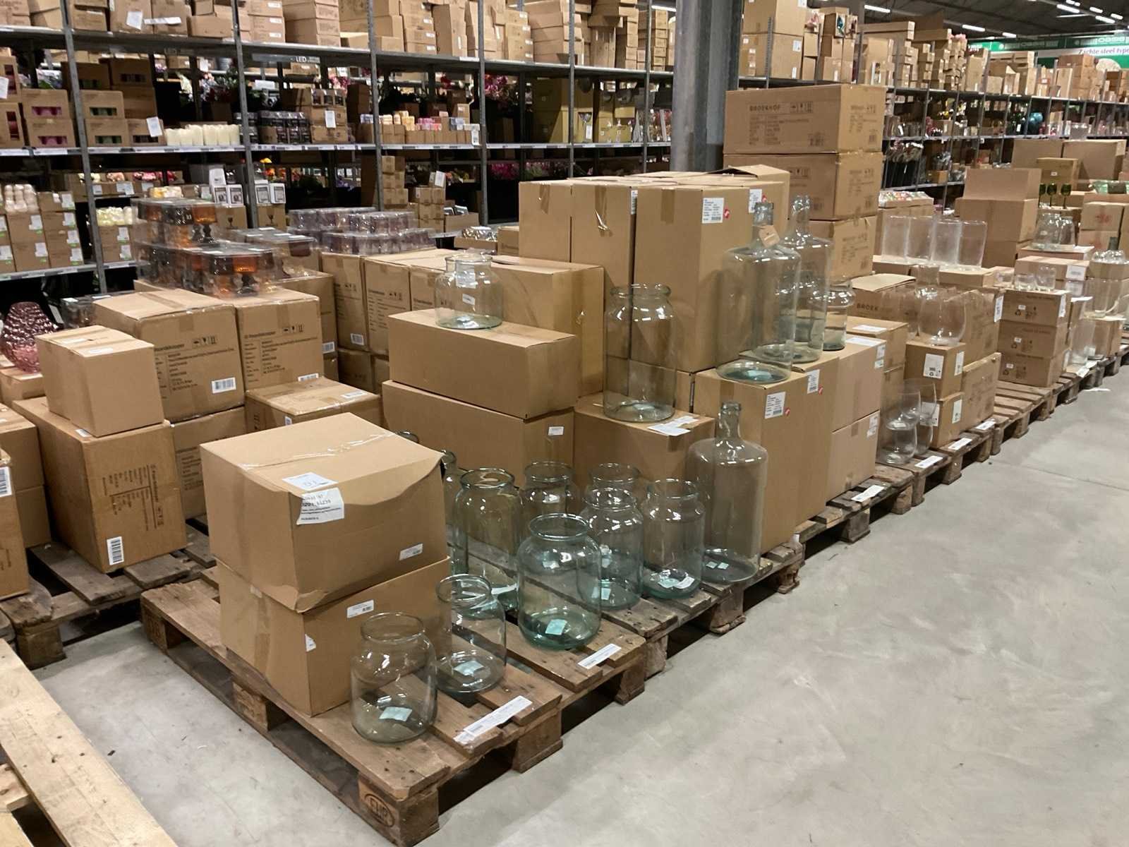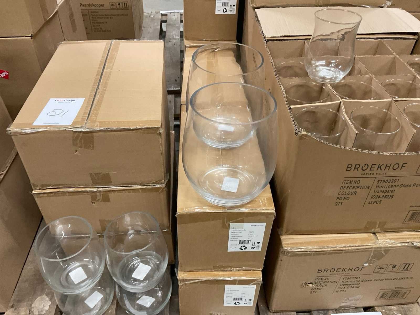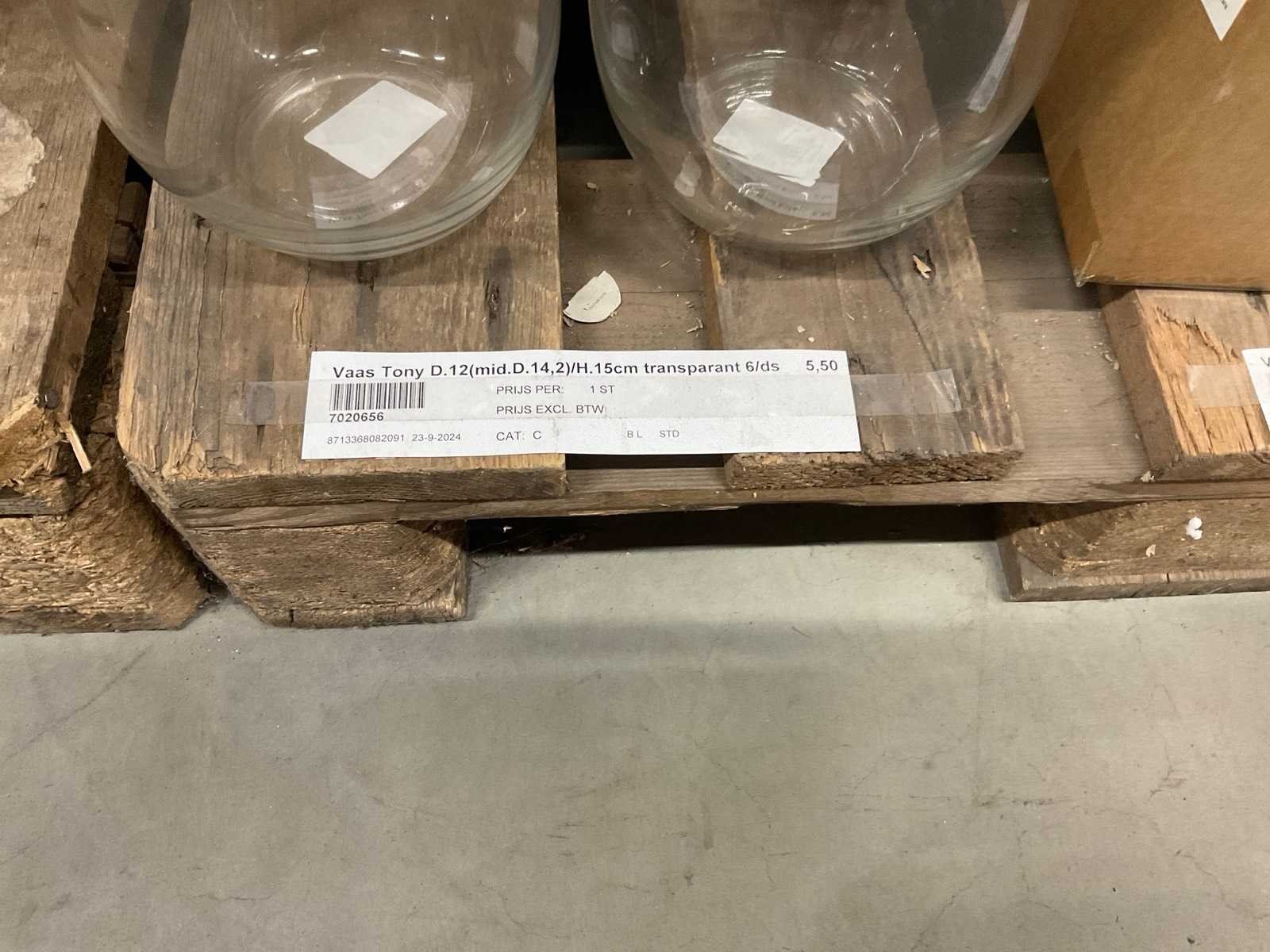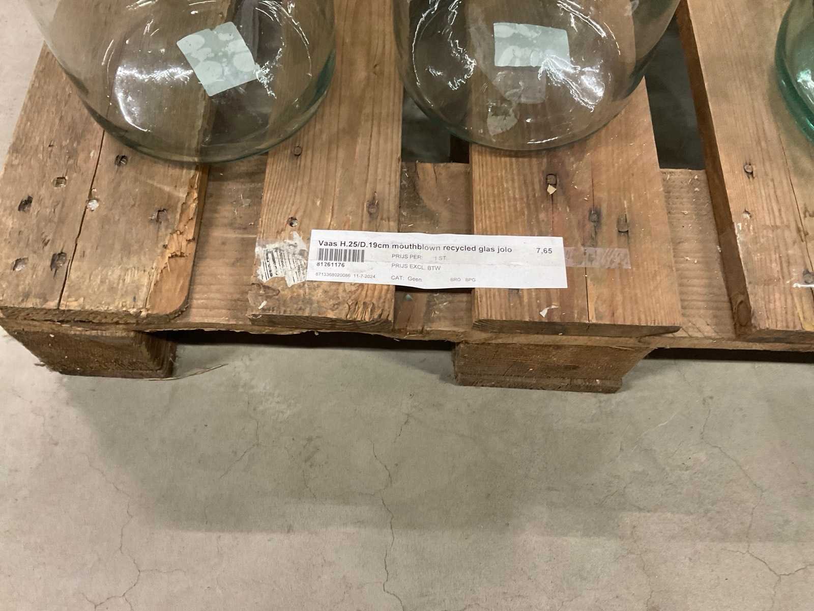 Glazen vazen en windlichten op 4 pallets, in diverse vormen en formaten, inclusief pallets. Merk: Glazen