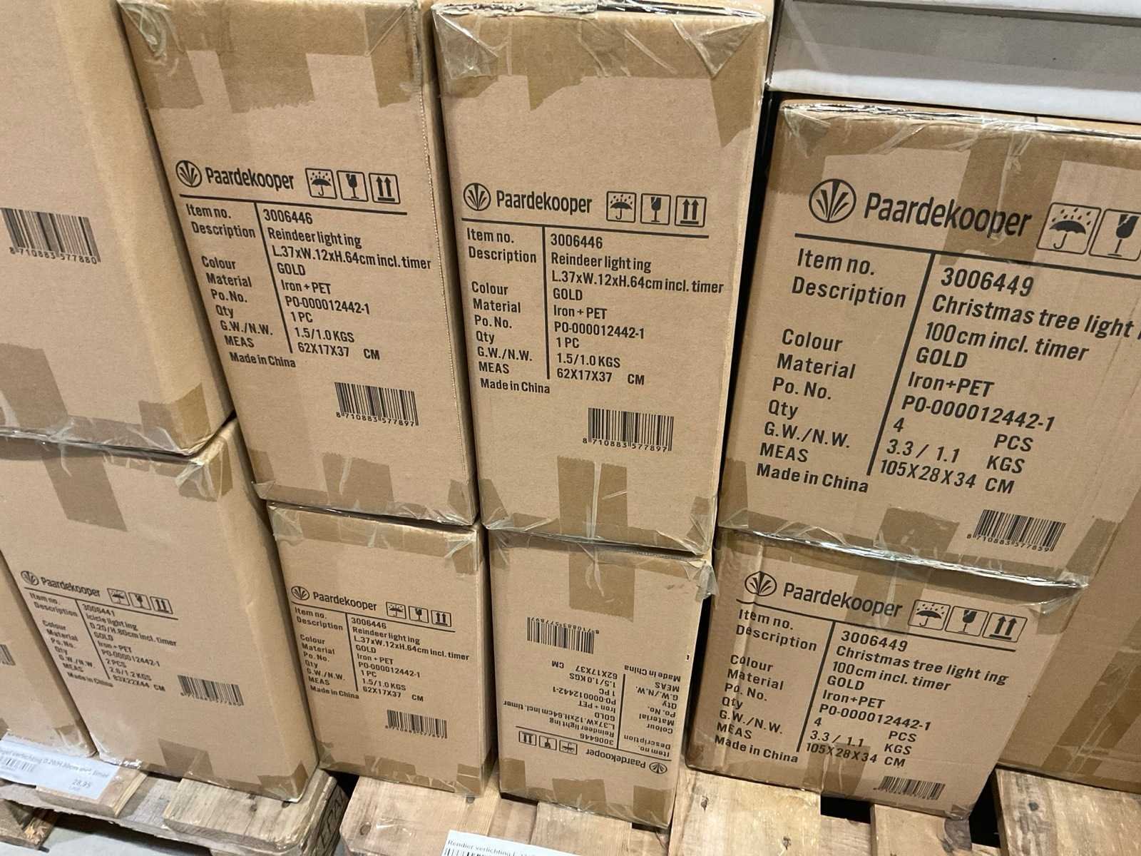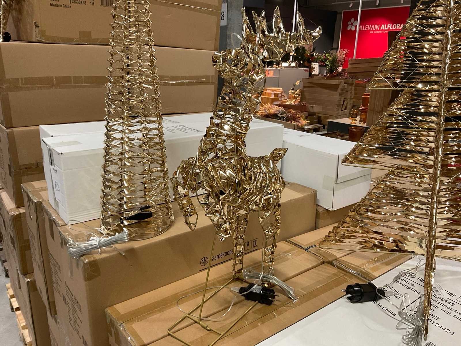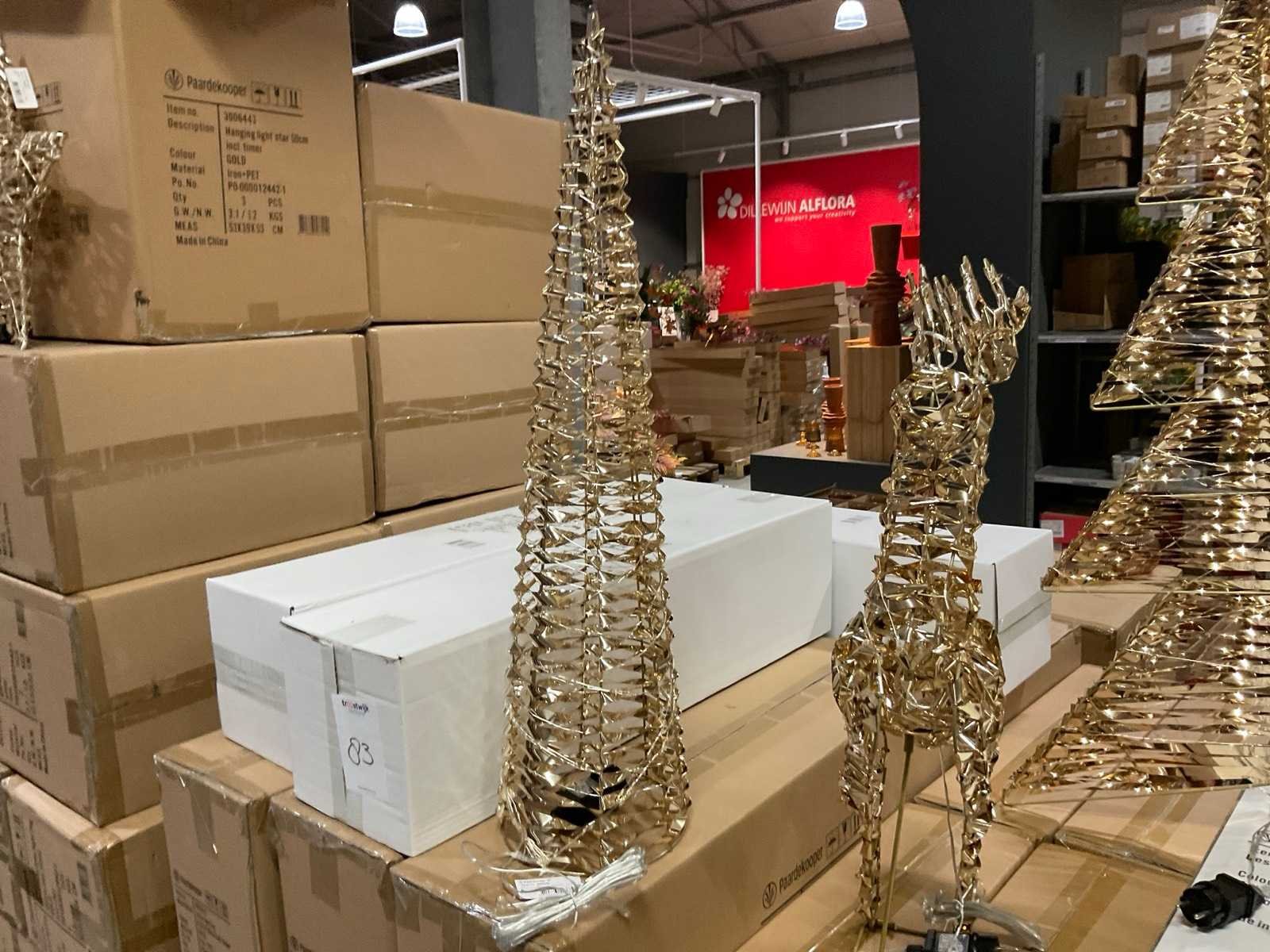 Kerstdecoratie verlicht, rendieren, cones en sterren in verschillen formaten op 3 pallets, inclusief pallets. Merk: Paardekooper