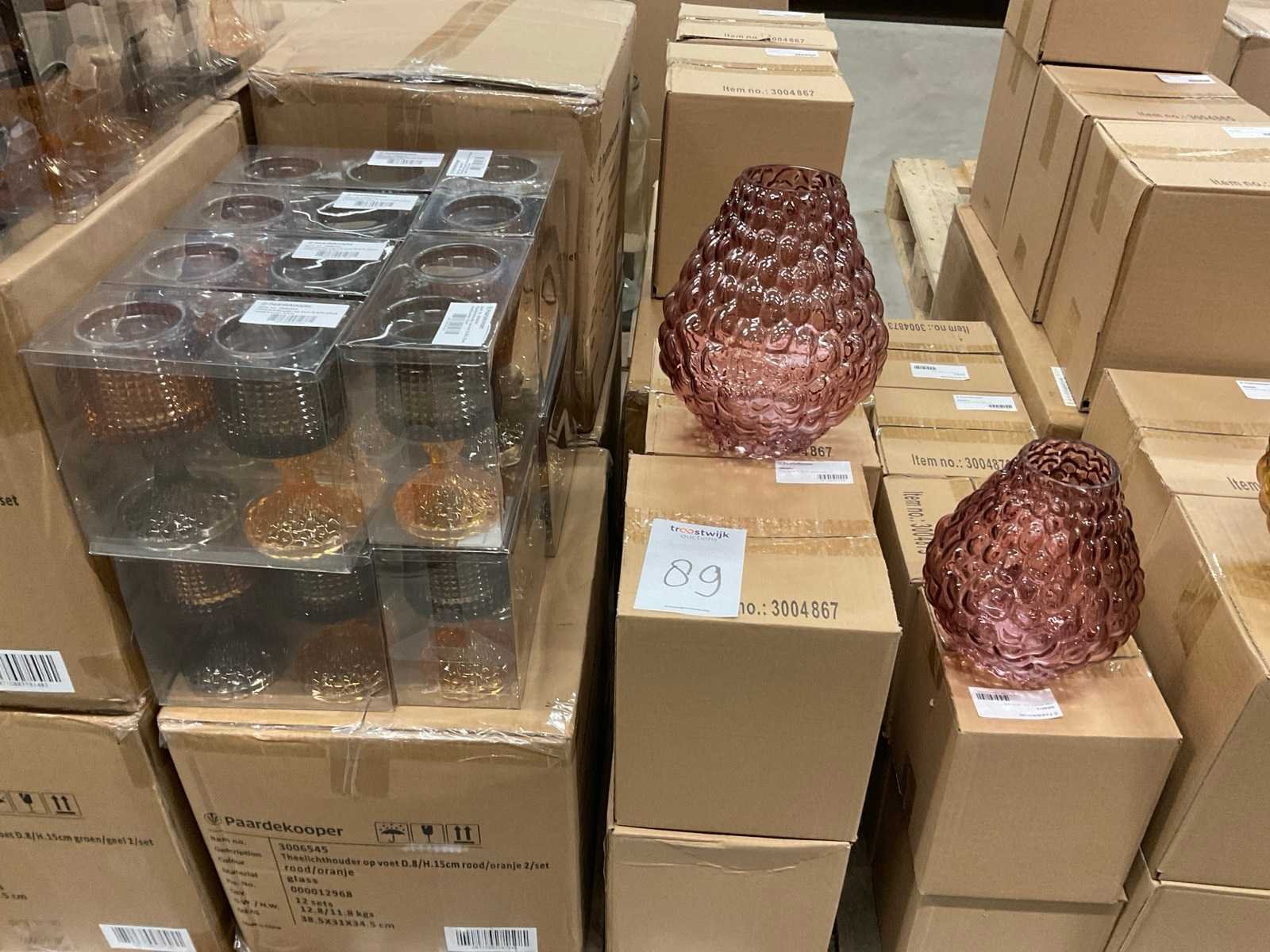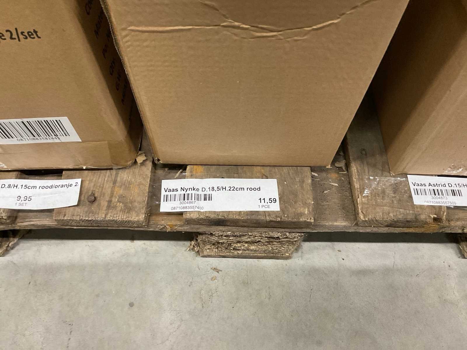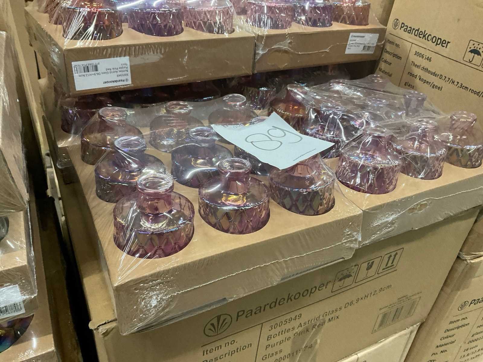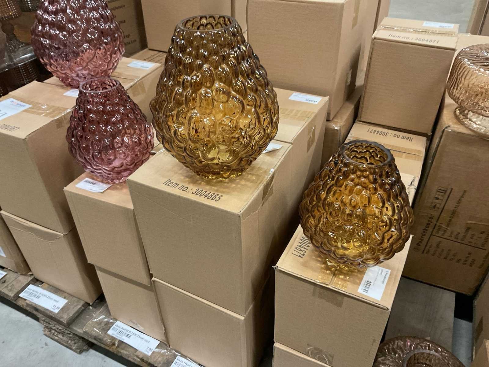 Vazen, theelichthouders en flesjes in diverse kleuren en formaten, modellen o.a. Jantien, Astrid, Nynke, , op 4 pallets, inclusief pallets.