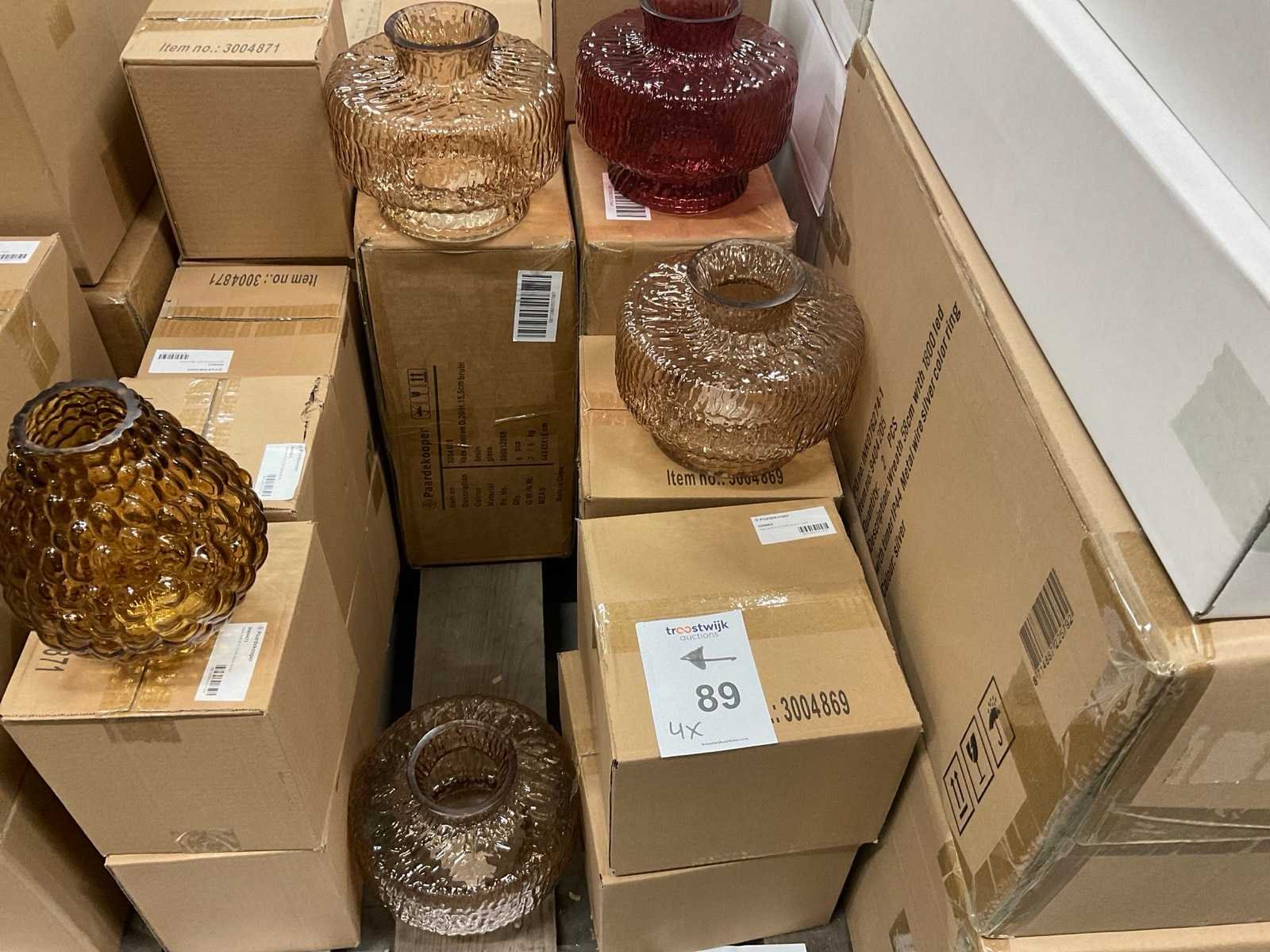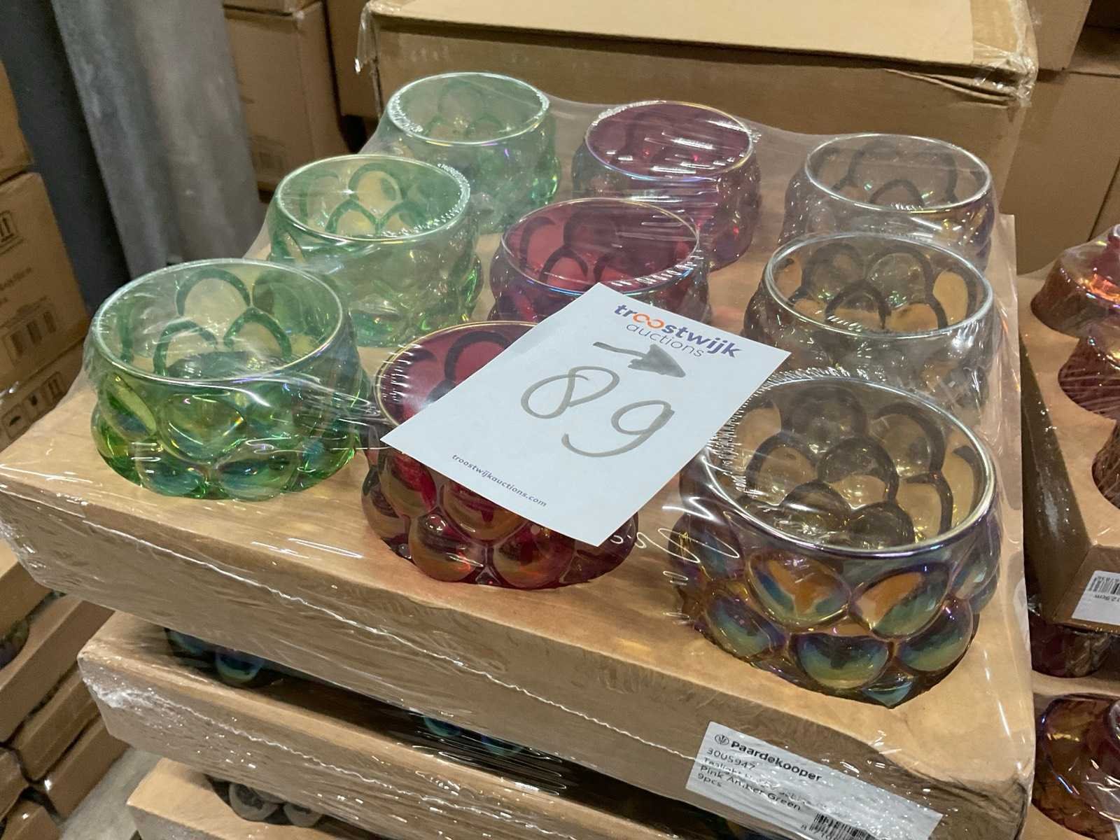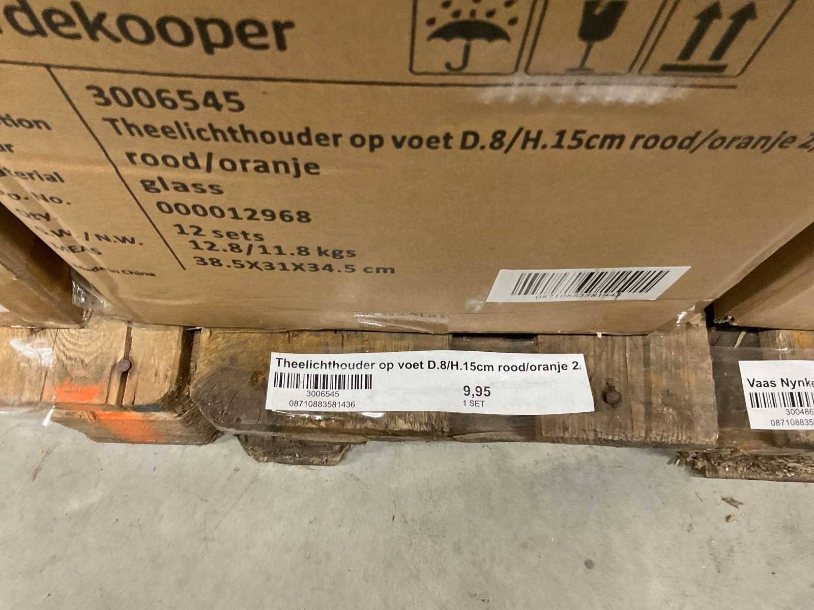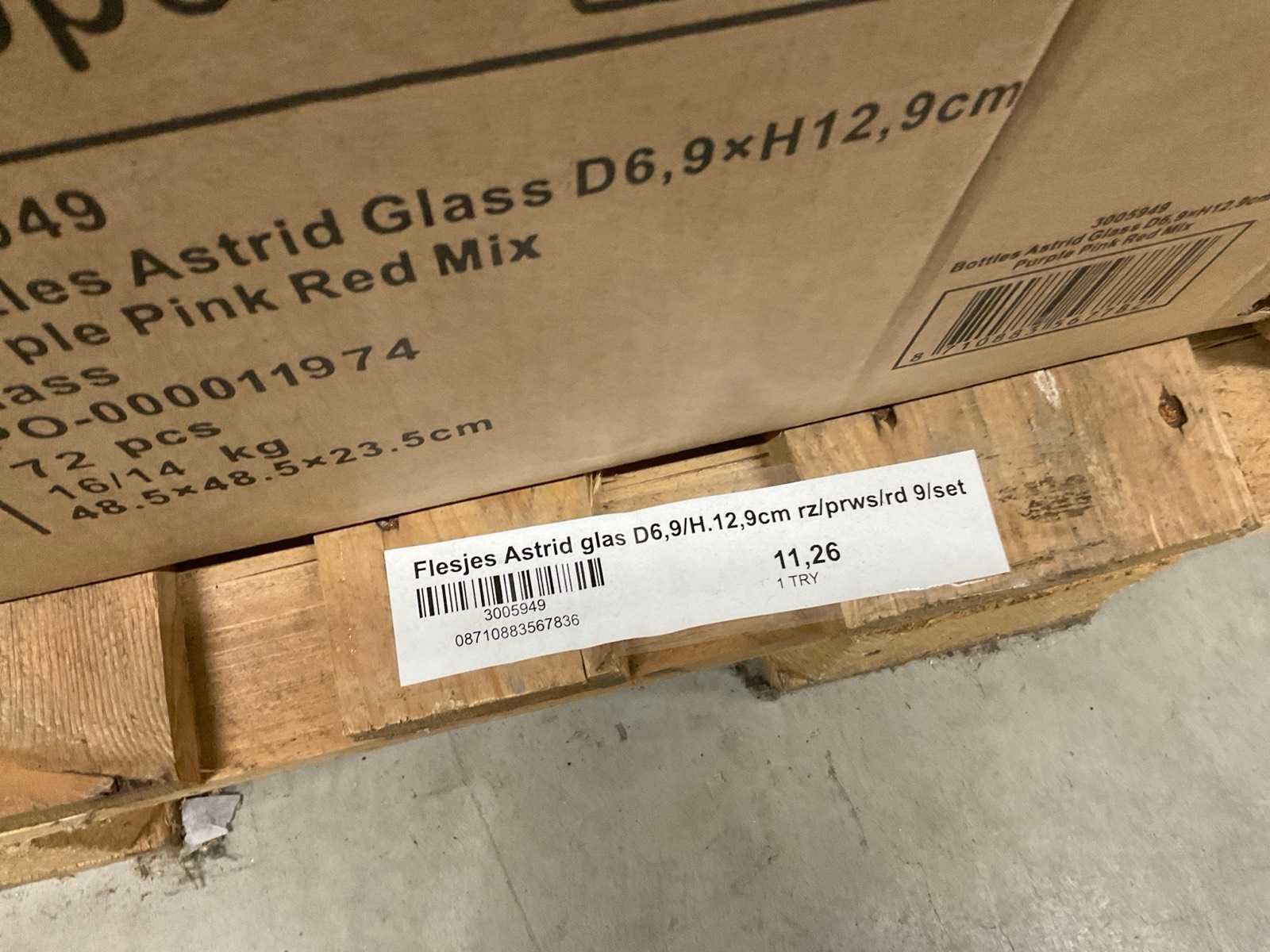 Vazen, theelichthouders en flesjes in diverse kleuren en formaten, modellen o.a. Jantien, Astrid, Nynke, , op 4 pallets, inclusief pallets.