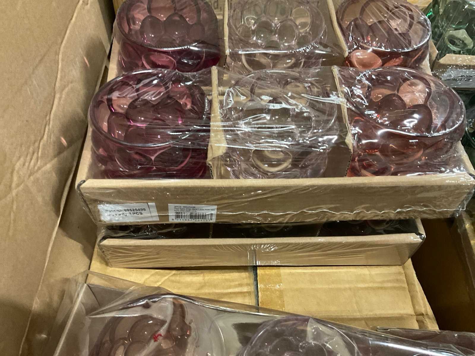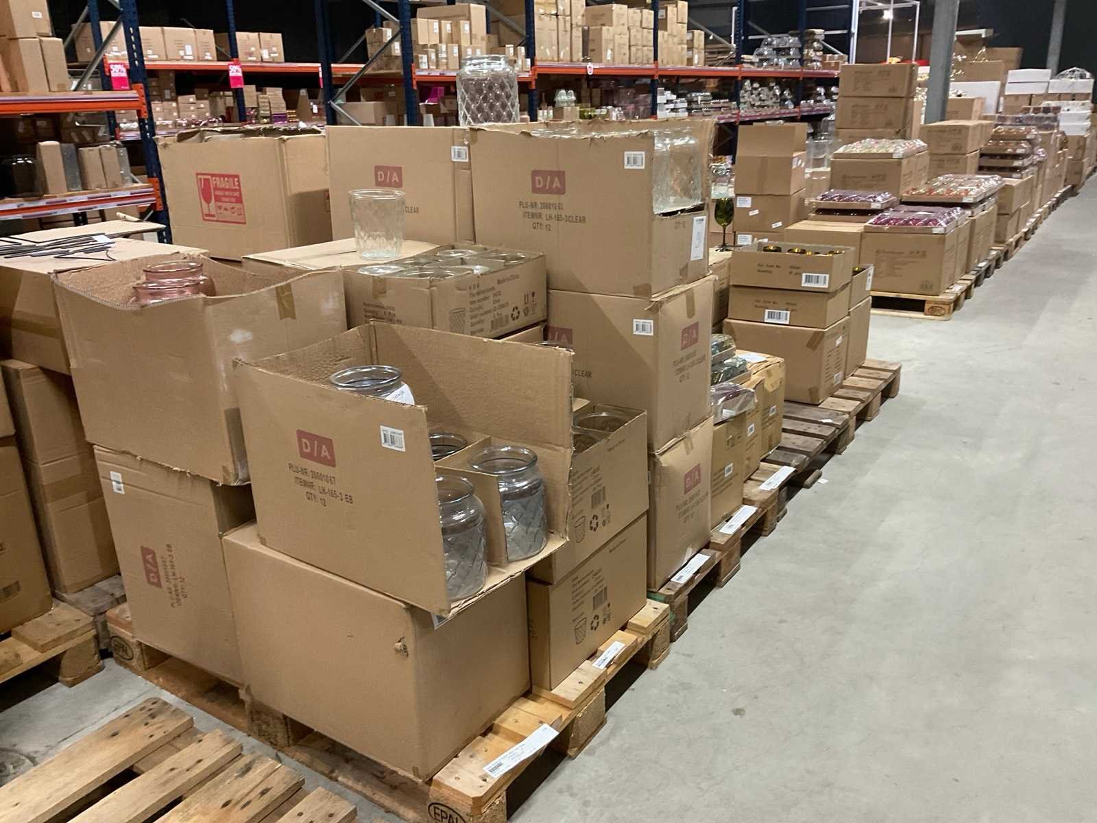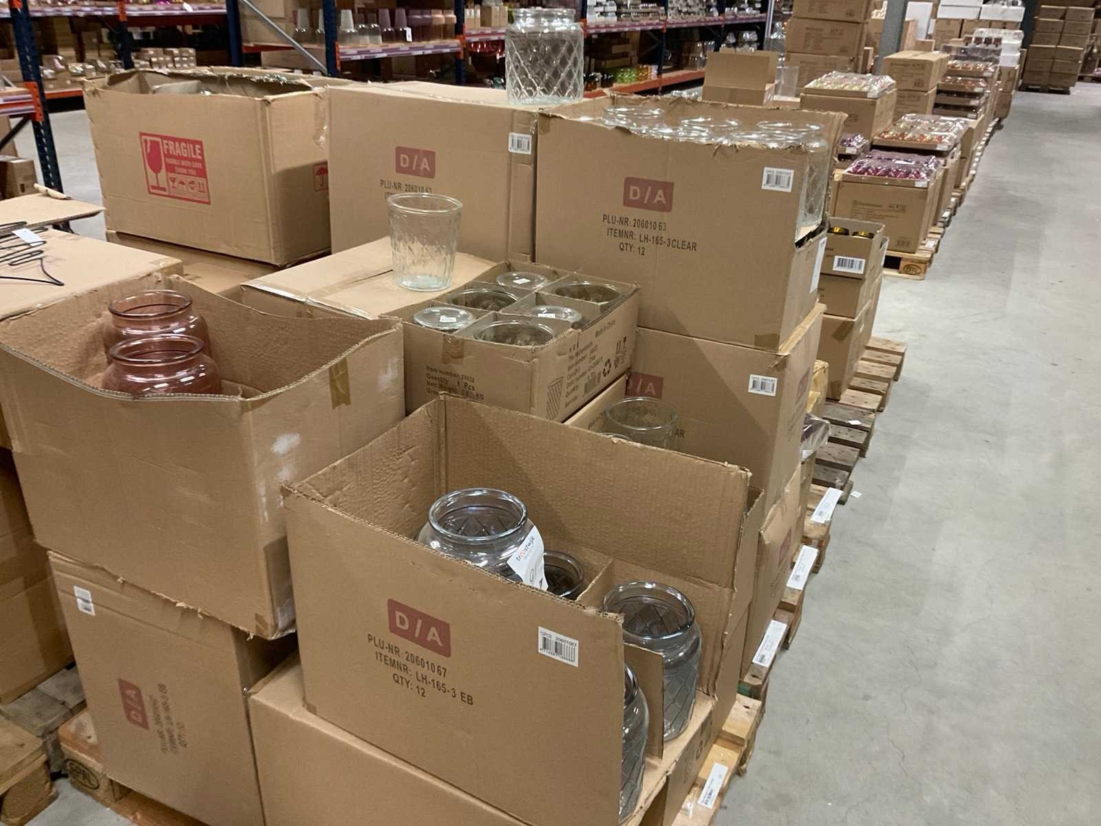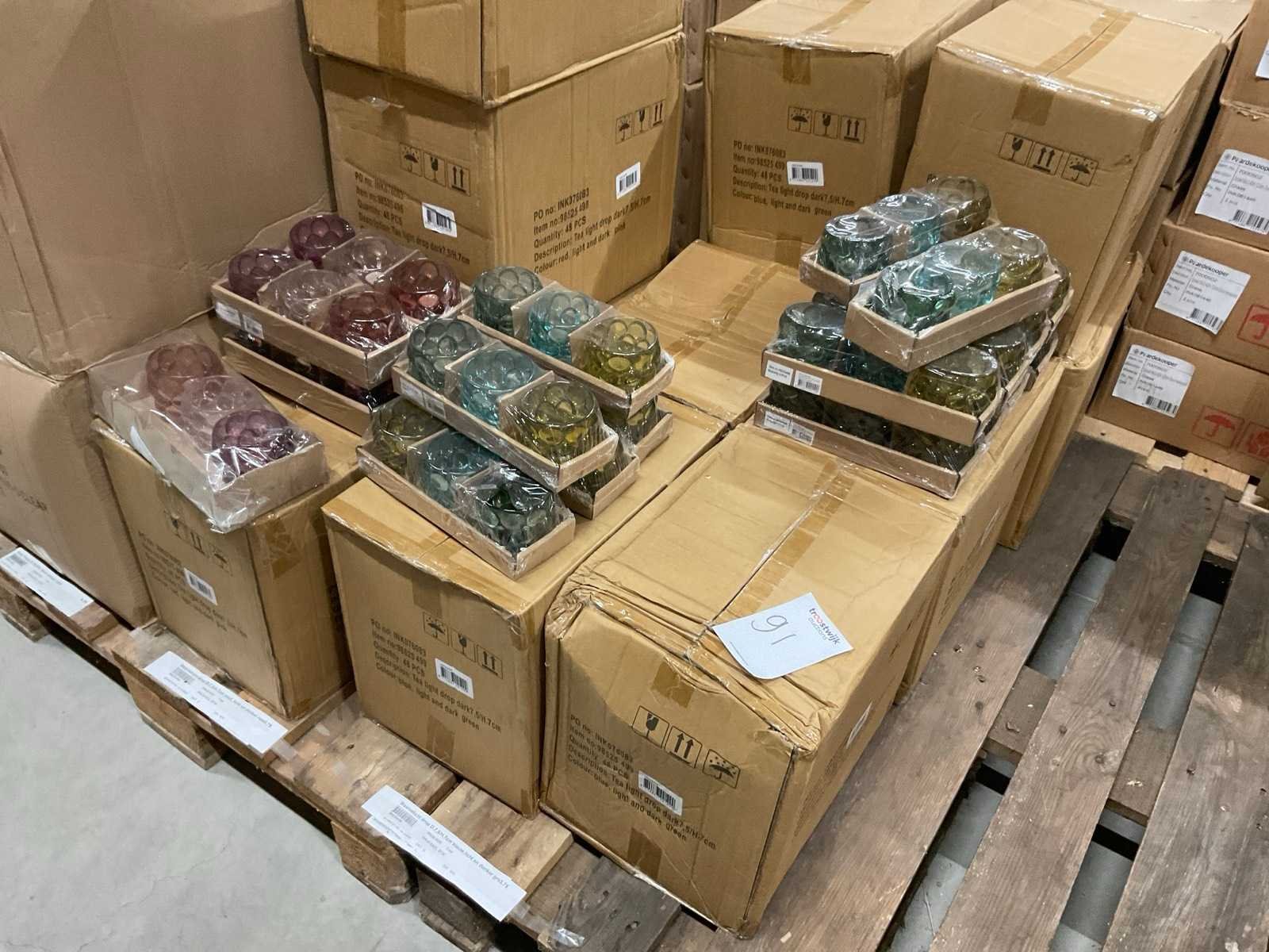 Vazen, waxinelichthouders en windlichten in diverse kleuren en formaten, modellen o.a. Martien, Drop, Paola en Morgan, op 4 pallets, inclusief pallets.