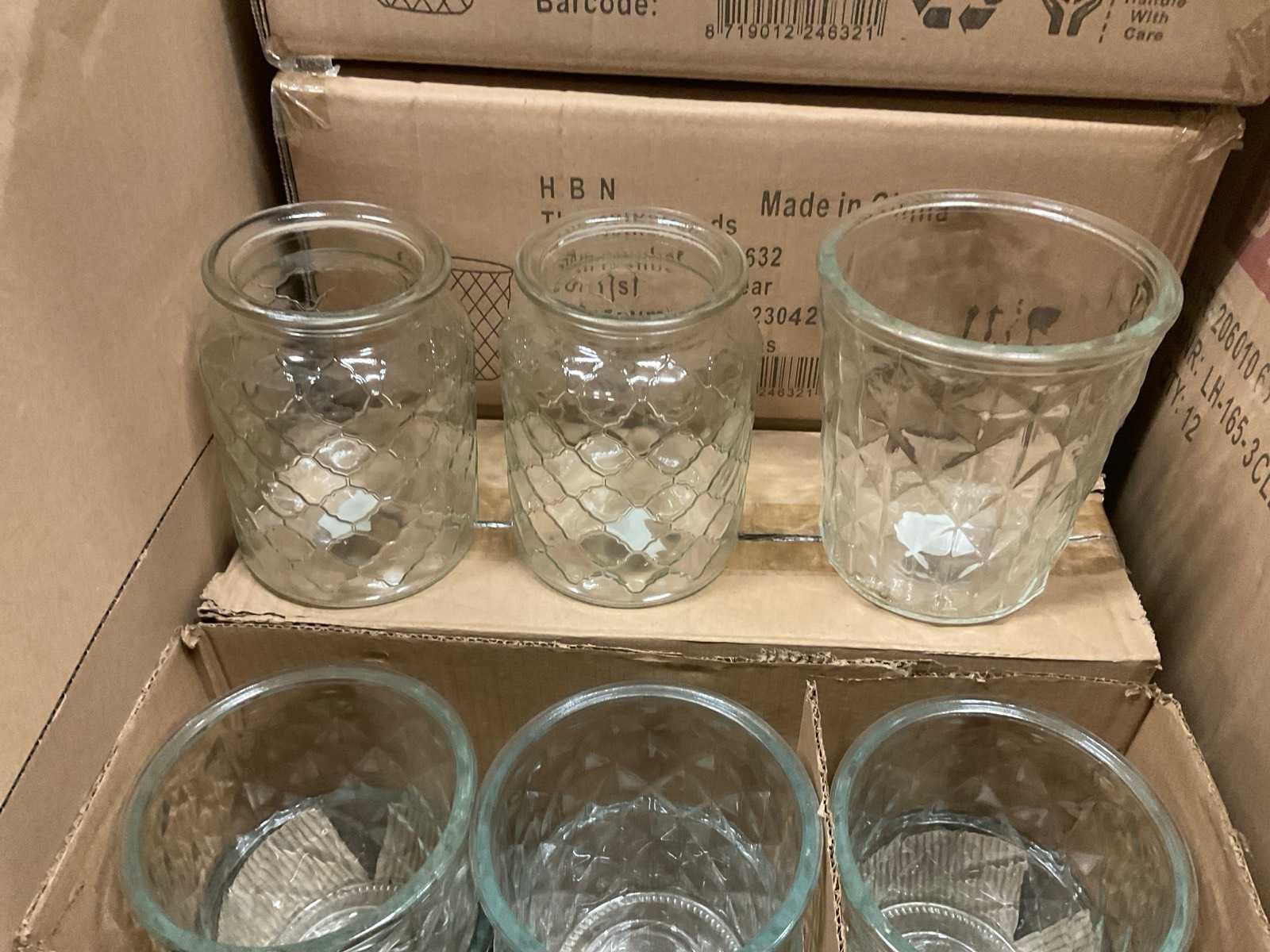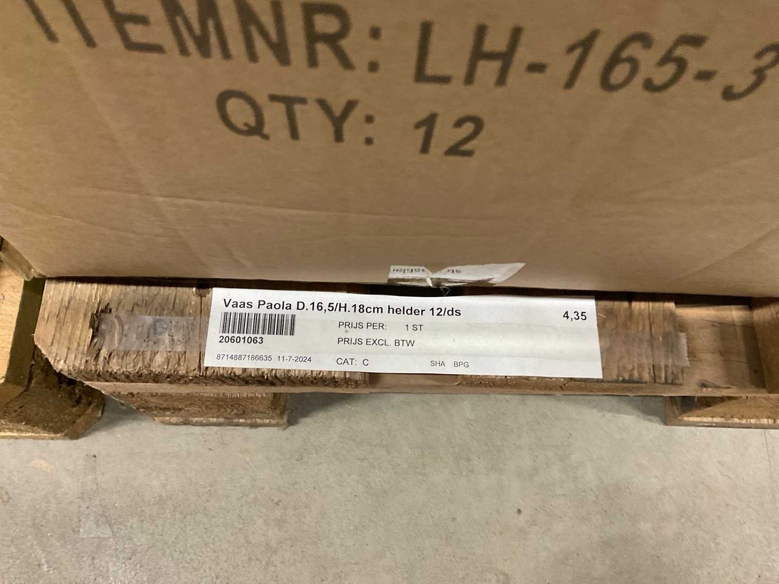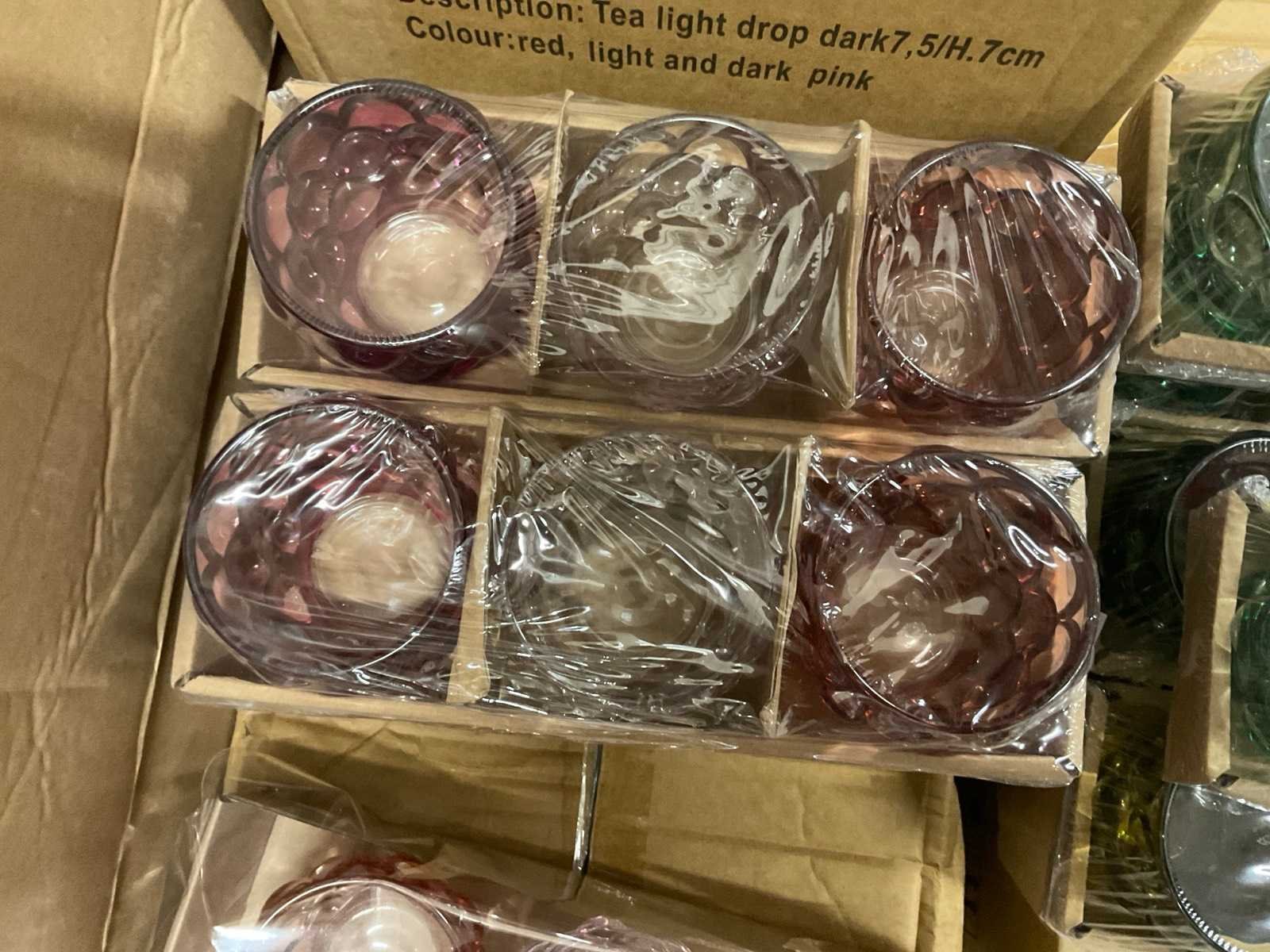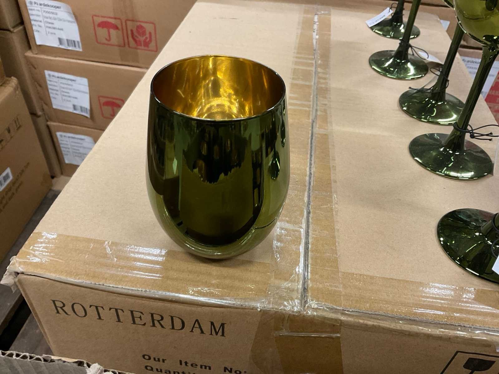 Vazen, waxinelichthouders en windlichten in diverse kleuren en formaten, modellen o.a. Martien, Drop, Paola en Morgan, op 4 pallets, inclusief pallets.