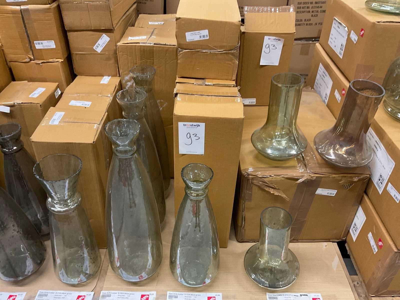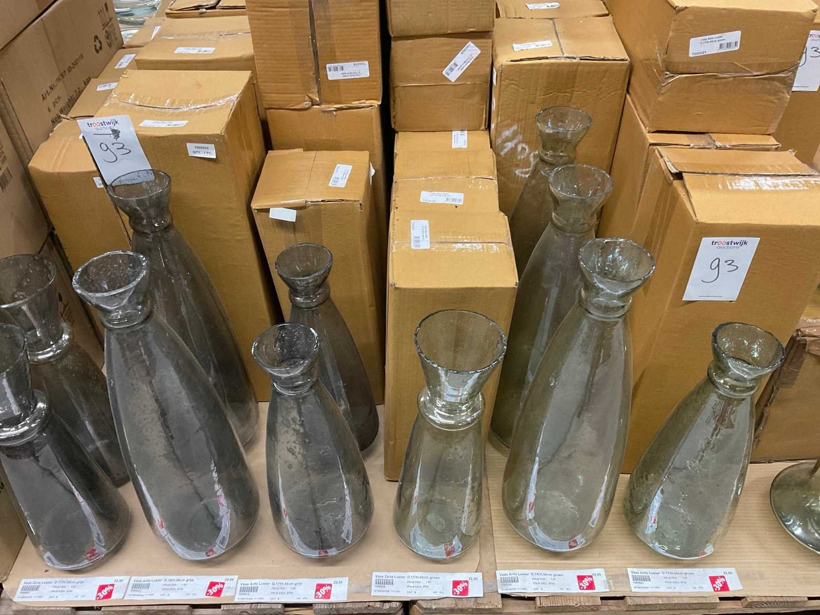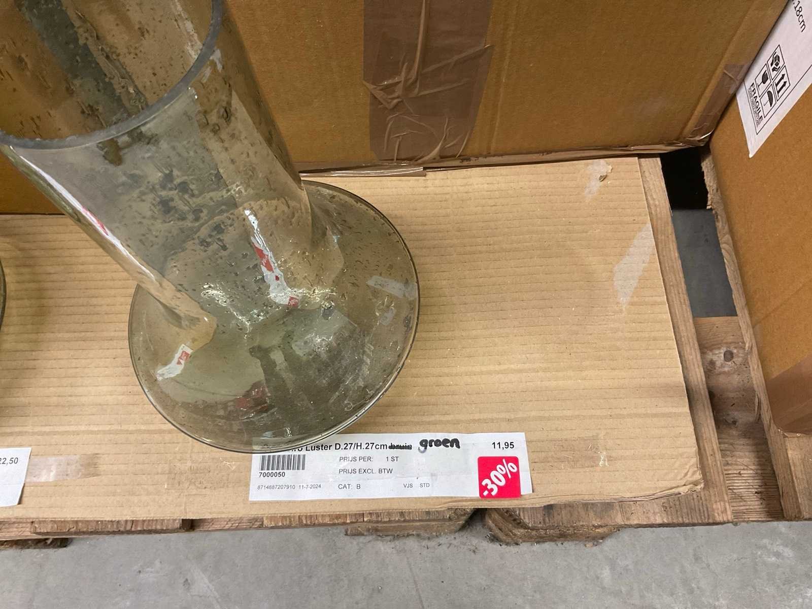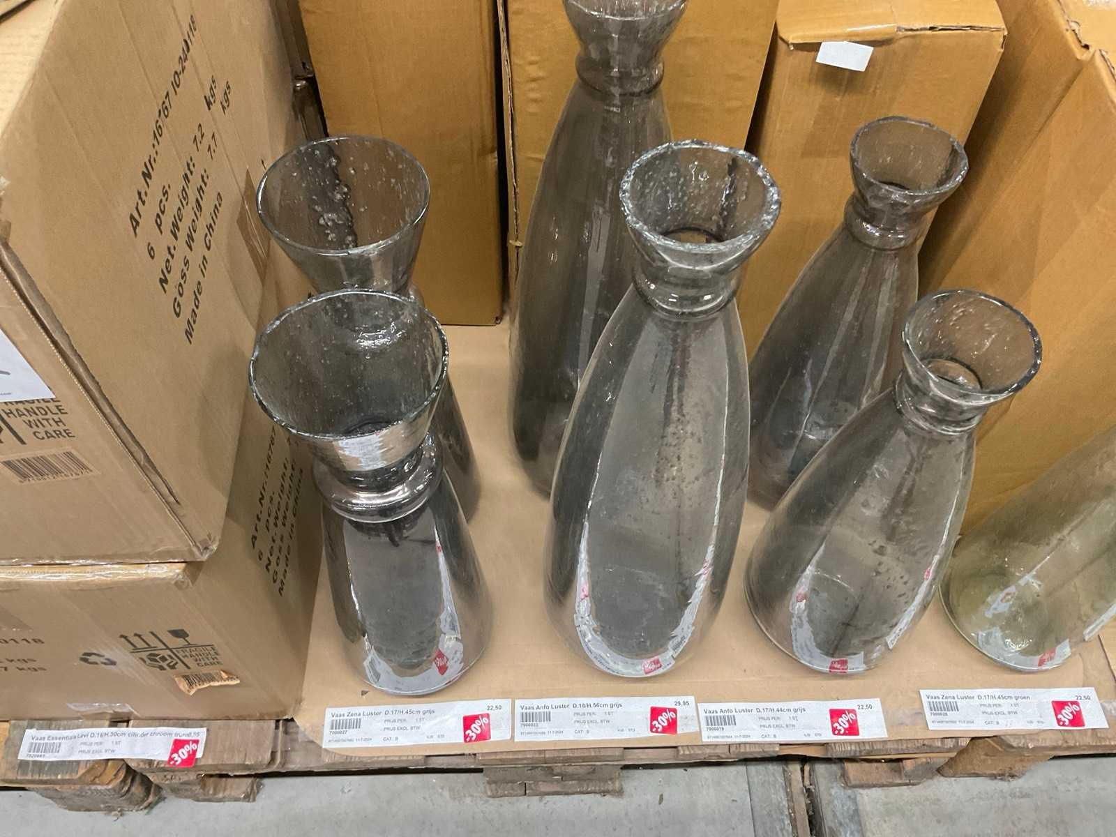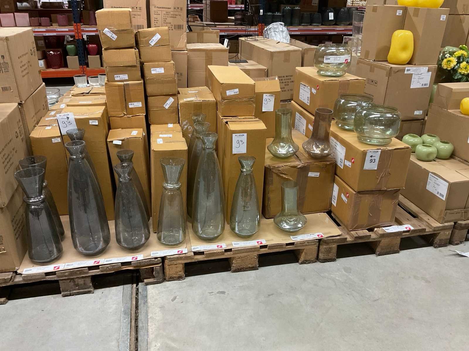 Van glas in diverse vormen en kleuren, modellen: Giro, Anfo en Zena op 2 pallets, inclusief pallets.