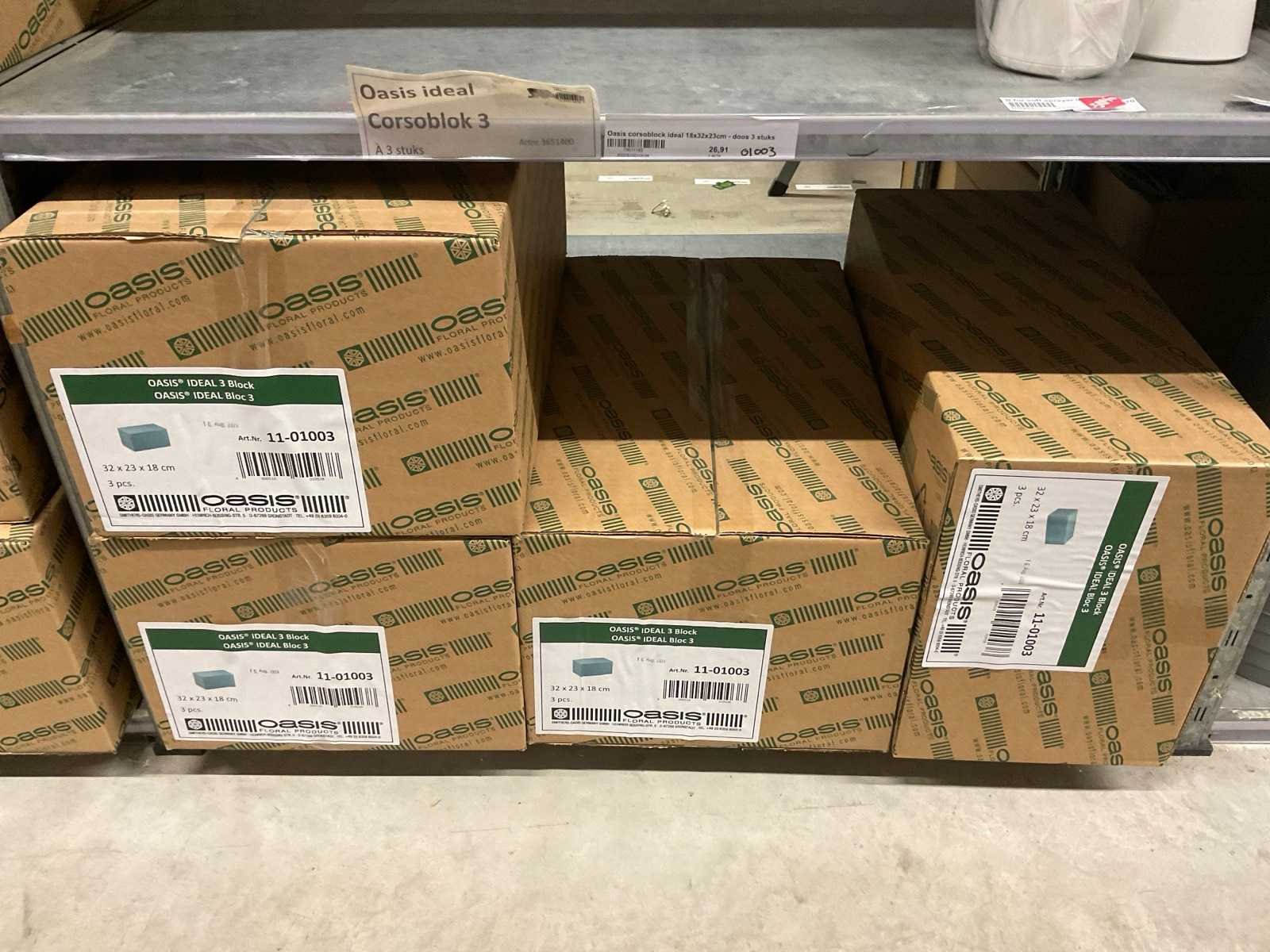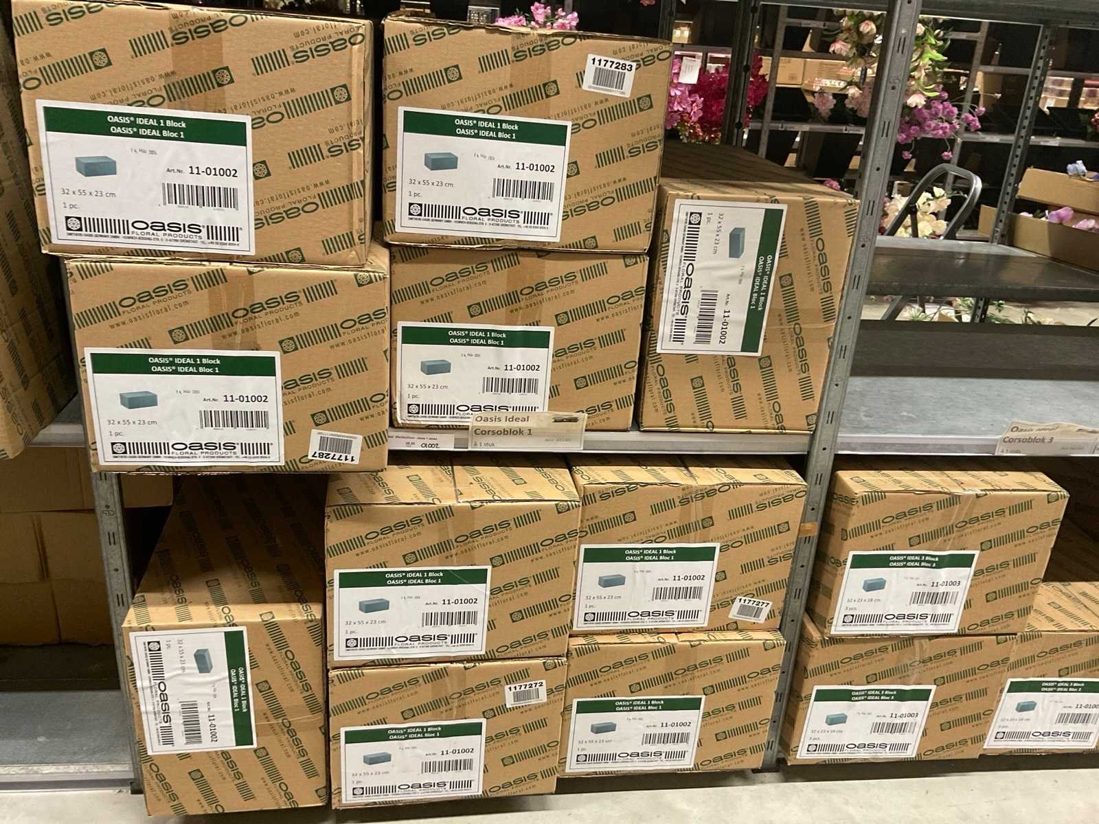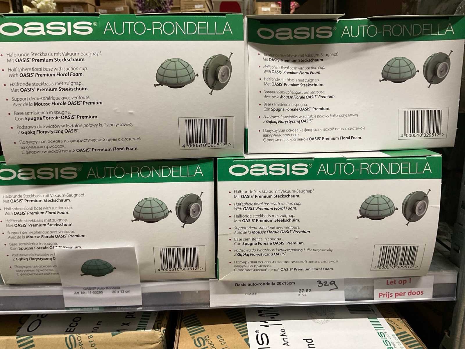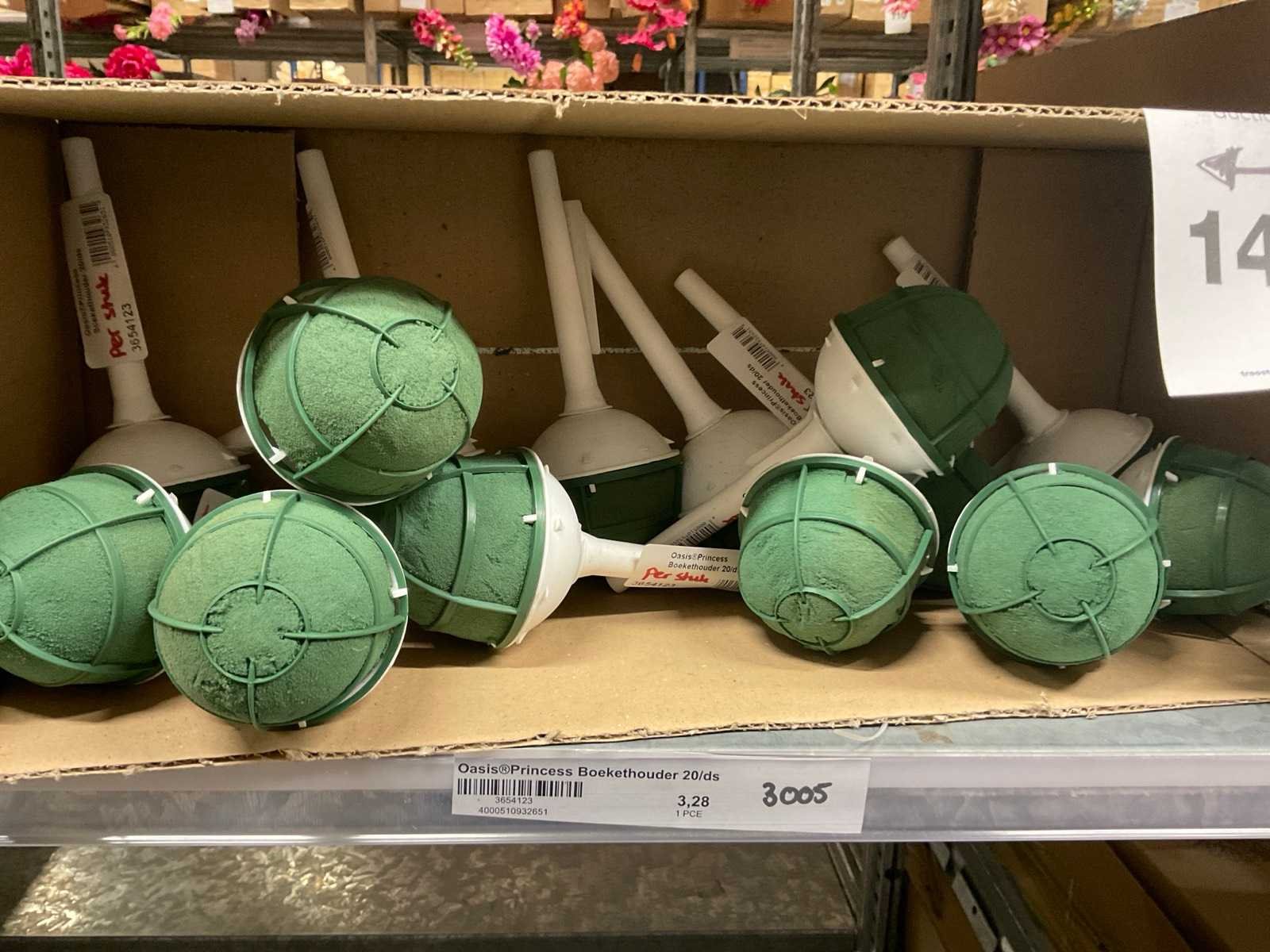 In diverse vormen en afmetingen, o.a. boekethouders, blokken, auto-rondella etc, alles in 3 stellingsecties, kunstbloemen en stelling niet inbegrepen. Merk: Oasis
