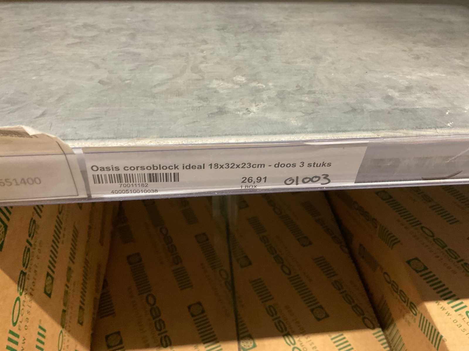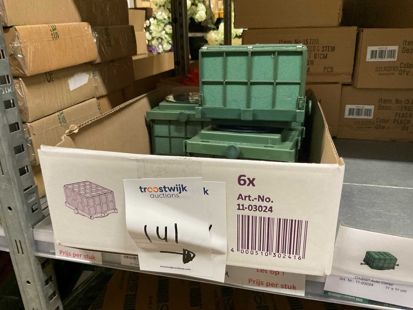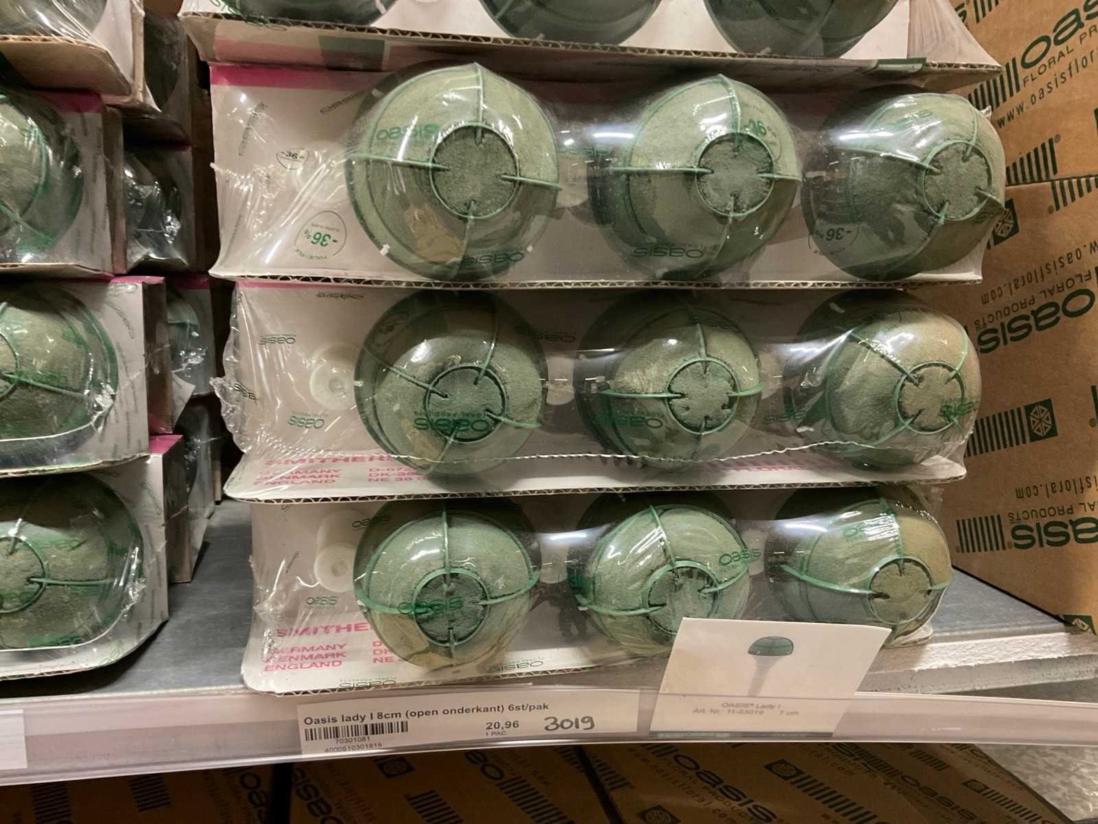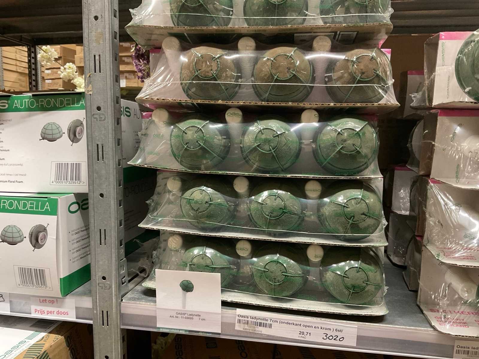 In diverse vormen en afmetingen, o.a. boekethouders, blokken, auto-rondella etc, alles in 3 stellingsecties, kunstbloemen en stelling niet inbegrepen. Merk: Oasis