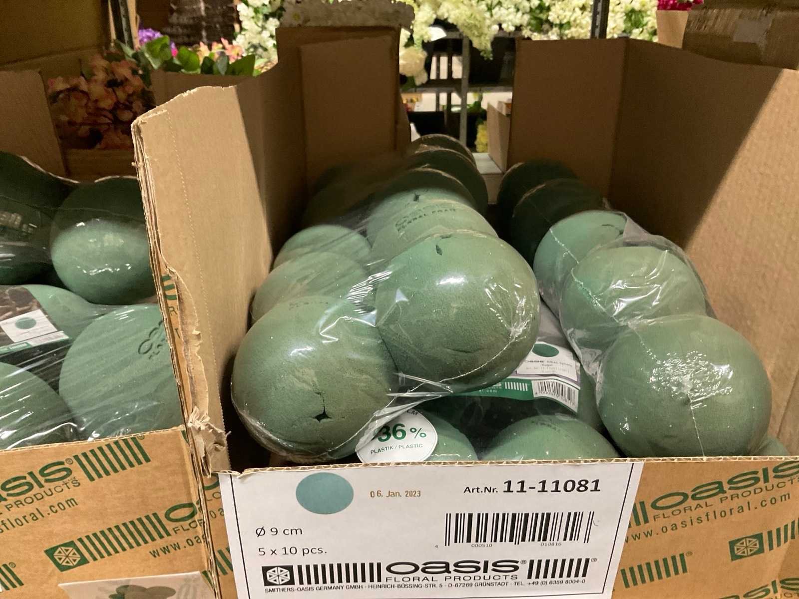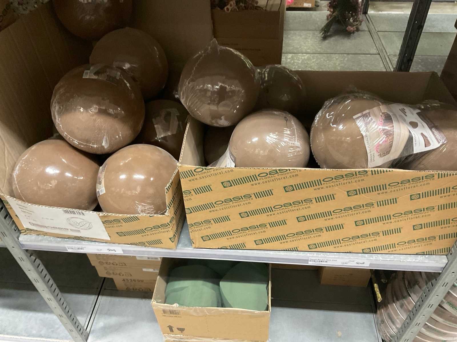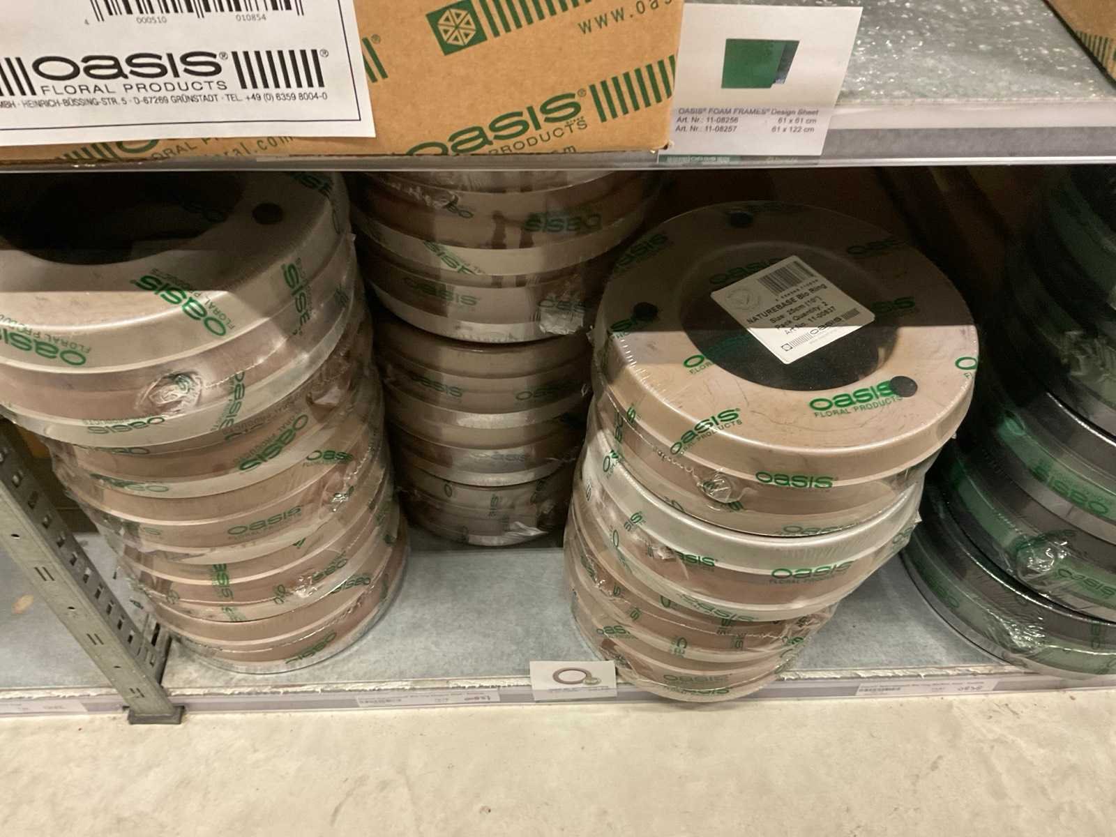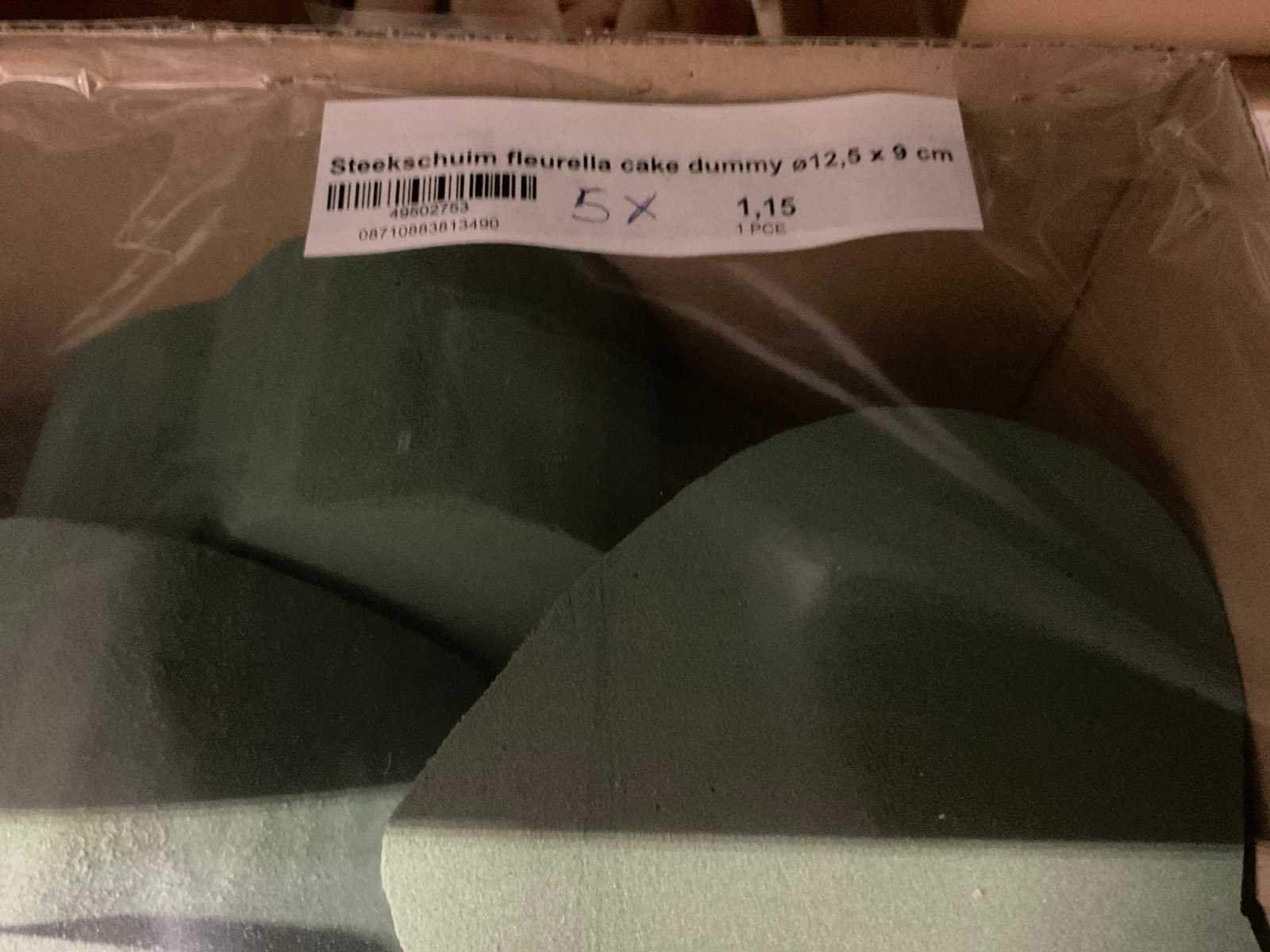 In diverse vormen en afmetingen, o.a. ballen, kegels, ringen, cake dummy, cilinder, etc, alles in 3 stellingsecties, kunstbloemen en stelling niet inbegrepen. Merk: Oasis