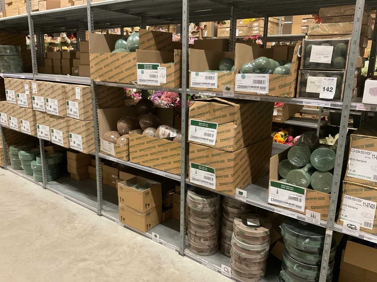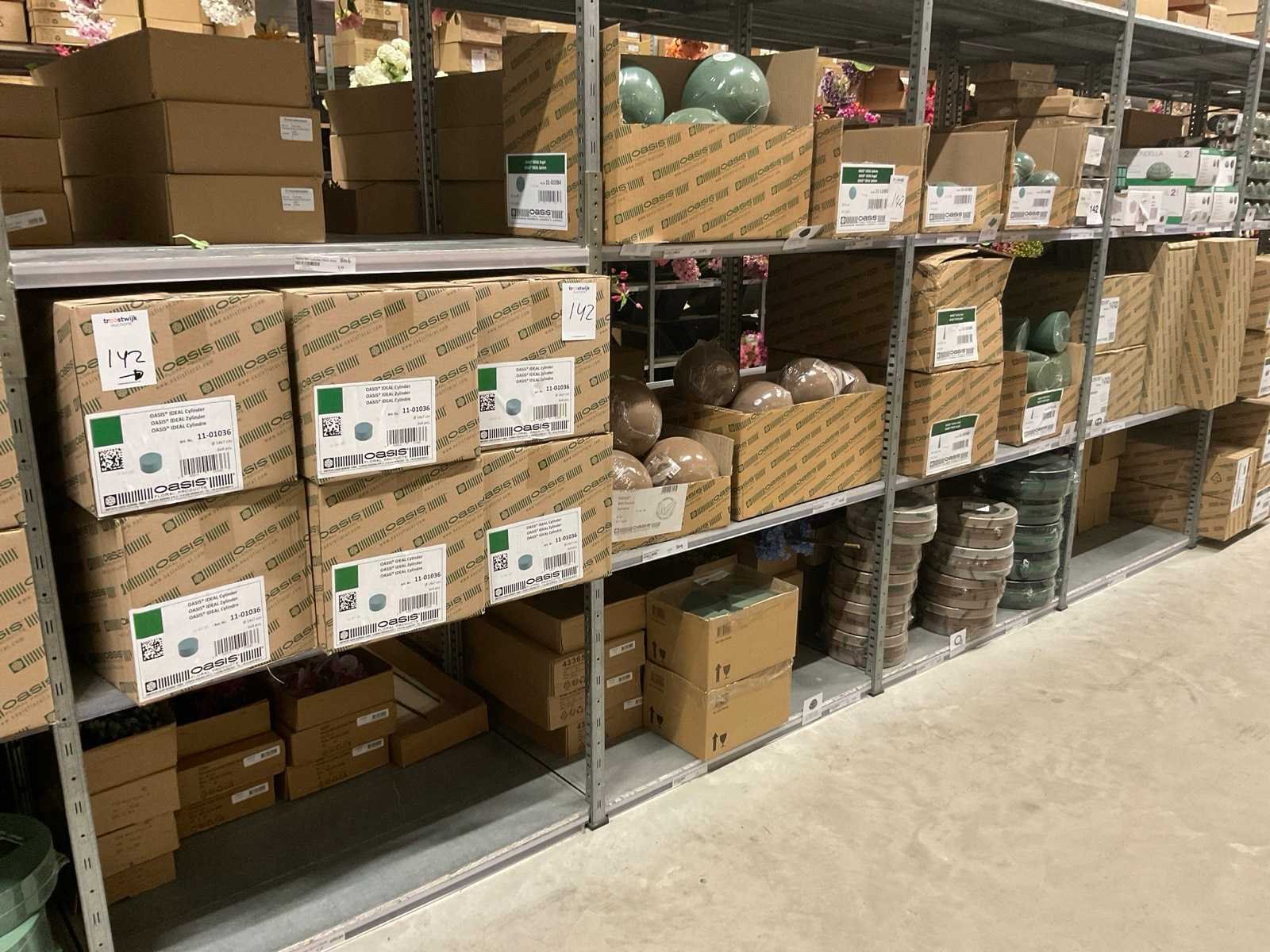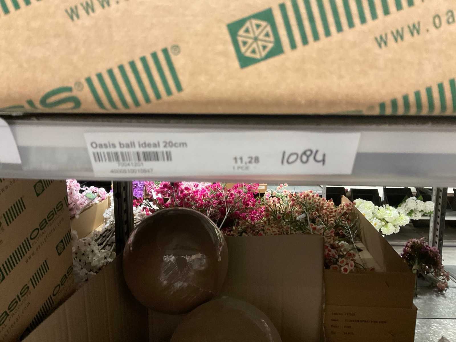 In diverse vormen en afmetingen, o.a. ballen, kegels, ringen, cake dummy, cilinder, etc, alles in 3 stellingsecties, kunstbloemen en stelling niet inbegrepen. Merk: Oasis