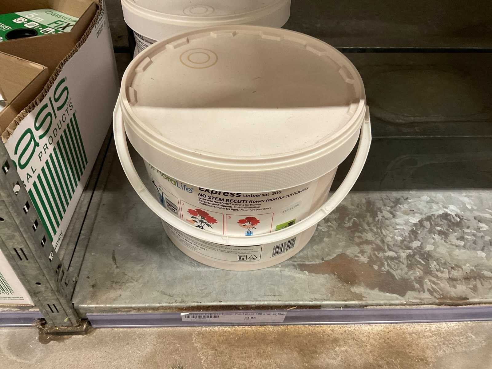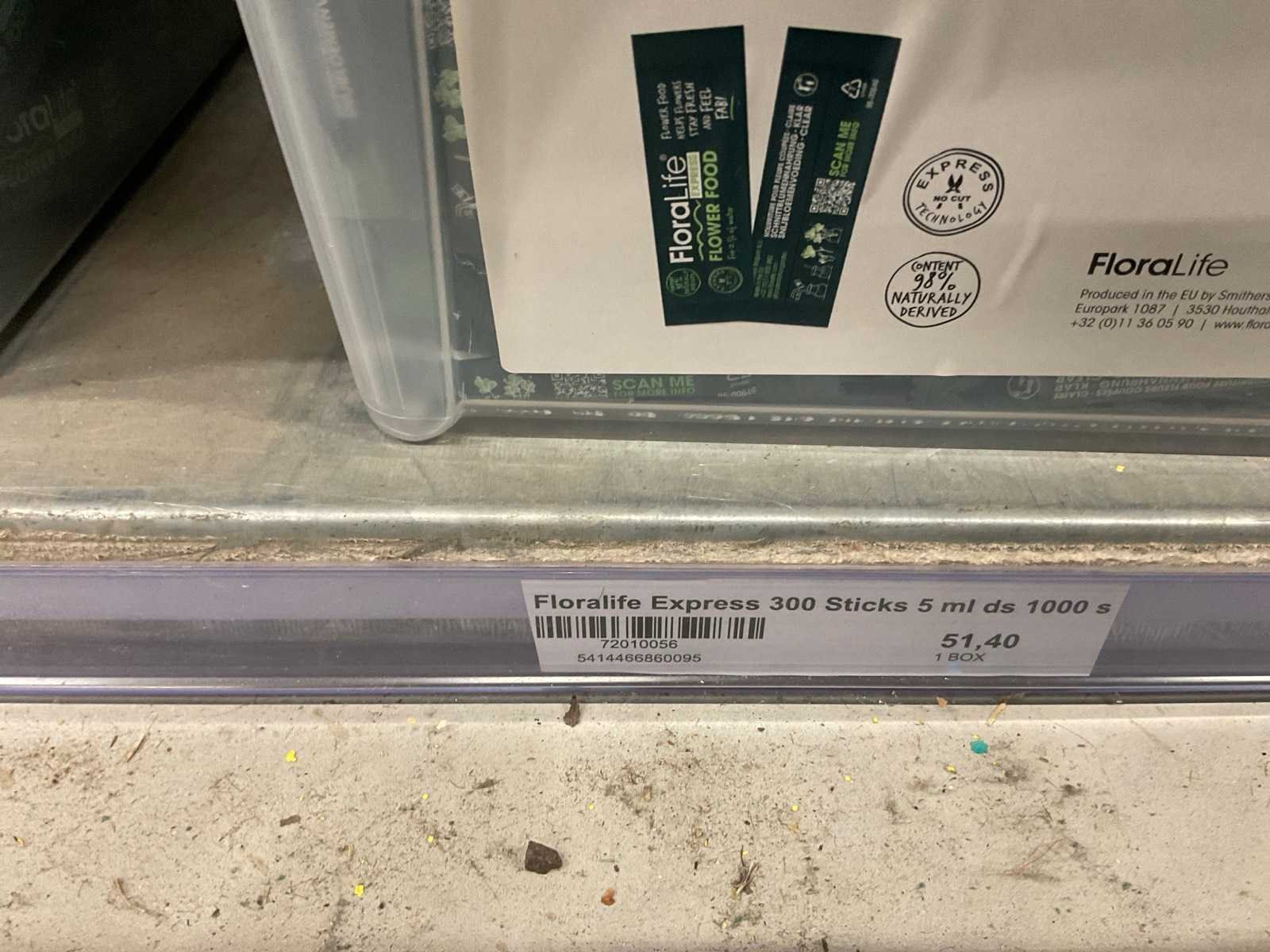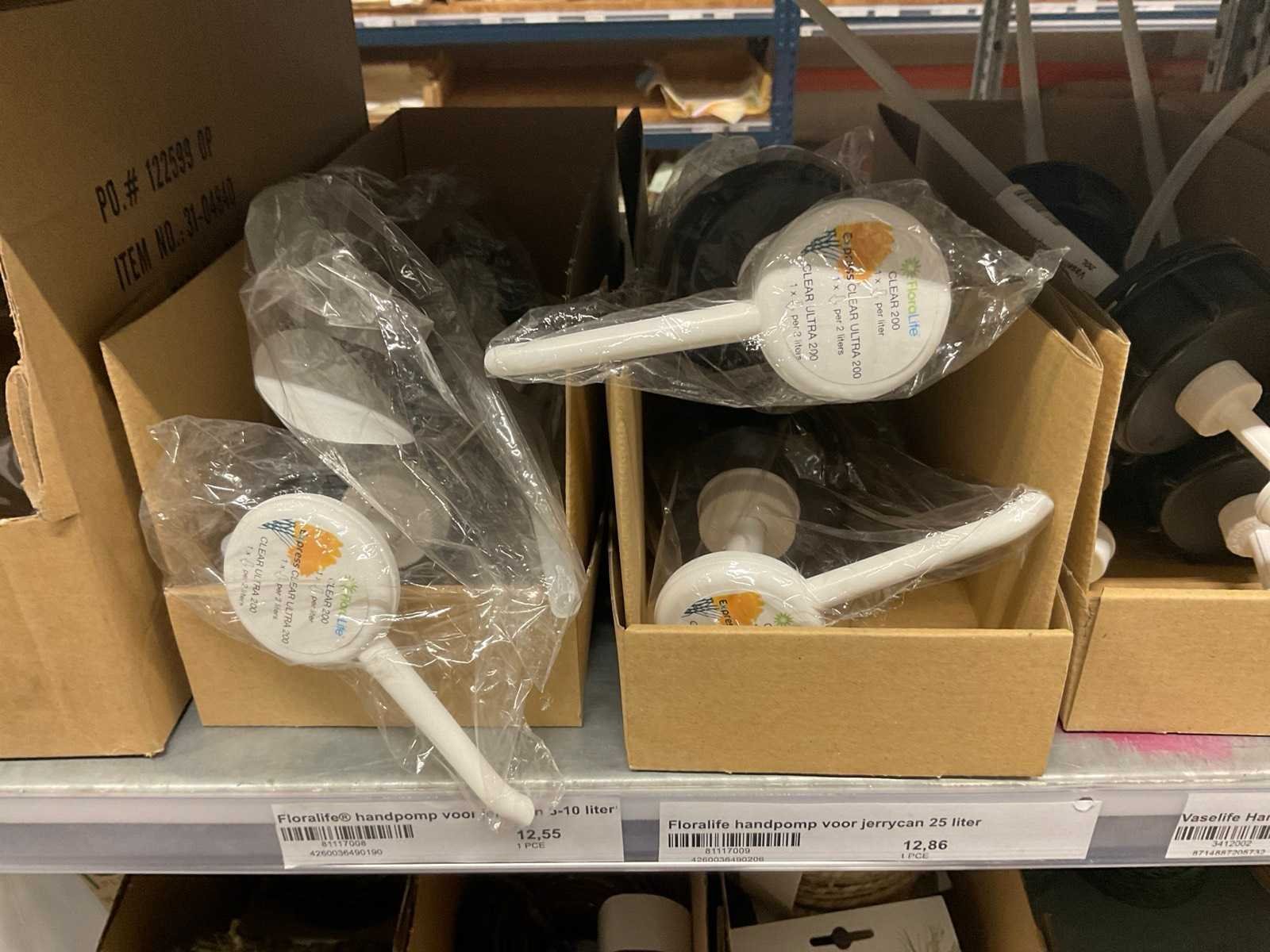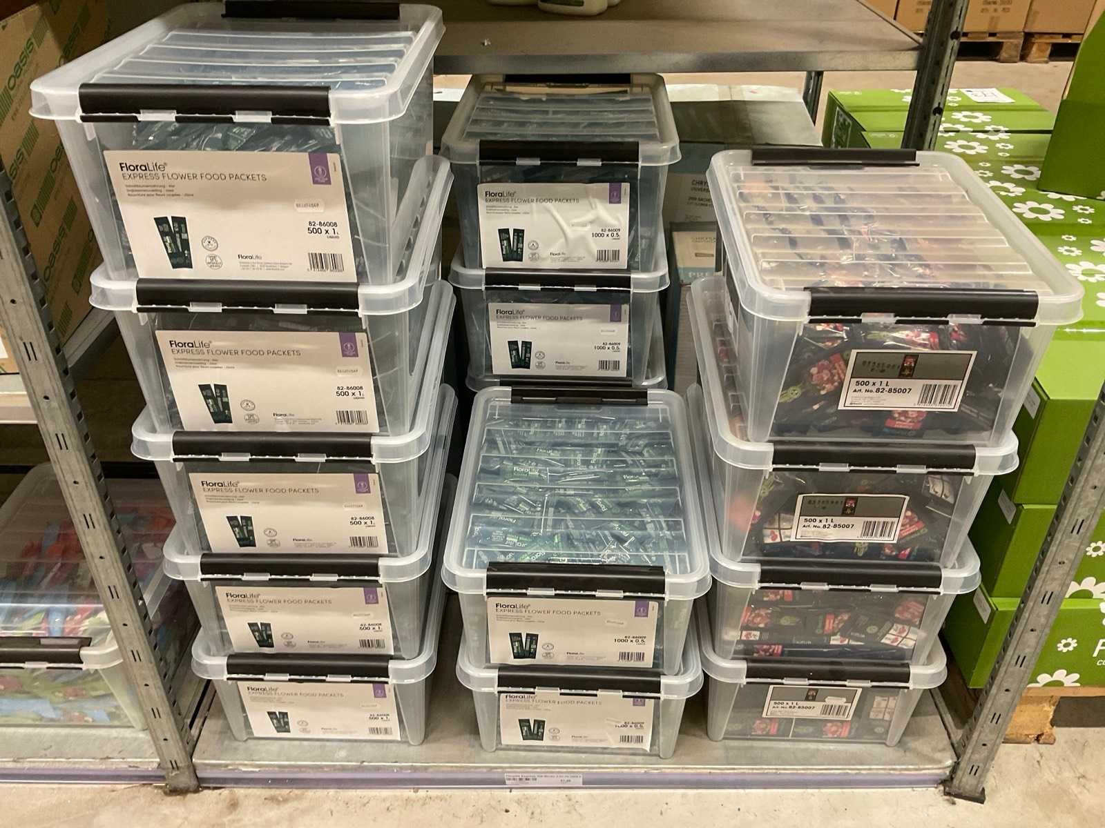 Bloemvoeding in plastic bakken, deco spray, bladglans, bloembakken, Oasis Fix, touw, krijtspay in diverse kleuren, handpompen, zuignappen etc in 4 stelling secties, stelling niet inbegrepen. Merk: O.a. Vaselife, FloralLife