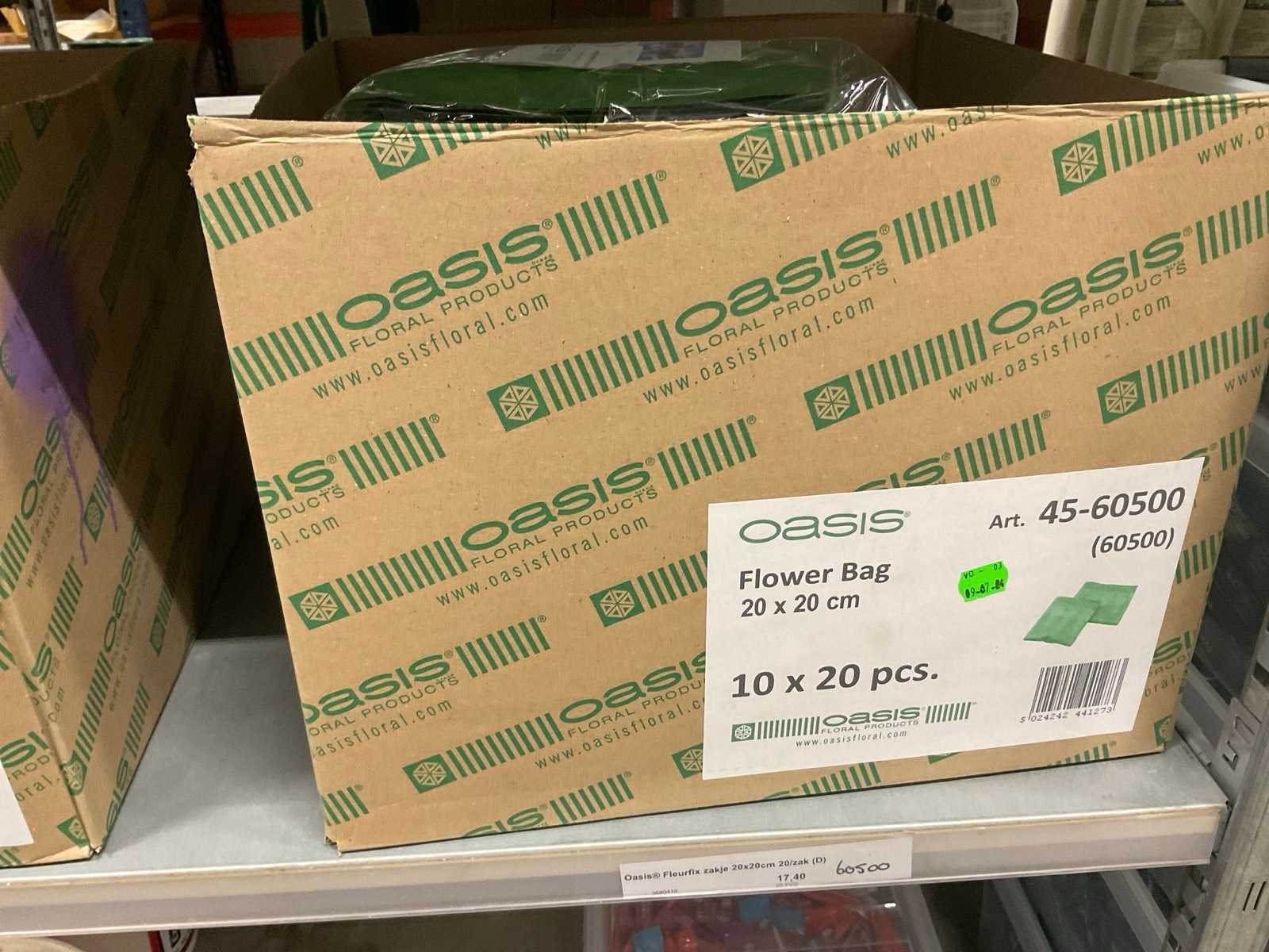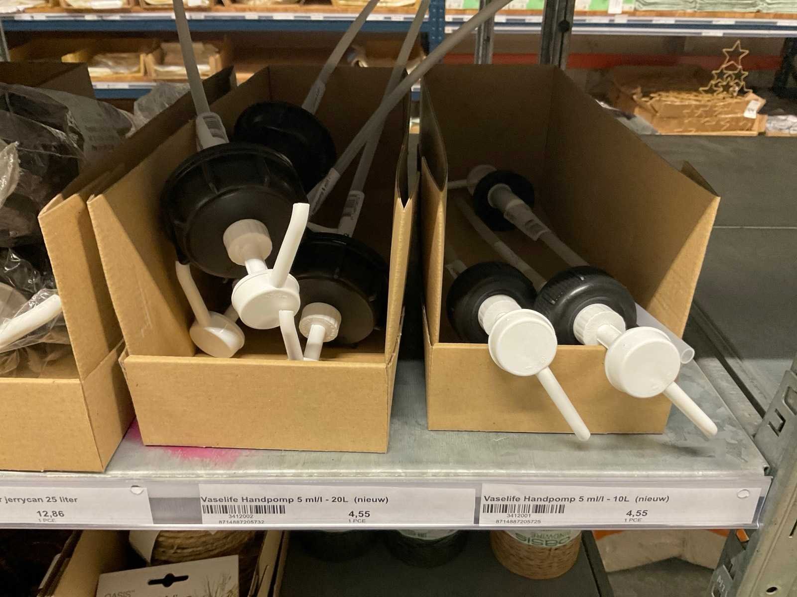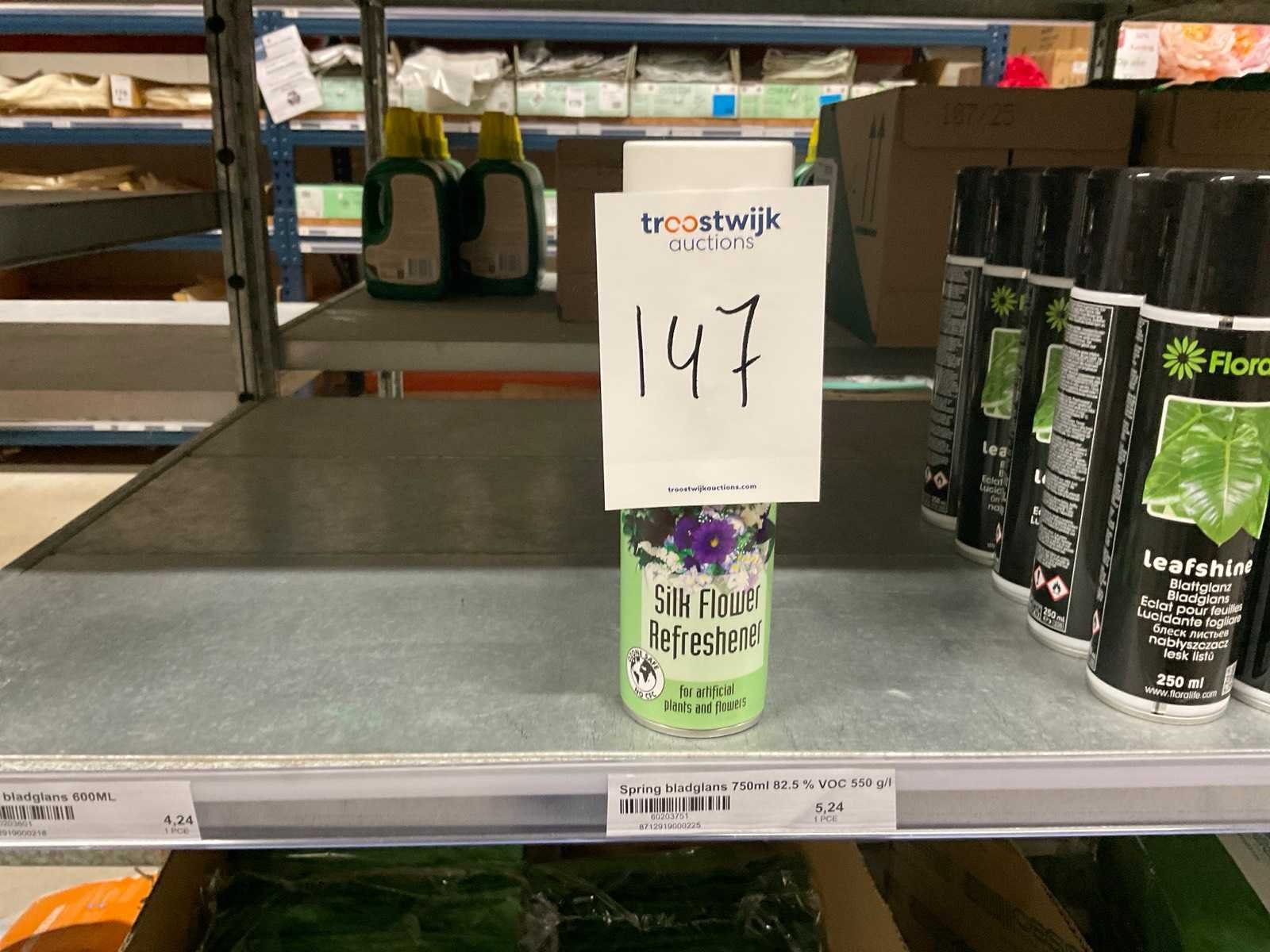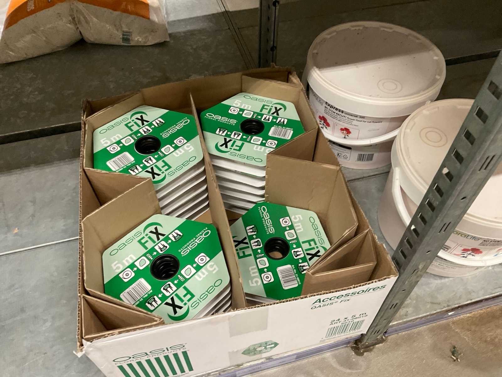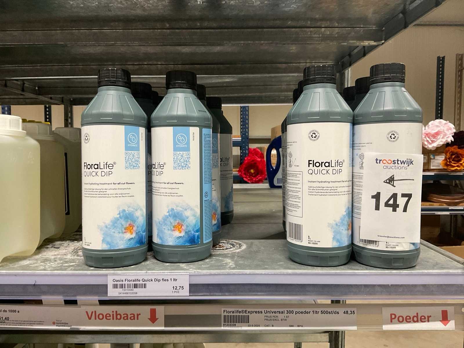 Bloemvoeding in plastic bakken, deco spray, bladglans, bloembakken, Oasis Fix, touw, krijtspay in diverse kleuren, handpompen, zuignappen etc in 4 stelling secties, stelling niet inbegrepen. Merk: O.a. Vaselife, FloralLife