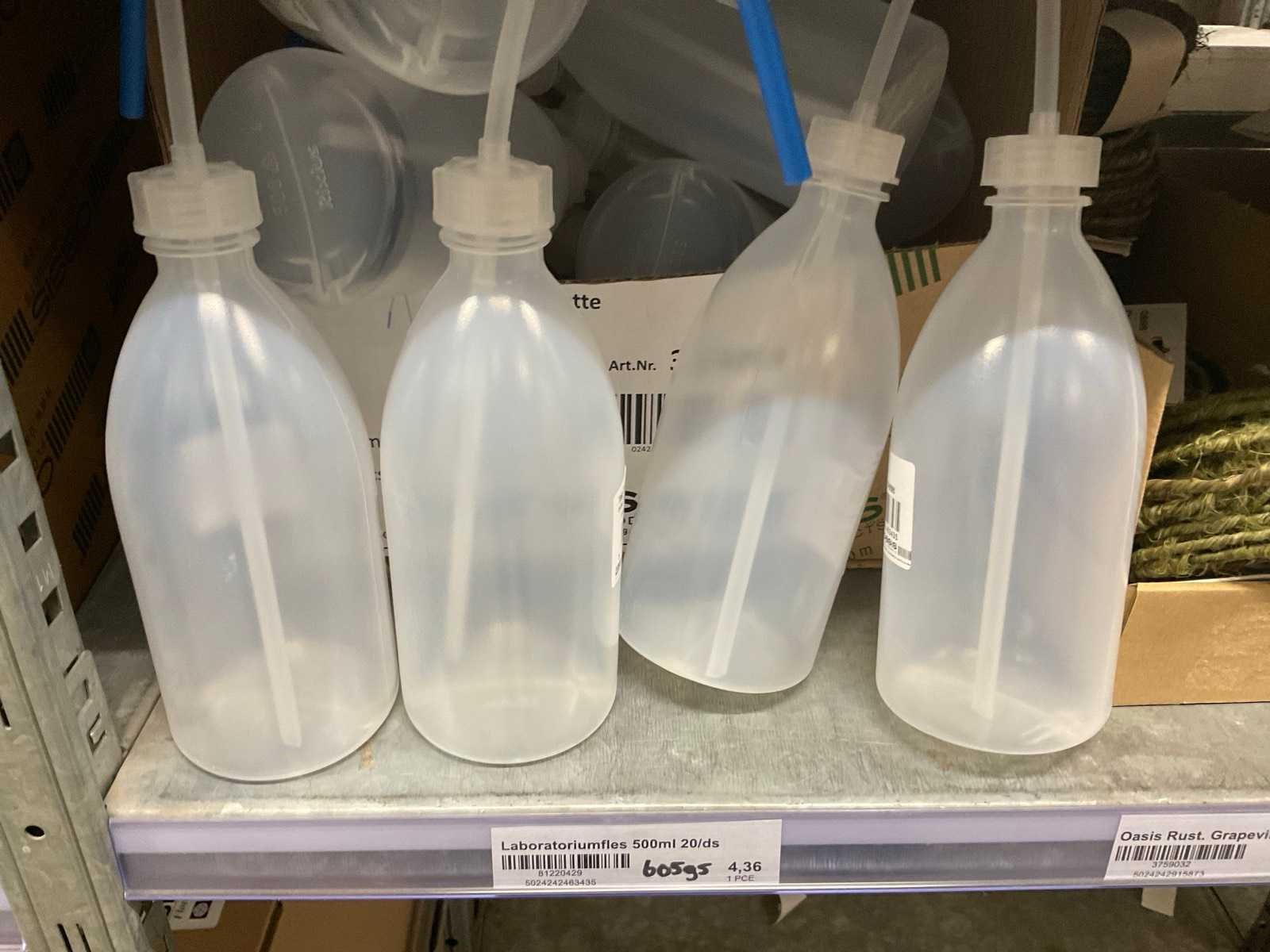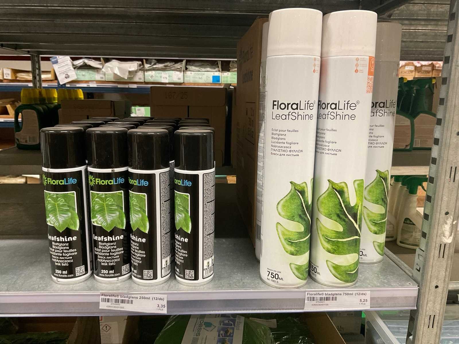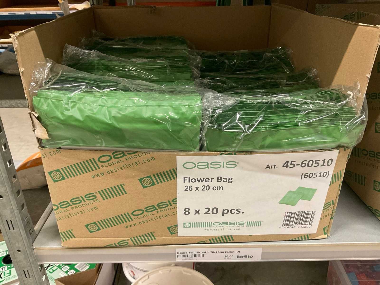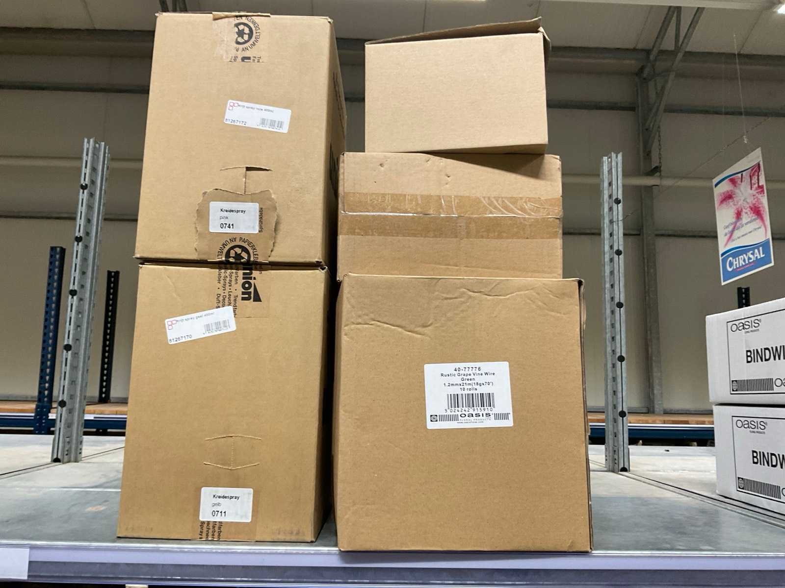 Bloemvoeding in plastic bakken, deco spray, bladglans, bloembakken, Oasis Fix, touw, krijtspay in diverse kleuren, handpompen, zuignappen etc in 4 stelling secties, stelling niet inbegrepen. Merk: O.a. Vaselife, FloralLife