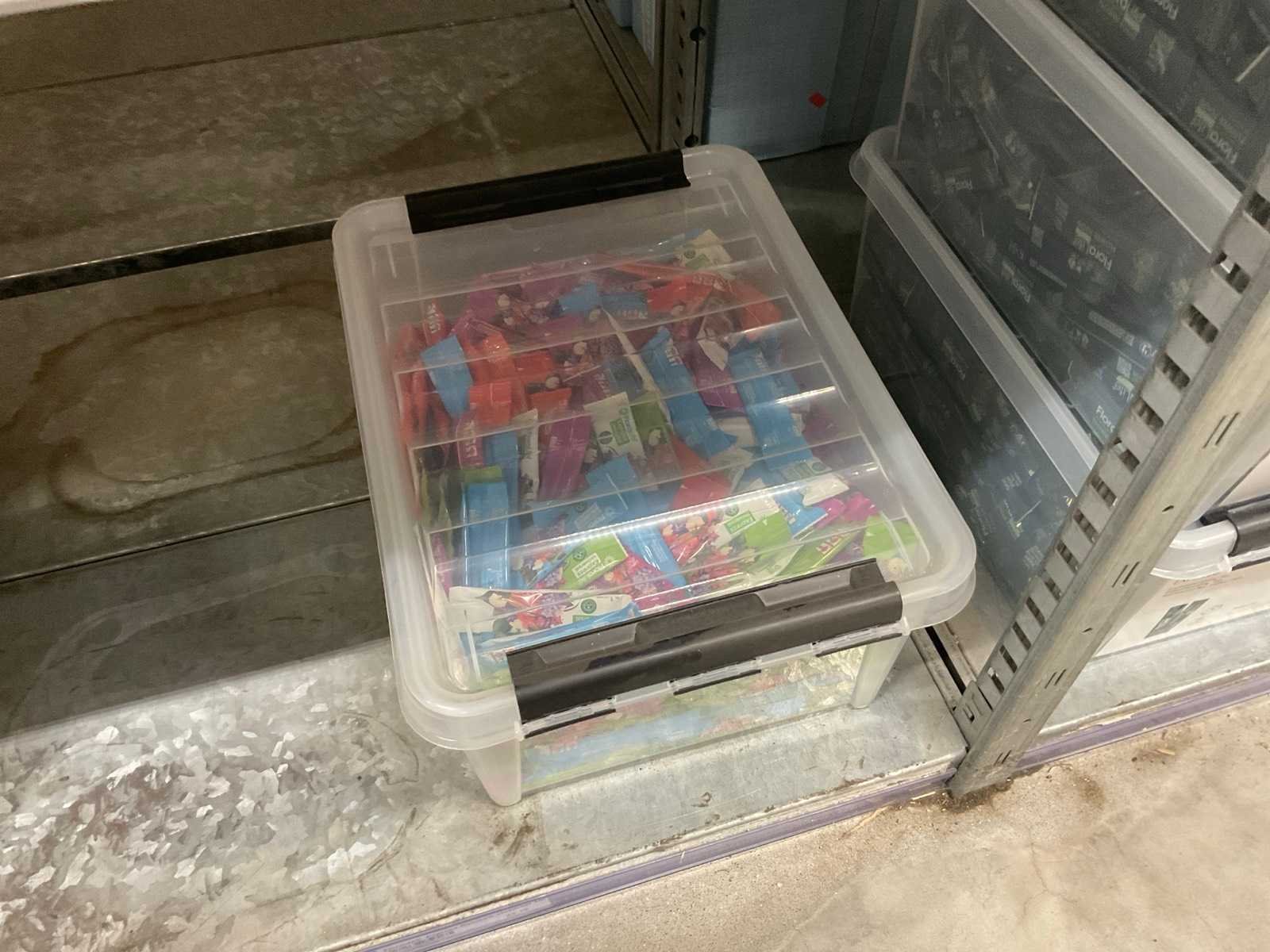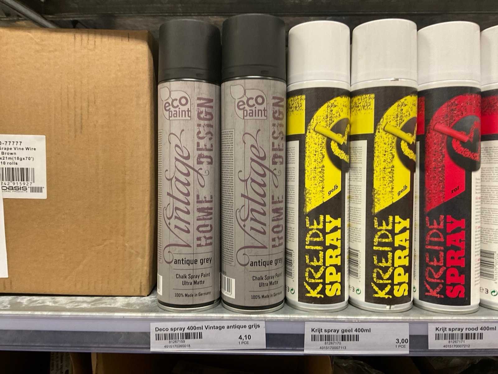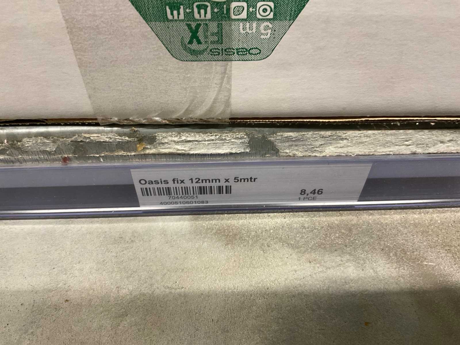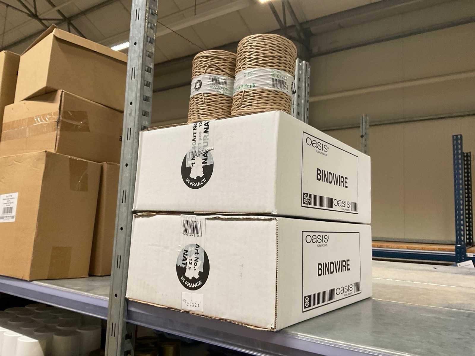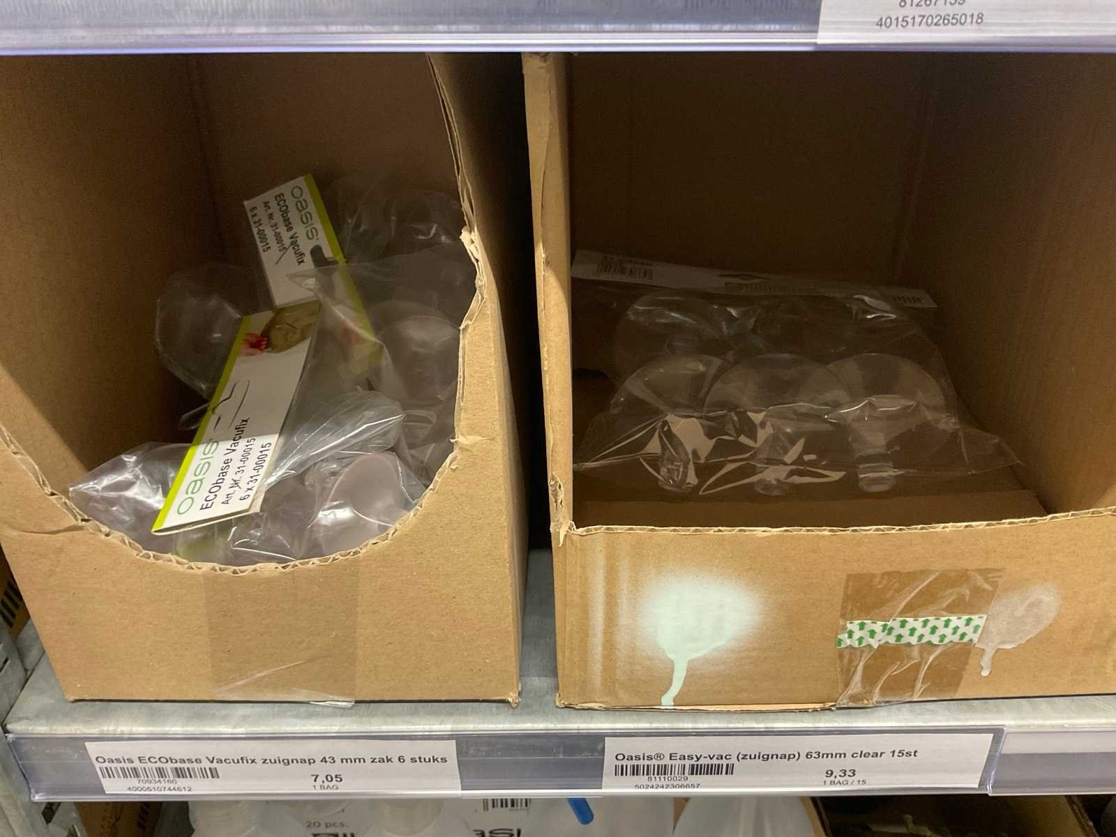 Bloemvoeding in plastic bakken, deco spray, bladglans, bloembakken, Oasis Fix, touw, krijtspay in diverse kleuren, handpompen, zuignappen etc in 4 stelling secties, stelling niet inbegrepen. Merk: O.a. Vaselife, FloralLife