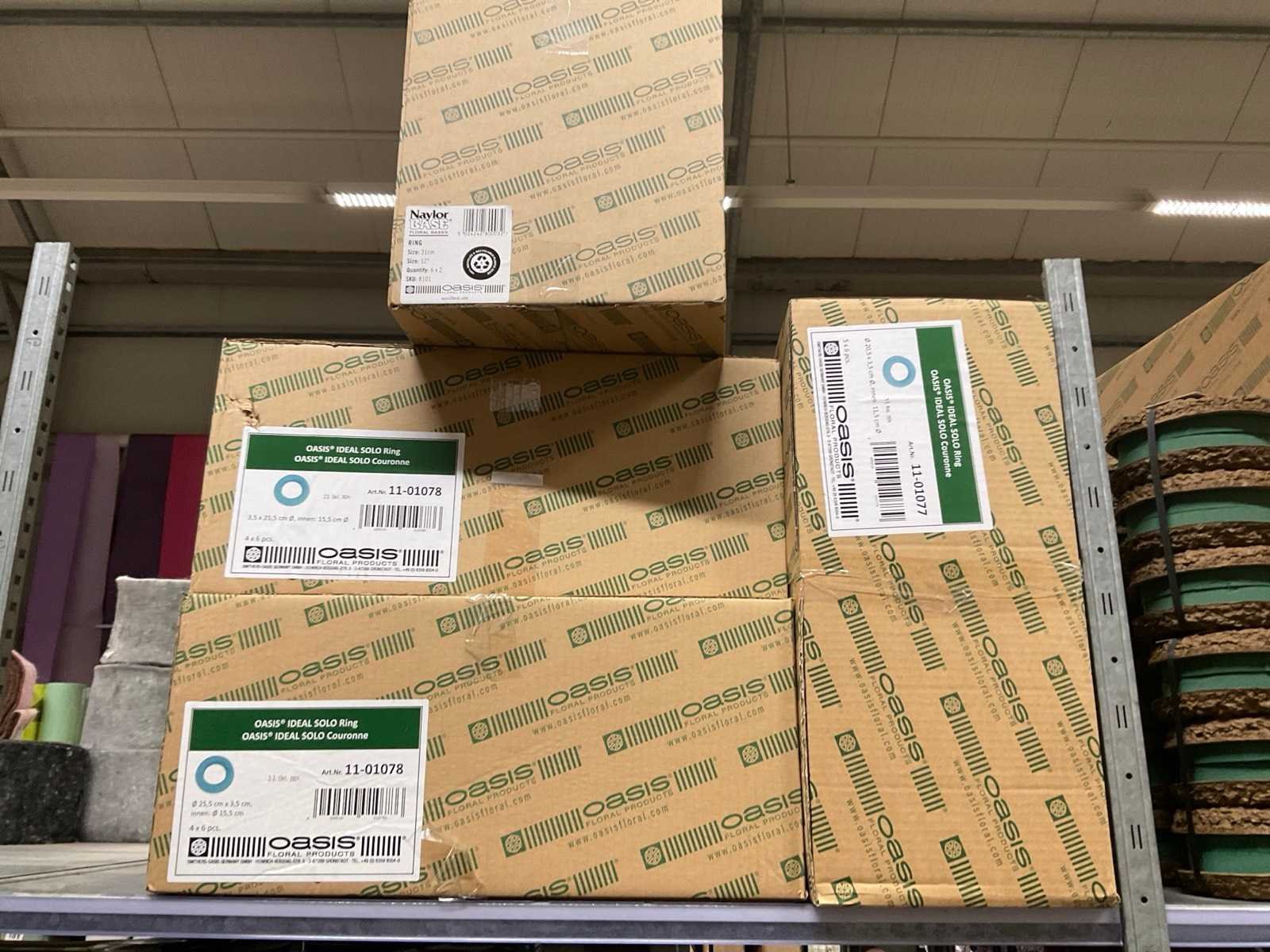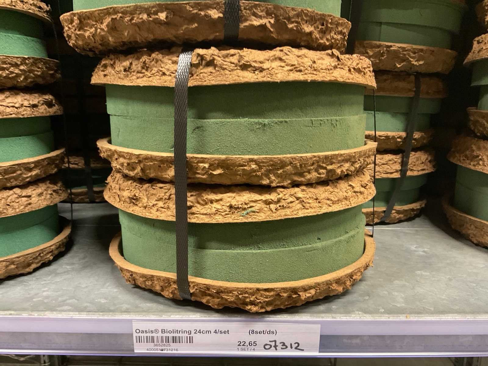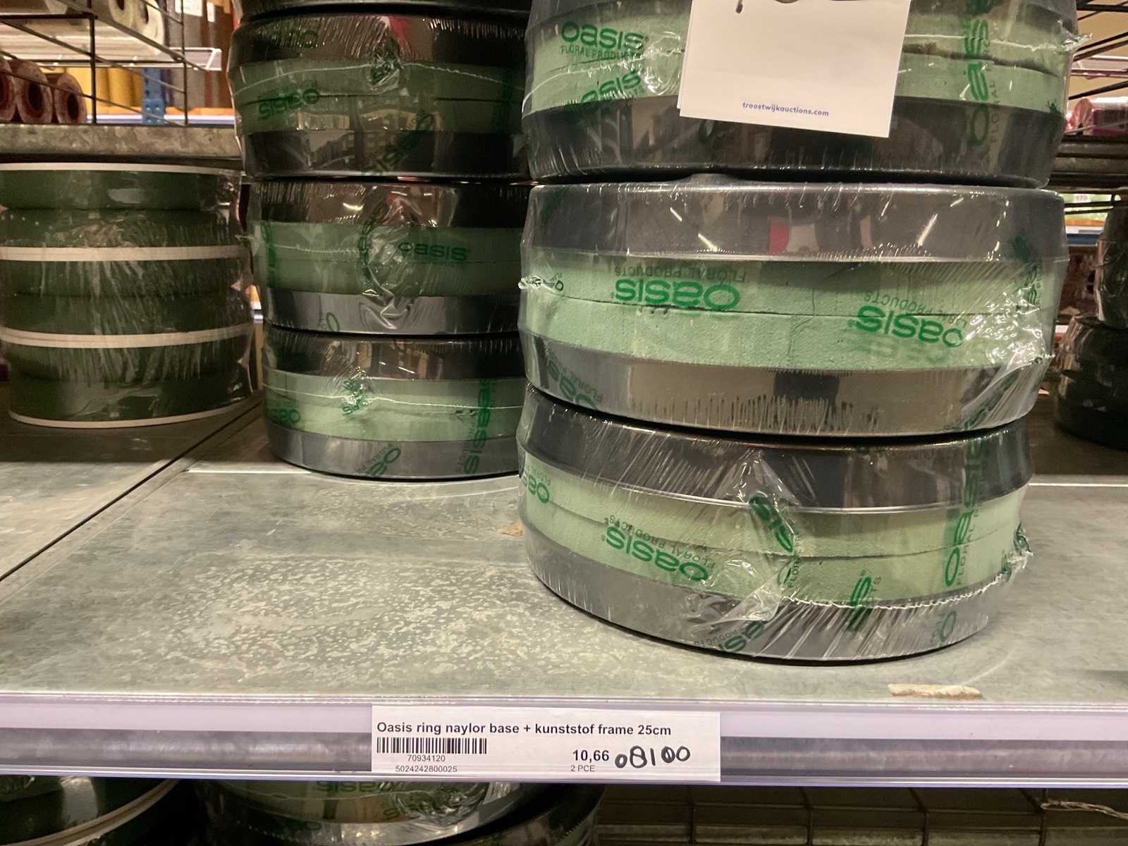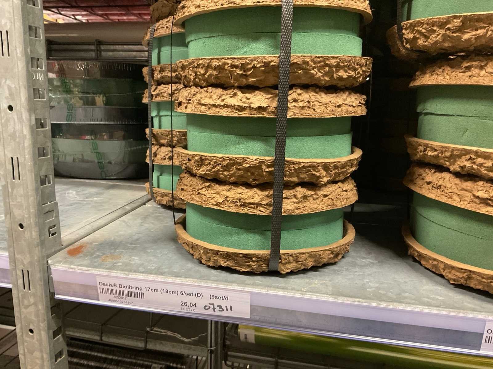 Oasis steekschuim in diverse vormen en afmetingen, o.a. Raquette, ring, schaal en blok, in 4 stellingsecties, stelling niet inbegrepen. Merk: Oasis Model: Foam frames