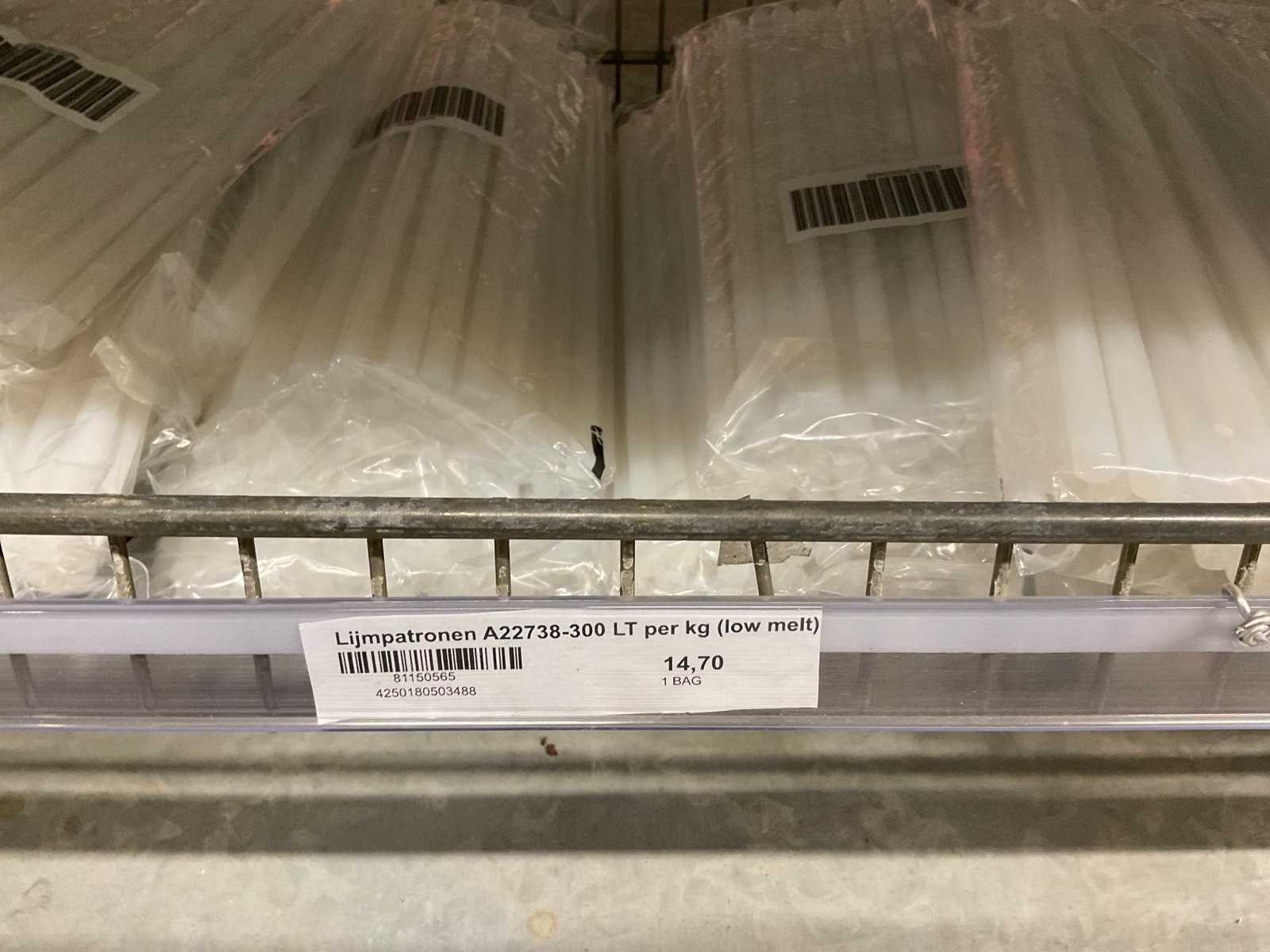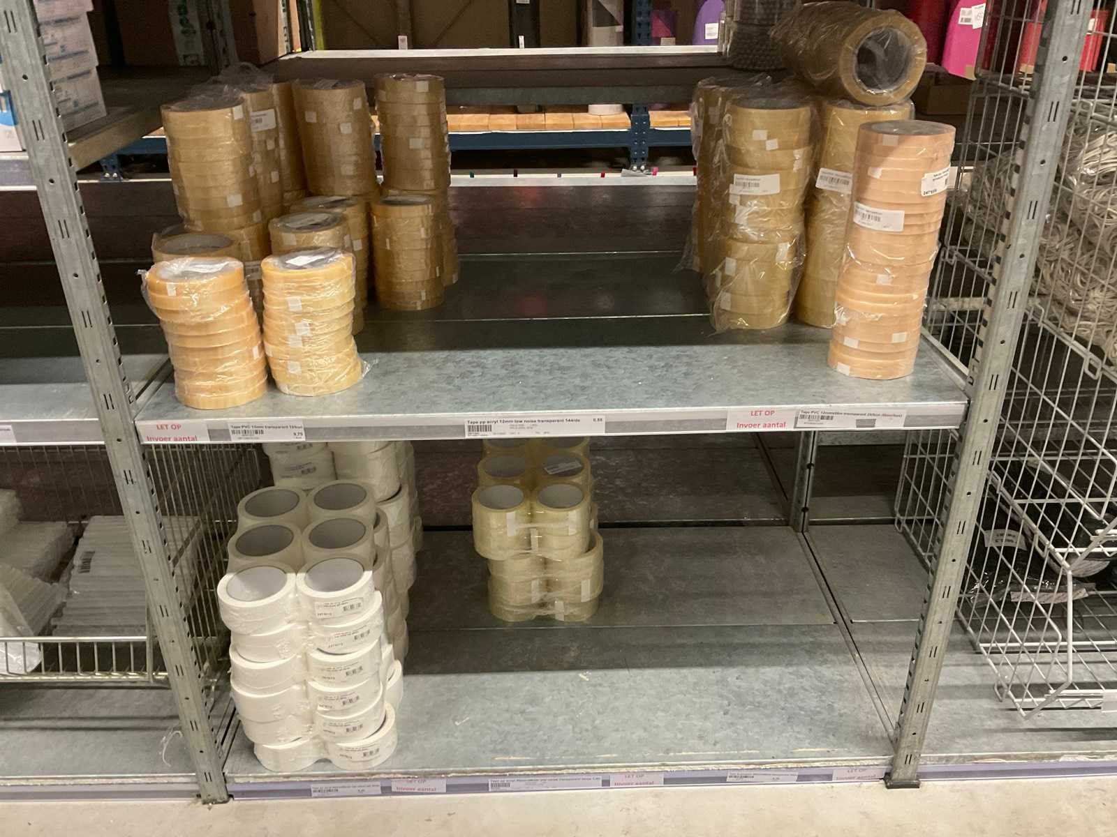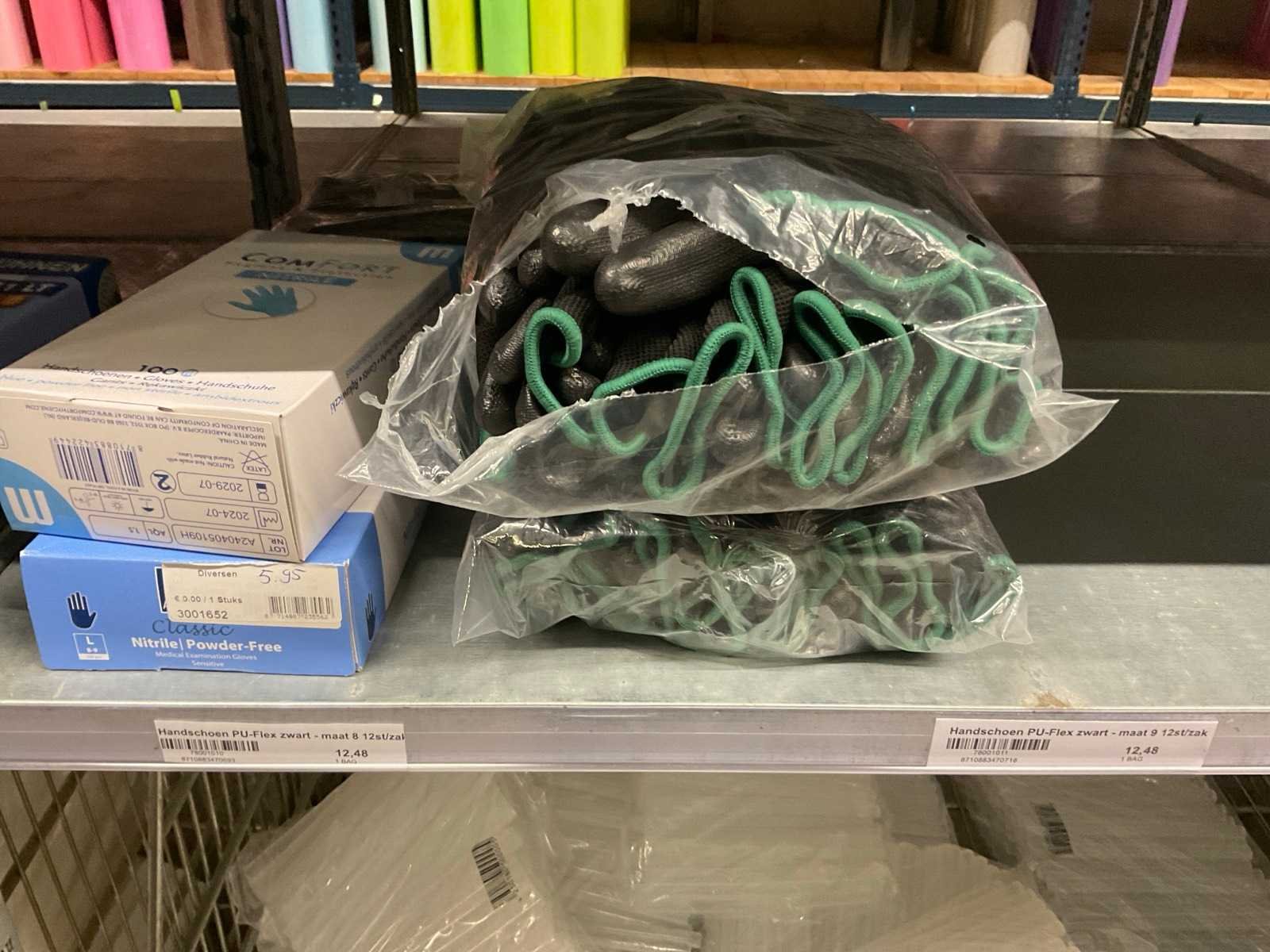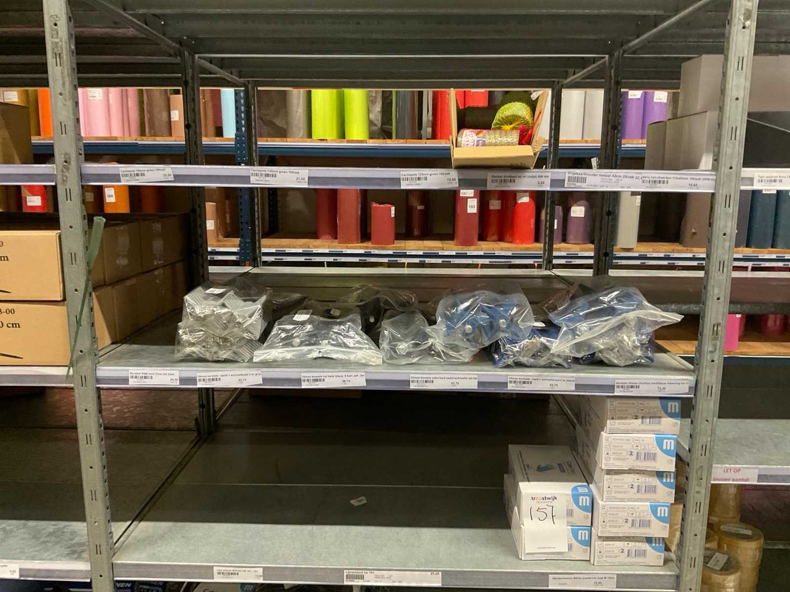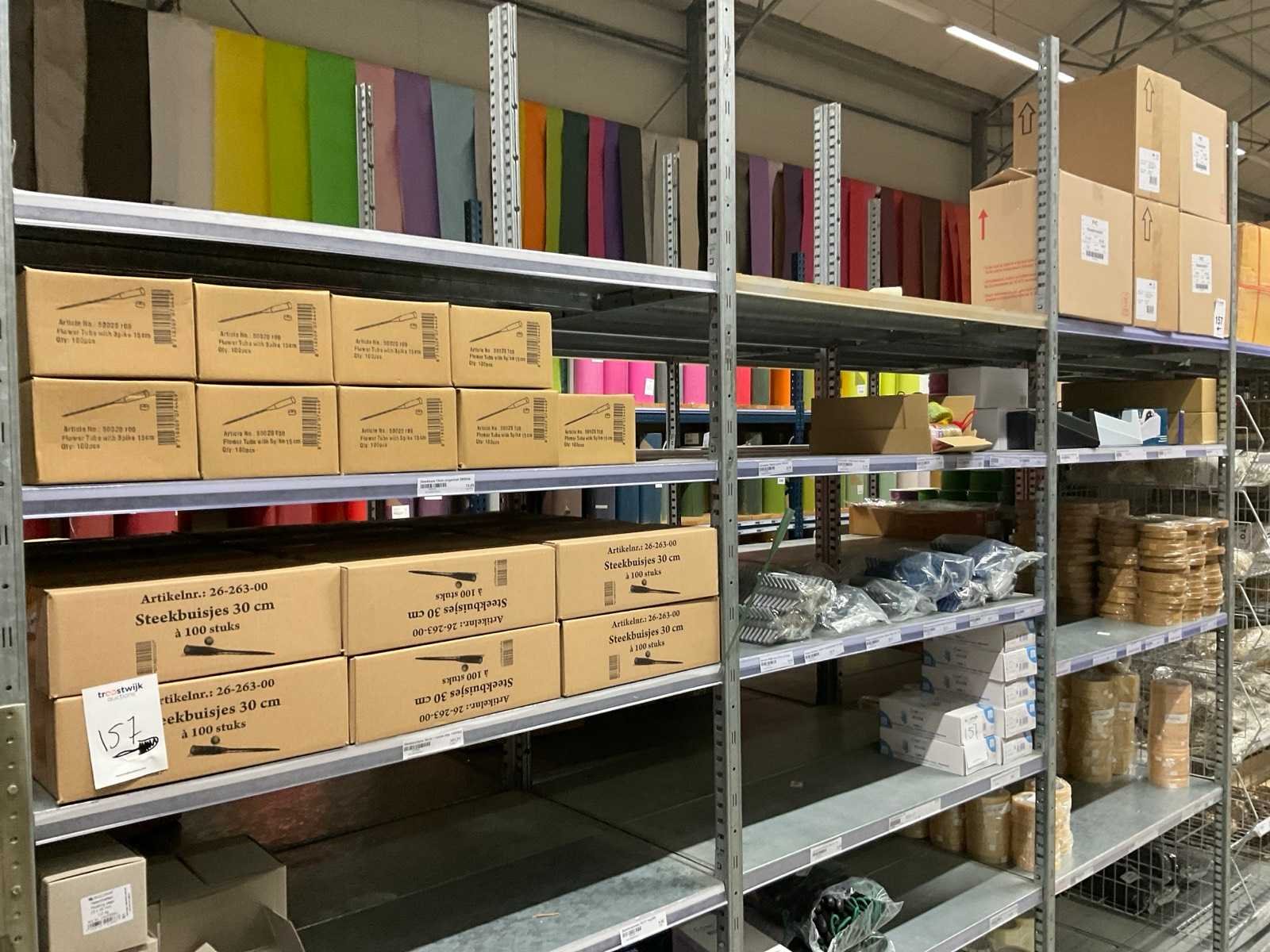 Bloemist, kantoor benodigdheden bestaande uit Plakband in diverse lengtes, kleuren en breedtes, plakbandhouders, Olies borstels, handschoenen voornamelijk maat 8, steekbuisjes 15 en 30 cm, steekkarren, aluminium folie, Buhnen lijmpistolen en patronen in 3 stellingsecties, stelling niet inbegrepen.
