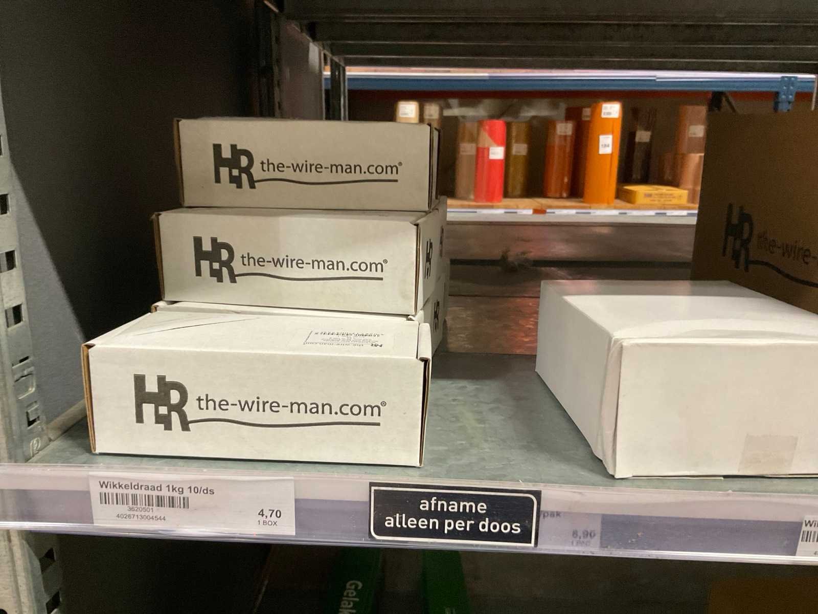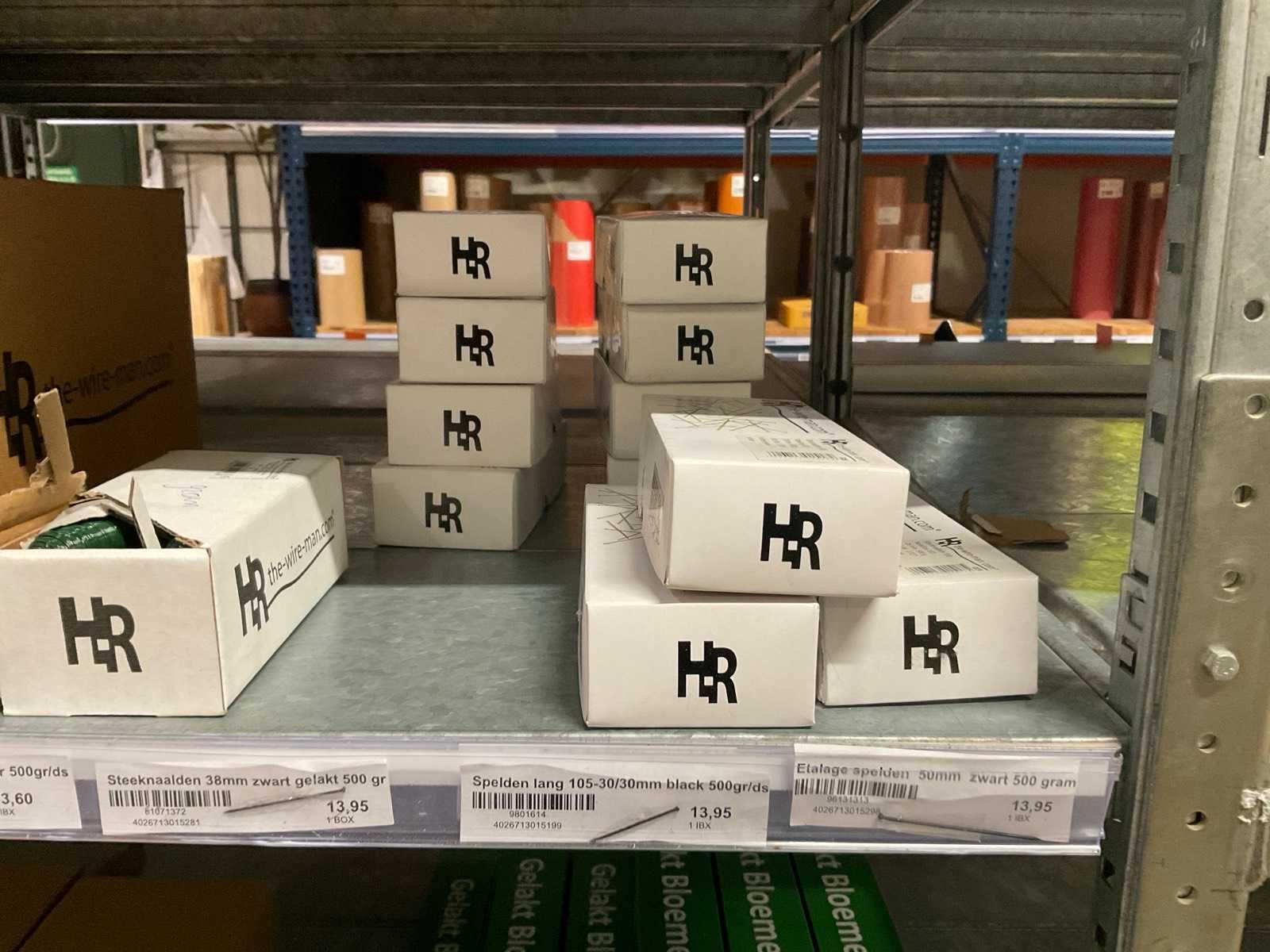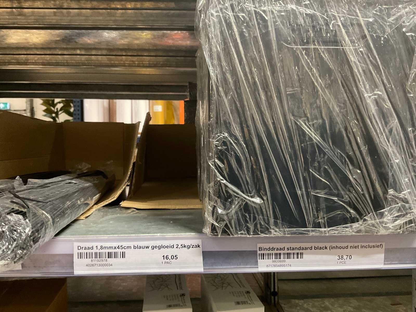 Bloemistbenodigdheden bestaande uit kartonnen labels, vuilniszakken, binddraad in diverse diktes, lengtes en kleuren, spelden in 2 stellingsecties, stelling niet inbegrepen.