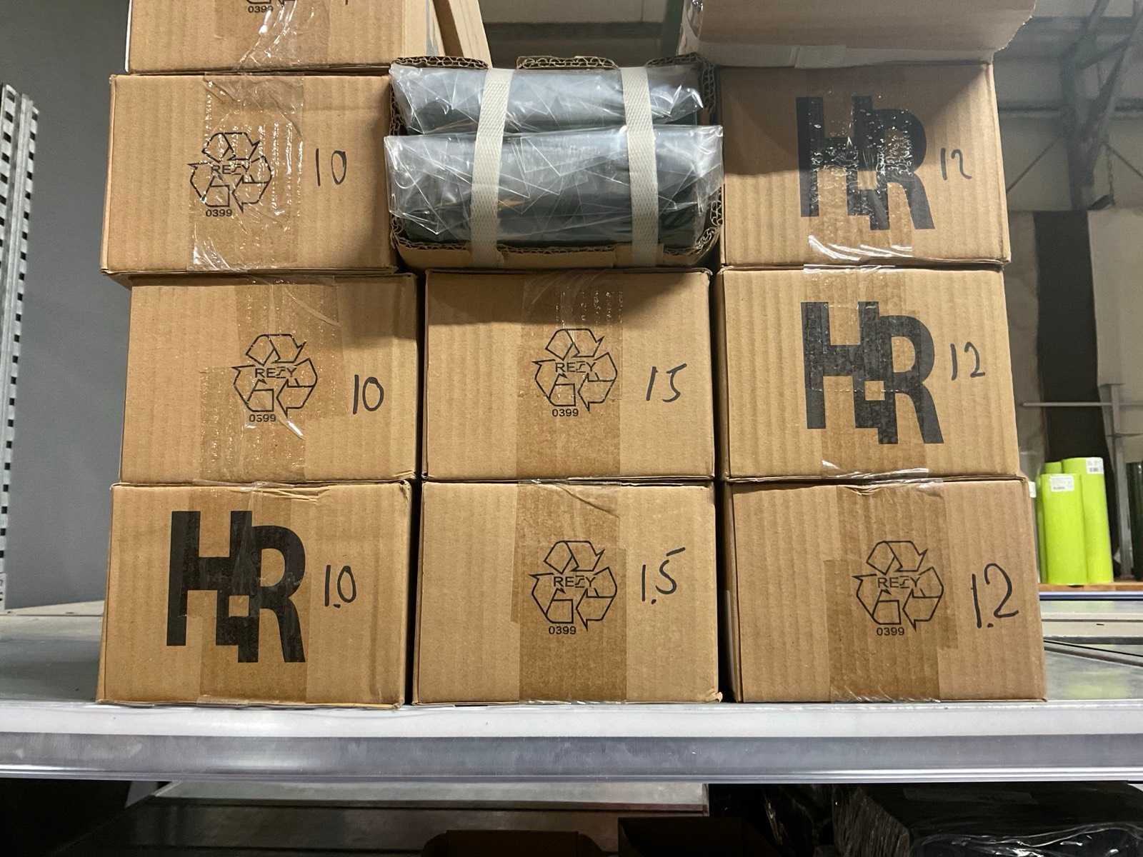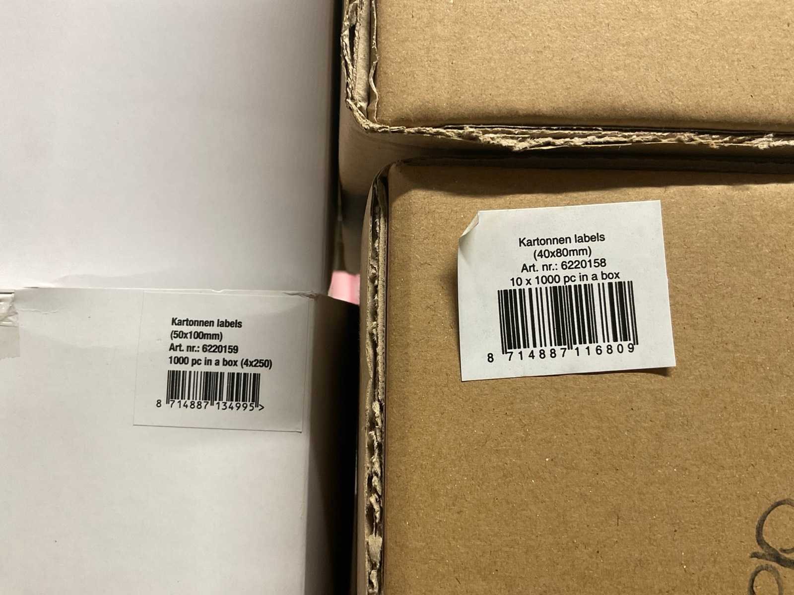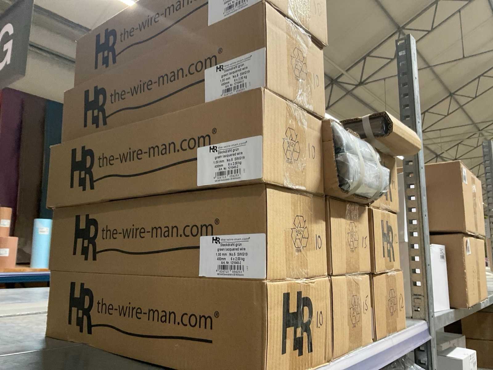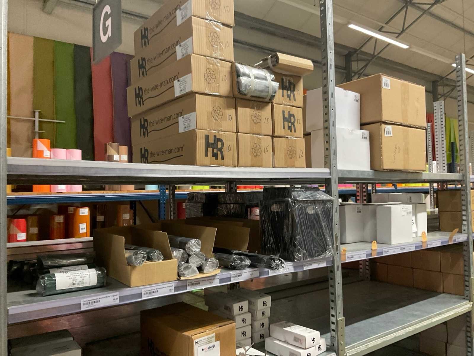 Bloemistbenodigdheden bestaande uit kartonnen labels, vuilniszakken, binddraad in diverse diktes, lengtes en kleuren, spelden in 2 stellingsecties, stelling niet inbegrepen.