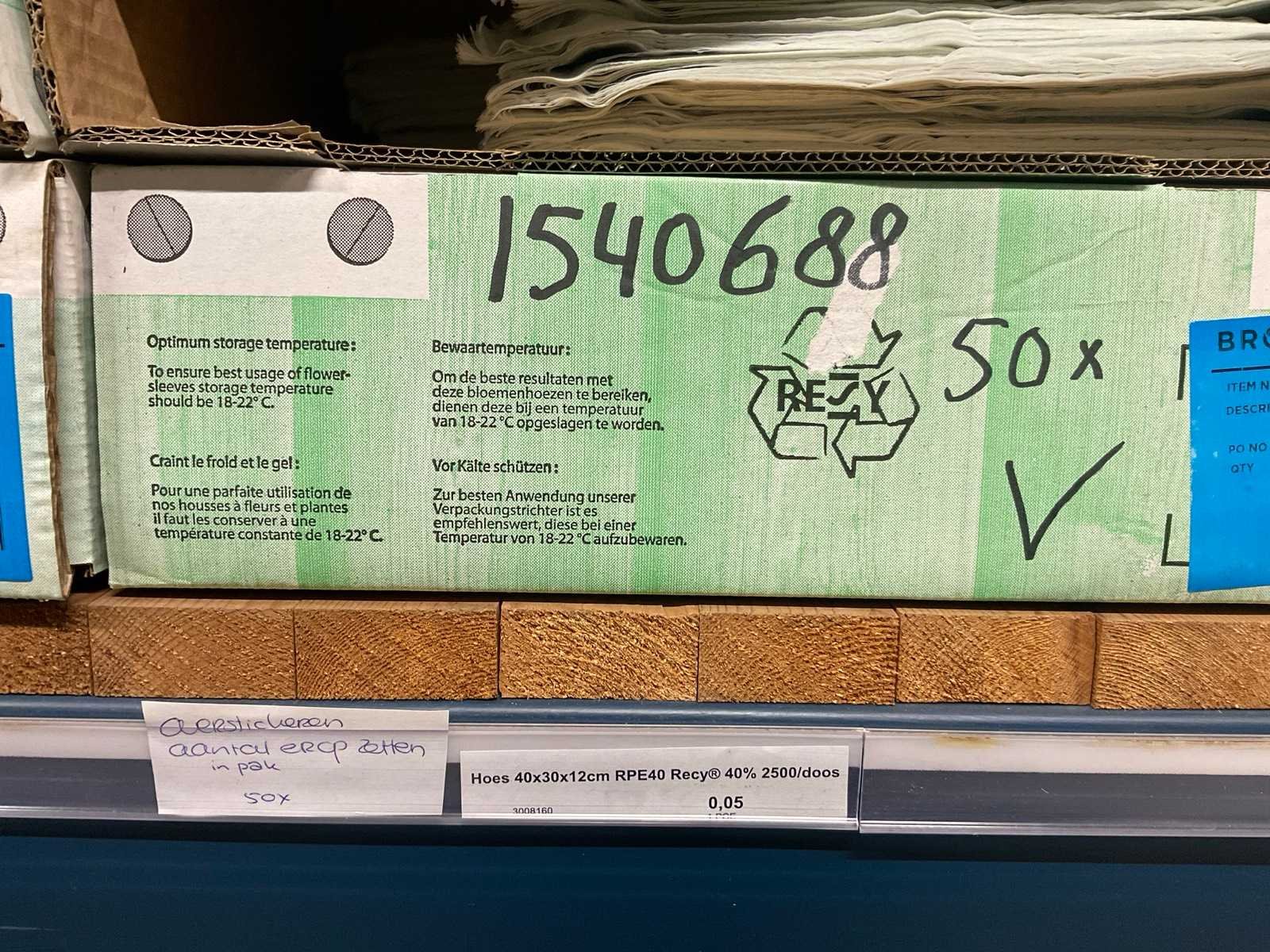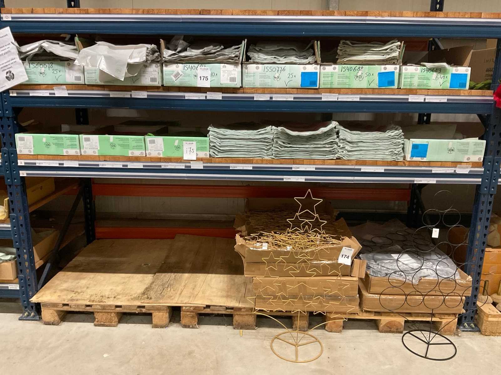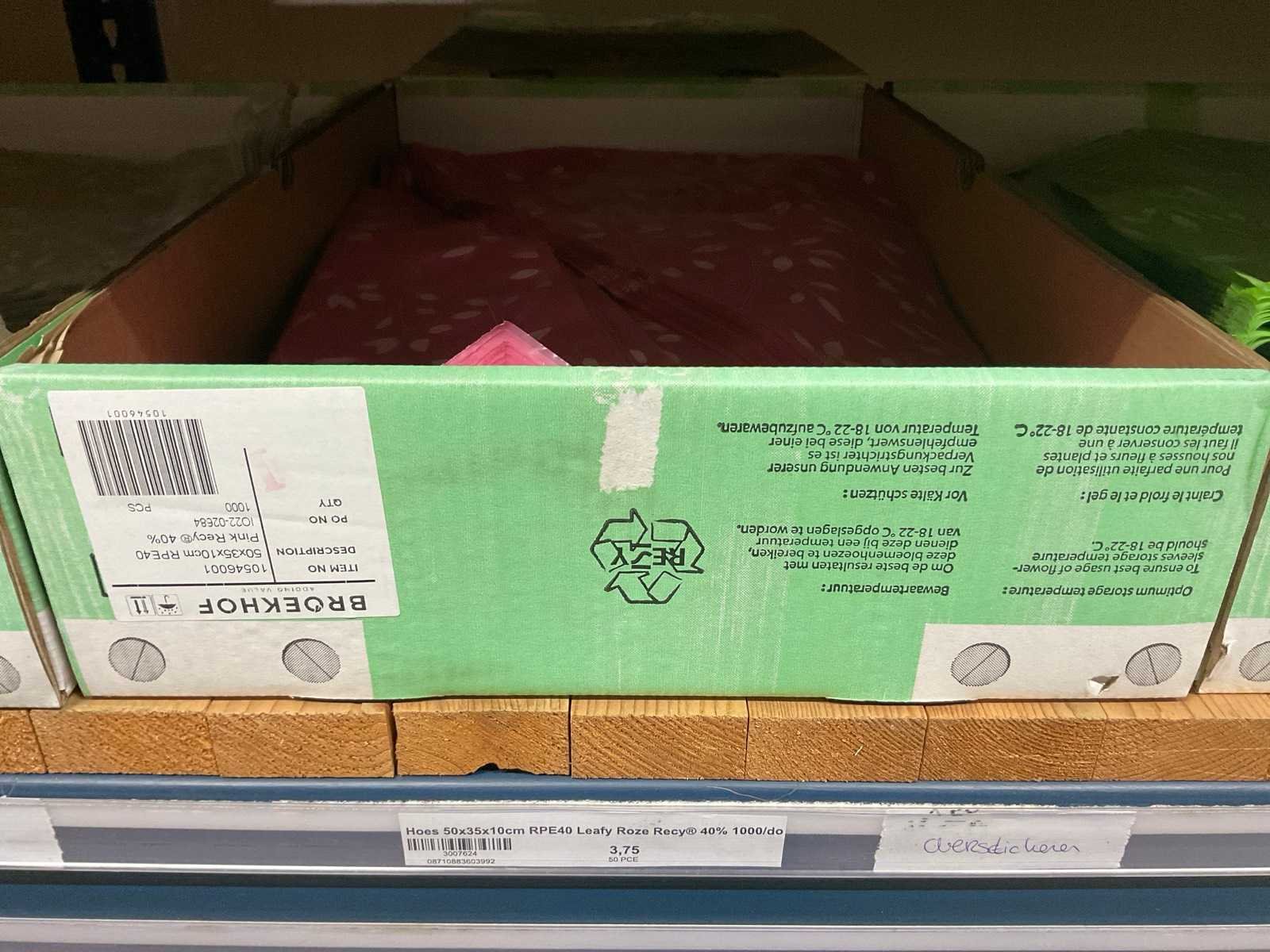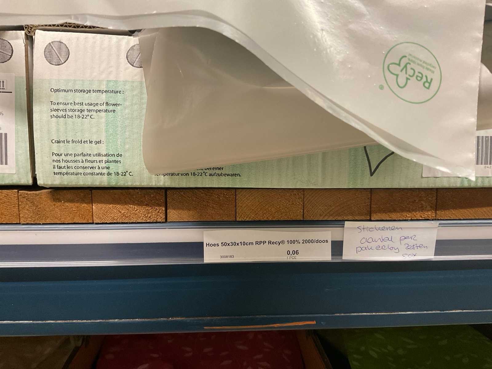 Bloemhoezen in diverse afmetingen met bedrukking, kwaliteit REP40 en RPE, inclusief metalen kerstbomen in goudkleur en zwart t.b.v. kerstballen, alles in 1 stellingsectie, stelling niet inbegrepen. Model: RPE40, RPP