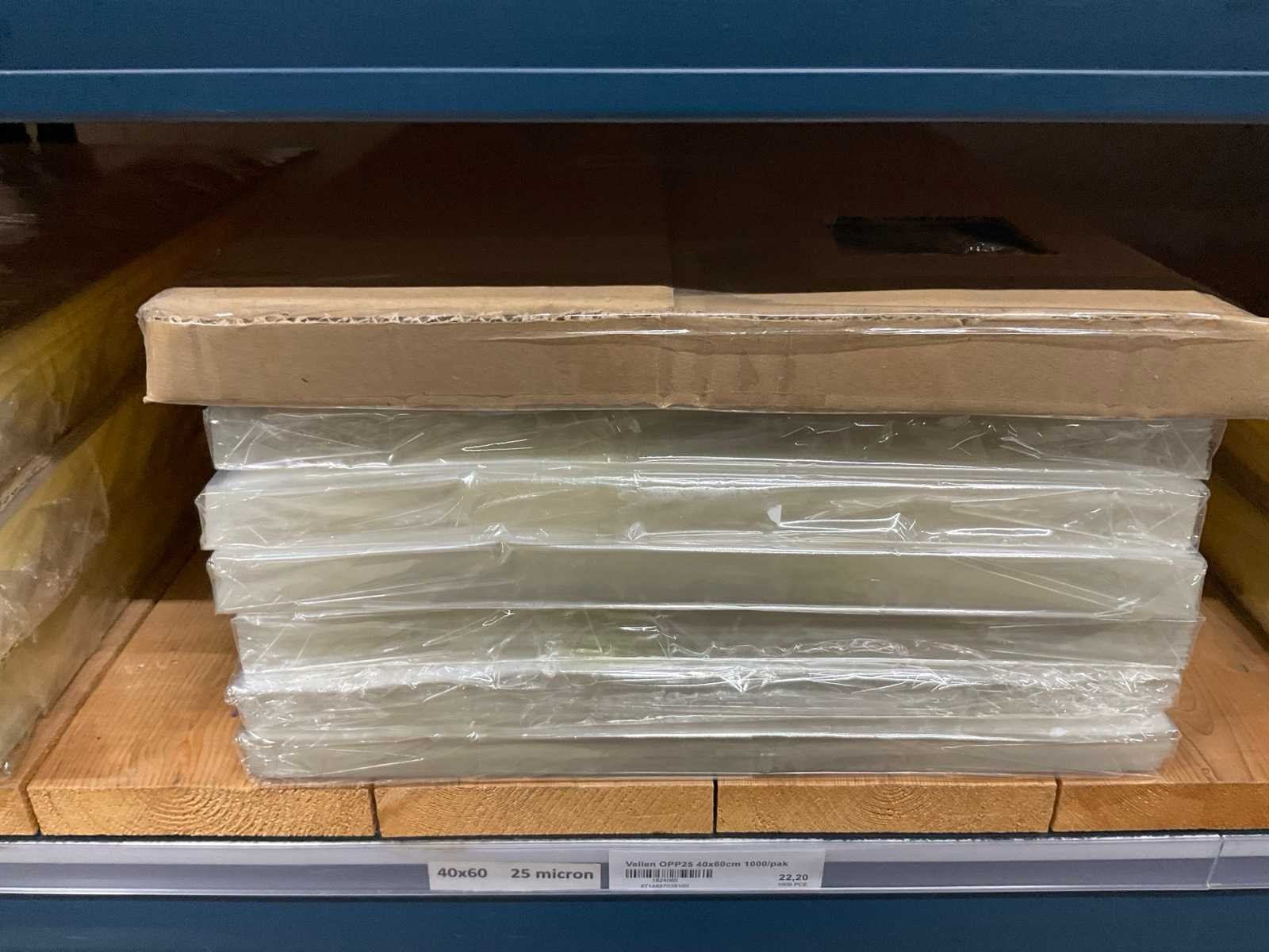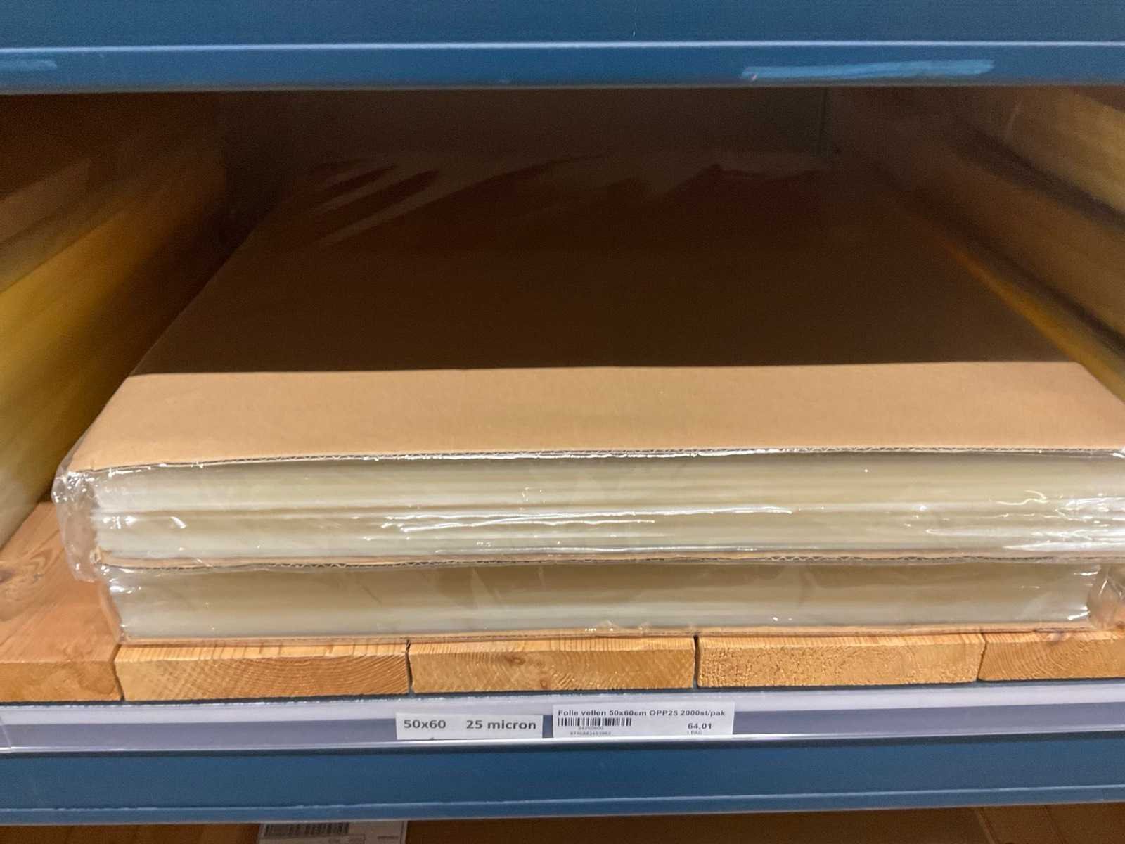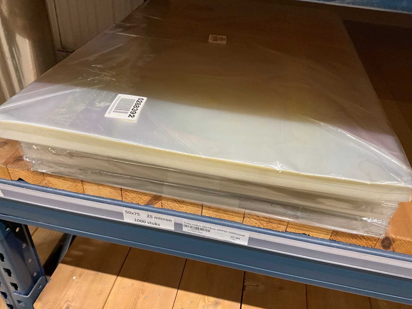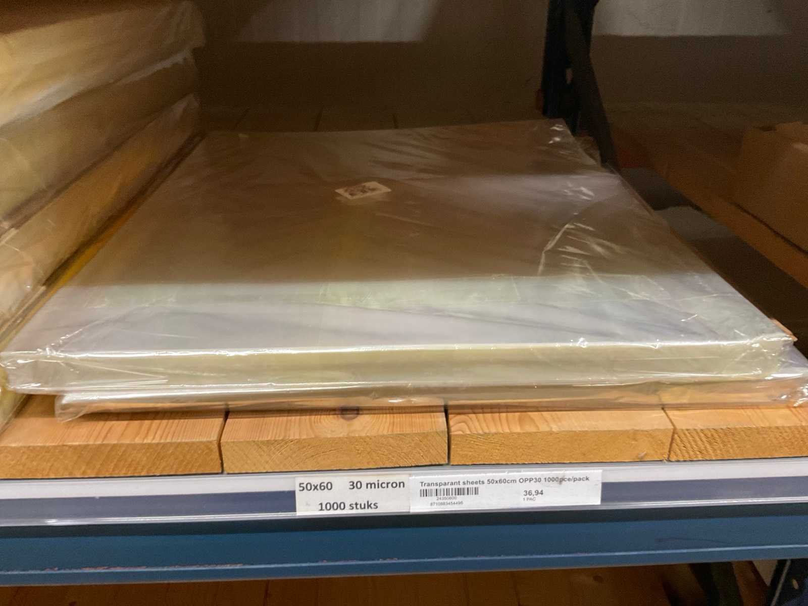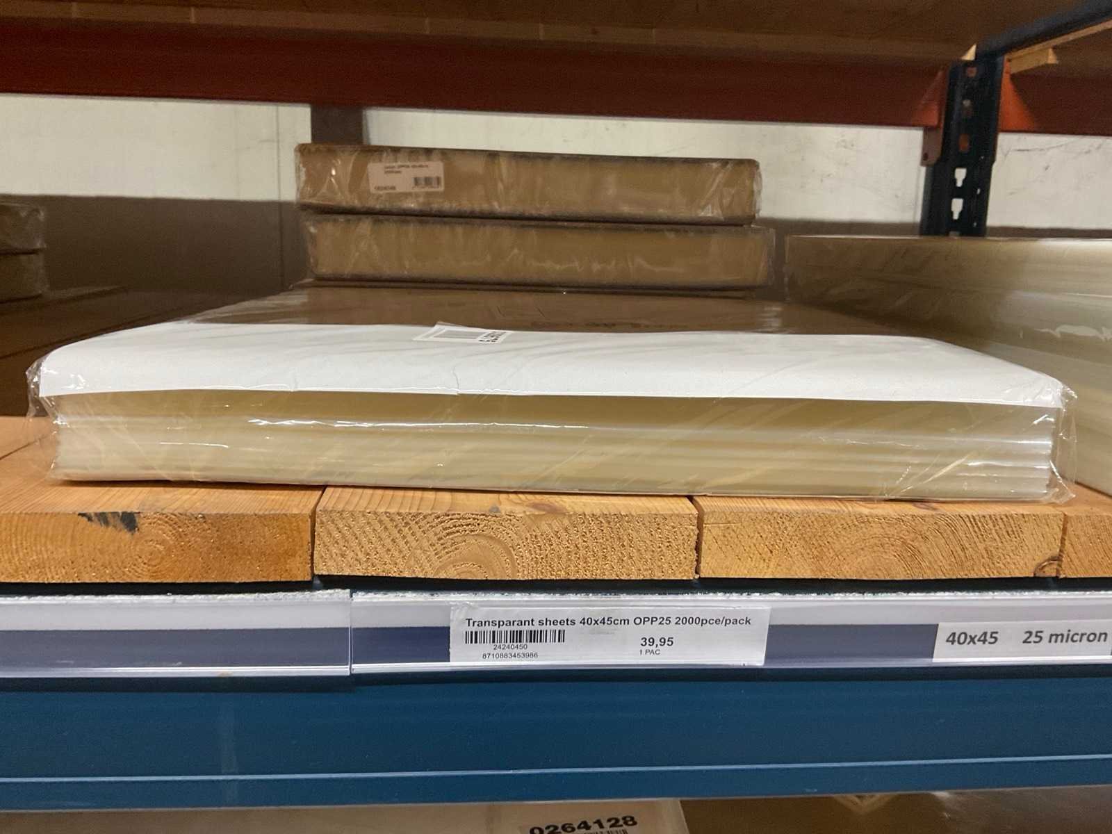 Folie vellen in diverse afmetingen, transparant, kwaliteit o.a. OPP25 en OPP30, alles in 1 stellingsectie, stelling niet inbegrepen. Model: OPP,