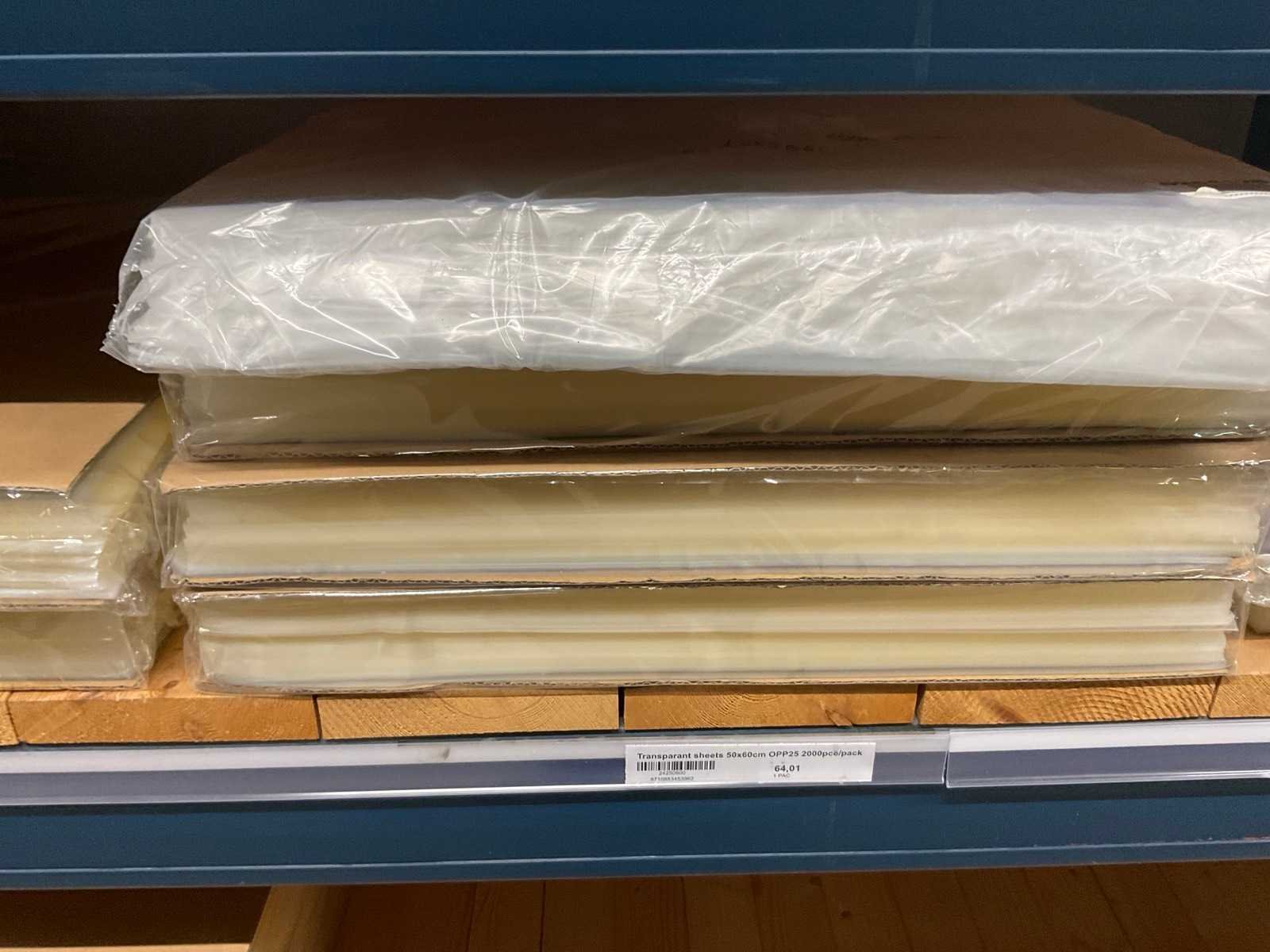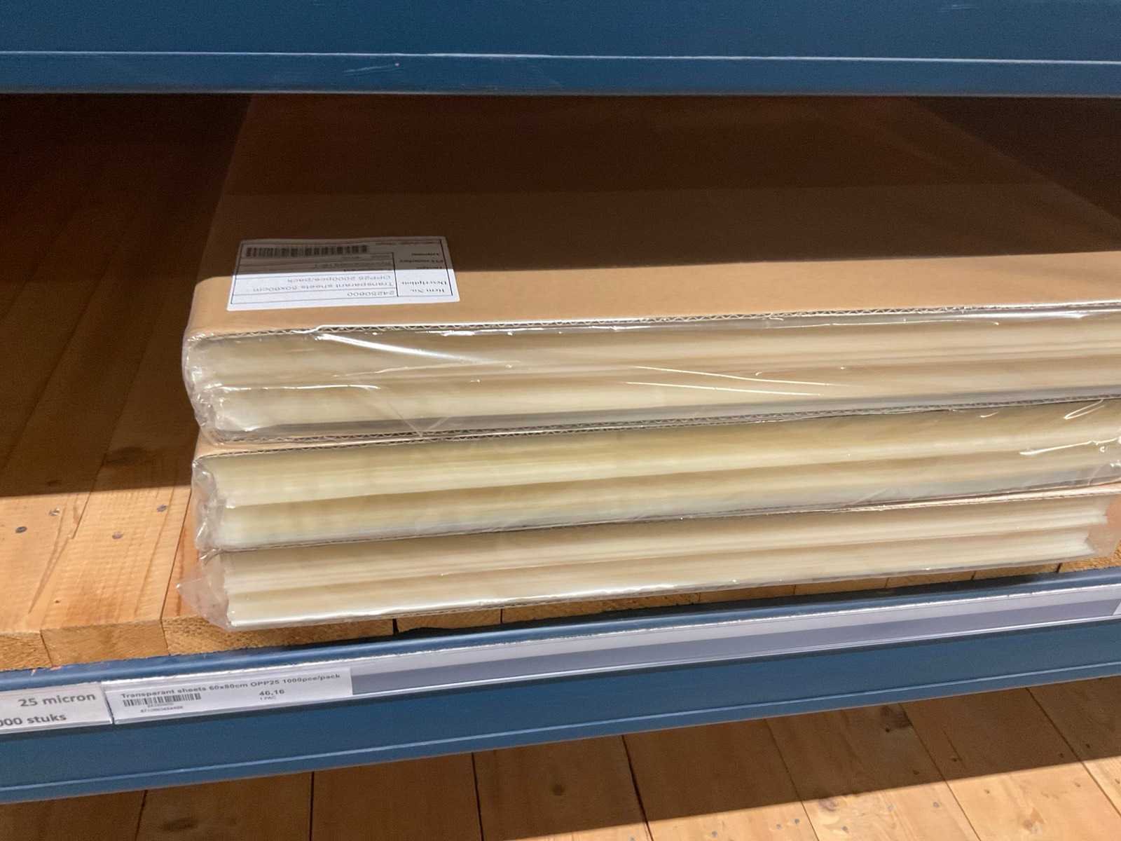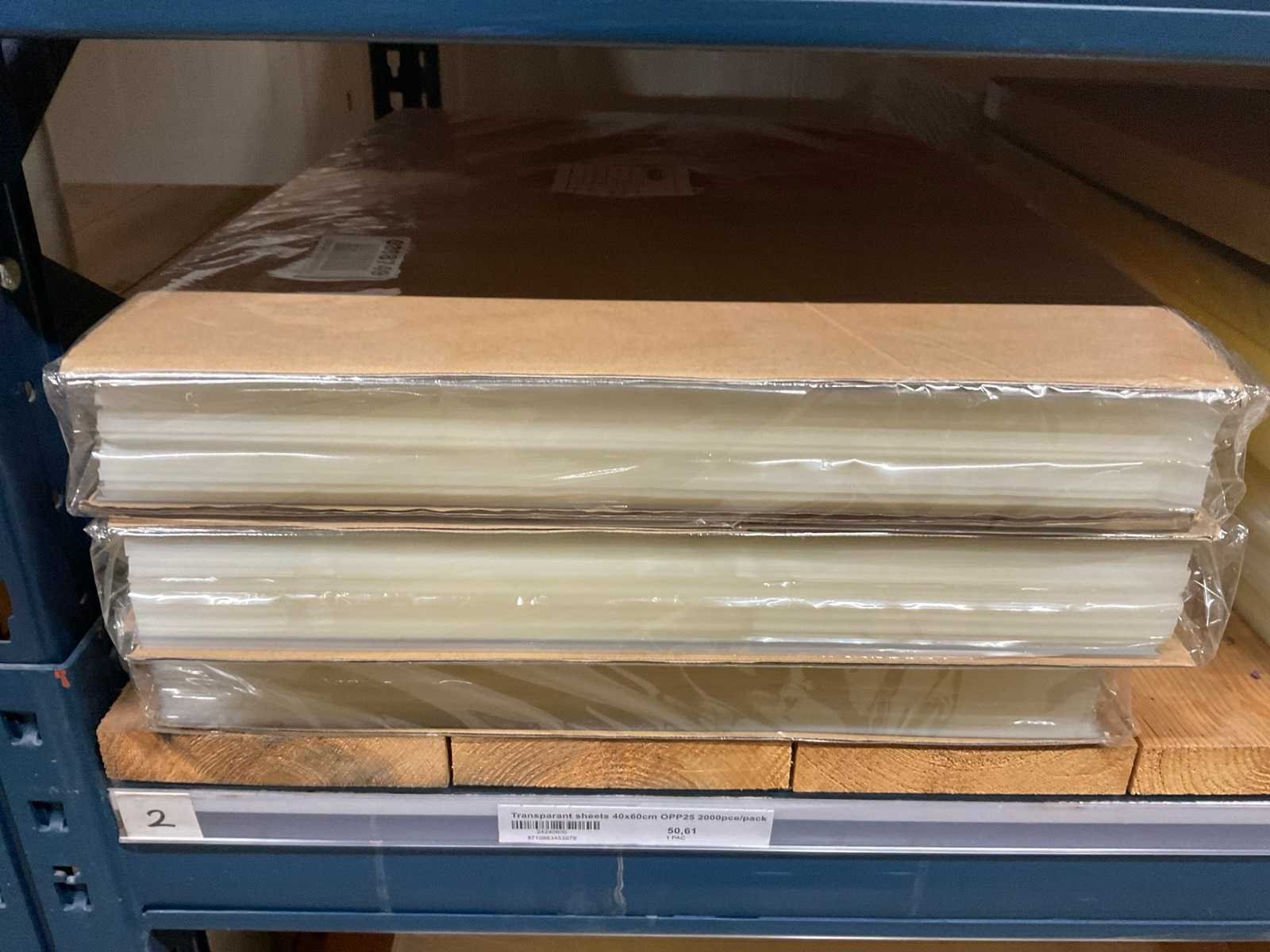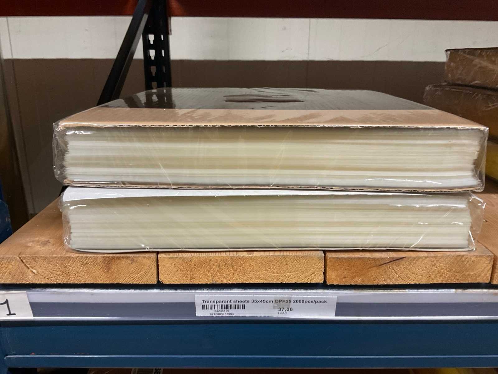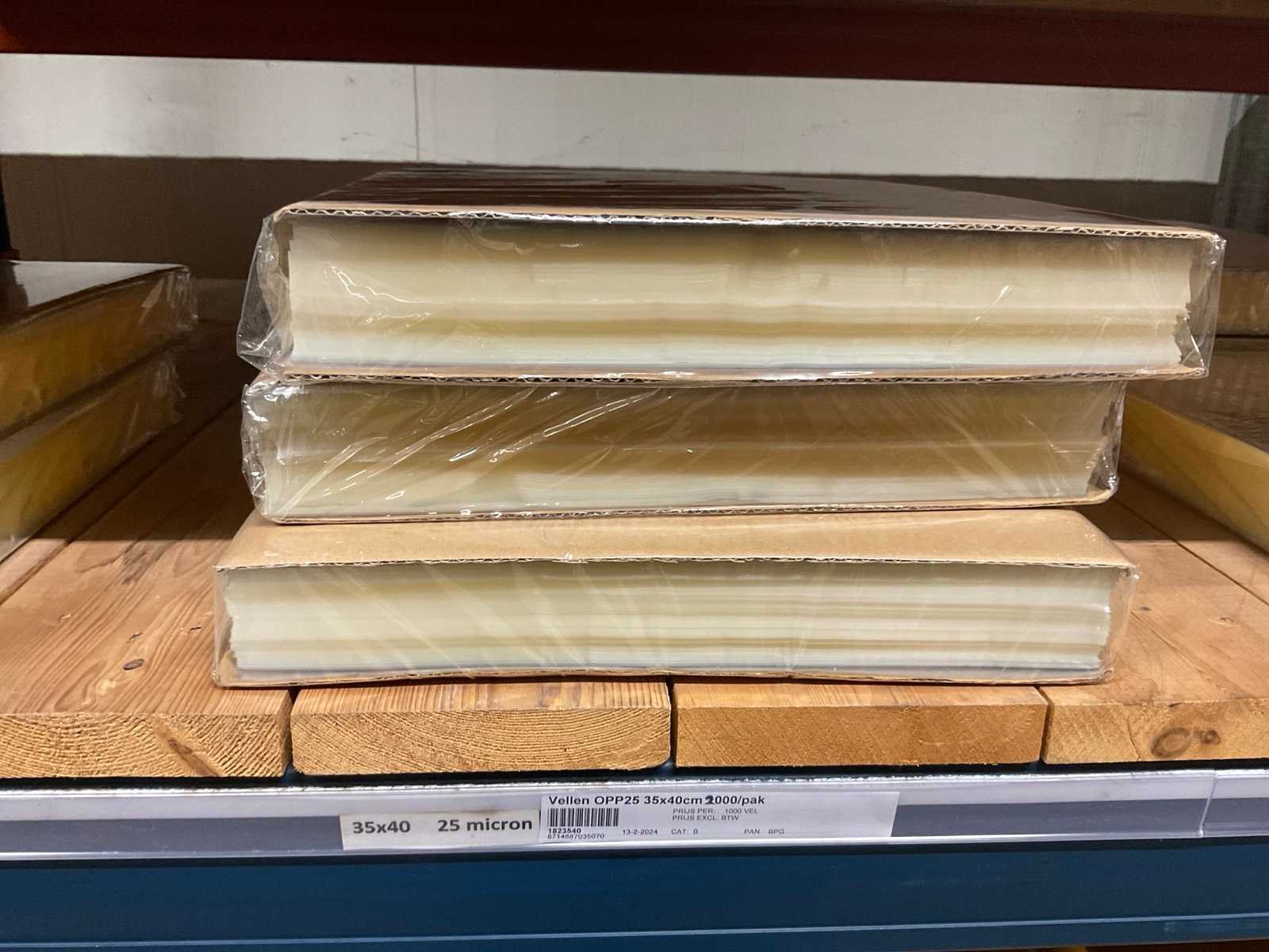 Folie vellen in diverse afmetingen, transparant, kwaliteit o.a. OPP25 en OPP30, alles in 1 stellingsectie, stelling niet inbegrepen. Model: OPP,