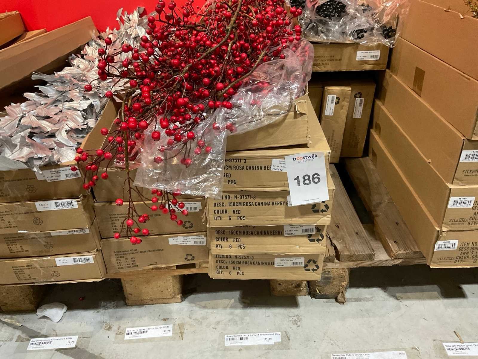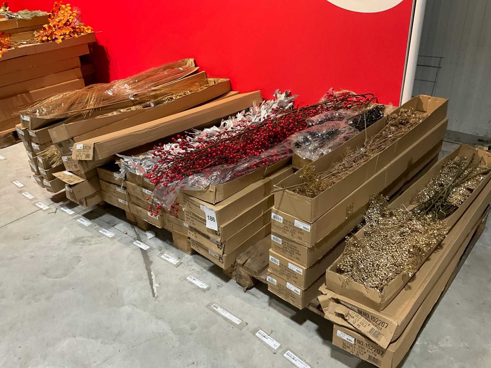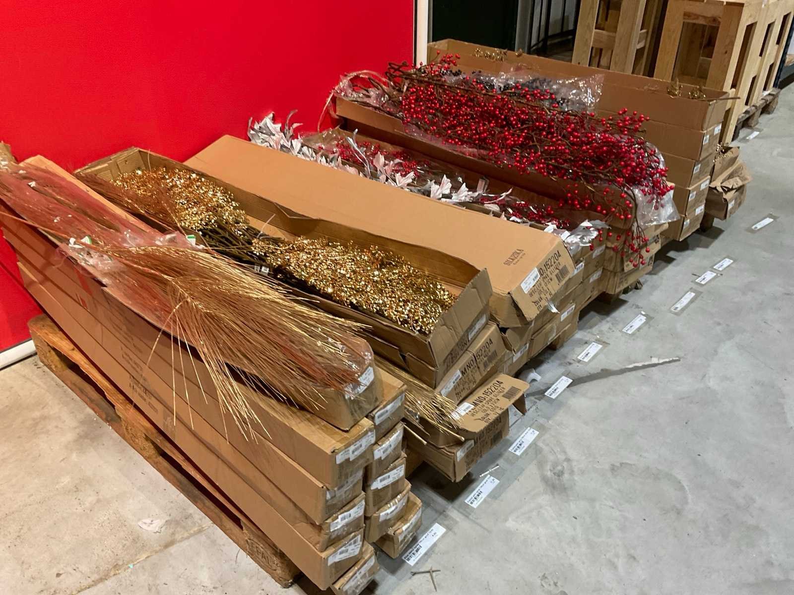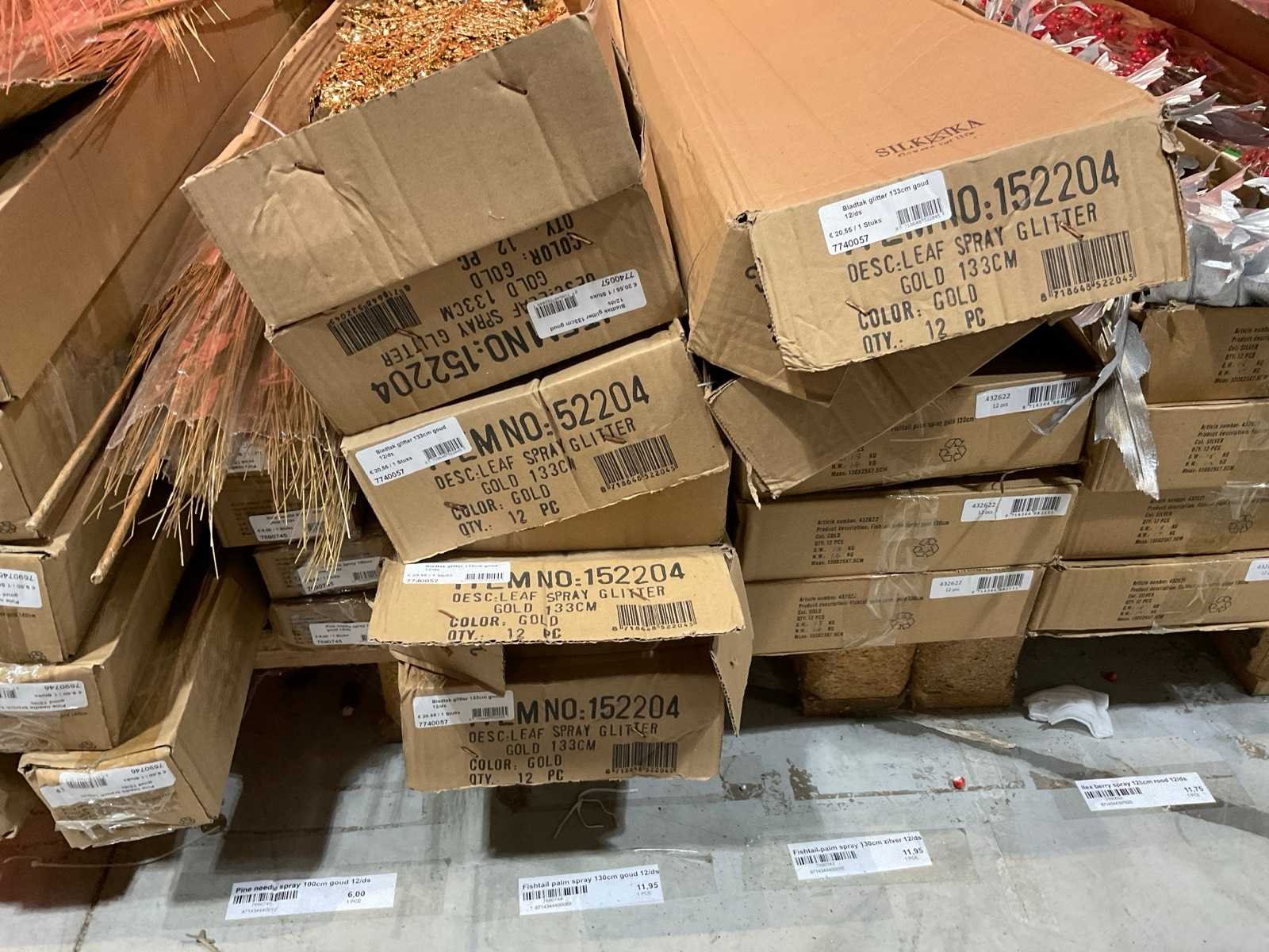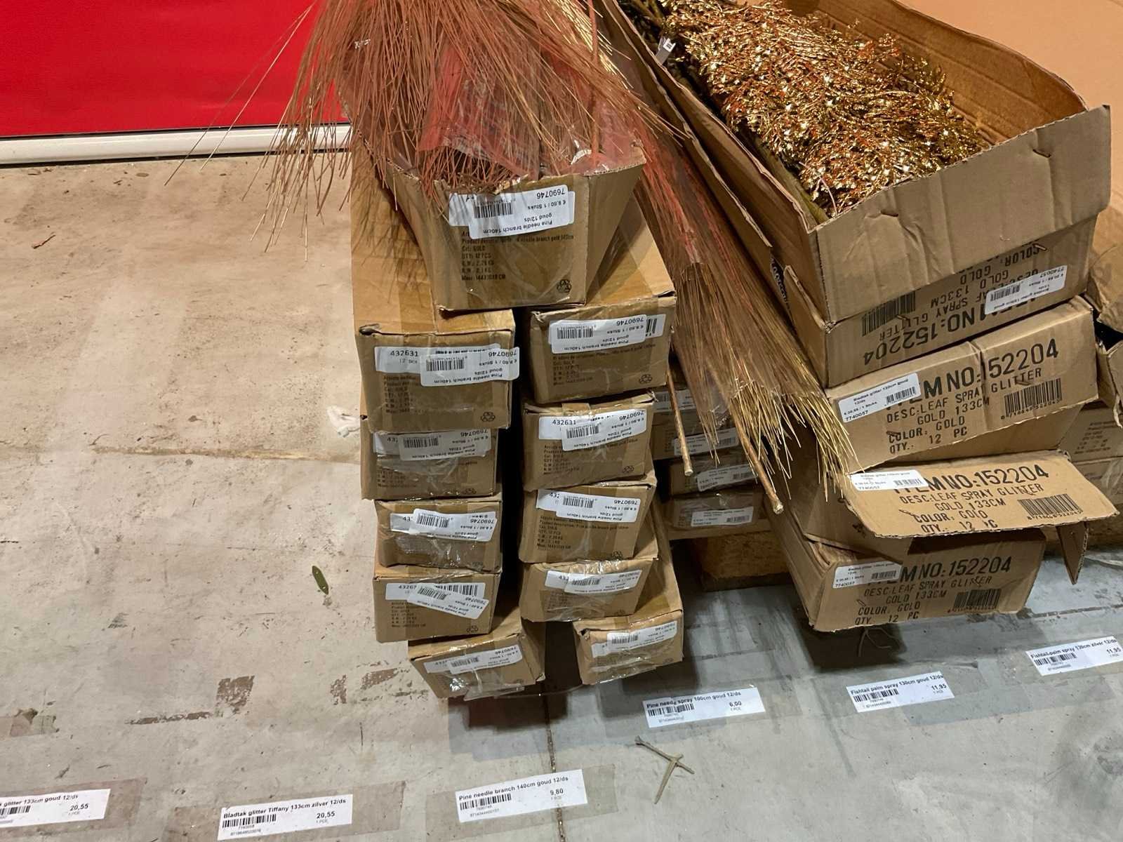Inhoud op 3 pallets, bestaande o.a. uit Dille, glittertakken. Inclusief pallets. Merk: Silka en Emerald