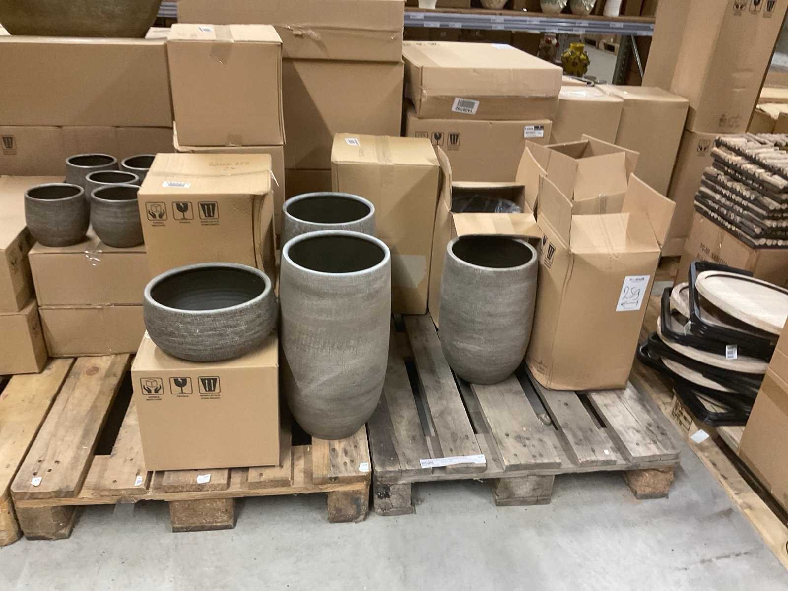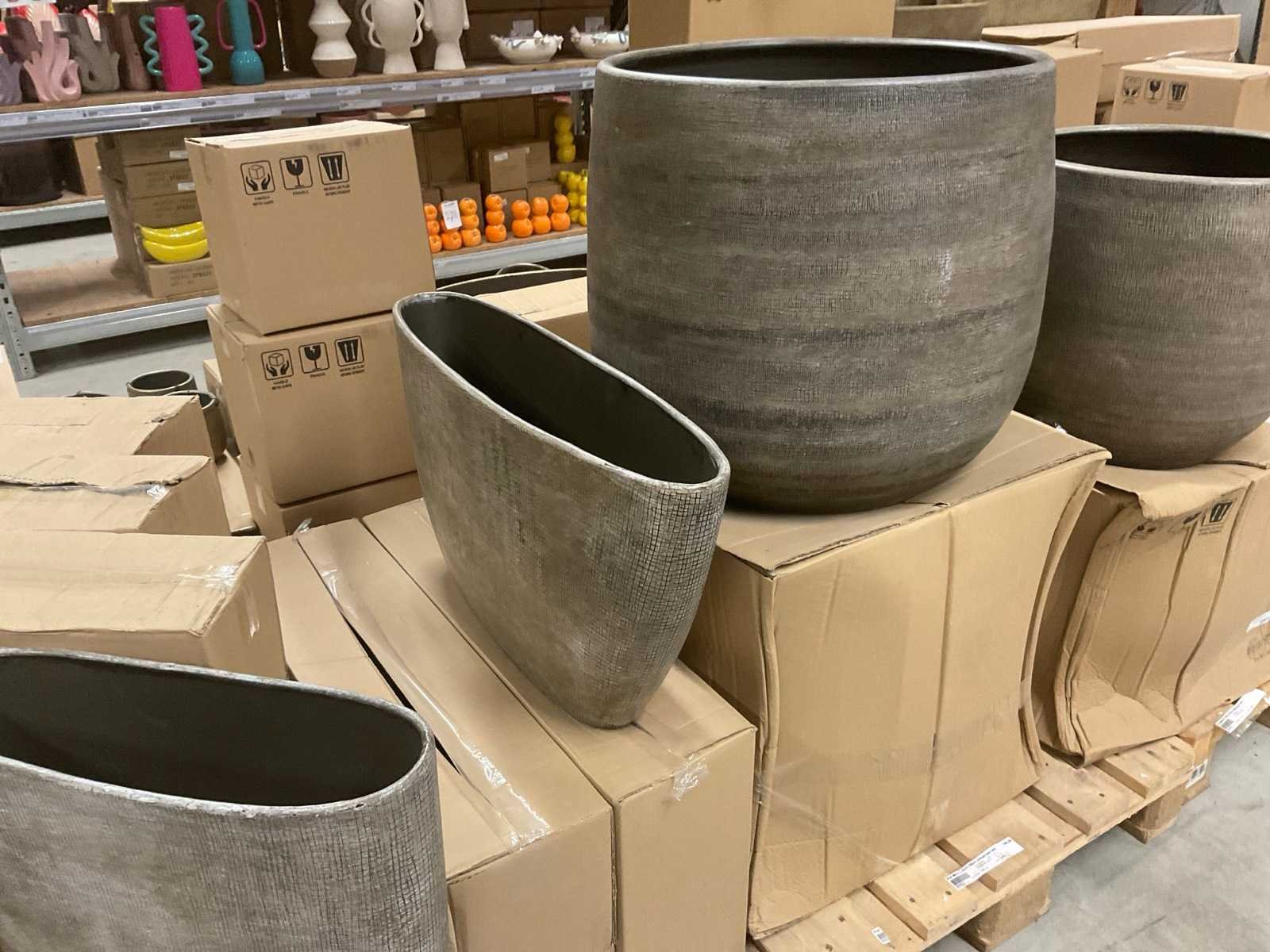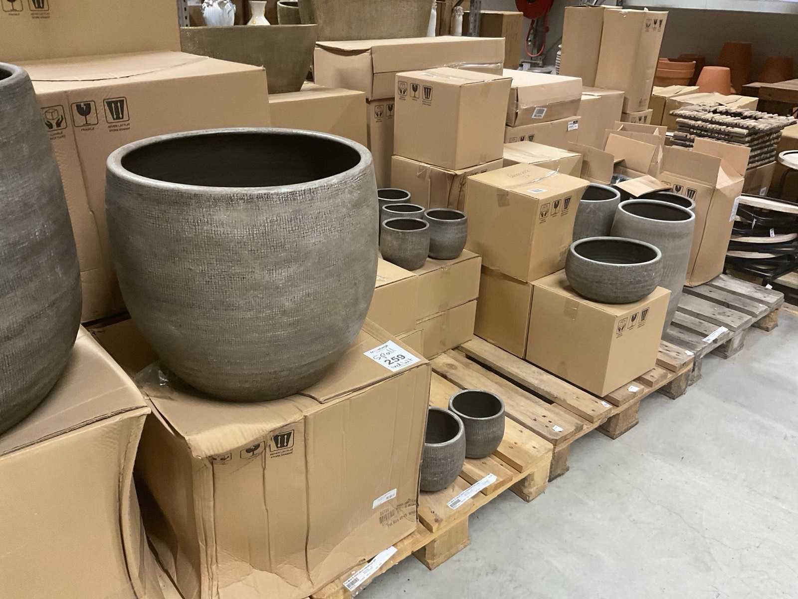 Inhoud op 5 pallets, bestaande uit bloempotten van 16 tot 57 cm hoog, inclusief pallets.