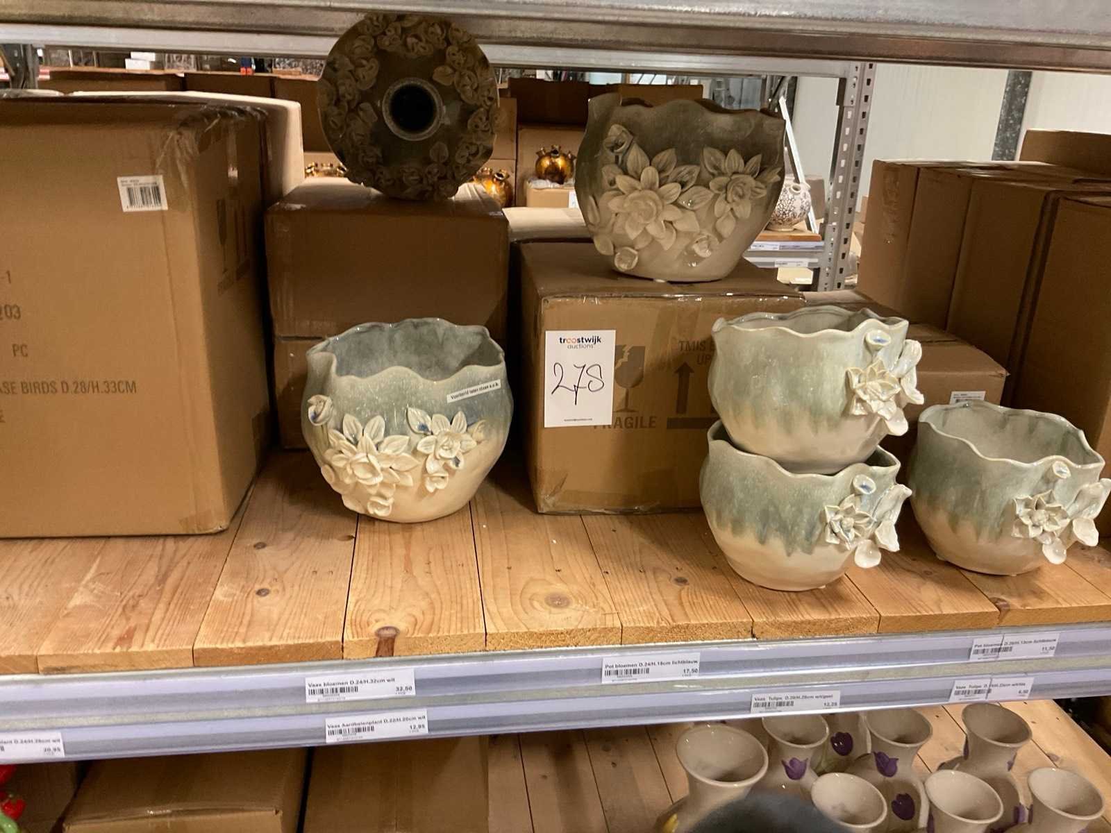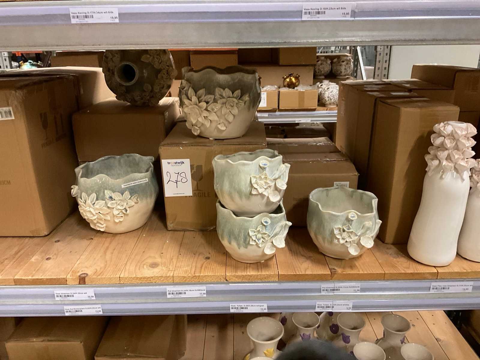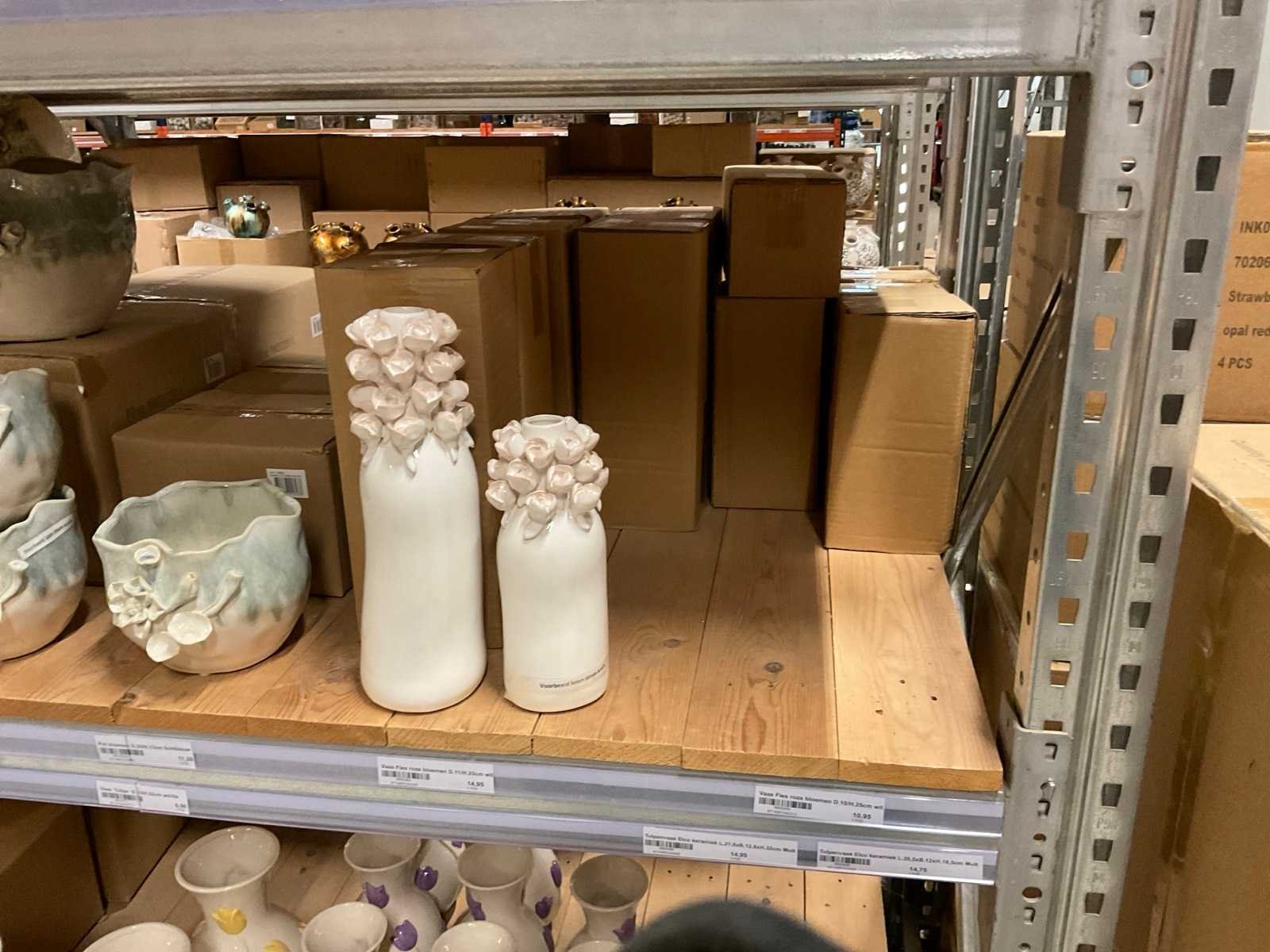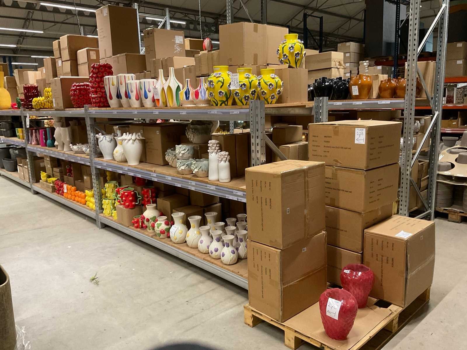 Inhoud van 1 zijde van stelling en pallet bestaande uit diverse vazen en bloempotten, inclusief pallet, stellig niet inbegrepen.
