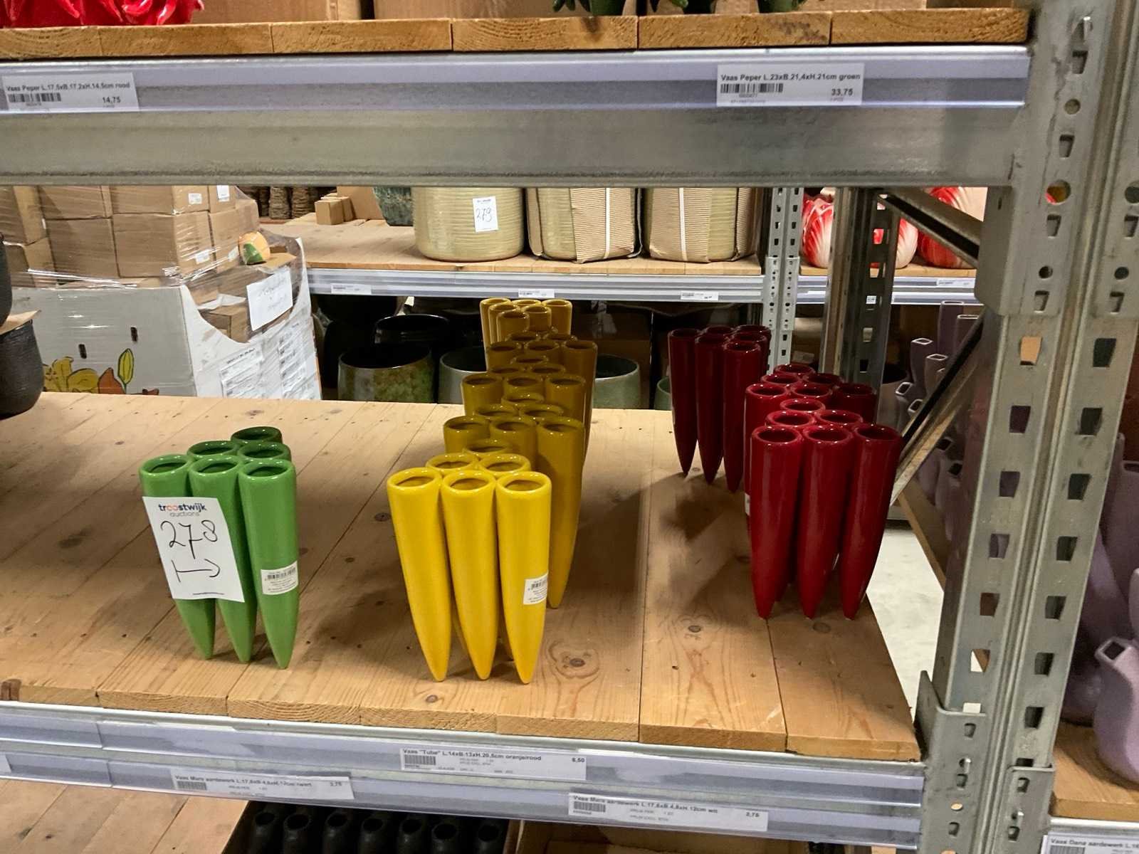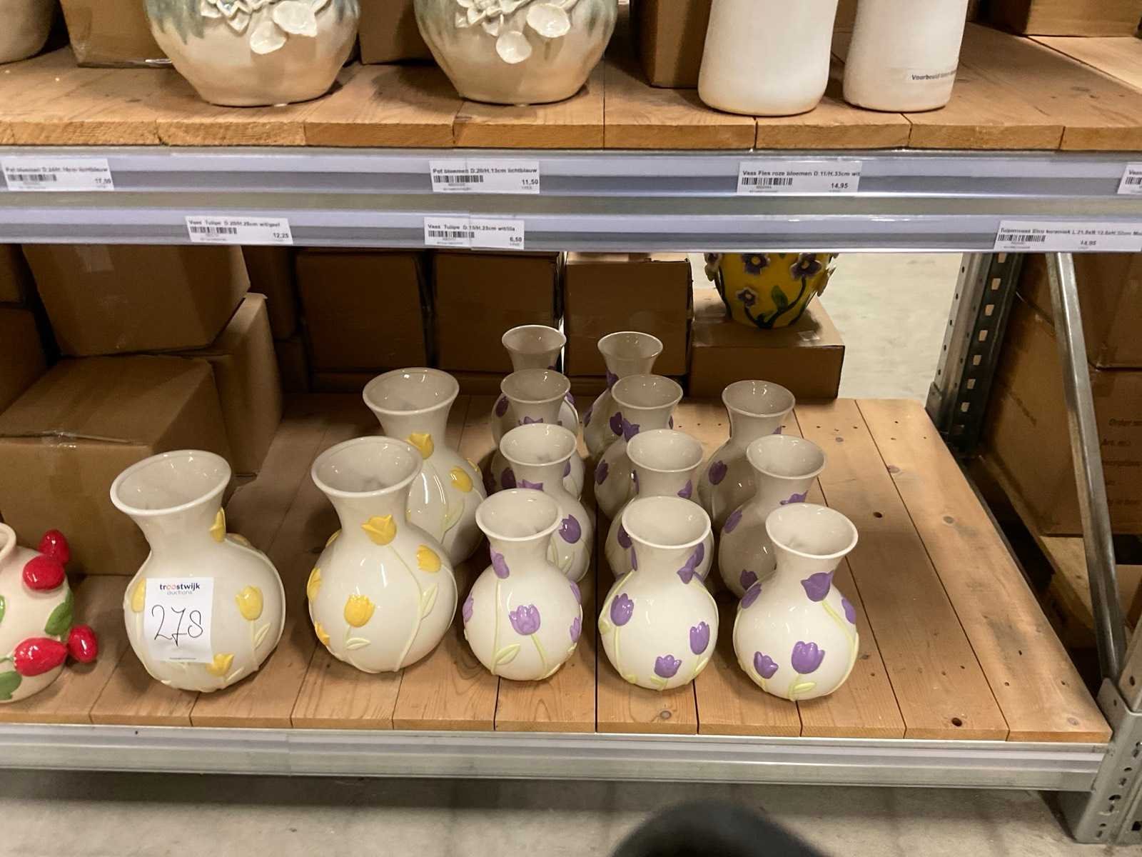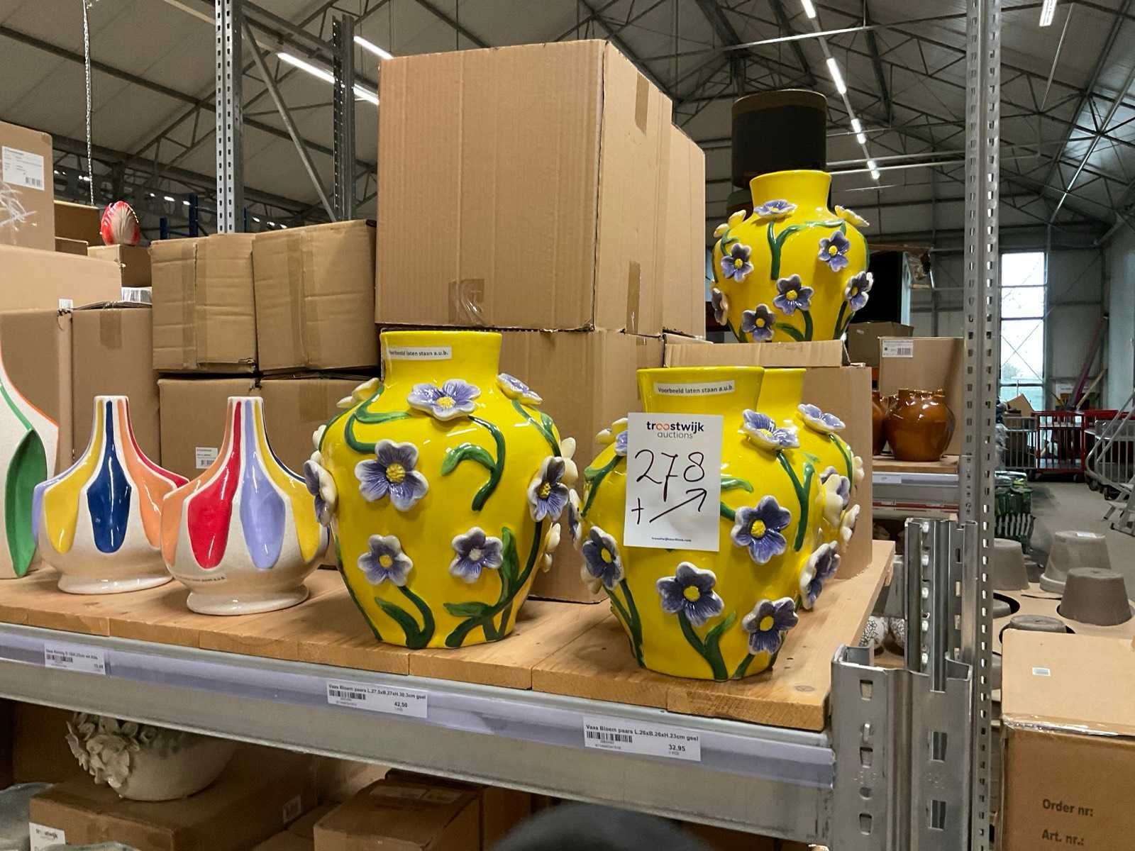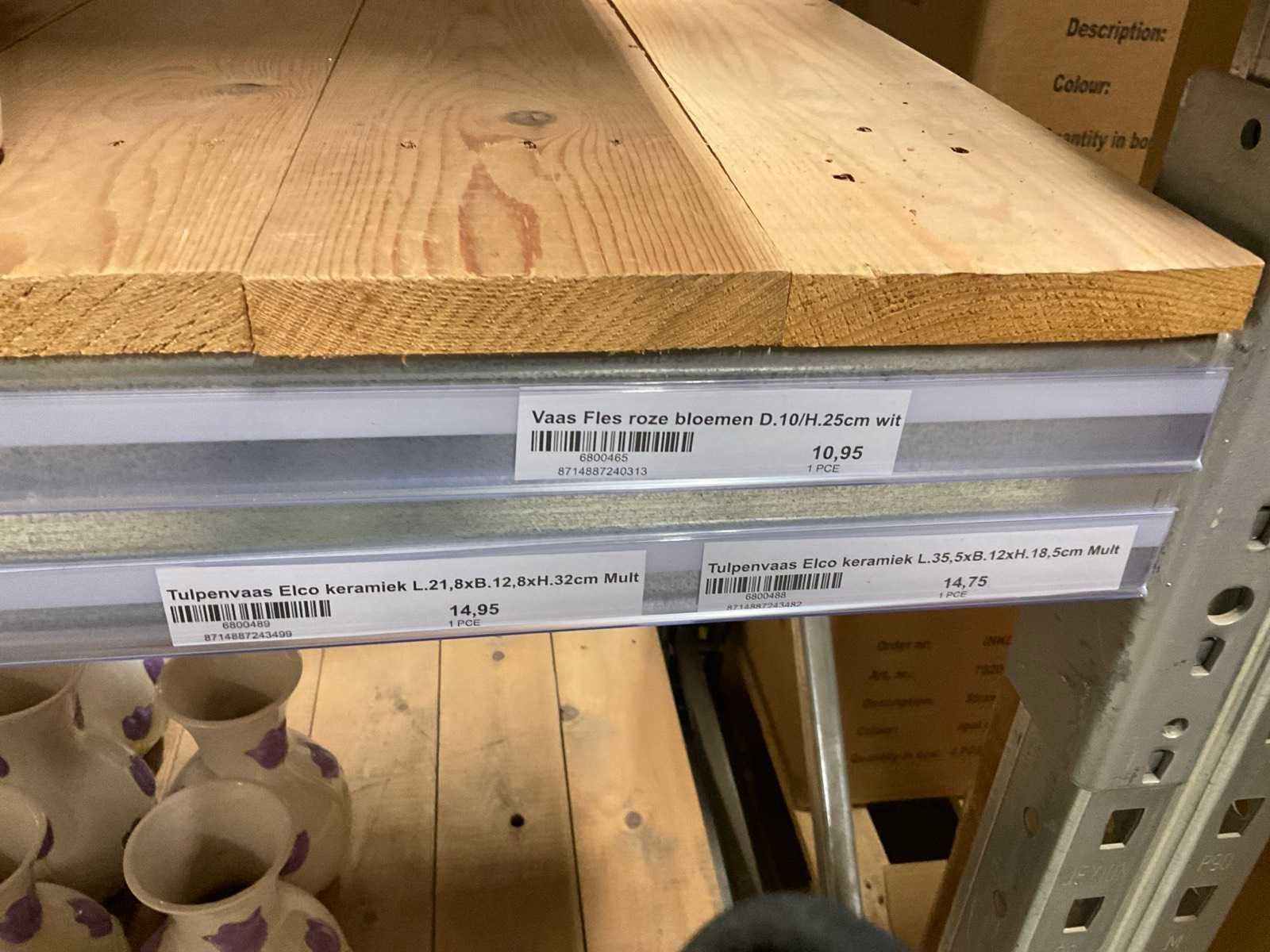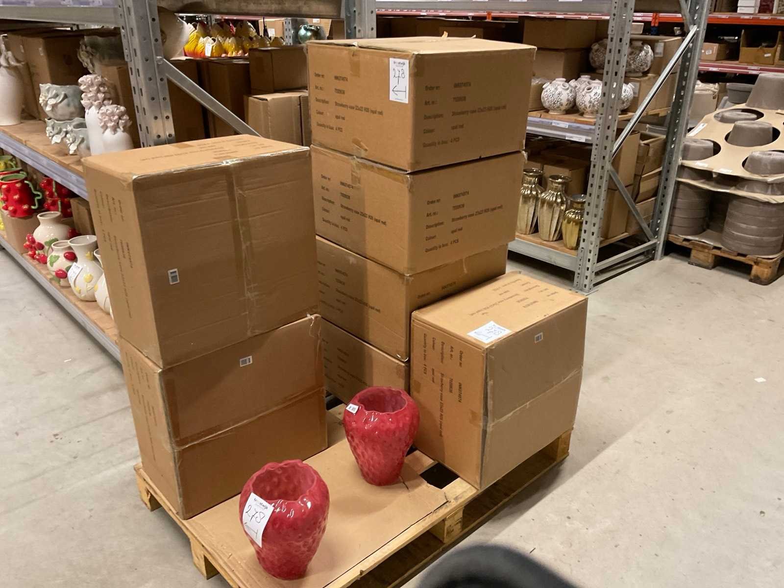 Inhoud van 1 zijde van stelling en pallet bestaande uit diverse vazen en bloempotten, inclusief pallet, stellig niet inbegrepen.