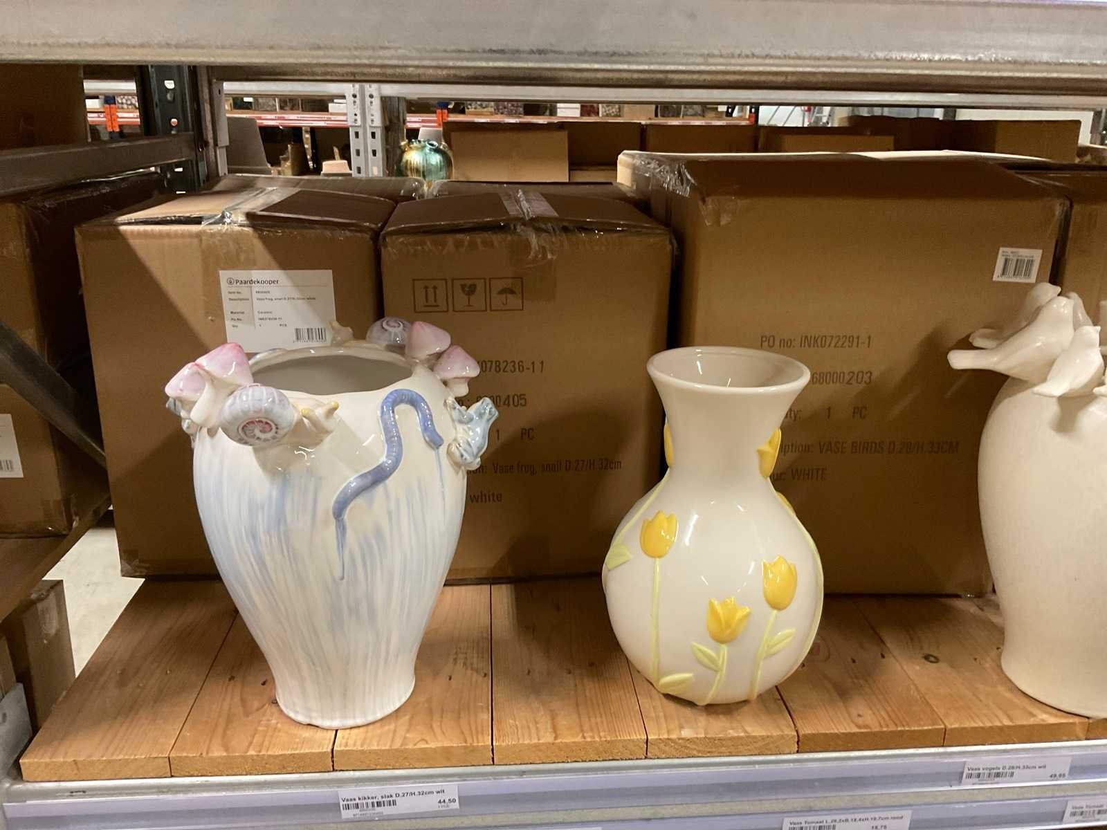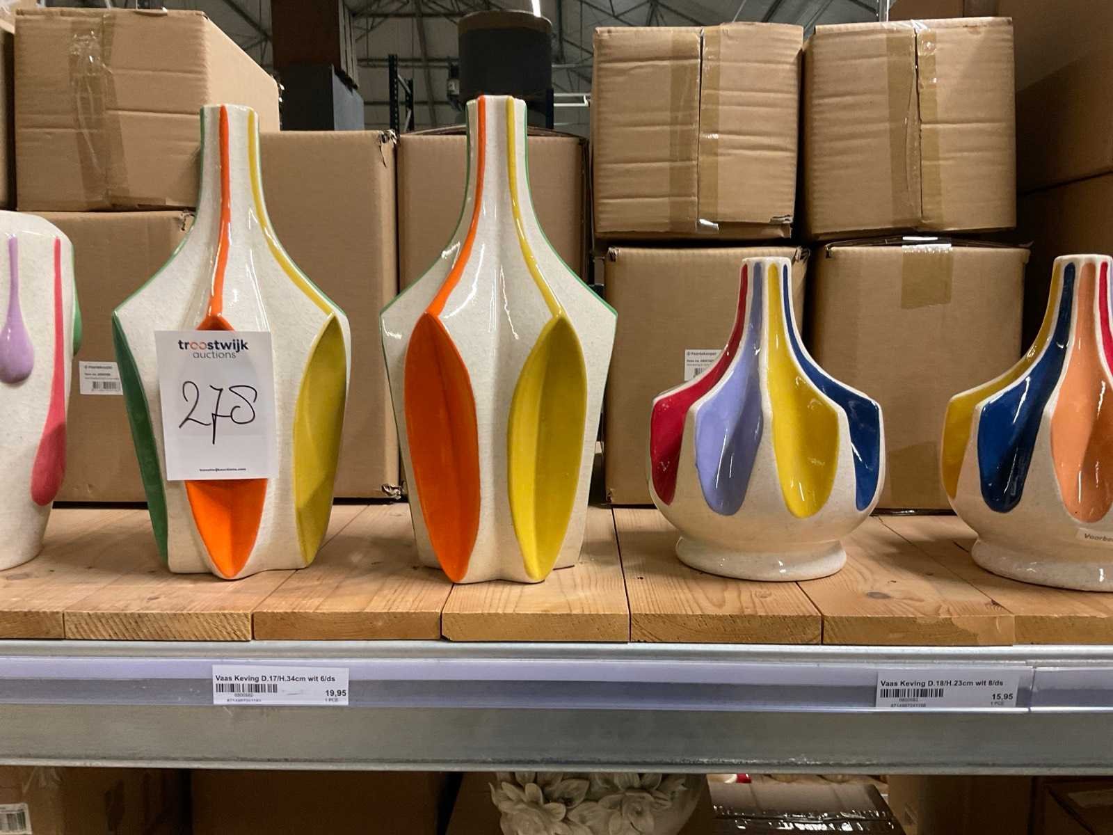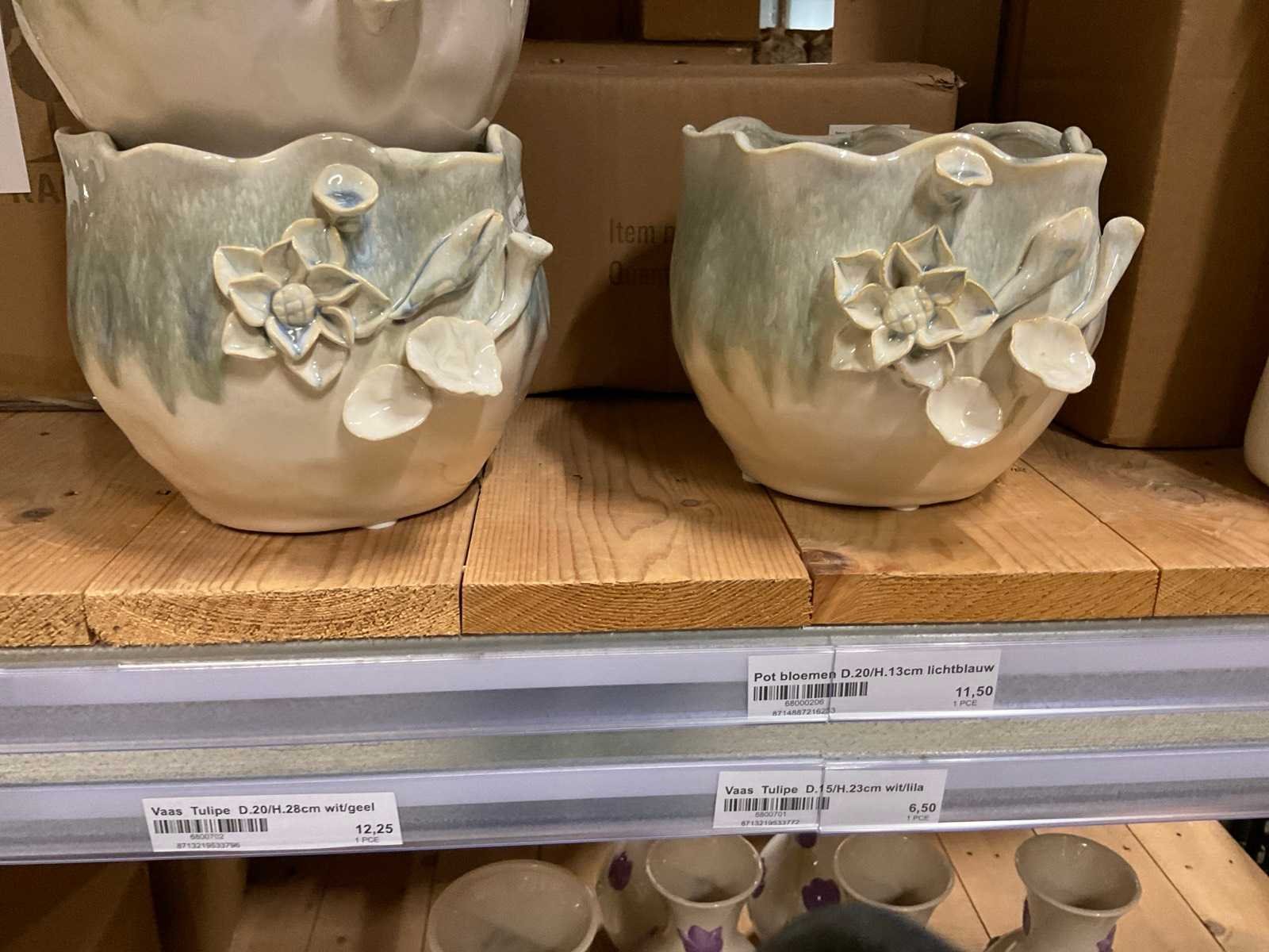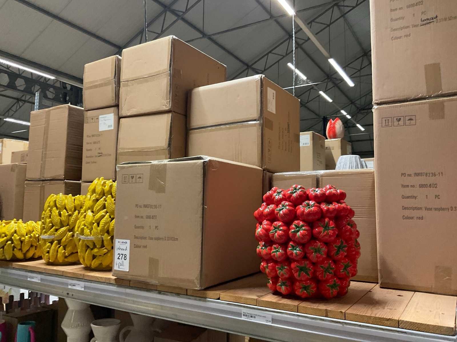 Inhoud van 1 zijde van stelling en pallet bestaande uit diverse vazen en bloempotten, inclusief pallet, stellig niet inbegrepen.
