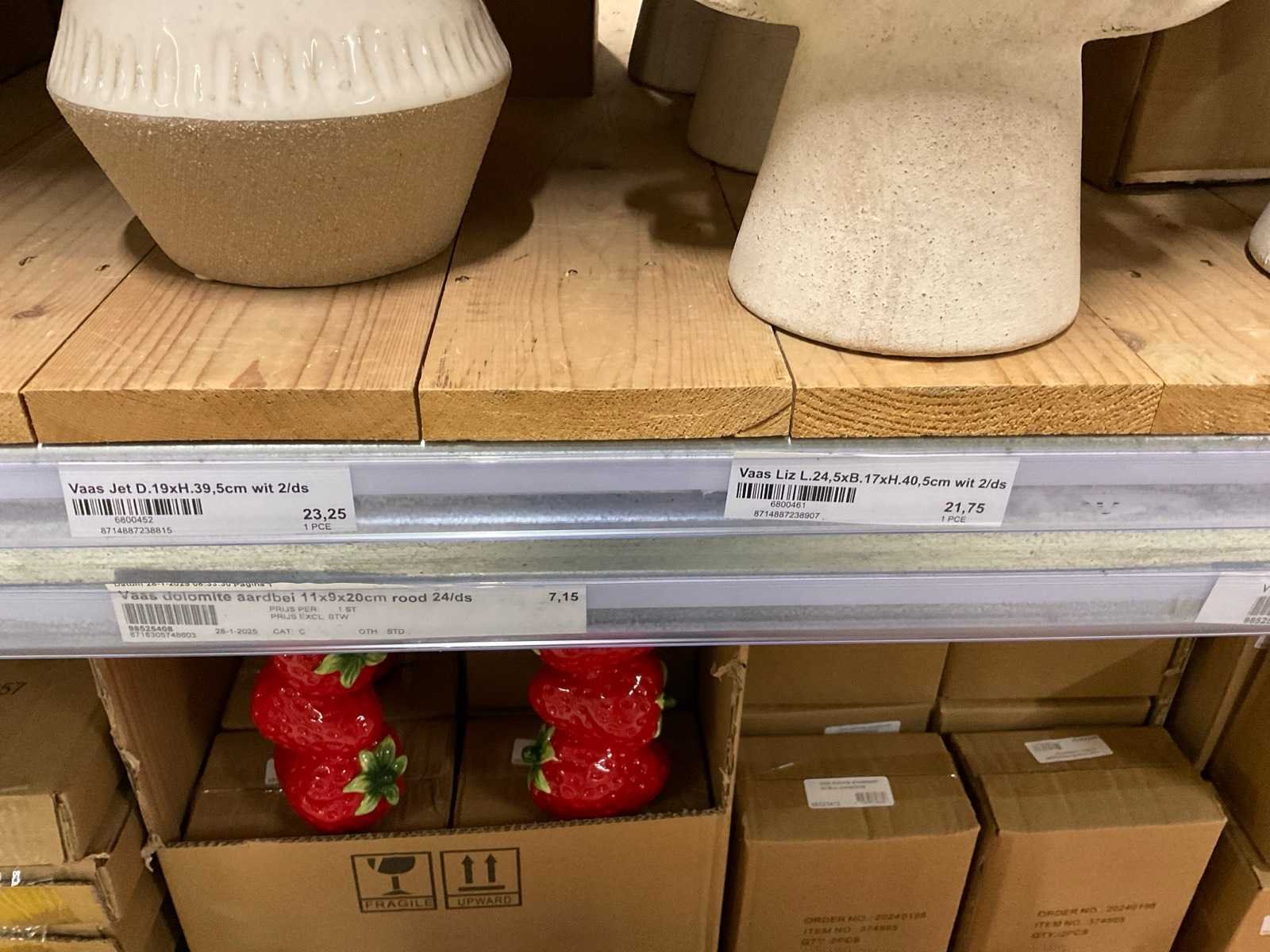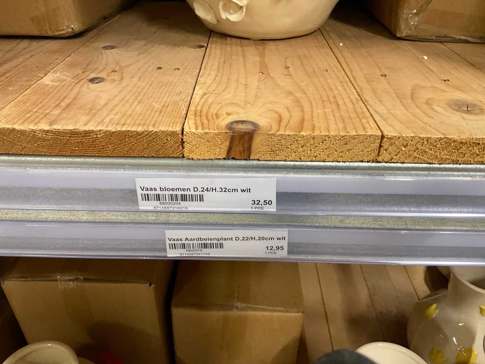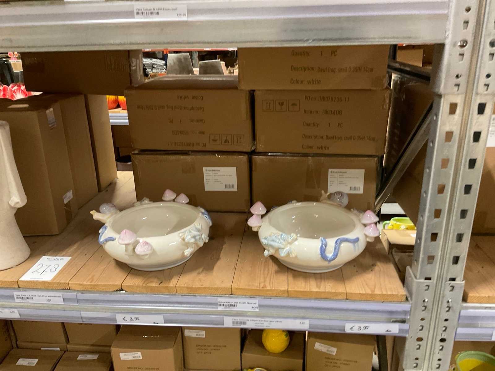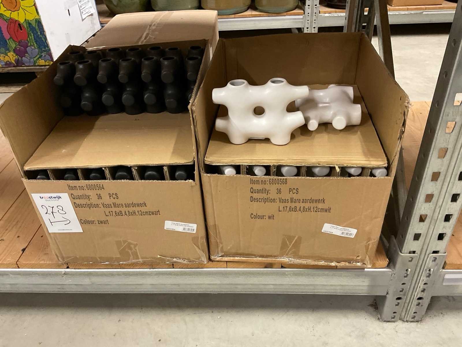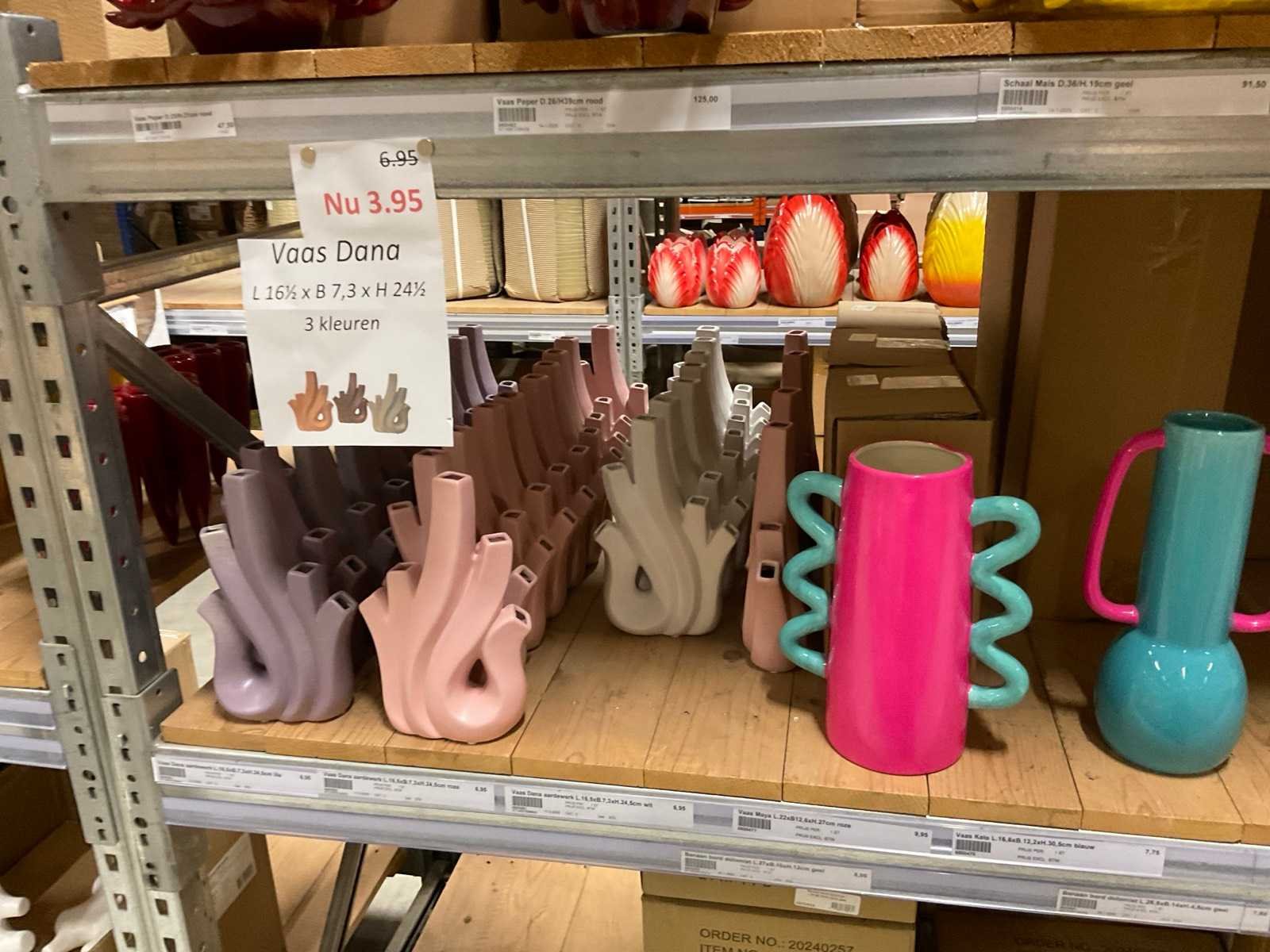 Inhoud van 1 zijde van stelling en pallet bestaande uit diverse vazen en bloempotten, inclusief pallet, stellig niet inbegrepen.