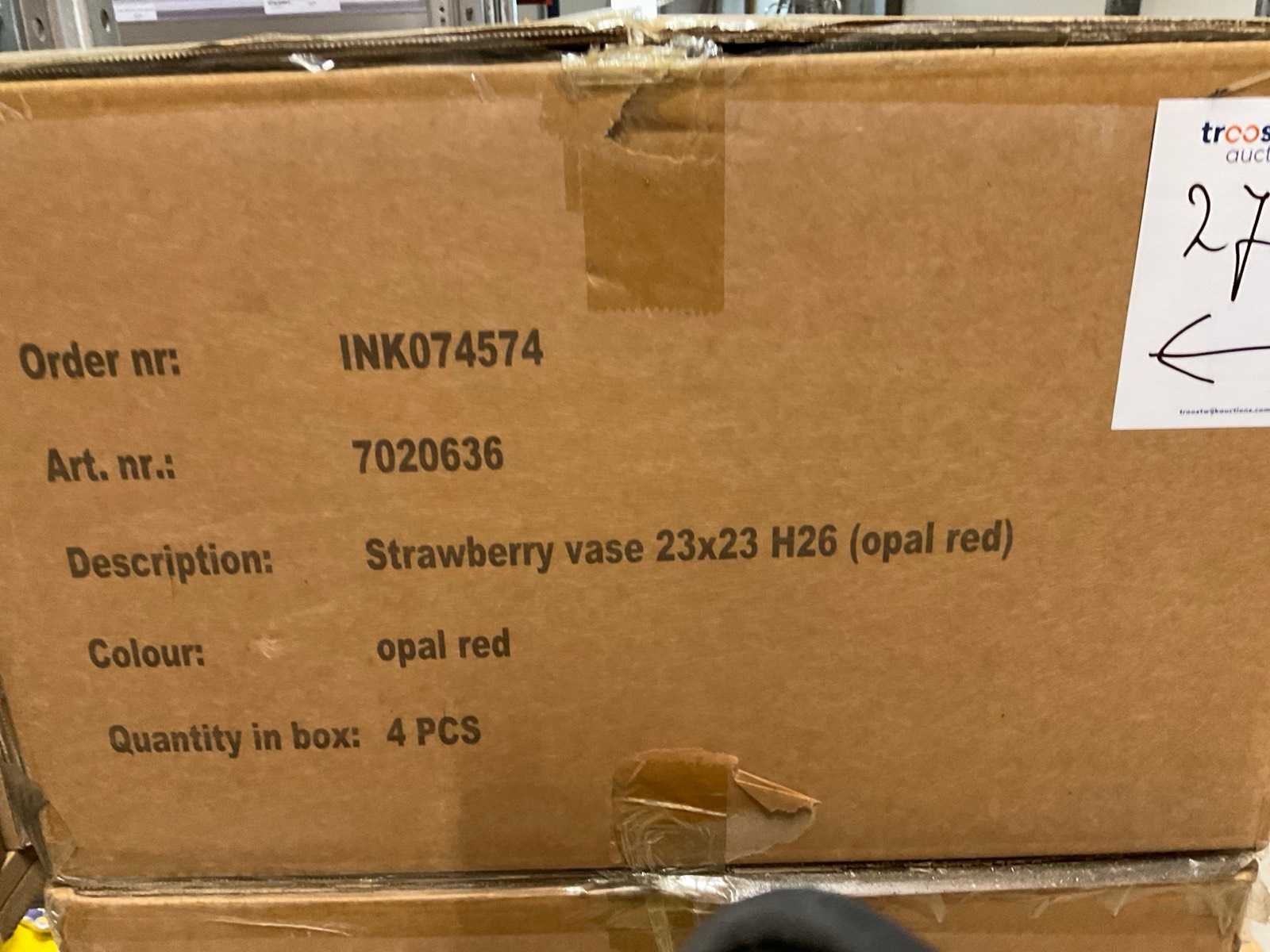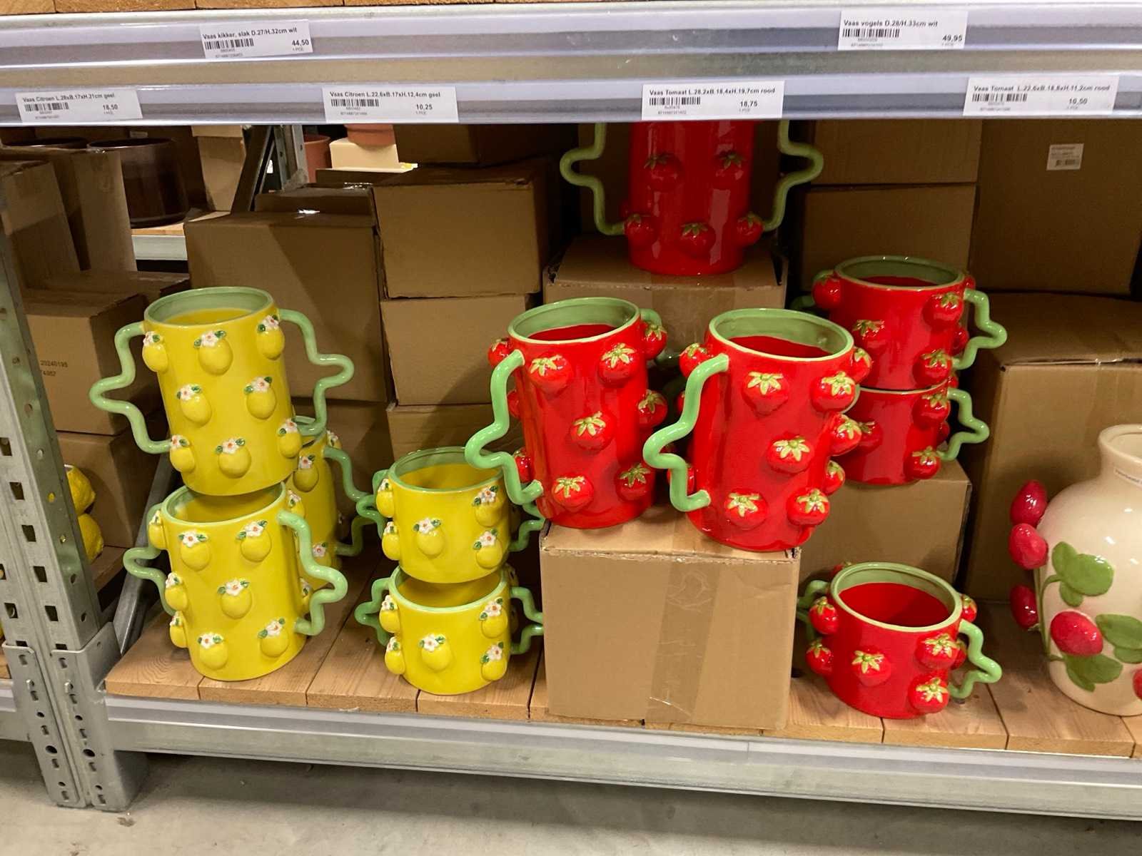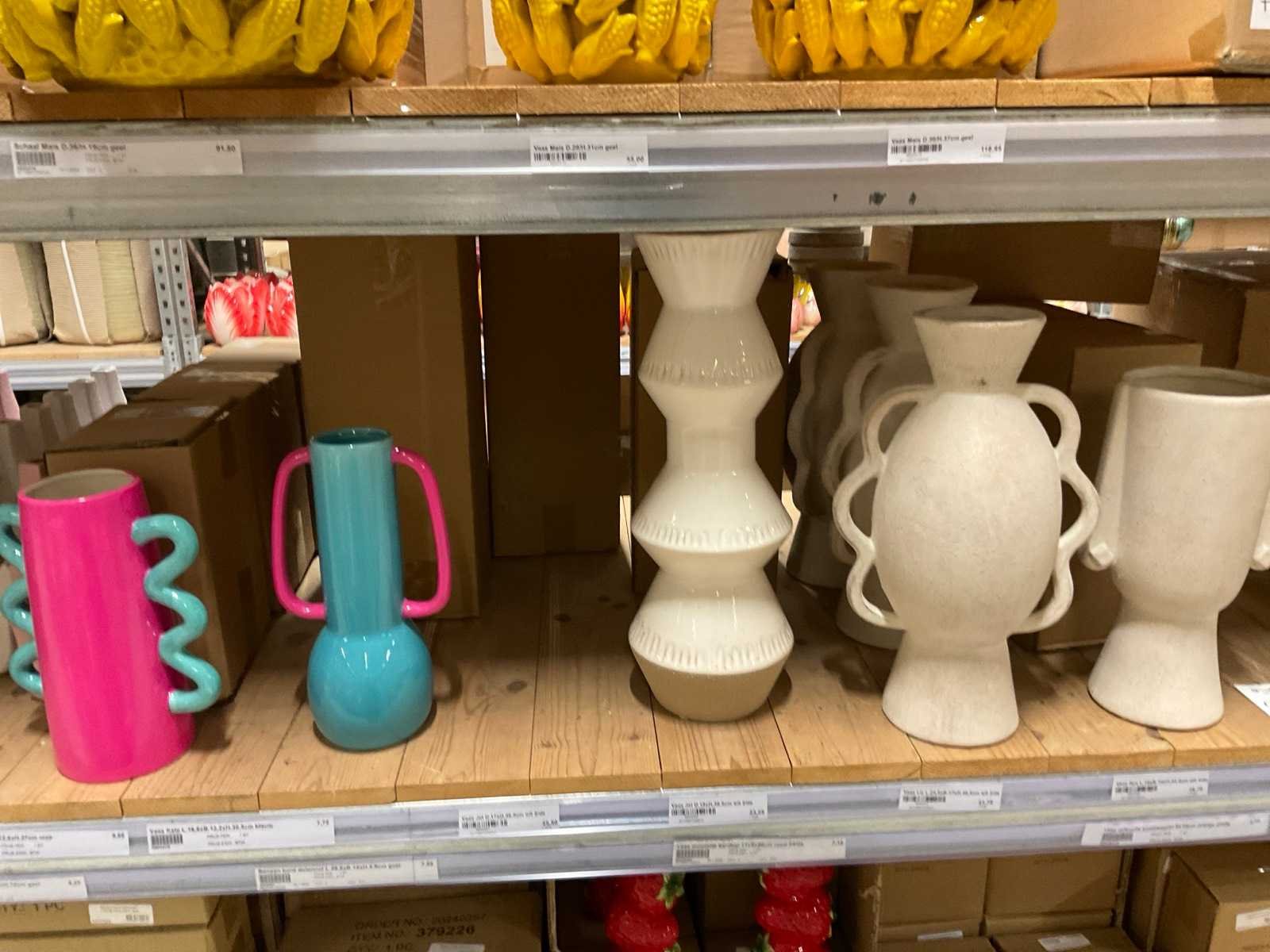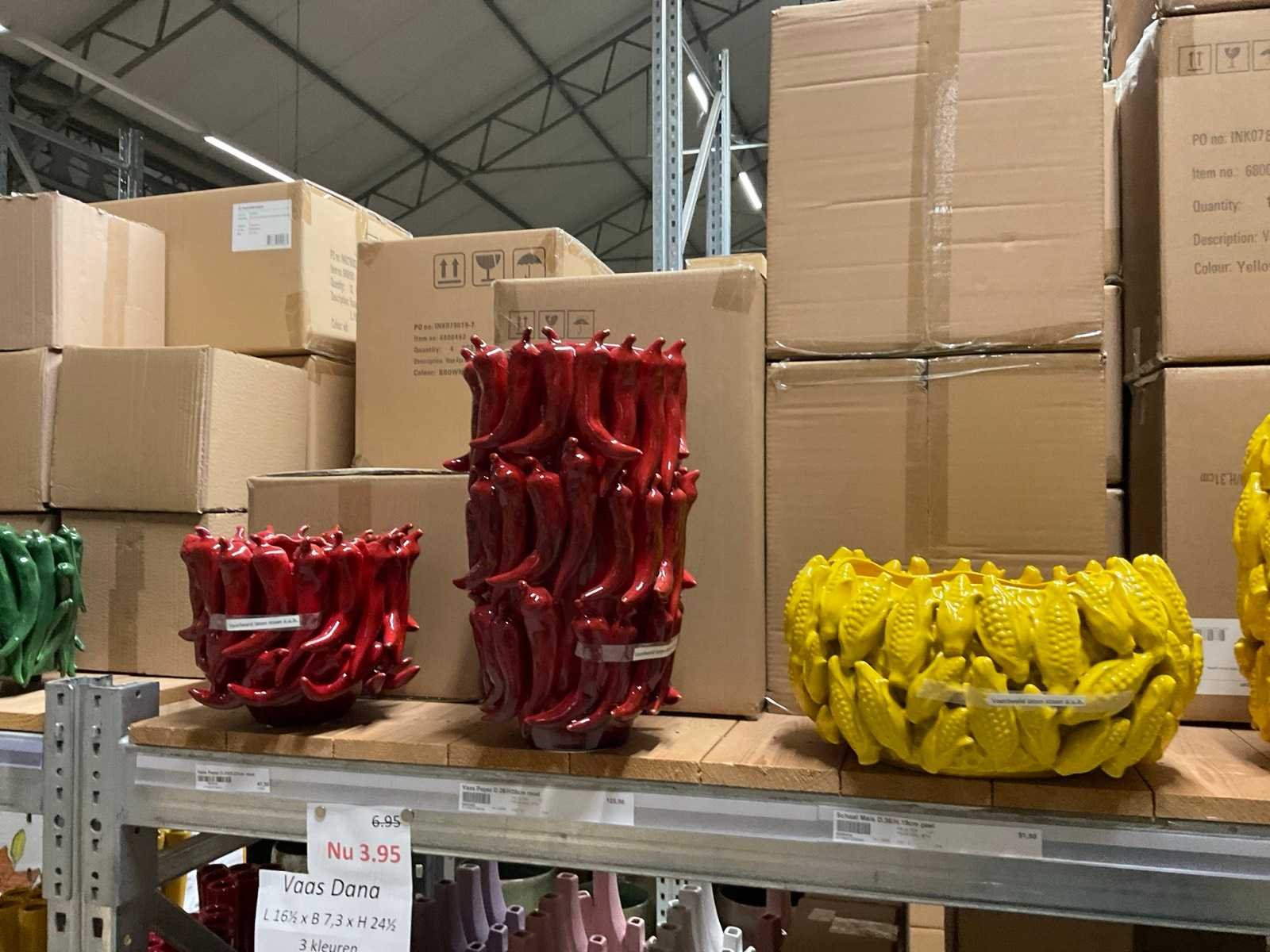 Inhoud van 1 zijde van stelling en pallet bestaande uit diverse vazen en bloempotten, inclusief pallet, stellig niet inbegrepen.