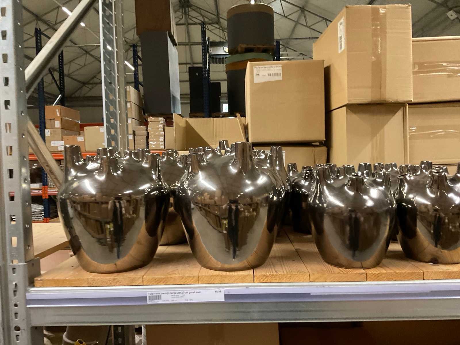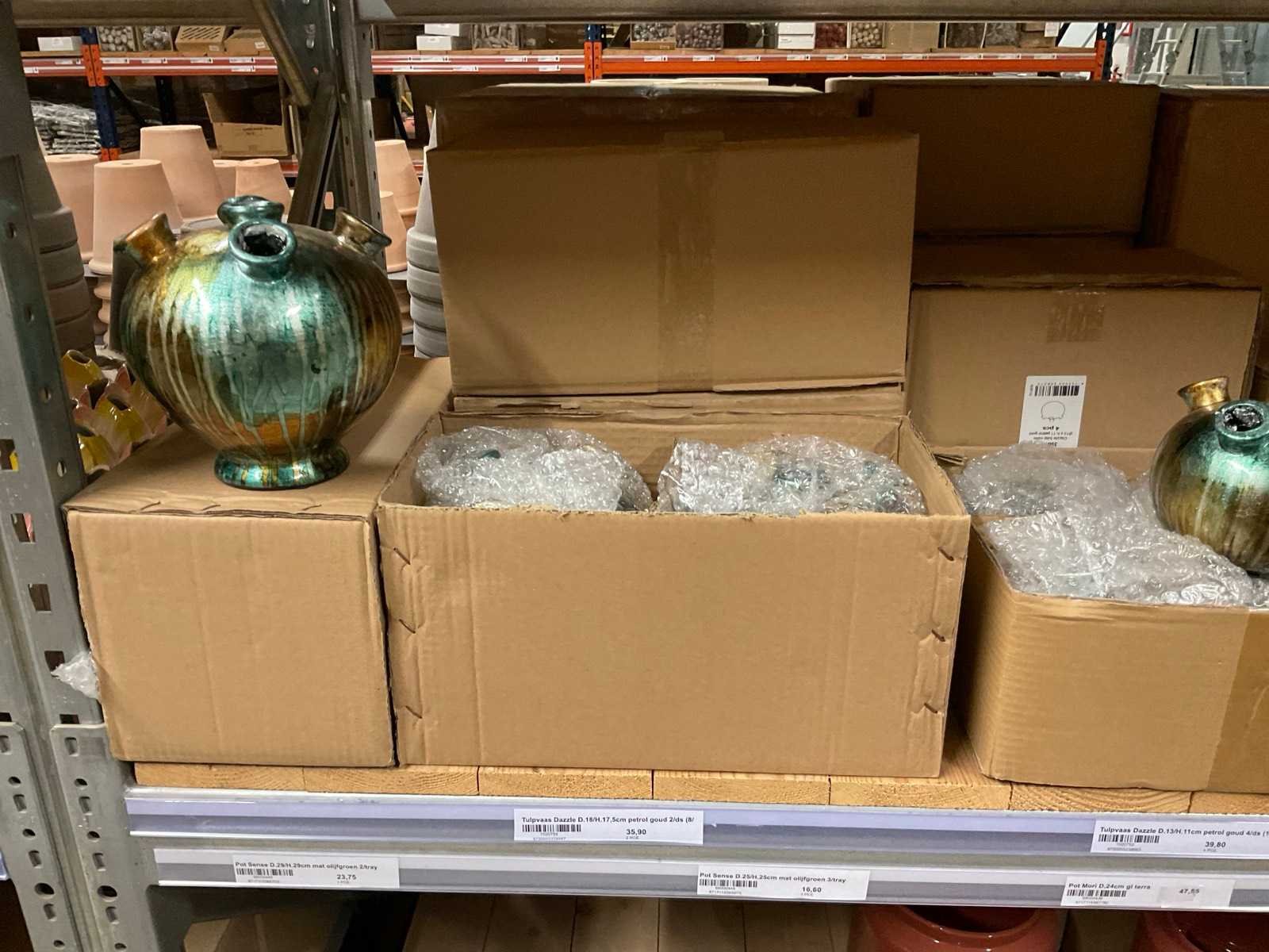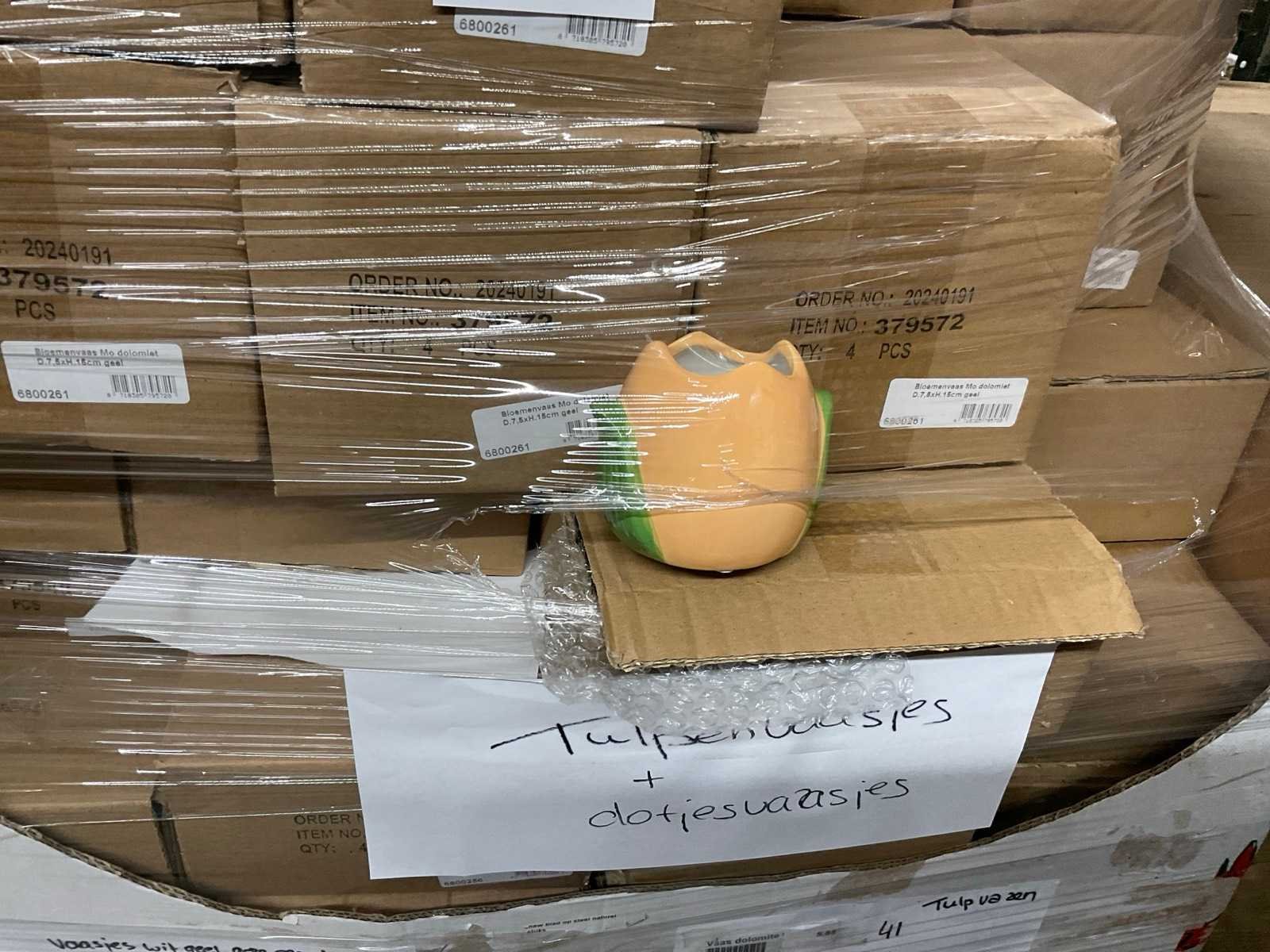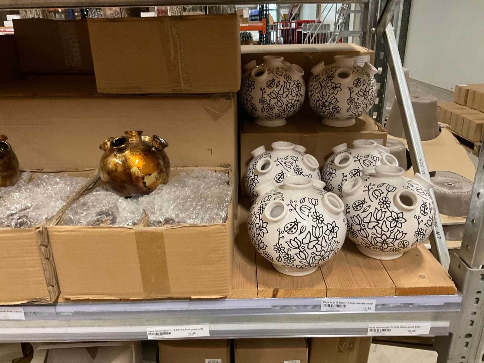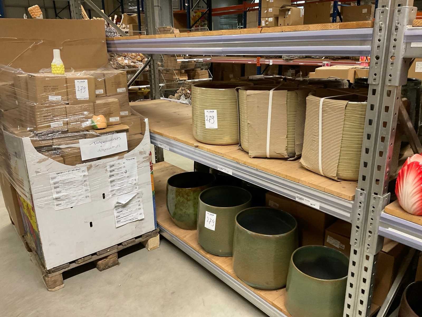 Inhoud van 1 pallet en stelling, bestaande uit diverse vazen en bloempotten, inclusief pallet, stellig niet inbegrepen.