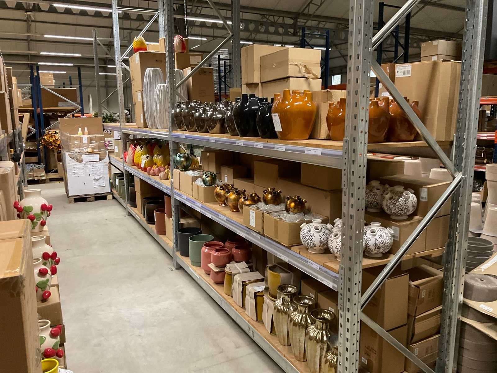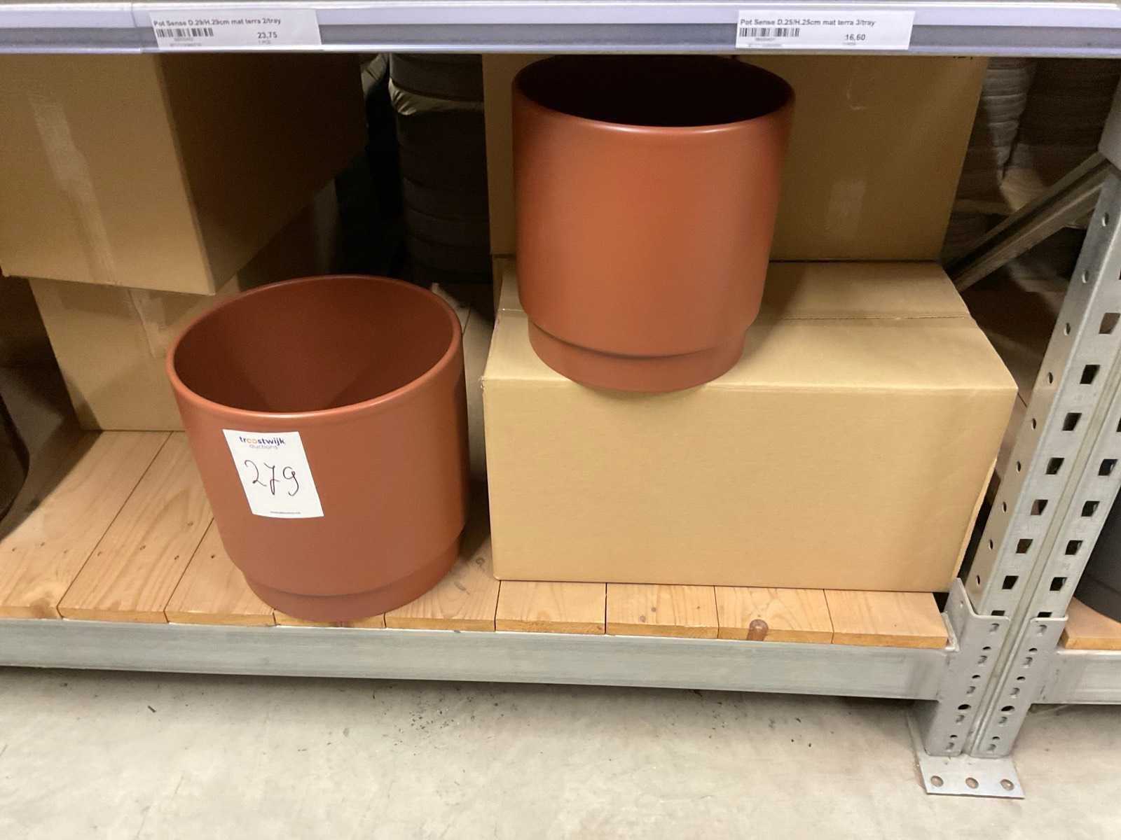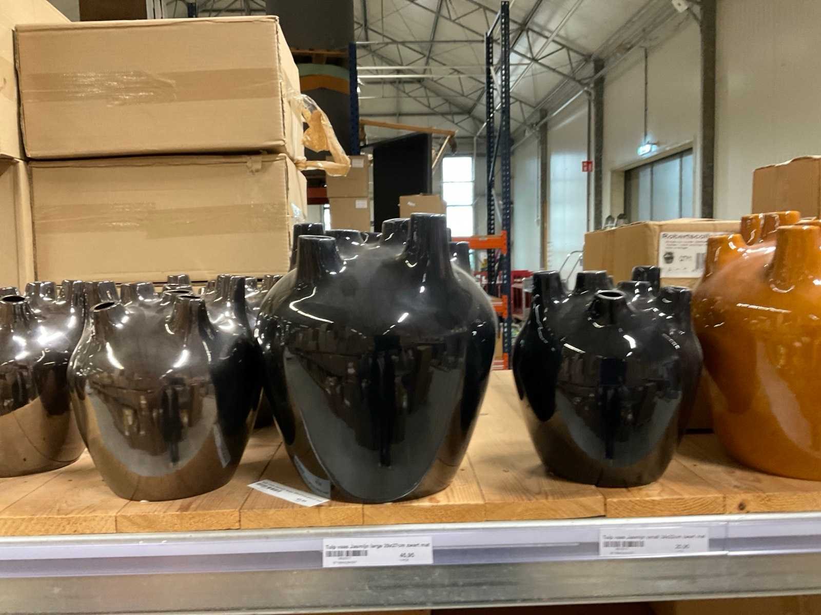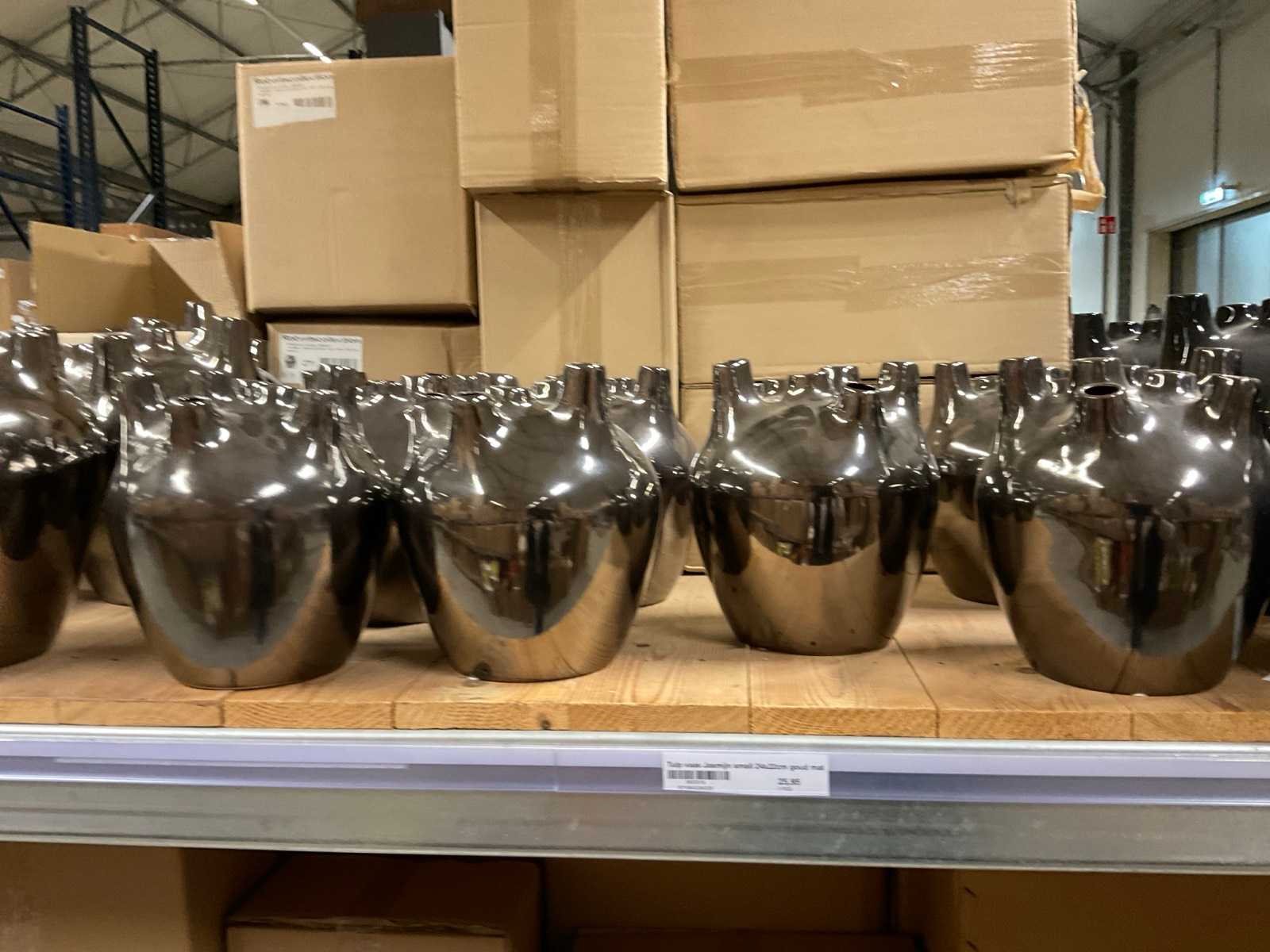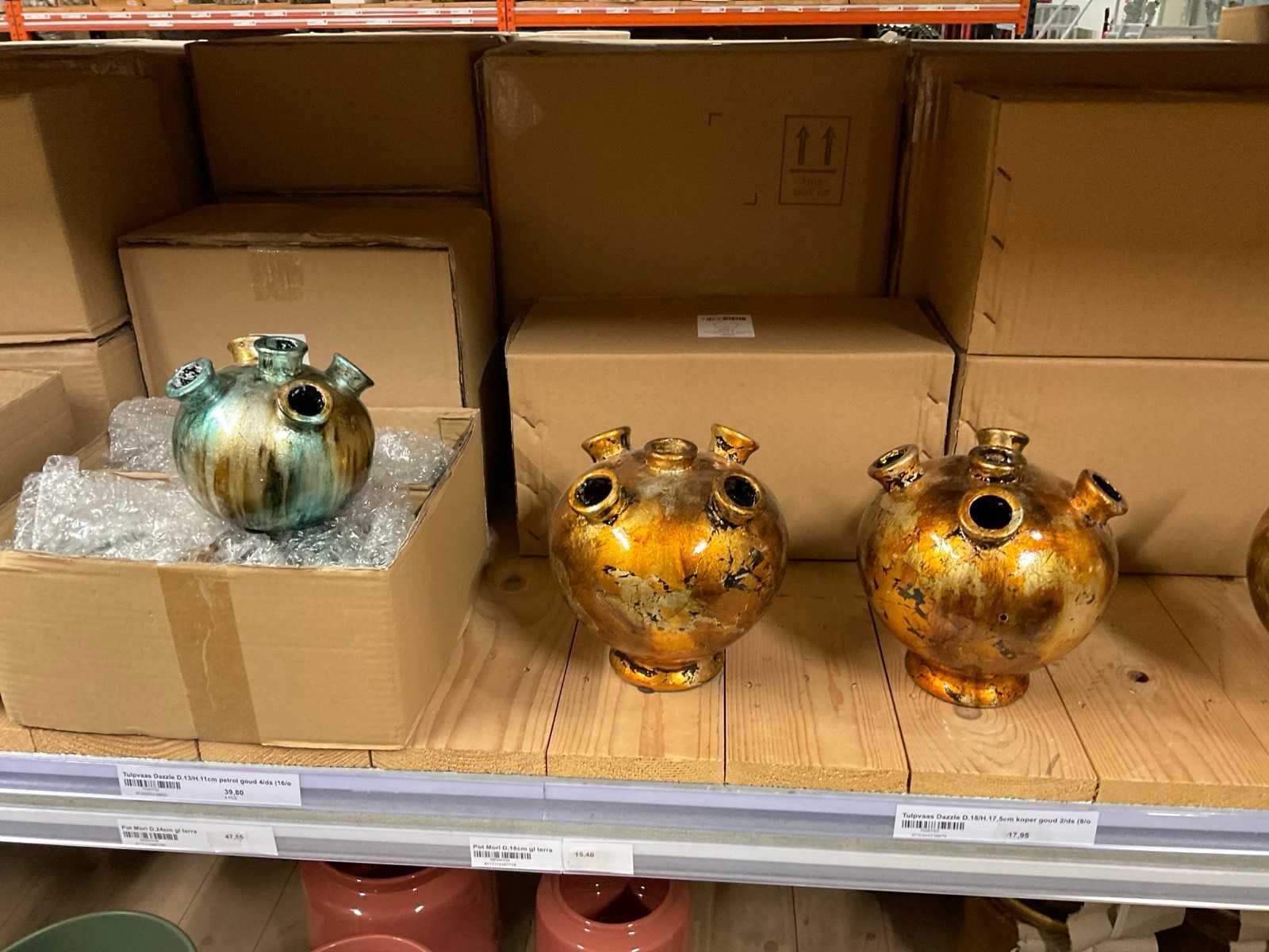 Inhoud van 1 pallet en stelling, bestaande uit diverse vazen en bloempotten, inclusief pallet, stellig niet inbegrepen.