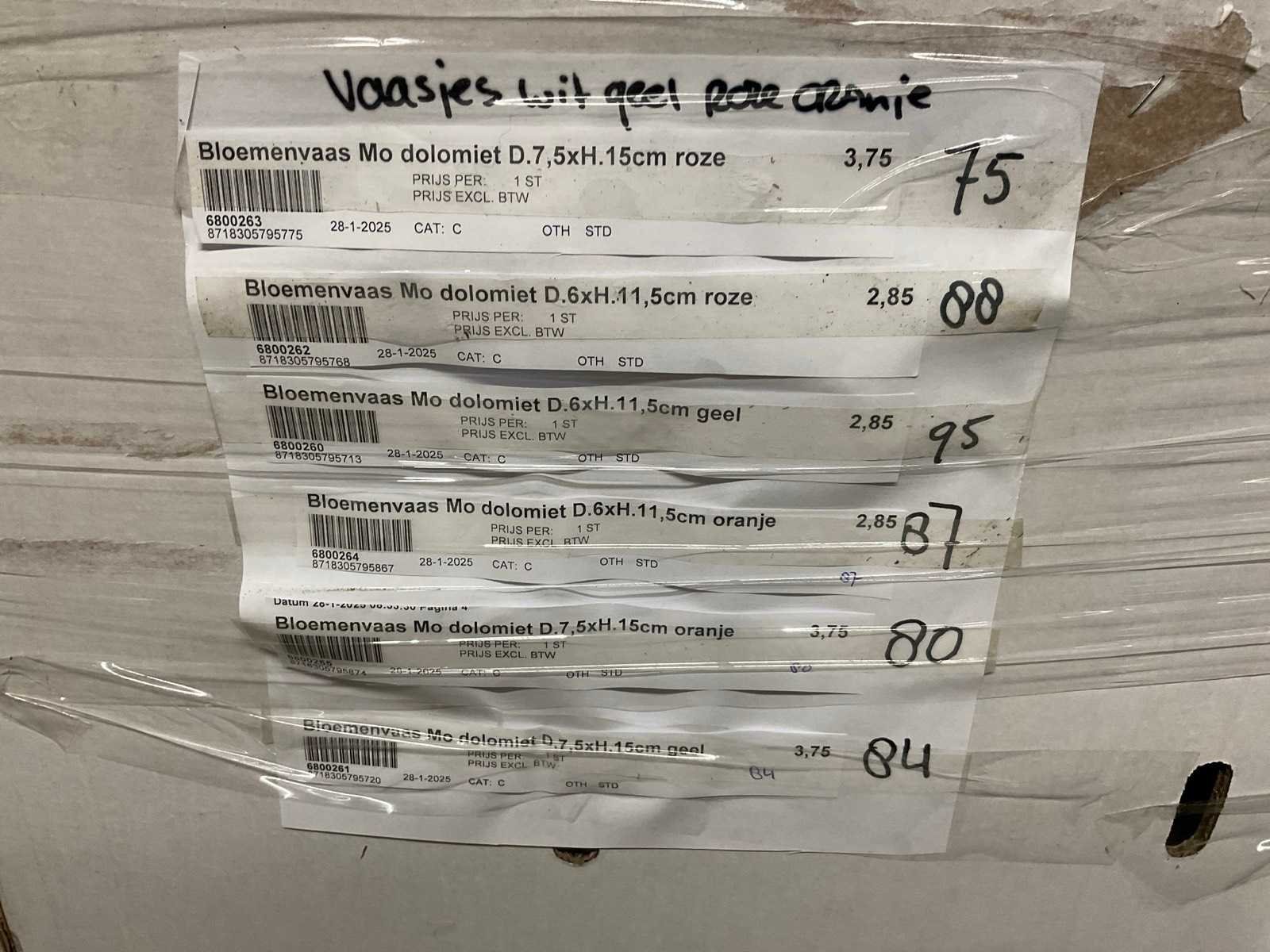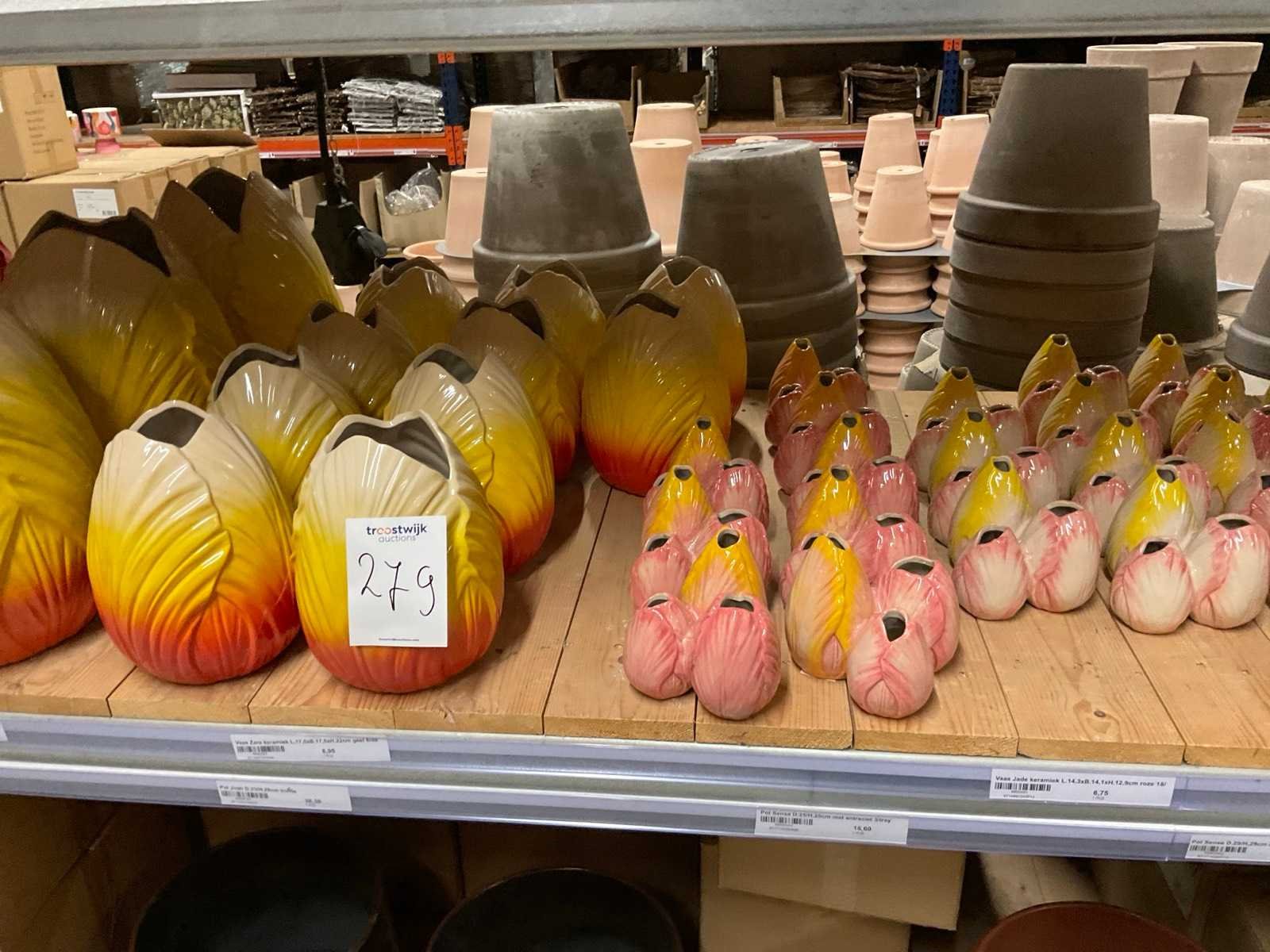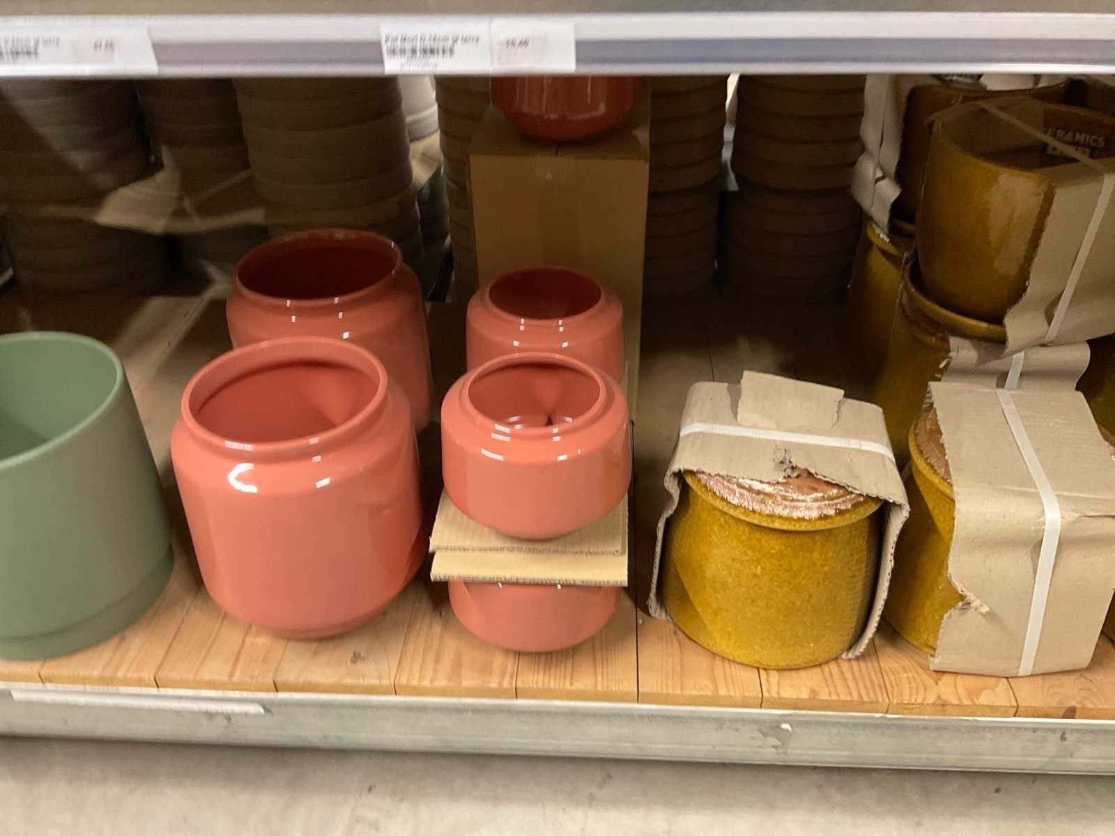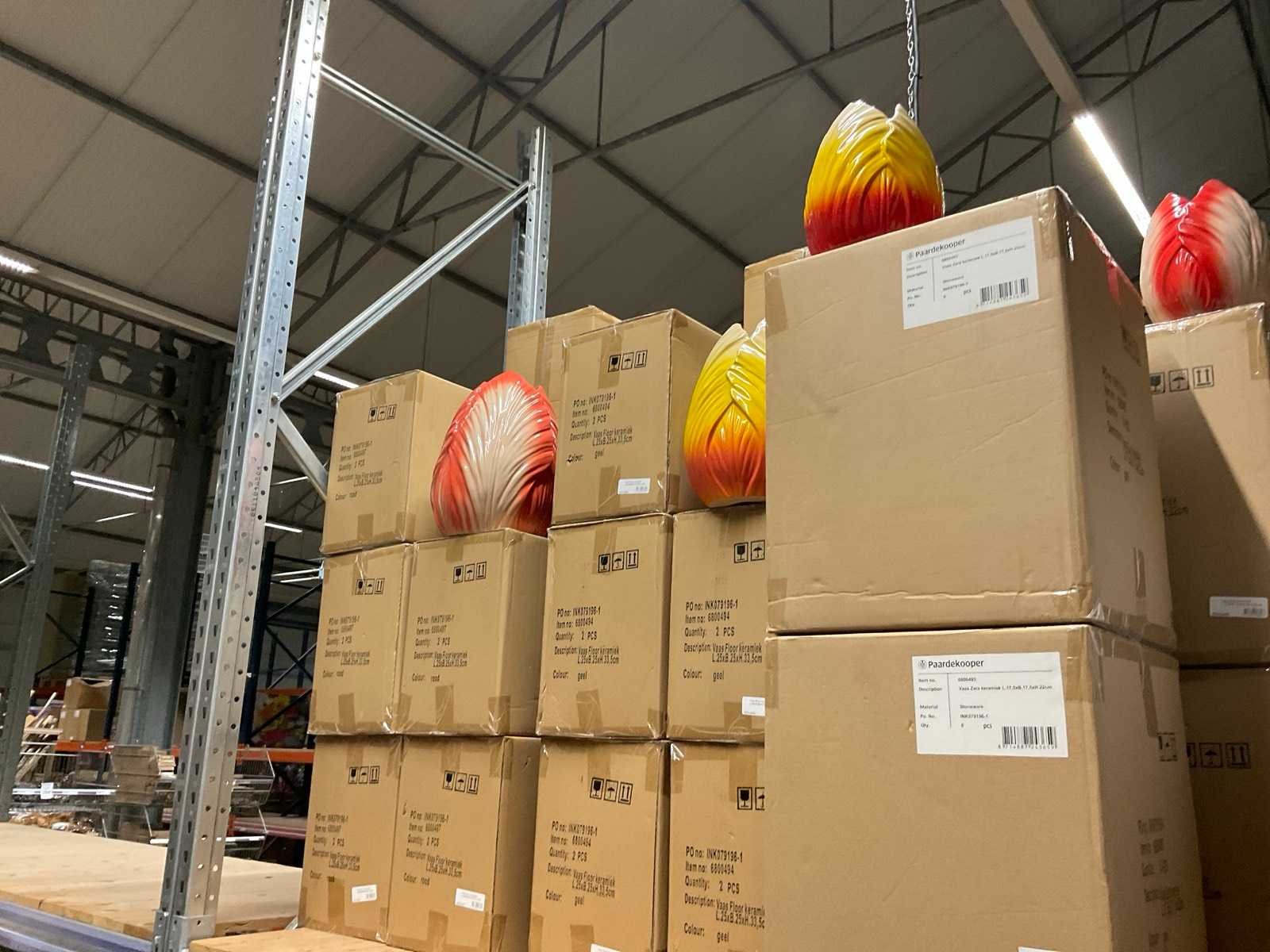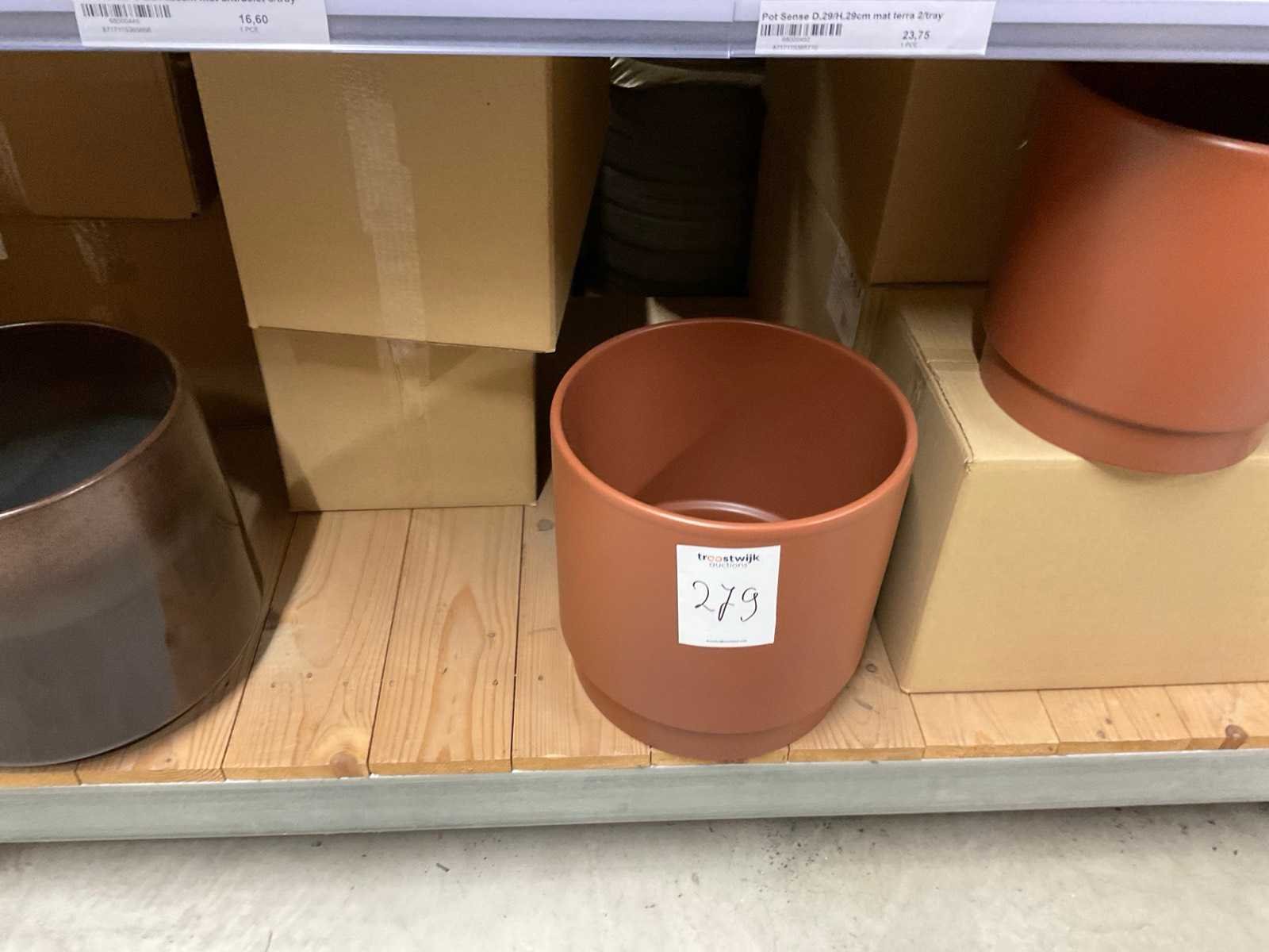 Inhoud van 1 pallet en stelling, bestaande uit diverse vazen en bloempotten, inclusief pallet, stellig niet inbegrepen.