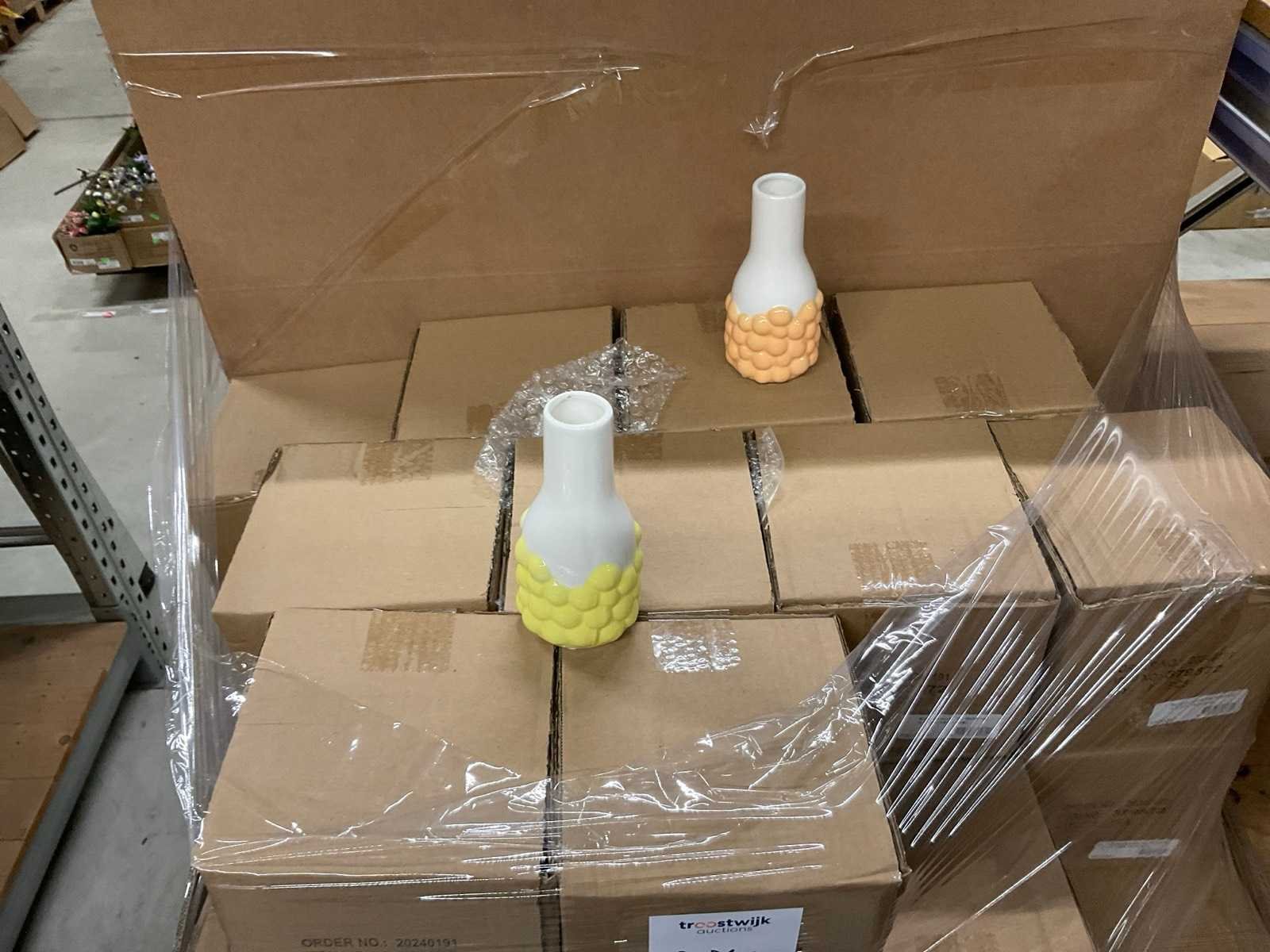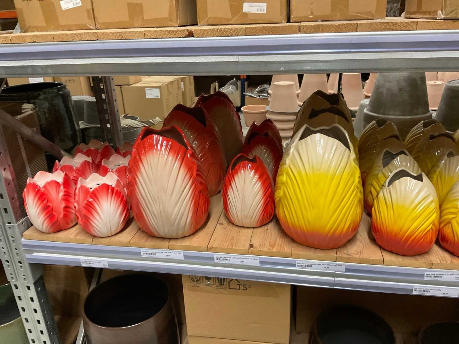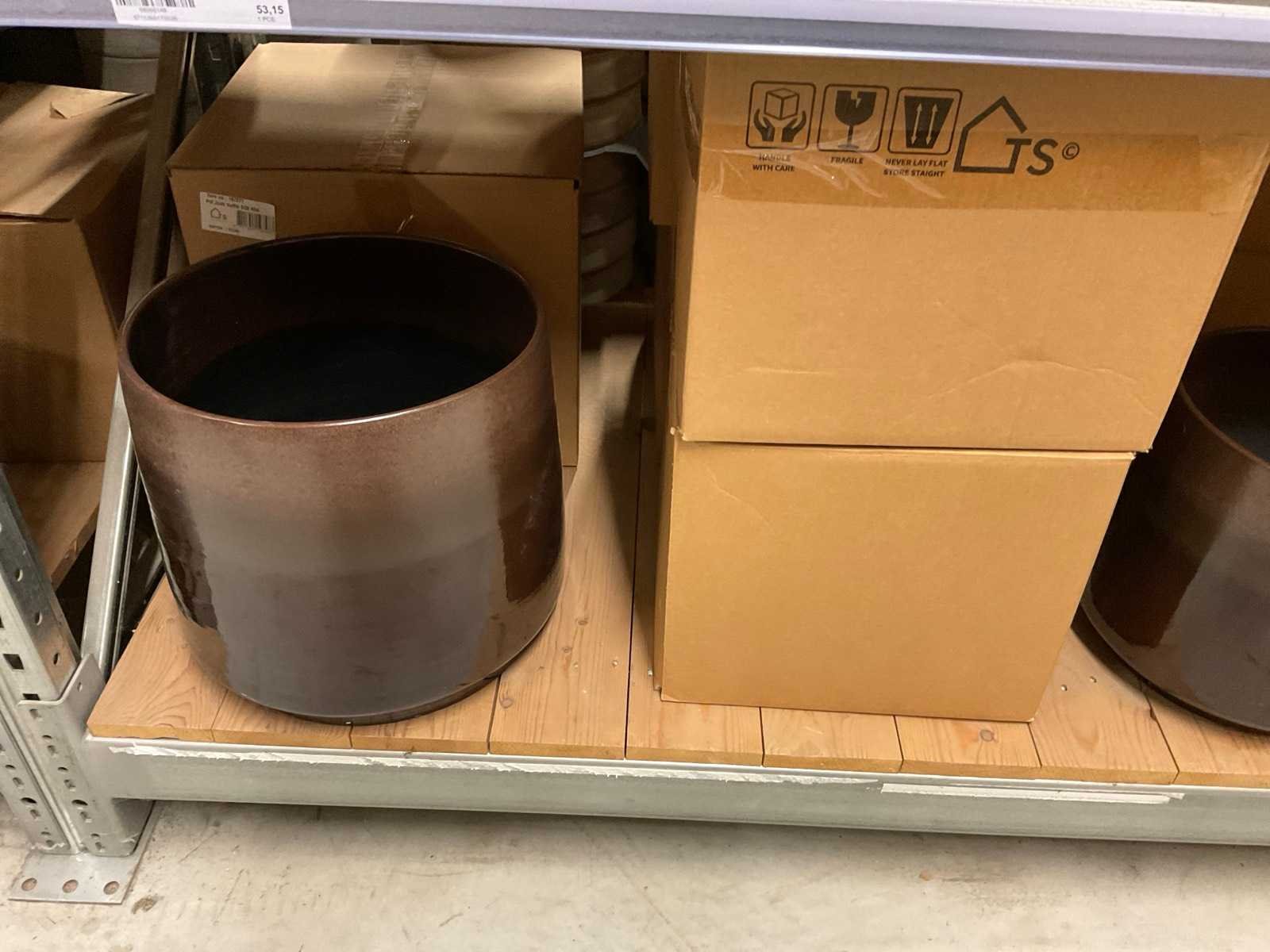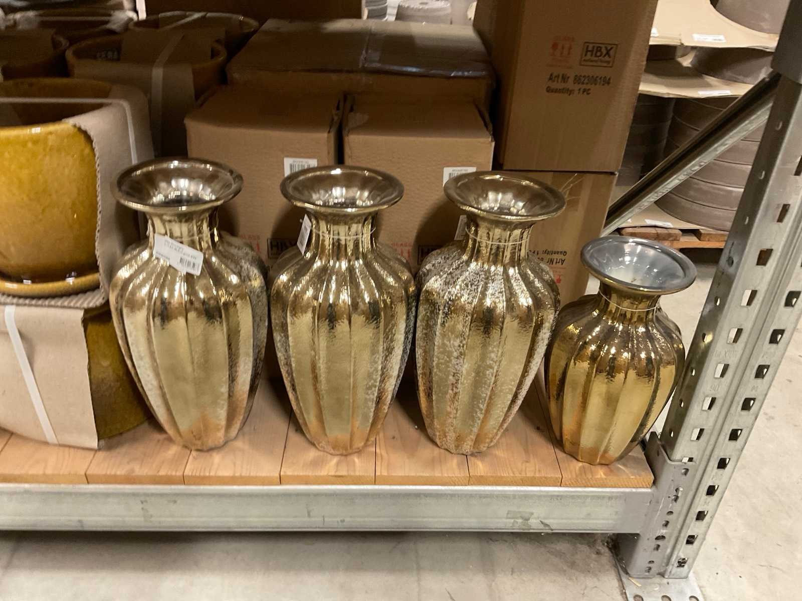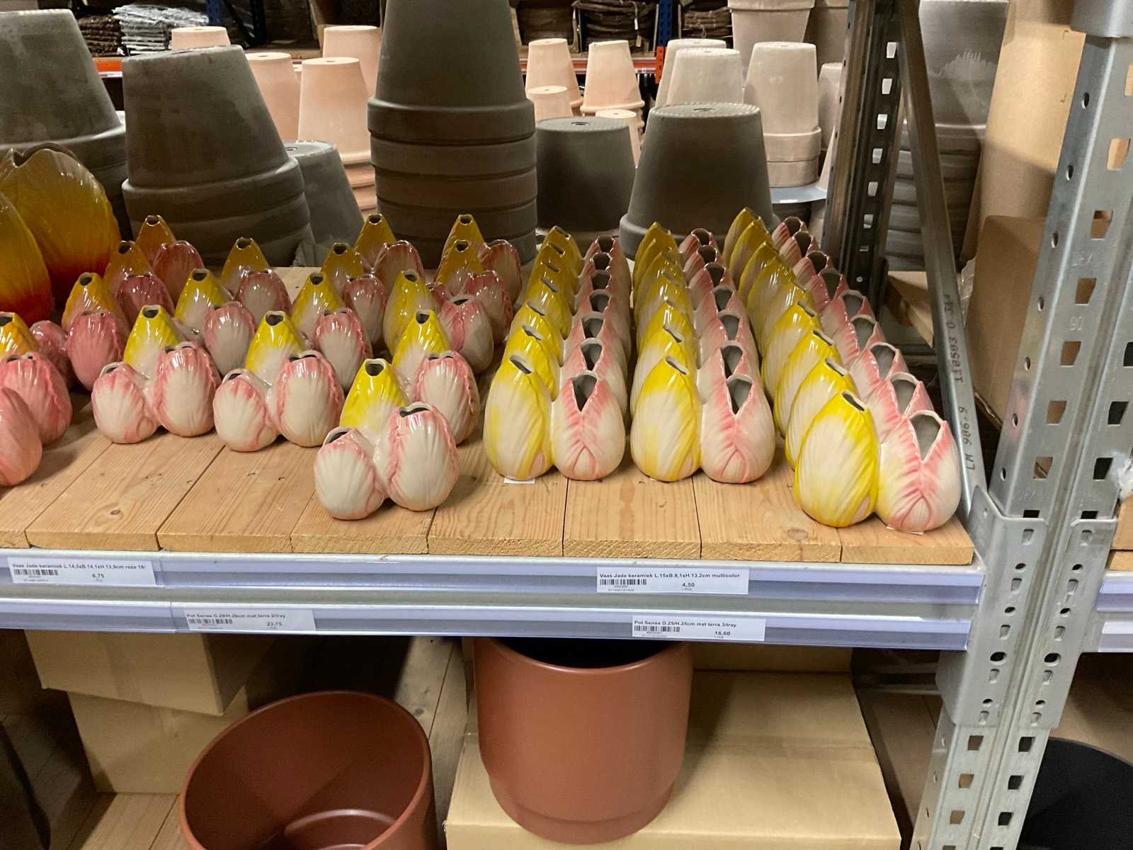 Inhoud van 1 pallet en stelling, bestaande uit diverse vazen en bloempotten, inclusief pallet, stellig niet inbegrepen.