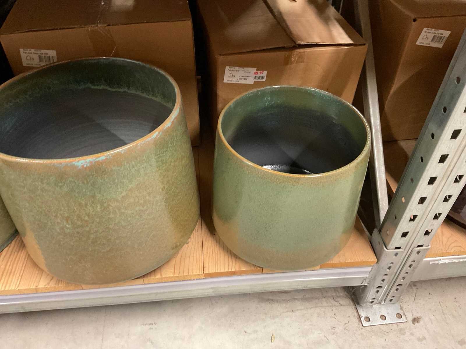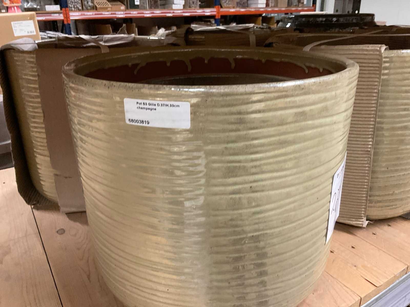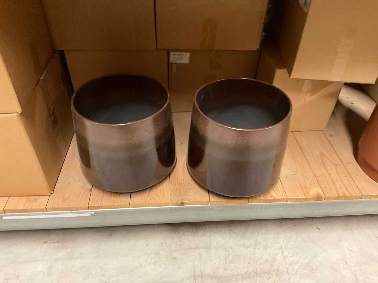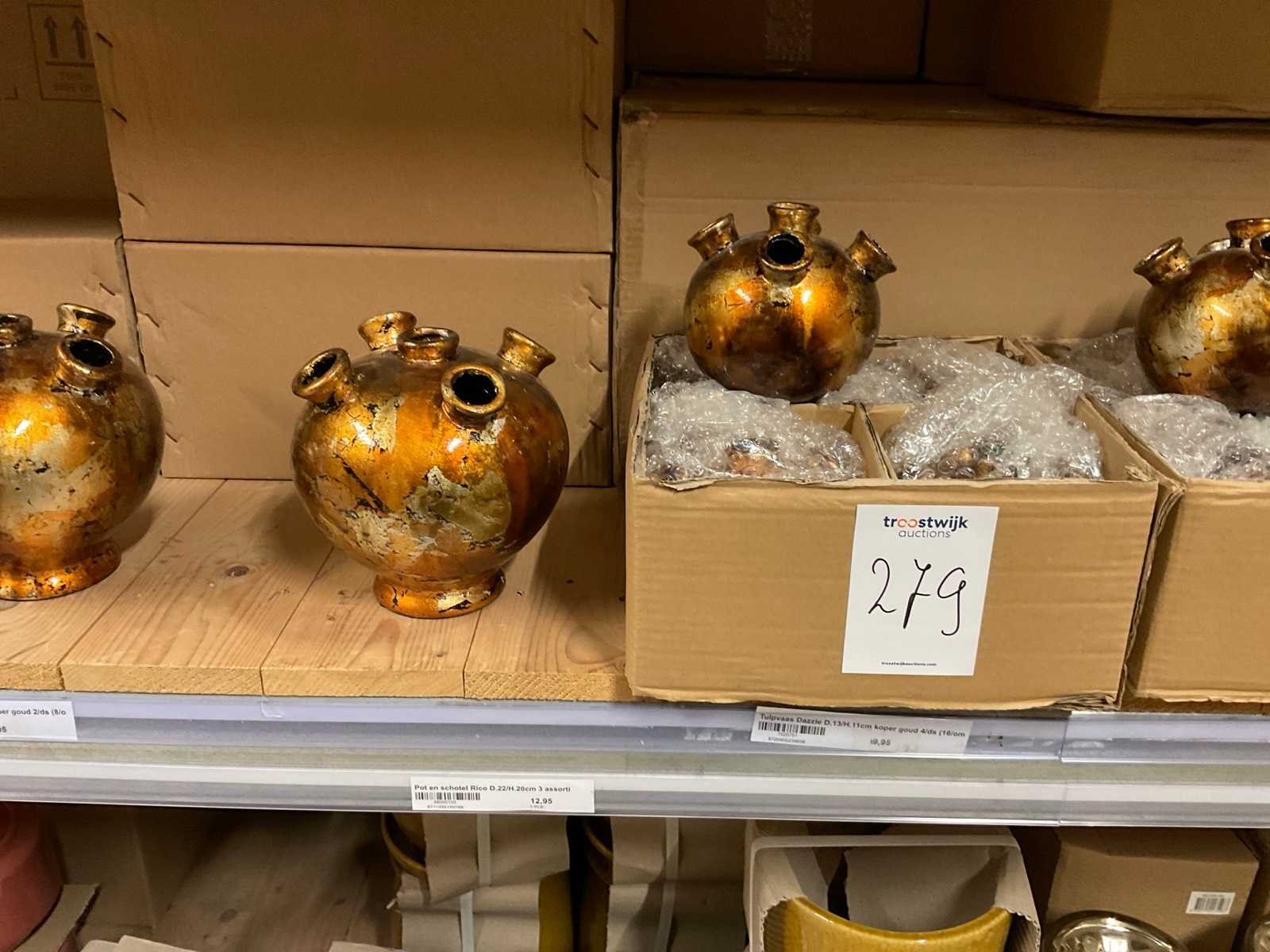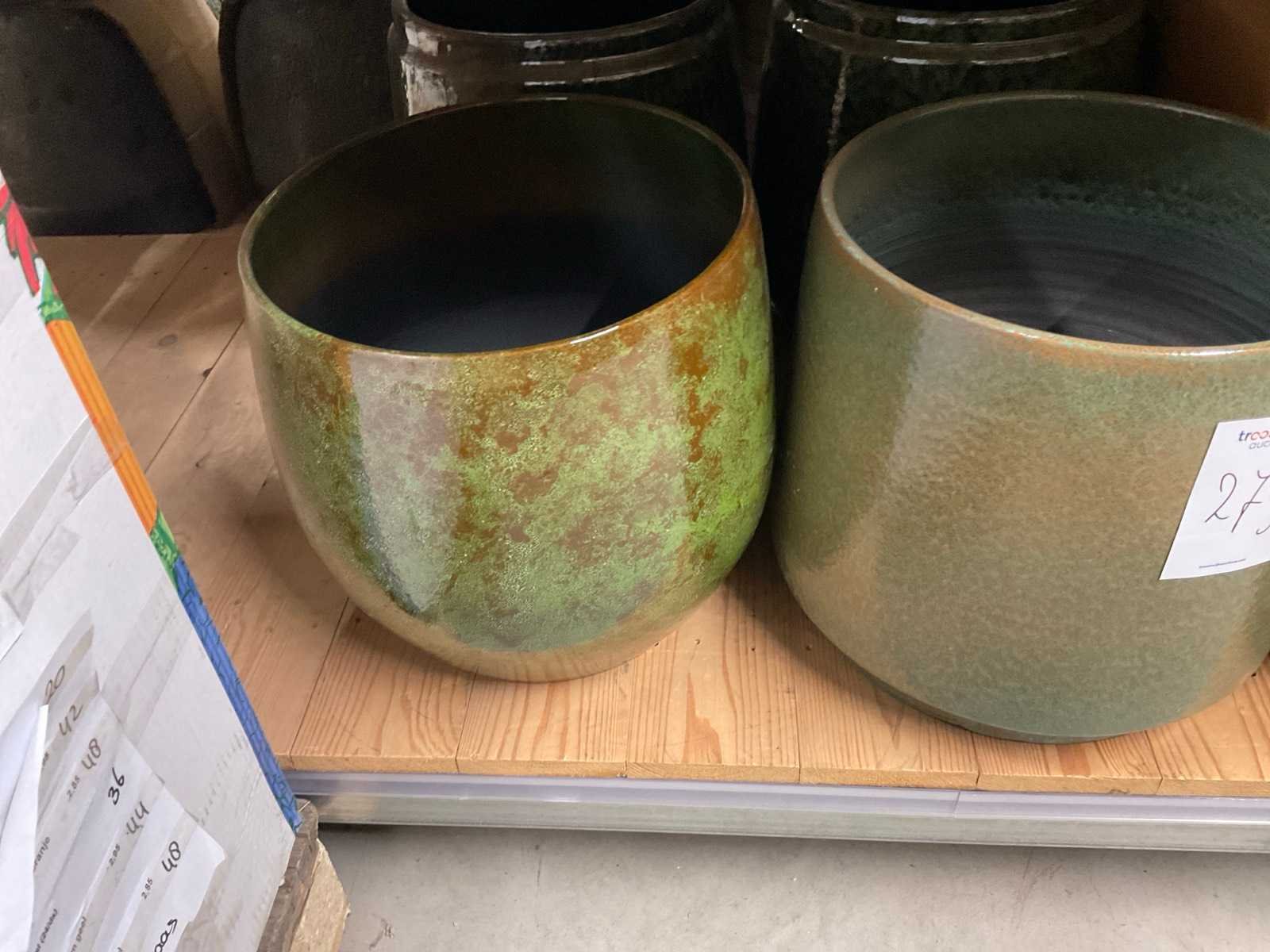 Inhoud van 1 pallet en stelling, bestaande uit diverse vazen en bloempotten, inclusief pallet, stellig niet inbegrepen.